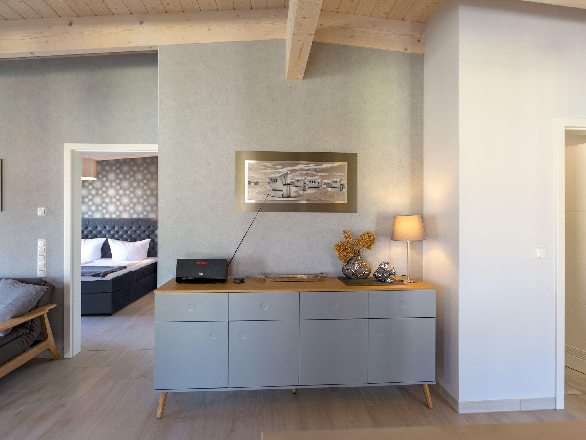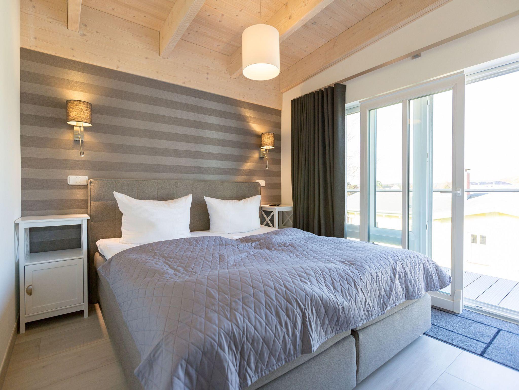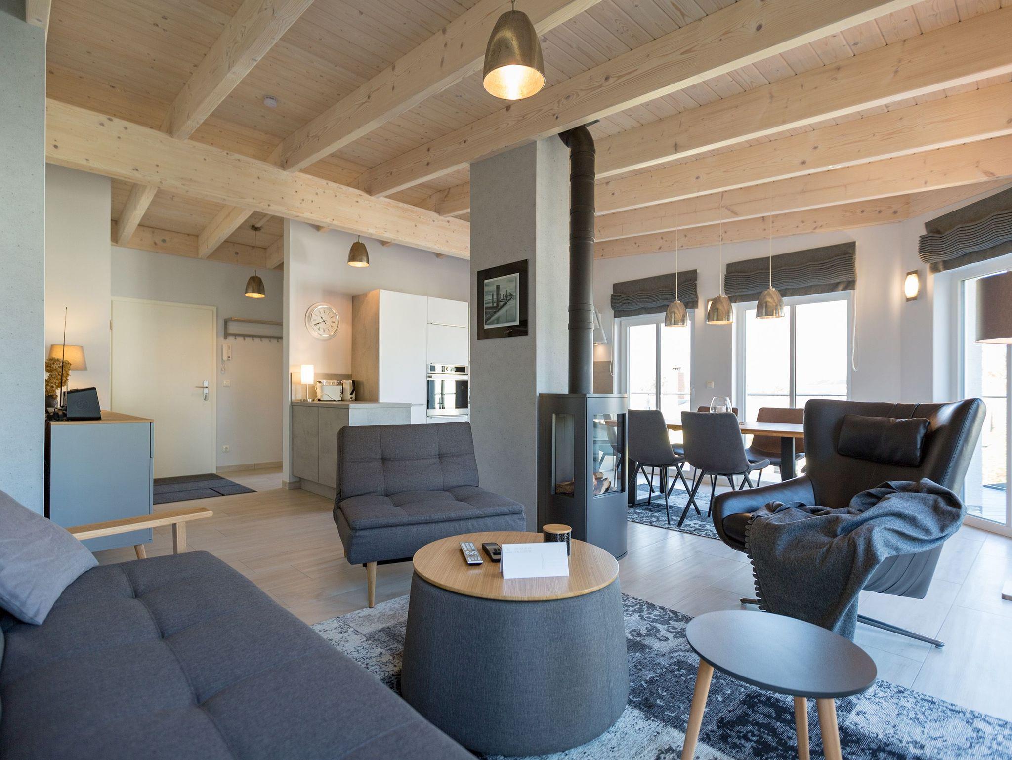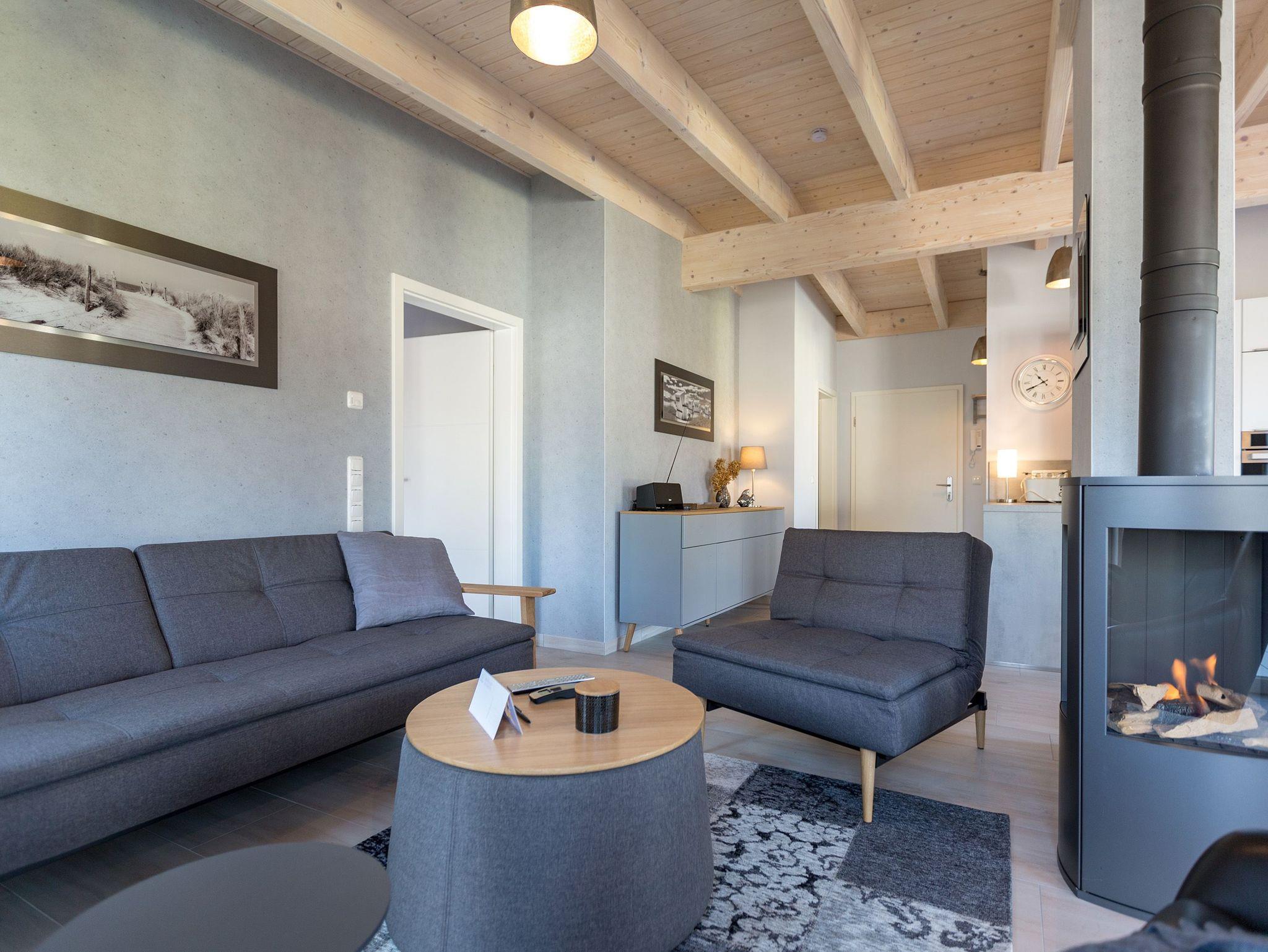 Der Fahrstuhl bringt Sie direkt unters Dach der Düne 8. Ein wunderschönes und großzügiges Penthouse wartet hier auf Sie. Auf 71 Quadratmetern können es sich bis zu vier Personen und ein Kleinkind bis drei Jahre (im Kinderreisebett) richtig gut gehen lassen, gemeinsam entspannen und eine unvergesslich schöne Zeit verbringen. Die Einrichtung der drei Zimmerwohnung besticht durch ihre schlichte und moderne Eleganz. Nordisches Design und urige Accessoires vermitteln Heimeligkeit, die jegliche Stressgedanken vergessen lässt. Die offene und helle Holzbalkendecke ist etwas ganz besonderes. Das große Wohnzimmer hat bodentiefe Fenster, die viel Licht ins Innere lassen. Ein massiver Gas-Kamin sorgt für kuschelige Behaglichkeit und Wärme. Auf der gemütlichen Sofa-Sitzgruppe oder im bequemen Ledersessel haben sie beste Plätze für das Flat-TV-Heimkino. Treten Sie hinaus auf den Balkon und genießen Sie den weiten Ostseeblick, der sich Ihnen in den Blick legt. In diesem Urlaubsdomizil entspannen Sie mit allen Sinnen. Auch der Geschmackssinn darf natürlich nicht zu kurz kommen. In der voll ausgestatteten Küche finden Sie alles, was das Kochherz begehrt. Hochwertige Markengeräte, erlesenes Geschirr ? da wird das Kochen im Urlaub zu einem kleinen Event. Essen können Sie am wunderschönen, großen Holztisch auf komfortablen Lederstühlen. Beide Schlafzimmer versprechen erholsame und entspannende Nächte. In den großen Boxspringdoppelbetten wird das Schlafen zum Vergnügen. Beide Schlafzimmer haben Zugang zu einem Balkon und jeweils einen Flat-TV. Auch Ablagemöglichkeiten gibt es in den Zimmern reichlich. Das Appartement verfügt über zwei Bäder mit geräumigen Regenduschen, Waschtisch und WC. Im Masterbad wartet zudem eine kleine Wellness-Oase darauf, Ihnen noch mehr Entspannung zu verschaffen. Eine Finnische Sauna ist der ideale Ort, sich an ungemütlichen Tagen die Zeit zu verschönern. Die Handtücher liegen bereit und auch die Betten sind bei der Anreise bereits bezogen. Das WLAN ist kostenfrei und im Keller gibt es einen abschließbaren Fahrradraum. Außerdem ist für Ihr Auto ein Stellplatz reserviert.