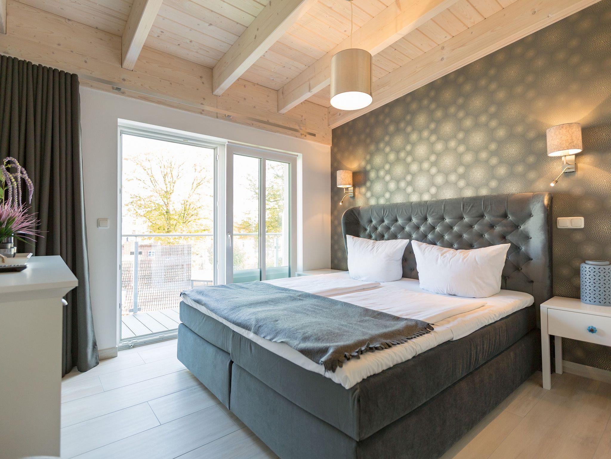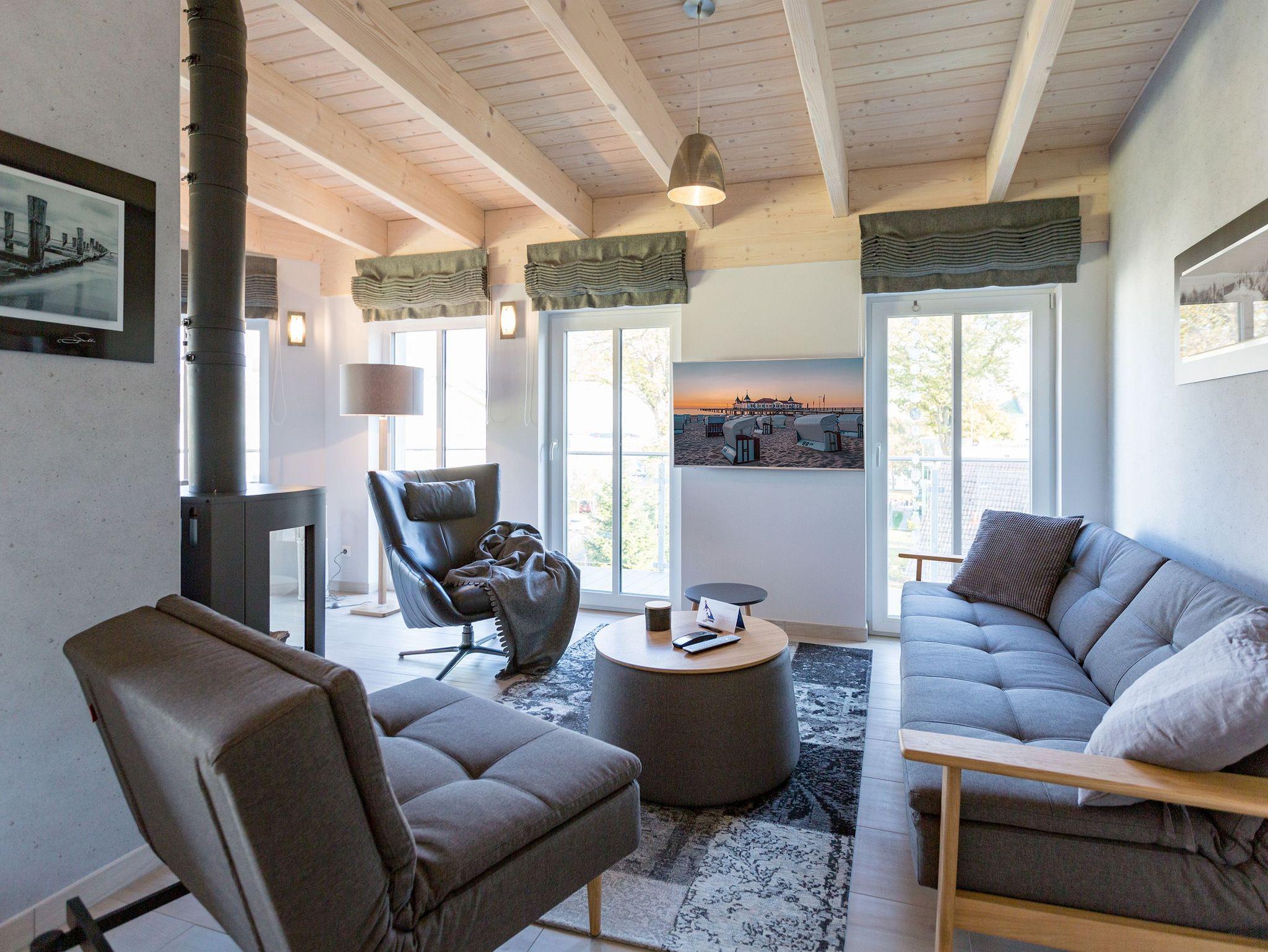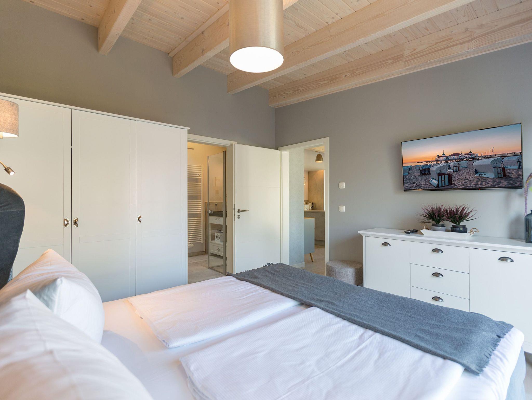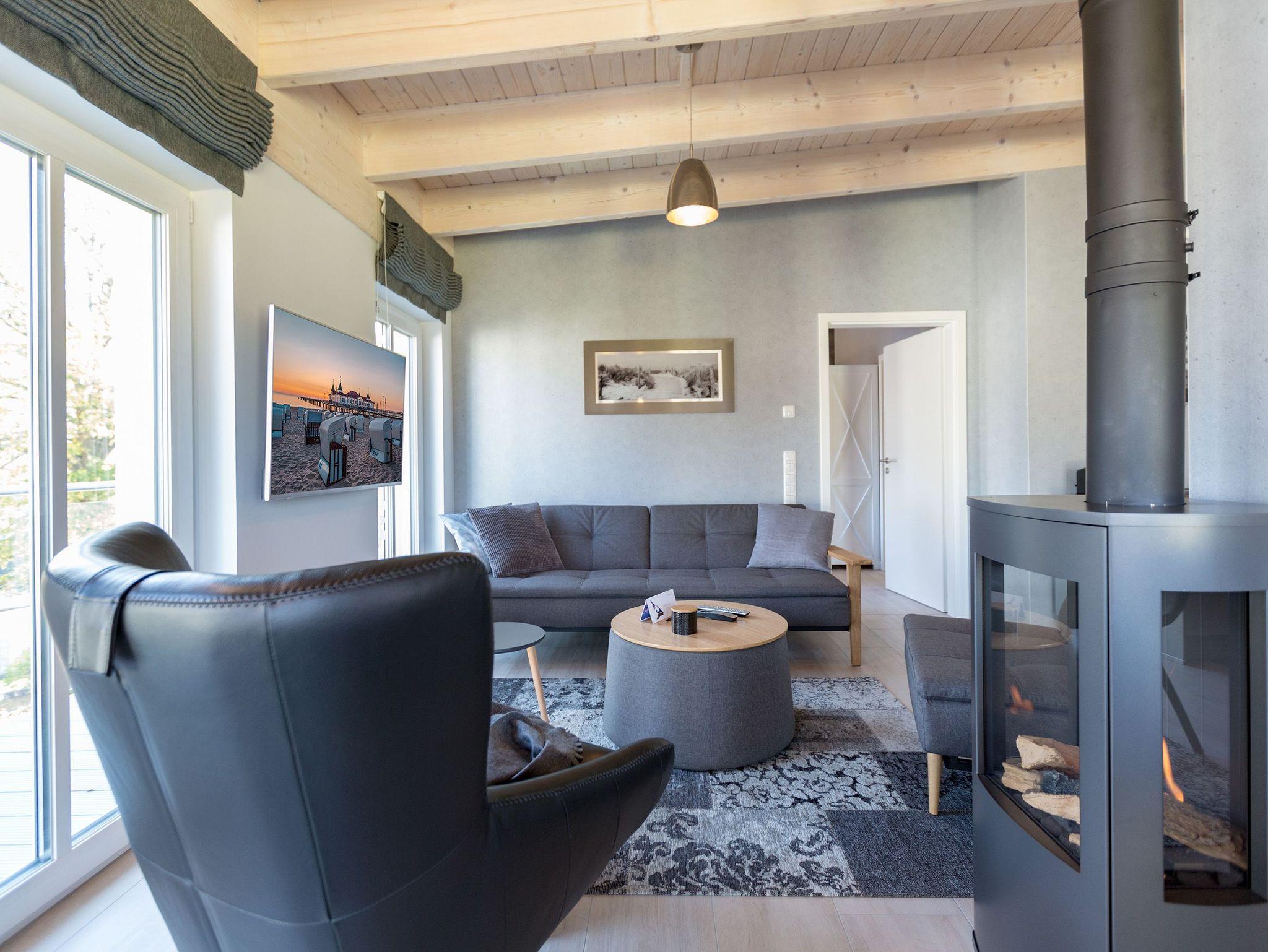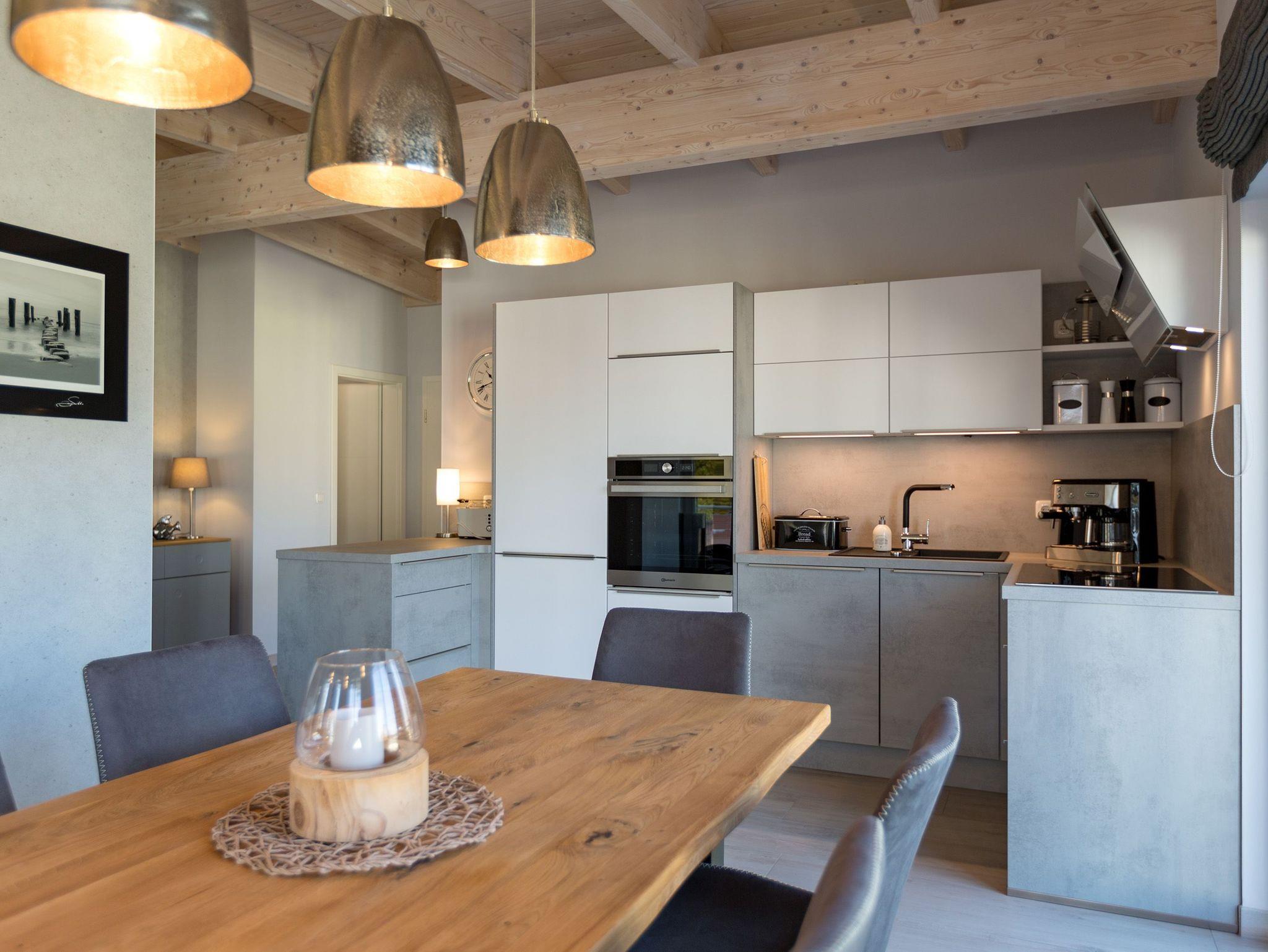 Der Fahrstuhl bringt Sie direkt unters Dach der Düne 8. Ein wunderschönes und großzügiges Penthouse wartet hier auf Sie. Auf 71 Quadratmetern können es sich bis zu vier Personen und ein Kleinkind bis drei Jahre (im Kinderreisebett) richtig gut gehen lassen, gemeinsam entspannen und eine unvergesslich schöne Zeit verbringen. Die Einrichtung der drei Zimmerwohnung besticht durch ihre schlichte und moderne Eleganz. Nordisches Design und urige Accessoires vermitteln Heimeligkeit, die jegliche Stressgedanken vergessen lässt. Die offene und helle Holzbalkendecke ist etwas ganz besonderes. Das große Wohnzimmer hat bodentiefe Fenster, die viel Licht ins Innere lassen. Ein massiver Gas-Kamin sorgt für kuschelige Behaglichkeit und Wärme. Auf der gemütlichen Sofa-Sitzgruppe oder im bequemen Ledersessel haben sie beste Plätze für das Flat-TV-Heimkino. Treten Sie hinaus auf den Balkon und genießen Sie den weiten Ostseeblick, der sich Ihnen in den Blick legt. In diesem Urlaubsdomizil entspannen Sie mit allen Sinnen. Auch der Geschmackssinn darf natürlich nicht zu kurz kommen. In der voll ausgestatteten Küche finden Sie alles, was das Kochherz begehrt. Hochwertige Markengeräte, erlesenes Geschirr ? da wird das Kochen im Urlaub zu einem kleinen Event. Essen können Sie am wunderschönen, großen Holztisch auf komfortablen Lederstühlen. Beide Schlafzimmer versprechen erholsame und entspannende Nächte. In den großen Boxspringdoppelbetten wird das Schlafen zum Vergnügen. Beide Schlafzimmer haben Zugang zu einem Balkon und jeweils einen Flat-TV. Auch Ablagemöglichkeiten gibt es in den Zimmern reichlich. Das Appartement verfügt über zwei Bäder mit geräumigen Regenduschen, Waschtisch und WC. Im Masterbad wartet zudem eine kleine Wellness-Oase darauf, Ihnen noch mehr Entspannung zu verschaffen. Eine Finnische Sauna ist der ideale Ort, sich an ungemütlichen Tagen die Zeit zu verschönern. Die Handtücher liegen bereit und auch die Betten sind bei der Anreise bereits bezogen. Das WLAN ist kostenfrei und im Keller gibt es einen abschließbaren Fahrradraum. Außerdem ist für Ihr Auto ein Stellplatz reserviert.