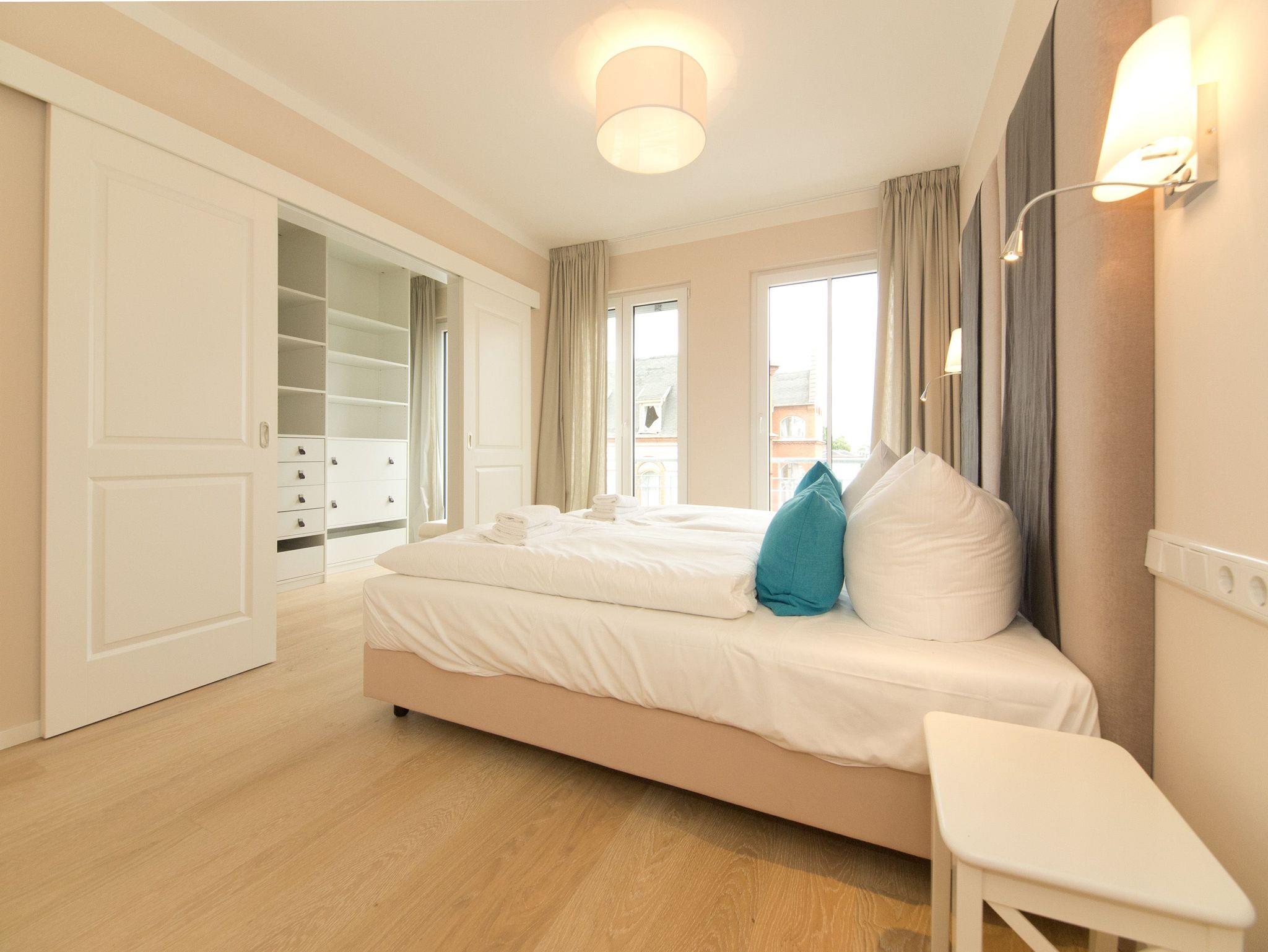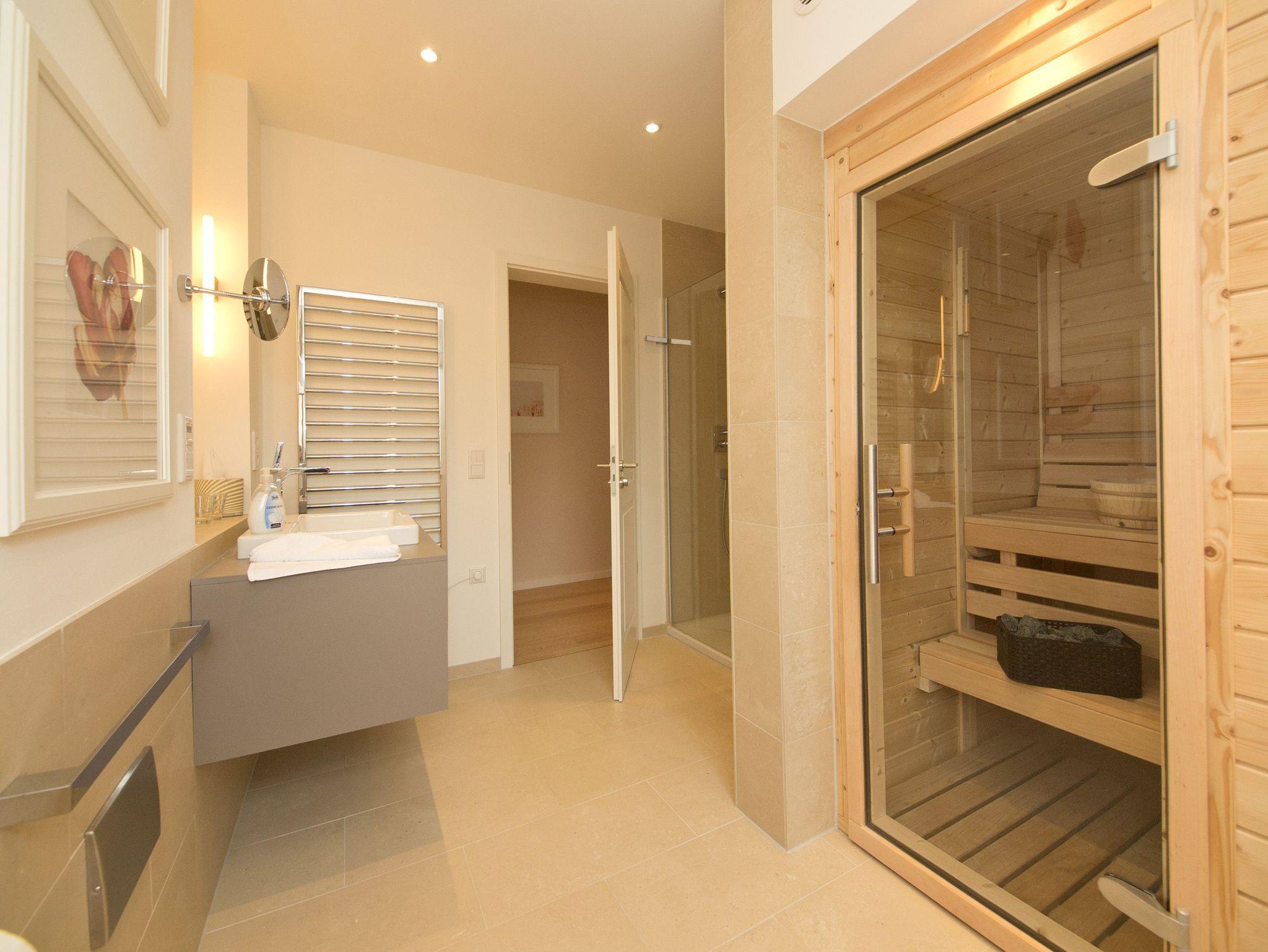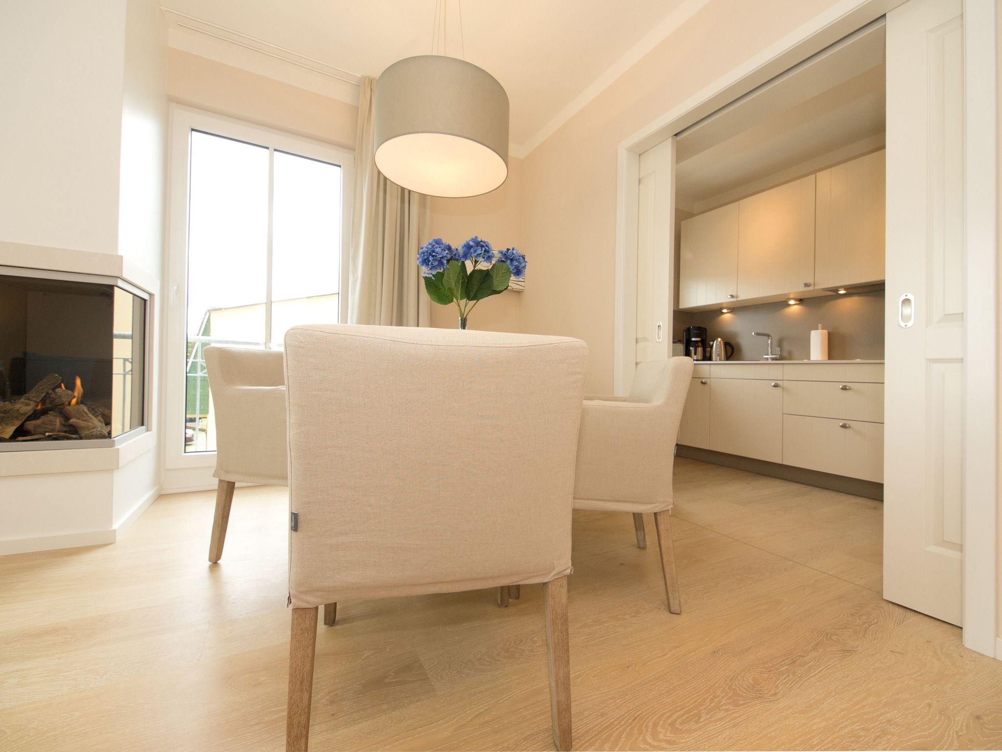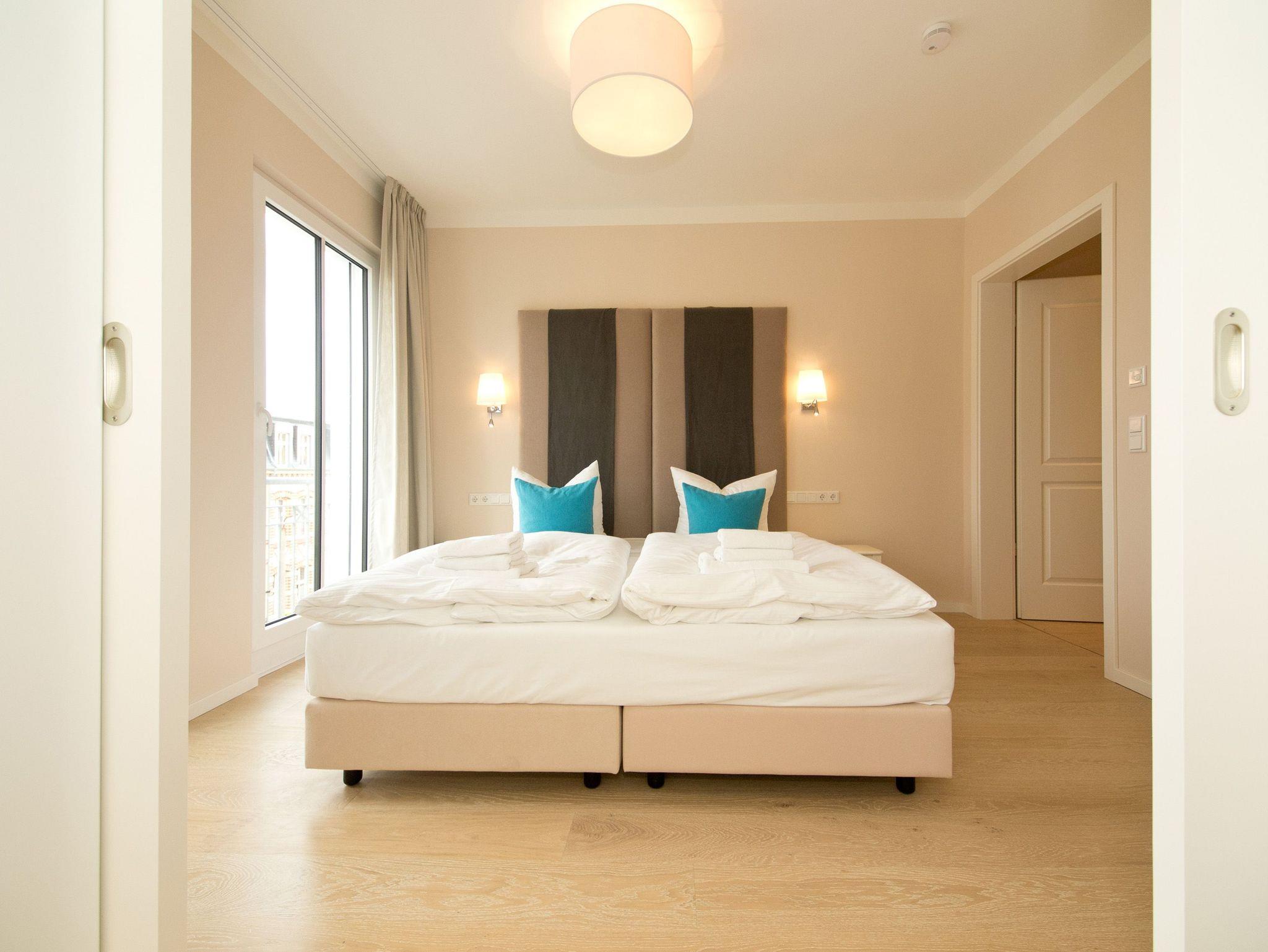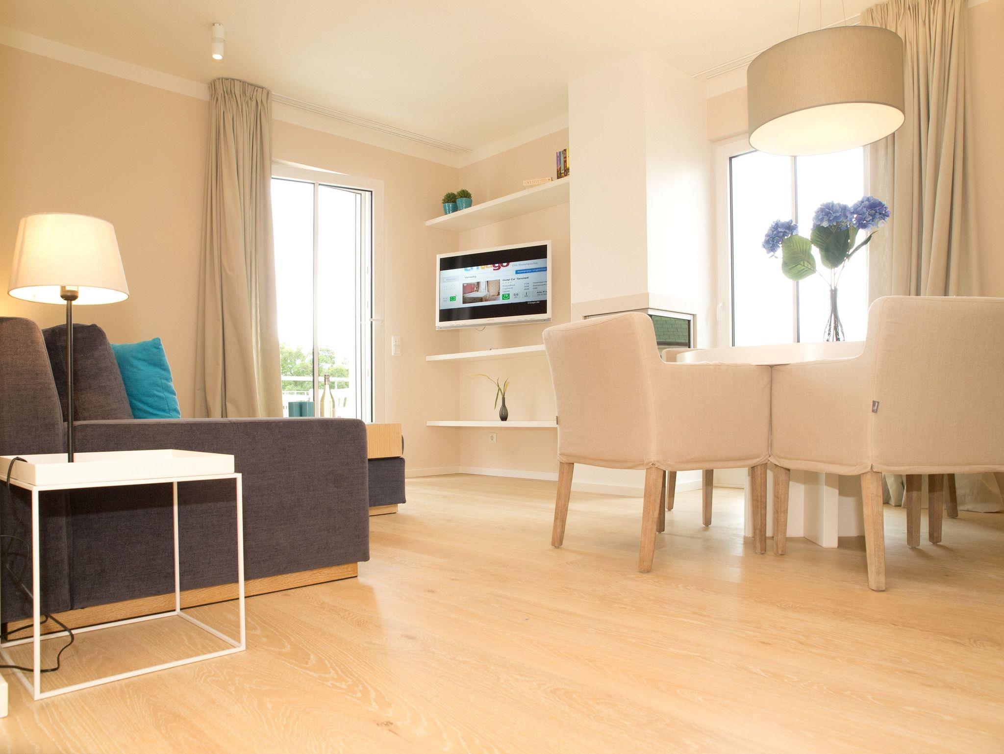 Ein maßgeschneidertes Wohlfühldomizil empfängt Sie in der zweiten Etage des Dünenpalais. Auf großzügigen 80 qm finden hier 4 Personen und 1 Kleinkind (bis 3 Jahre im Kinderreisebett) Platz zum entspannten Urlauben. Ein edler, heller Dielenboden wurde von versierter Architektenhand geschickt mit einer modernen exklusiven Einrichtung kombiniert. An den Wohnbereich mit Sitzgruppe, Flat-TV und Gaskamin (per Fernbedienung zu benutzen) schließen sich die bequeme Essgruppe und die schöne, komplett ausgestattete Küche im modernen Landhausstil (durch Schiebetür abgetrennt) an. Das große Schlafzimmer ist mit einem Doppelboxspringbett ausgestattet, von hier hat man sogar ein wenig Meerblick! In der angrenzenden Ankleide ist viel Platz für Ihre Urlaubsbekleidung. Das zweite, kleinere Schlafzimmer ist mit 2 Einzelbetten ausgestattet. Von hier und natürlich auch vom Wohnbereich hat man Zugang zum sonnigen Südbalkon. Ein besonderes Highlight ist die wohnungseigene Sauna, die im schönen Bad mit großer Glasdusche integriert ist. Für Ihren Komfort steht die Erstausstattung Wäsche für Sie bereit. Ein Kinderreisebett (ohne zusätzliche Matratze und Bettzeug) und einen Hochstuhl können Sie auf Wunsch gegen einen Aufpreis dazu buchen. Ein Pkw-Stellplatz befindet sich in der Tiefgarage.