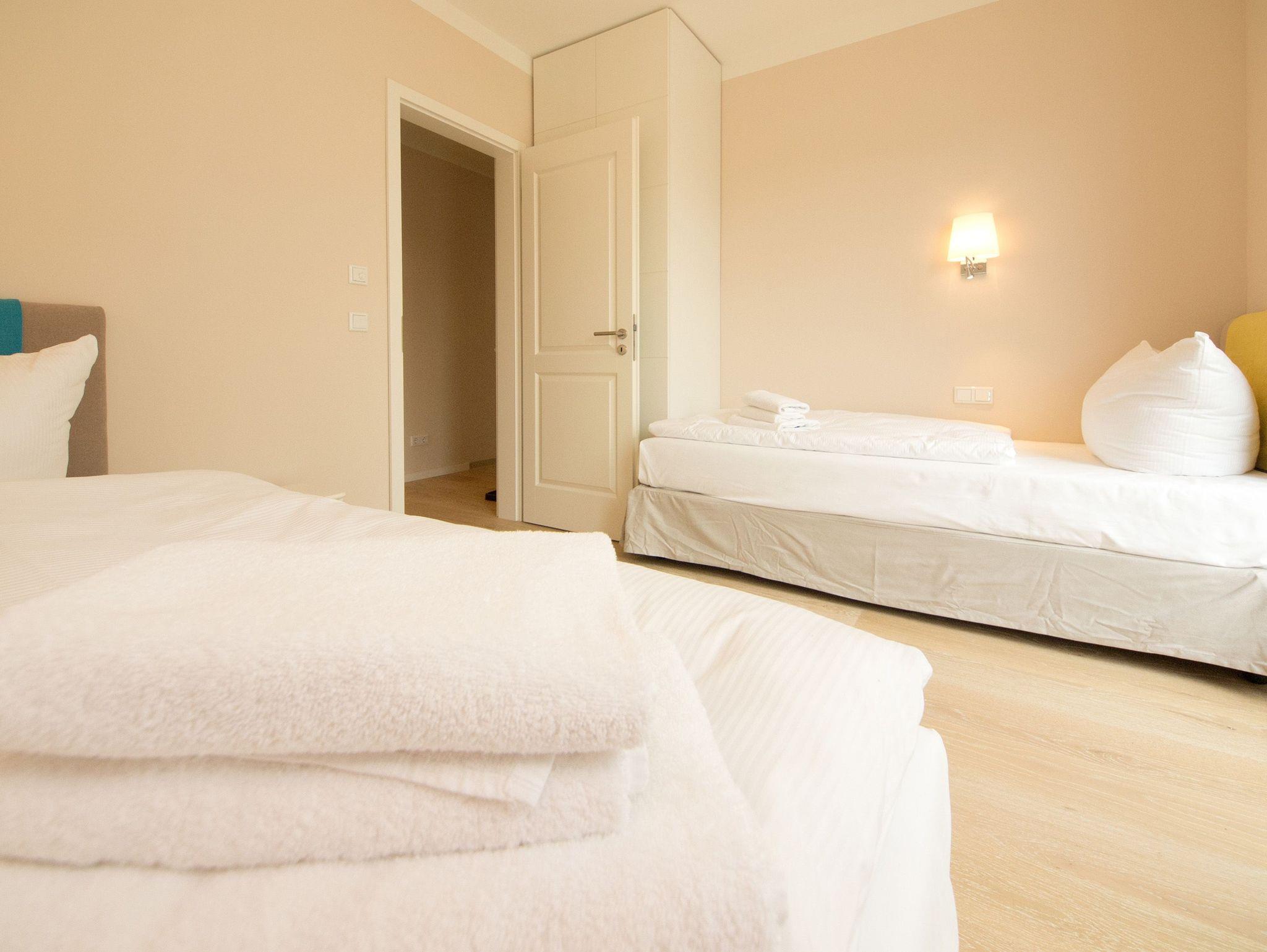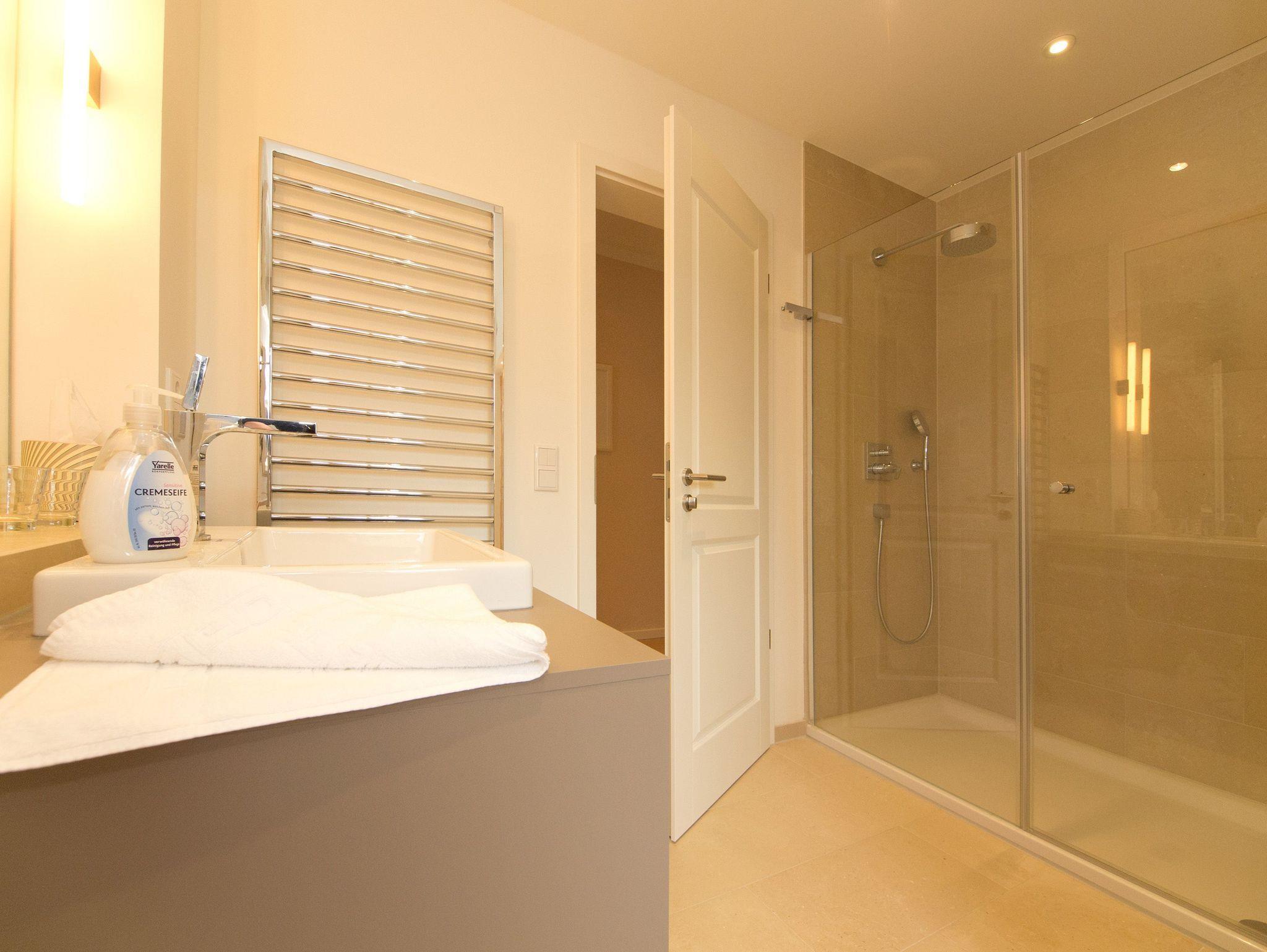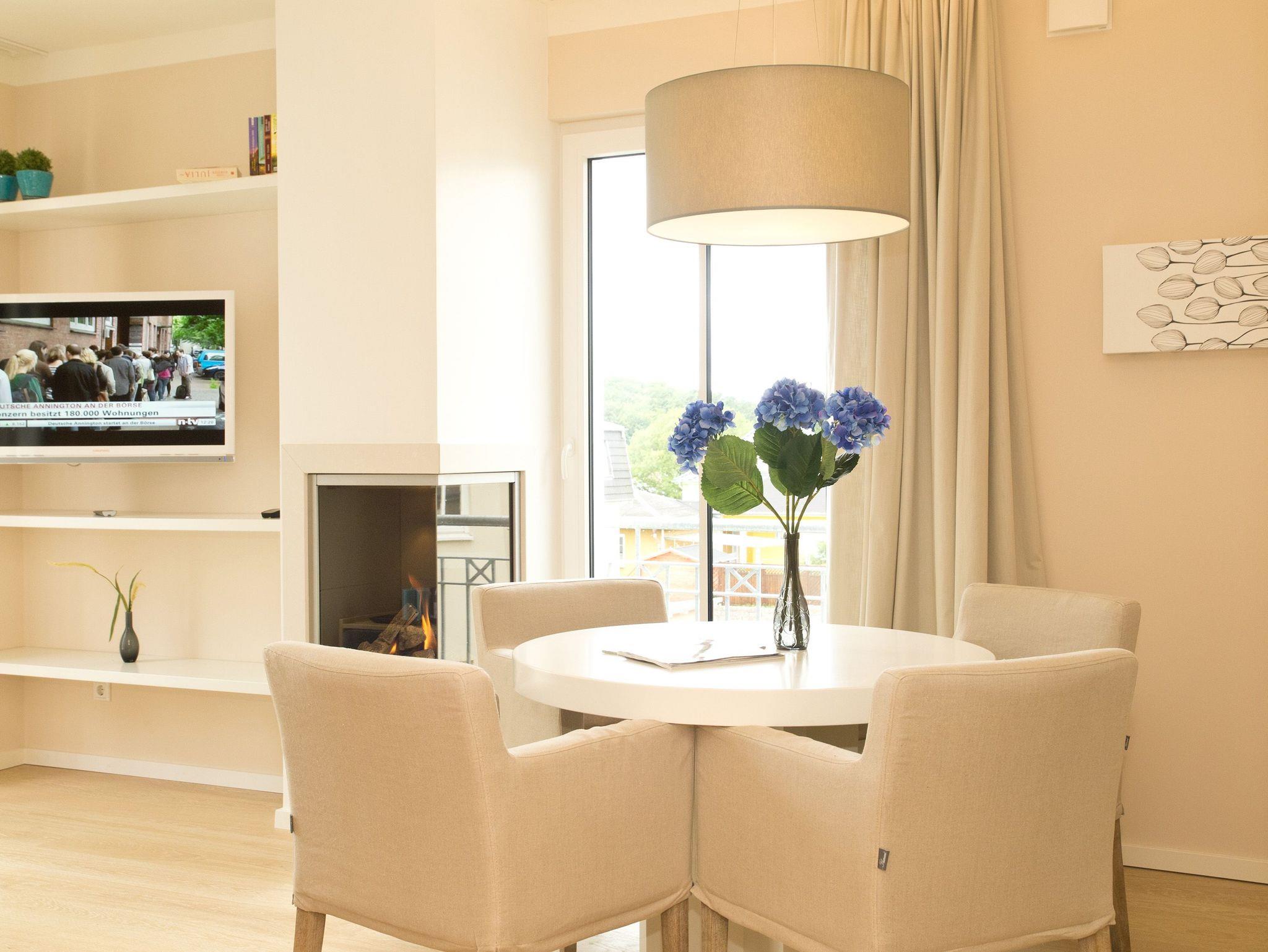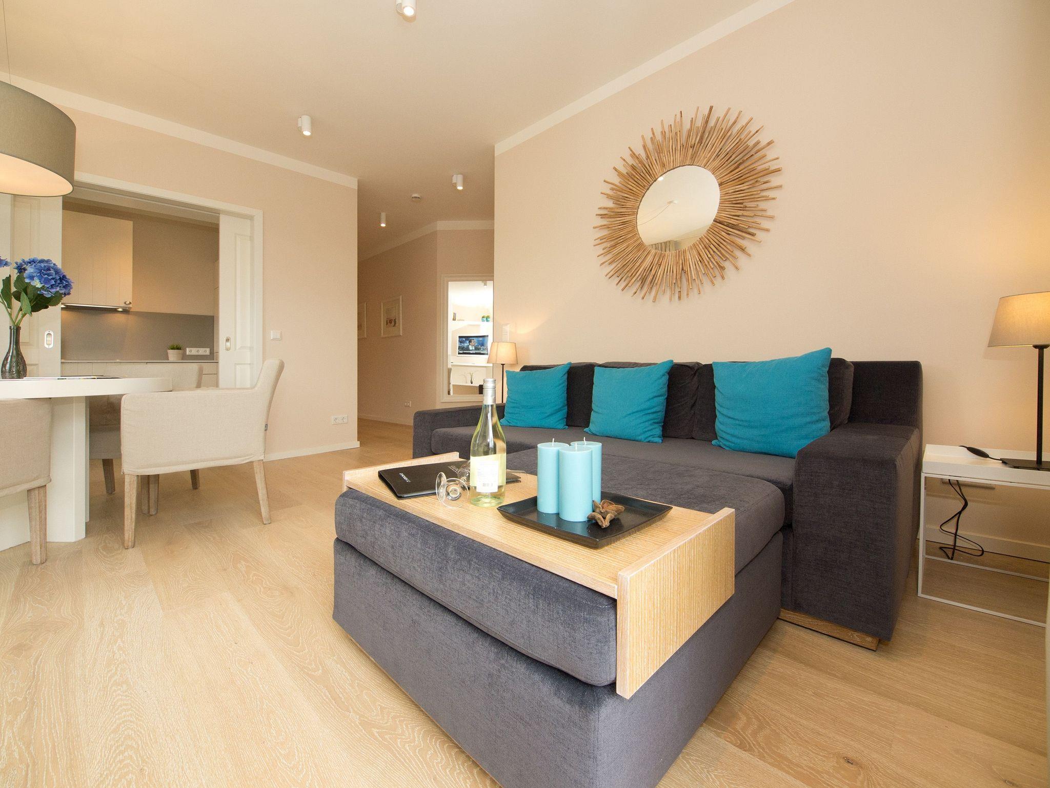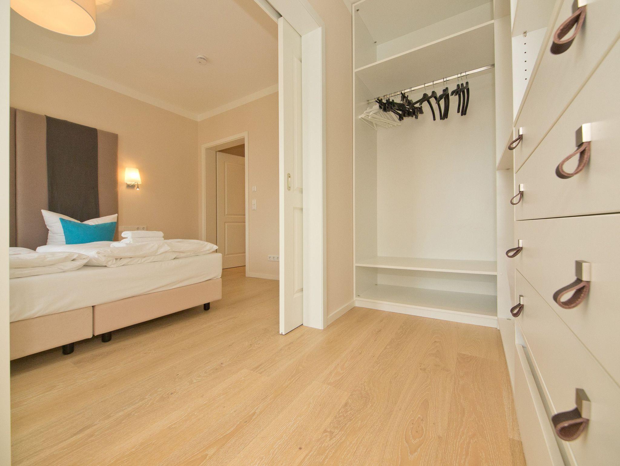 Ein maßgeschneidertes Wohlfühldomizil empfängt Sie in der zweiten Etage des Dünenpalais. Auf großzügigen 80 qm finden hier 4 Personen und 1 Kleinkind (bis 3 Jahre im Kinderreisebett) Platz zum entspannten Urlauben. Ein edler, heller Dielenboden wurde von versierter Architektenhand geschickt mit einer modernen exklusiven Einrichtung kombiniert. An den Wohnbereich mit Sitzgruppe, Flat-TV und Gaskamin (per Fernbedienung zu benutzen) schließen sich die bequeme Essgruppe und die schöne, komplett ausgestattete Küche im modernen Landhausstil (durch Schiebetür abgetrennt) an. Das große Schlafzimmer ist mit einem Doppelboxspringbett ausgestattet, von hier hat man sogar ein wenig Meerblick! In der angrenzenden Ankleide ist viel Platz für Ihre Urlaubsbekleidung. Das zweite, kleinere Schlafzimmer ist mit 2 Einzelbetten ausgestattet. Von hier und natürlich auch vom Wohnbereich hat man Zugang zum sonnigen Südbalkon. Ein besonderes Highlight ist die wohnungseigene Sauna, die im schönen Bad mit großer Glasdusche integriert ist. Für Ihren Komfort steht die Erstausstattung Wäsche für Sie bereit. Ein Kinderreisebett (ohne zusätzliche Matratze und Bettzeug) und einen Hochstuhl können Sie auf Wunsch gegen einen Aufpreis dazu buchen. Ein Pkw-Stellplatz befindet sich in der Tiefgarage.