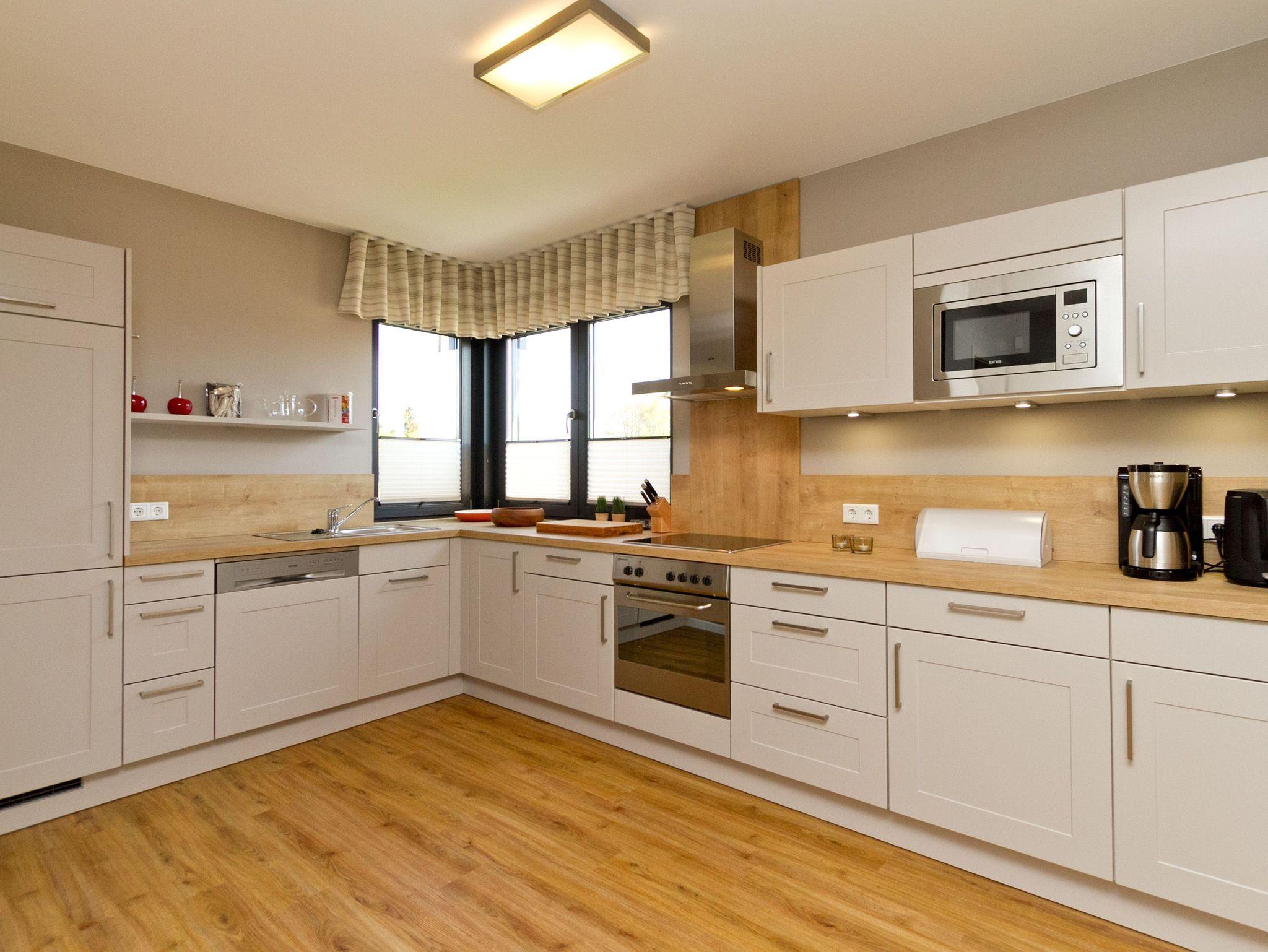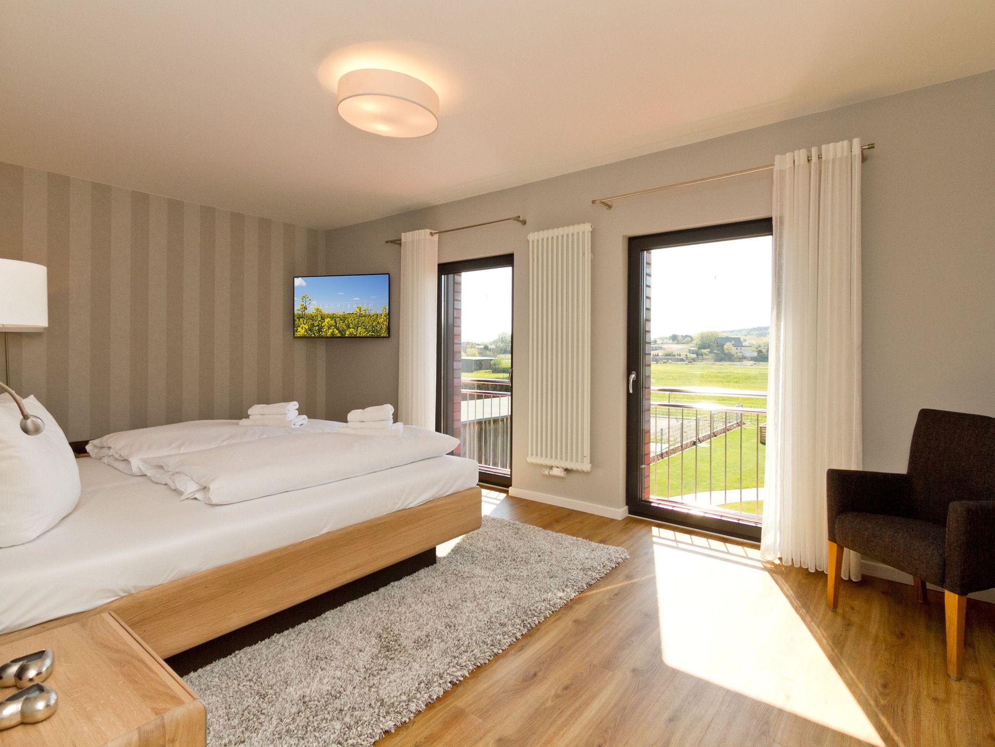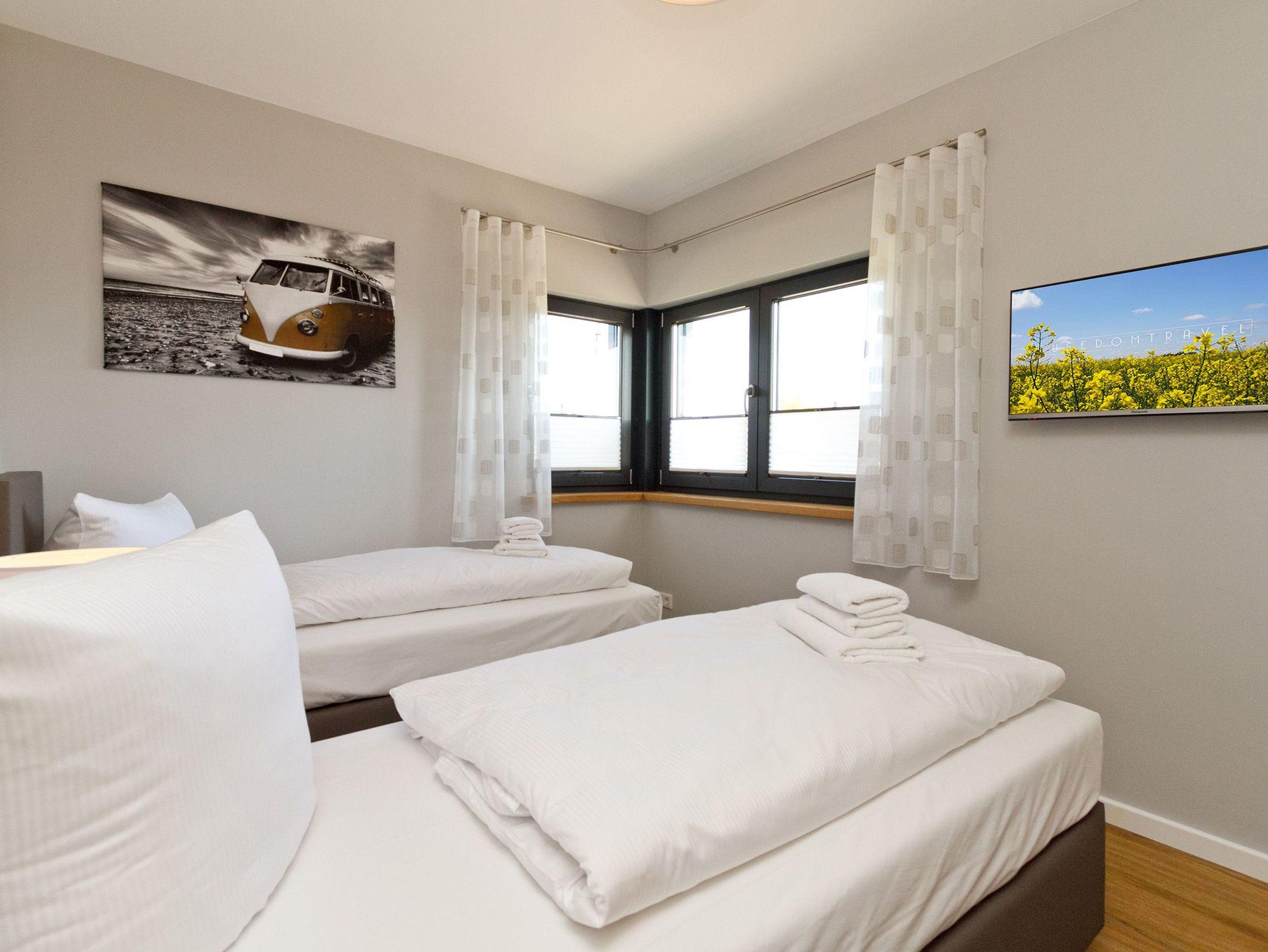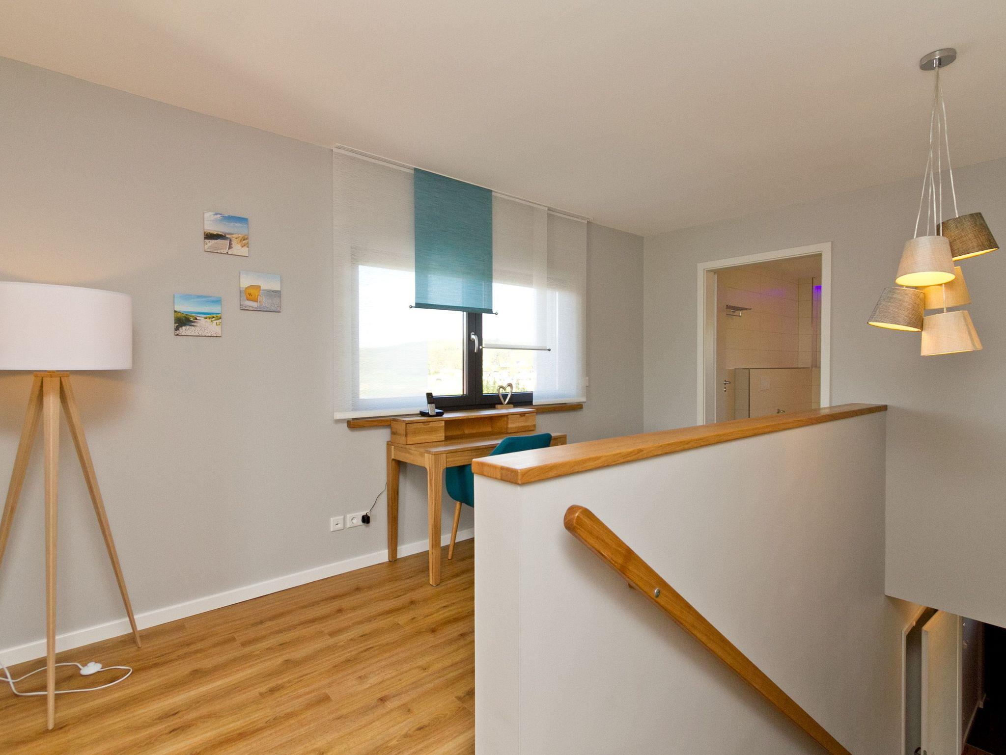 Herzlich willkommen im Ferienhaus Wiesenblick. Auf 140 Quadratmetern finden bis zu sechs Personen und zwei Kleinkinder viel Raum zum Entspannen. Der Wohnbereich im Erdgeschoss wirkt durch die großen Fenster offen und freundlich. Eine bequeme Sitzgruppe, Flat TV, Internetradio und der Kamin machen ihn zum Mittelpunkt des Hauses. Von hier erreichen Sie die sonnige Südterrasse mit rund 30 Quadratmetern Fläche, Strandkorb, Sitzmöbeln und freiem Blick über die Ahlbecker Wiesen. Die offene Küche ist modern ausgestattet und bietet am hellen Essplatz genügend Platz für gemeinsame Mahlzeiten. Ein Bad mit Dusche und WC sowie ein Hauswirtschaftsraum mit Waschmaschine und Trockner runden das Erdgeschoss ab. Im Obergeschoss liegen die drei Schlafzimmer. Das große Schlafzimmer mit Doppelbett und Flat TV bietet viel Stauraum und eine ruhige Atmosphäre. Das zweite Schlafzimmer, ebenfalls mit Doppelbett, führt in das dritte Schlafzimmer mit zwei Boxspring Einzelbetten und Flat TV. Das moderne Bad auf dieser Etage verfügt über Farblicht, Badewanne, Dusche und Doppelwaschtisch. Elektrische Jalousien im ganzen Haus sorgen bei Bedarf für gute Verdunklung. Im Garten steht Ihnen ein Saunahäuschen mit Münzautomat zur Verfügung. WLAN nutzen Sie kostenfrei. Fahrräder können zusätzlich kostenfrei gebucht werden, ausgenommen in den Monaten Juli und August.