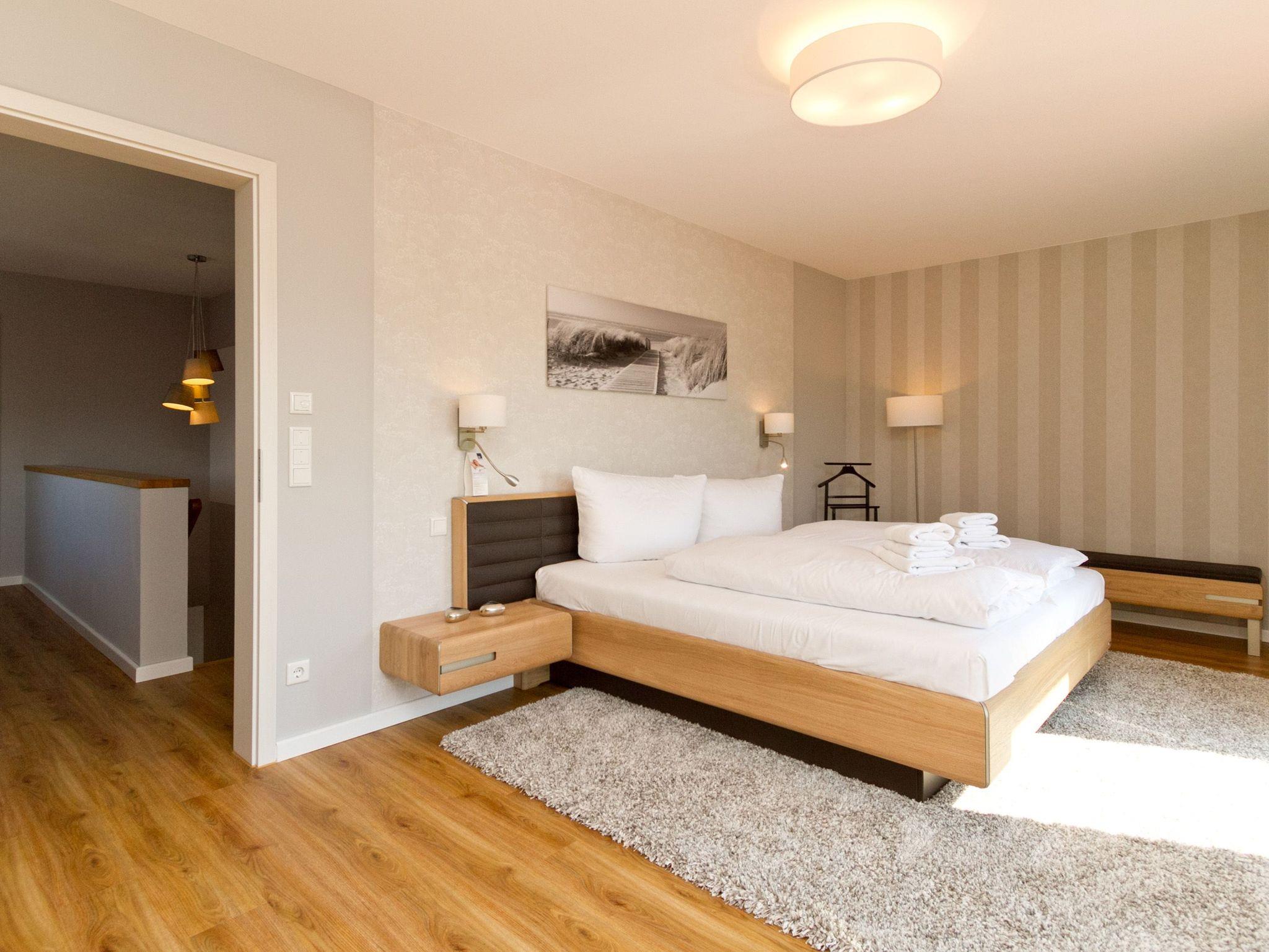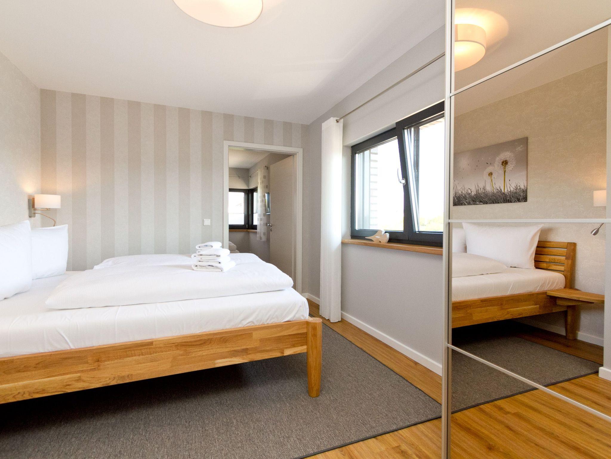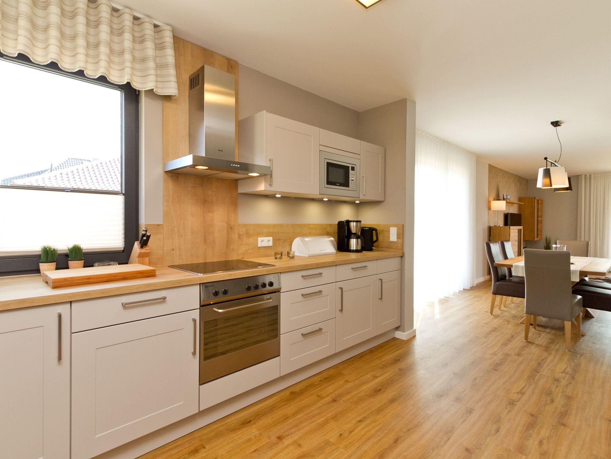 Herzlich willkommen im Ferienhaus Wiesenblick. Auf 140 Quadratmetern finden bis zu sechs Personen und zwei Kleinkinder viel Raum zum Entspannen. Der Wohnbereich im Erdgeschoss wirkt durch die großen Fenster offen und freundlich. Eine bequeme Sitzgruppe, Flat TV, Internetradio und der Kamin machen ihn zum Mittelpunkt des Hauses. Von hier erreichen Sie die sonnige Südterrasse mit rund 30 Quadratmetern Fläche, Strandkorb, Sitzmöbeln und freiem Blick über die Ahlbecker Wiesen. Die offene Küche ist modern ausgestattet und bietet am hellen Essplatz genügend Platz für gemeinsame Mahlzeiten. Ein Bad mit Dusche und WC sowie ein Hauswirtschaftsraum mit Waschmaschine und Trockner runden das Erdgeschoss ab. Im Obergeschoss liegen die drei Schlafzimmer. Das große Schlafzimmer mit Doppelbett und Flat TV bietet viel Stauraum und eine ruhige Atmosphäre. Das zweite Schlafzimmer, ebenfalls mit Doppelbett, führt in das dritte Schlafzimmer mit zwei Boxspring Einzelbetten und Flat TV. Das moderne Bad auf dieser Etage verfügt über Farblicht, Badewanne, Dusche und Doppelwaschtisch. Elektrische Jalousien im ganzen Haus sorgen bei Bedarf für gute Verdunklung. Im Garten steht Ihnen ein Saunahäuschen mit Münzautomat zur Verfügung. WLAN nutzen Sie kostenfrei. Fahrräder können zusätzlich kostenfrei gebucht werden, ausgenommen in den Monaten Juli und August.
