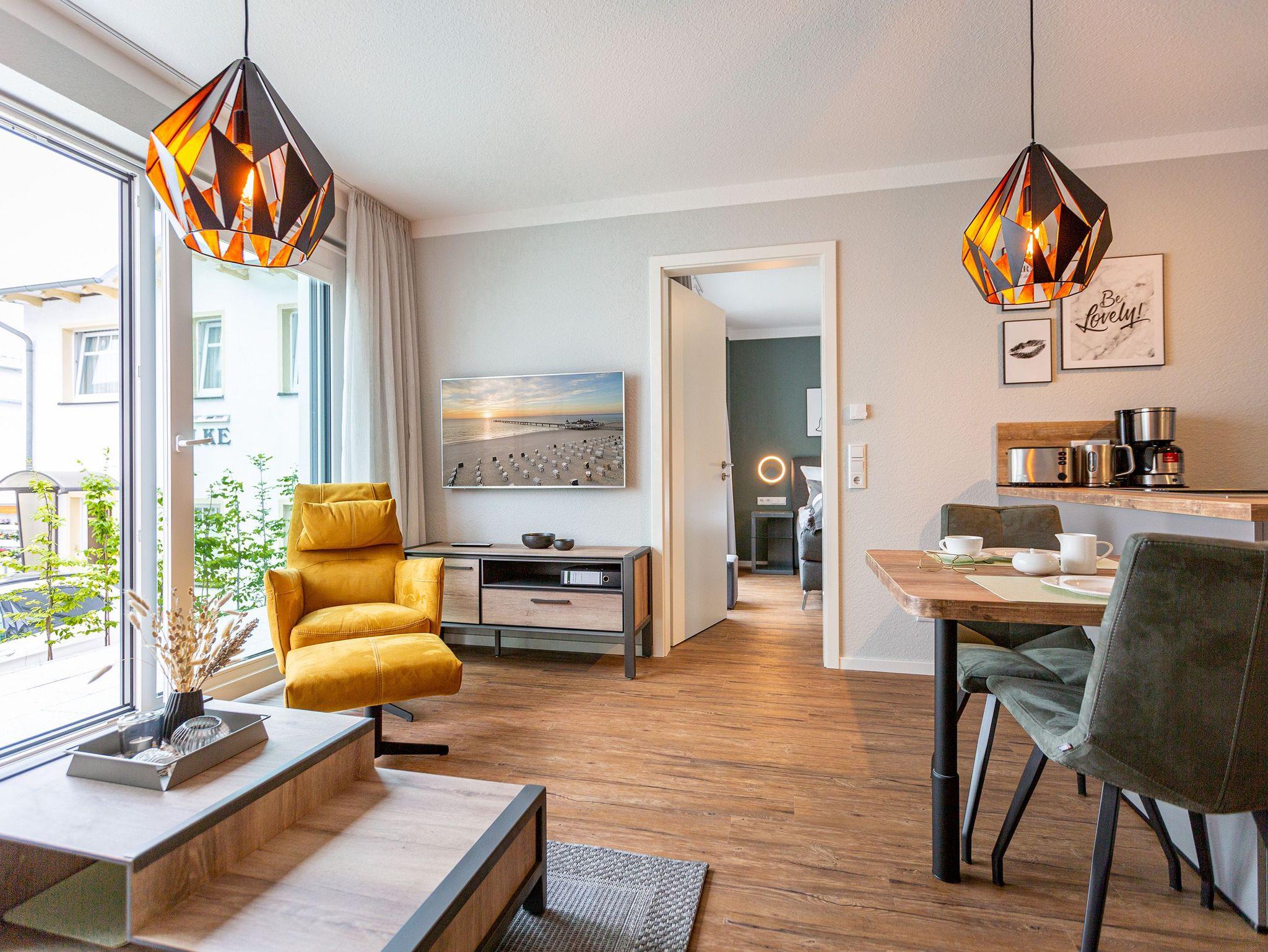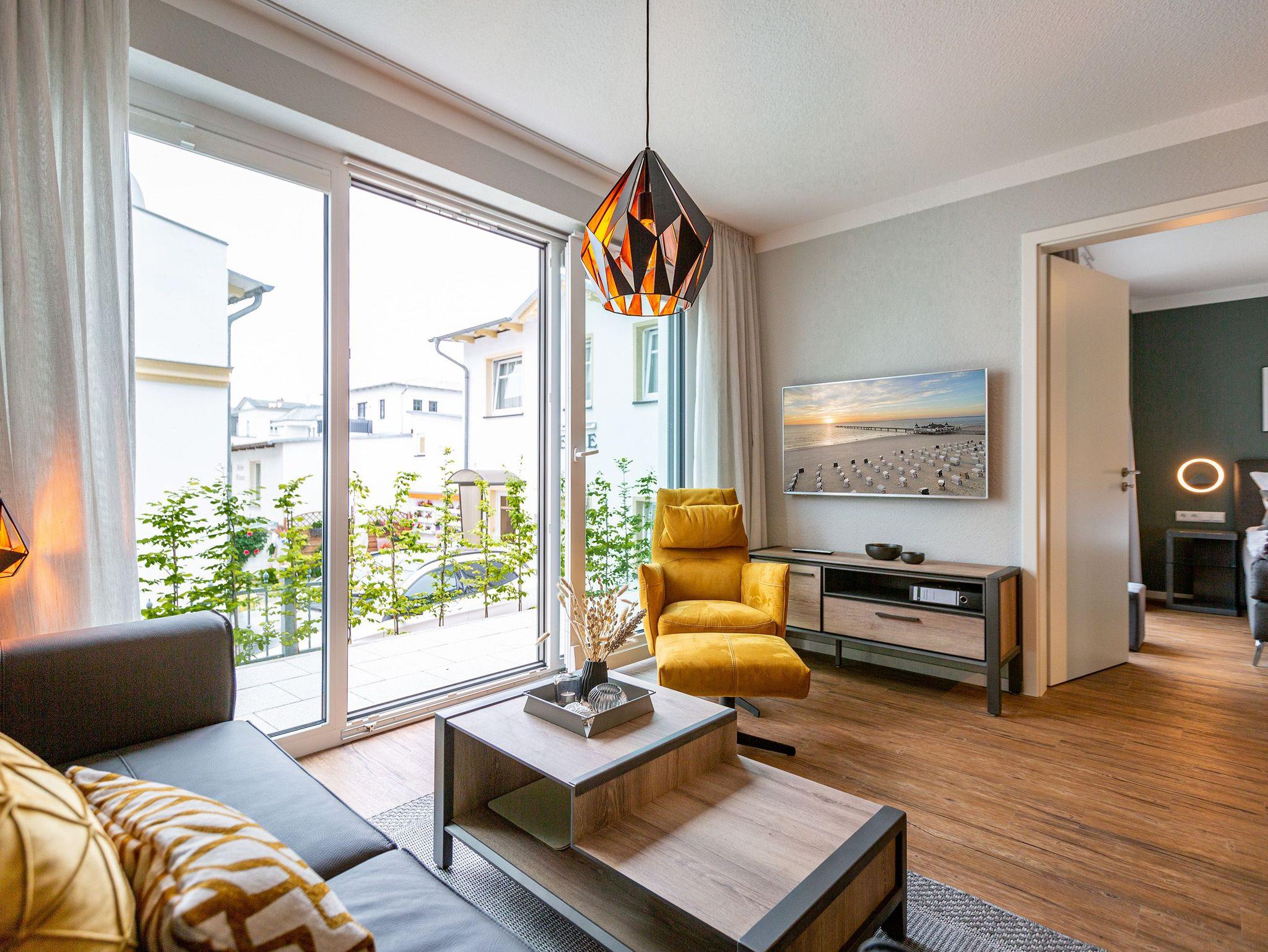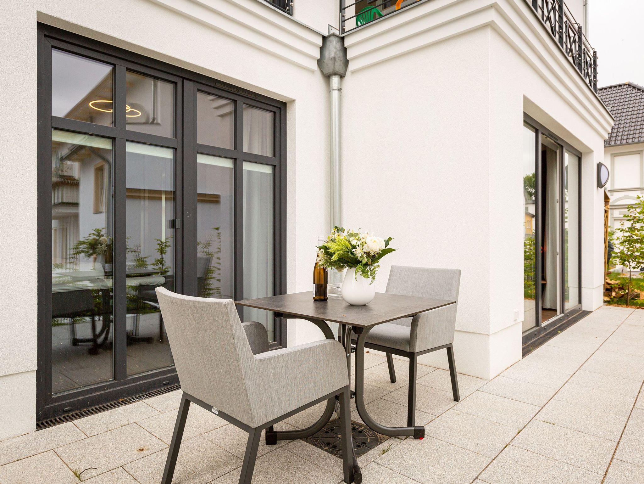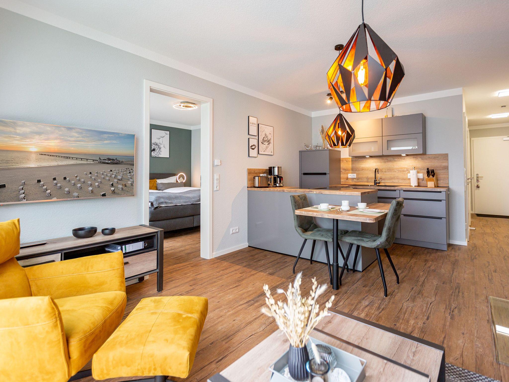 Mit viel Geschmack und einer Vorliebe für nordisches Design wurde dieses 54 Quadratmeter große Ferienparadies im Erdgeschoss des Quartiers Frohsinn eingerichtet. Die zwei Zimmer des Appartements sind eine kuschelige und zugleich stylische Wohlfühloase für zwei Personen. Das moderne Interieur besticht durch viel Eleganz. Ob Smart-TV oder schnelles und kostenfreies WLAN - Die Technik ist auf dem neuesten Stand. Das Wohnzimmer besitzt sogar einen Kamin. Freuen Sie sich auf entspannte Stunden zu zweit auf dem bequemen Sofa oder im Lesesessel. In das geräumige Wohnzimmer ist eine offene Küche mit einem Esstisch und zwei Stühlen intergiert. Voll ausgestattet mit hochwertigen Küchengeräten und edlem Geschirr bietet Sie allen Komfort. Vor dem Wohnzimmer befindet sich eine kleine Nord-Terrasse. Lassen Sie es sich auf den Gartenmöbeln oder den beiden Sonnenliegen gut gehen. Für erholsame Träume sorgt das behagliche Schlafzimmer. Auf dem komfortablen Boxspringdoppelbett (1,80 m x 2,00 m) schlafen Sie wie auf Wolken. Auch hier gibt es einen Smart-TV. Ein geräumiger Schrank bietet viel Platz. Das Badezimmer ist nicht einfach nur mit einer Dusche und einem WC ausgestattet. Hier wartet zudem eine kleine Finnische Sauna nur darauf, Sie an kühlen Inseltagen muschelig aufzuwärmen. Handtücher liegen für Sie bereit. Und auch die Betten sind bei Anreise schon bezogen. Zur Wohnung gehört ein Stellplatz in der Tiefgarage. Für ihre Fahrräder gibt es einen separaten Kellerraum.