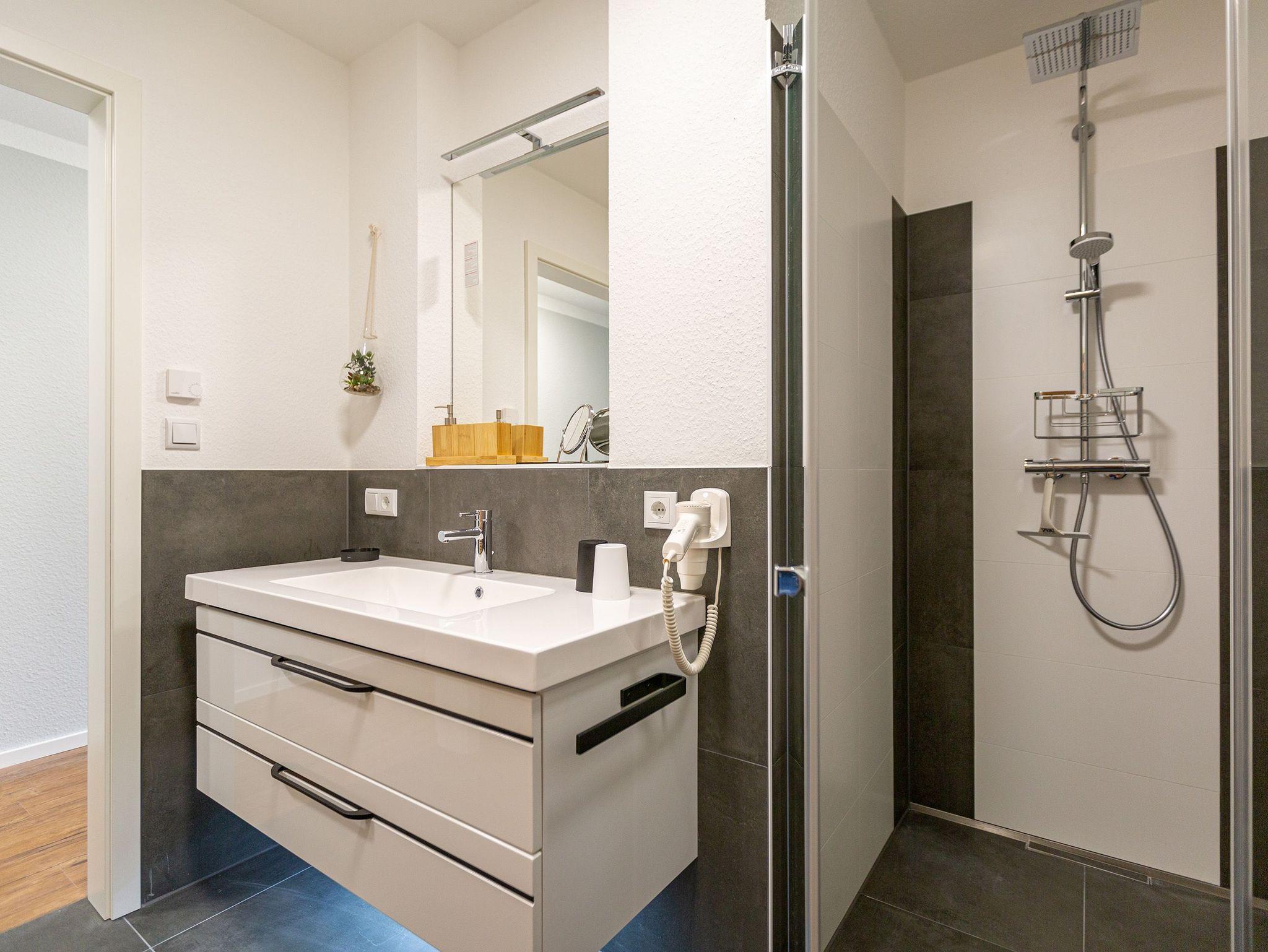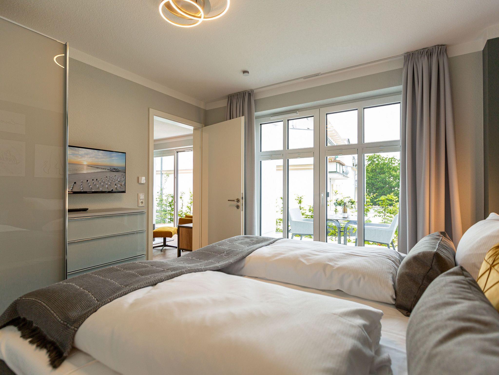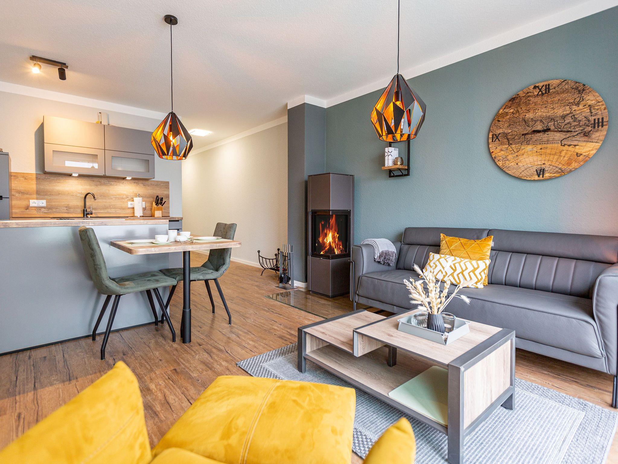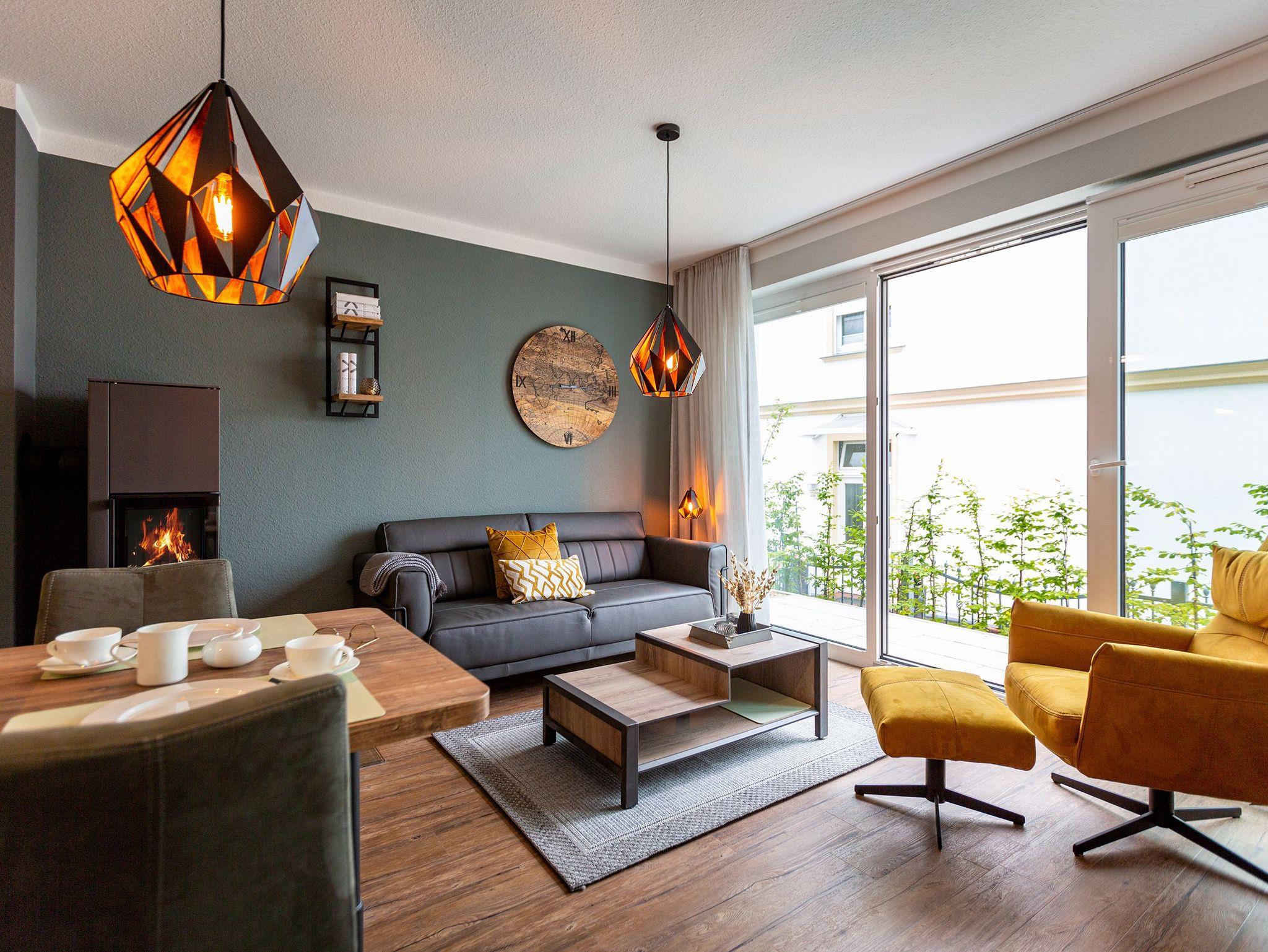 Mit viel Geschmack und einer Vorliebe für nordisches Design wurde dieses 54 Quadratmeter große Ferienparadies im Erdgeschoss des Quartiers Frohsinn eingerichtet. Die zwei Zimmer des Appartements sind eine kuschelige und zugleich stylische Wohlfühloase für zwei Personen. Das moderne Interieur besticht durch viel Eleganz. Ob Smart-TV oder schnelles und kostenfreies WLAN - Die Technik ist auf dem neuesten Stand. Das Wohnzimmer besitzt sogar einen Kamin. Freuen Sie sich auf entspannte Stunden zu zweit auf dem bequemen Sofa oder im Lesesessel. In das geräumige Wohnzimmer ist eine offene Küche mit einem Esstisch und zwei Stühlen intergiert. Voll ausgestattet mit hochwertigen Küchengeräten und edlem Geschirr bietet Sie allen Komfort. Vor dem Wohnzimmer befindet sich eine kleine Nord-Terrasse. Lassen Sie es sich auf den Gartenmöbeln oder den beiden Sonnenliegen gut gehen. Für erholsame Träume sorgt das behagliche Schlafzimmer. Auf dem komfortablen Boxspringdoppelbett (1,80 m x 2,00 m) schlafen Sie wie auf Wolken. Auch hier gibt es einen Smart-TV. Ein geräumiger Schrank bietet viel Platz. Das Badezimmer ist nicht einfach nur mit einer Dusche und einem WC ausgestattet. Hier wartet zudem eine kleine Finnische Sauna nur darauf, Sie an kühlen Inseltagen muschelig aufzuwärmen. Handtücher liegen für Sie bereit. Und auch die Betten sind bei Anreise schon bezogen. Zur Wohnung gehört ein Stellplatz in der Tiefgarage. Für ihre Fahrräder gibt es einen separaten Kellerraum.