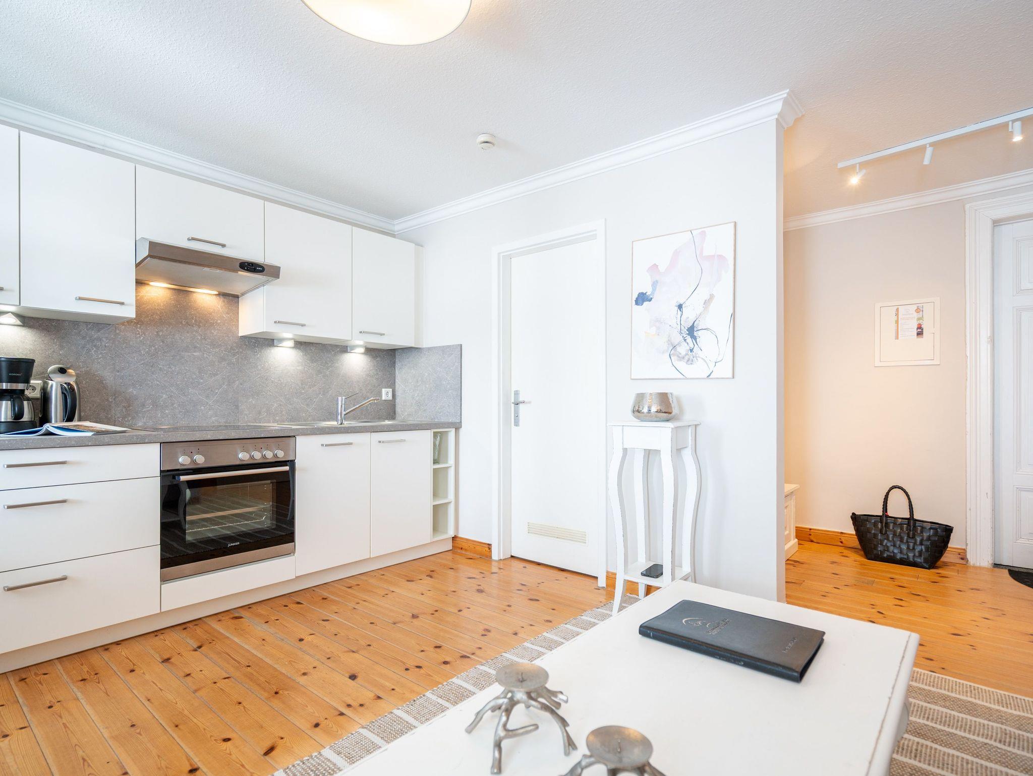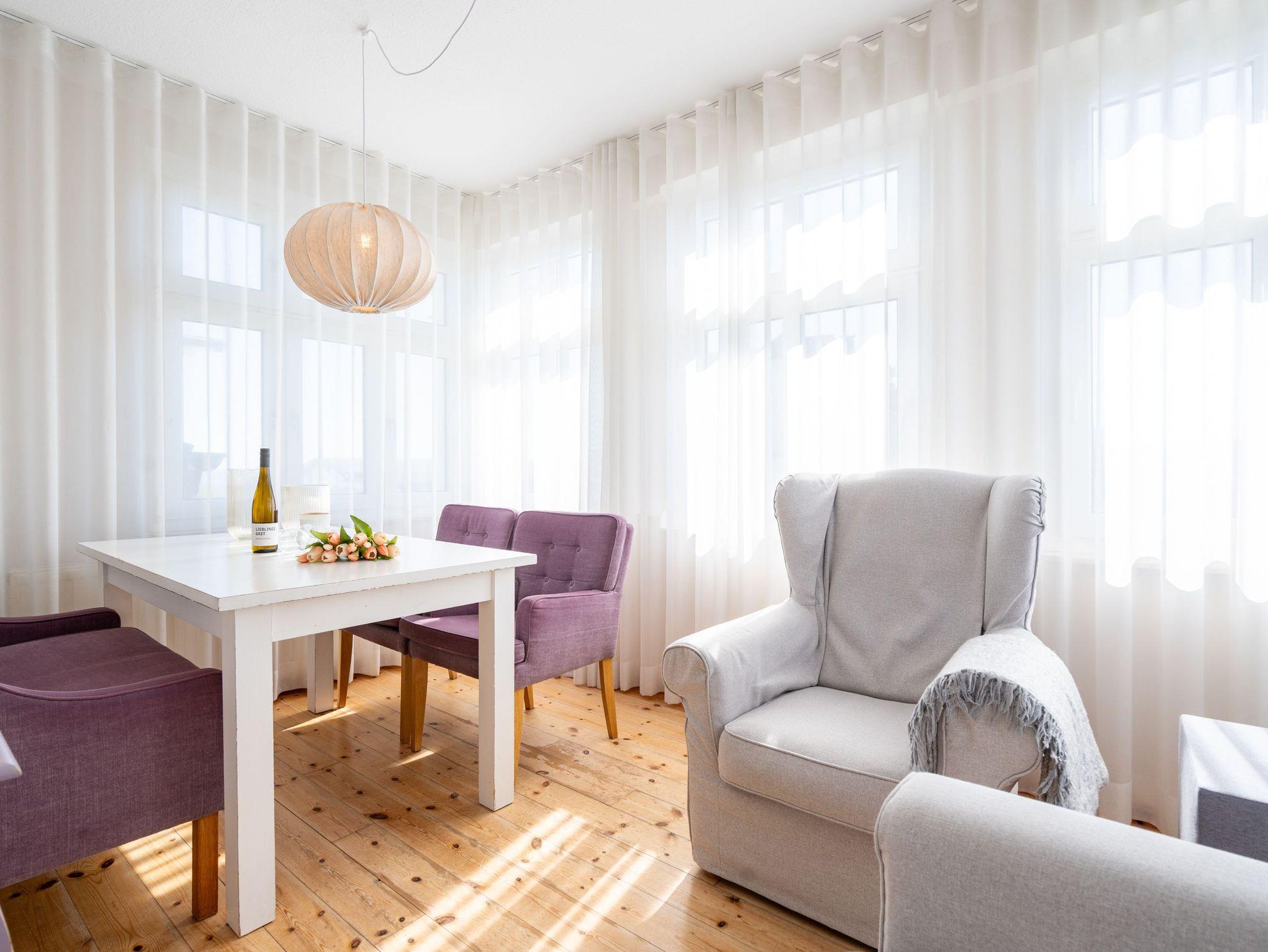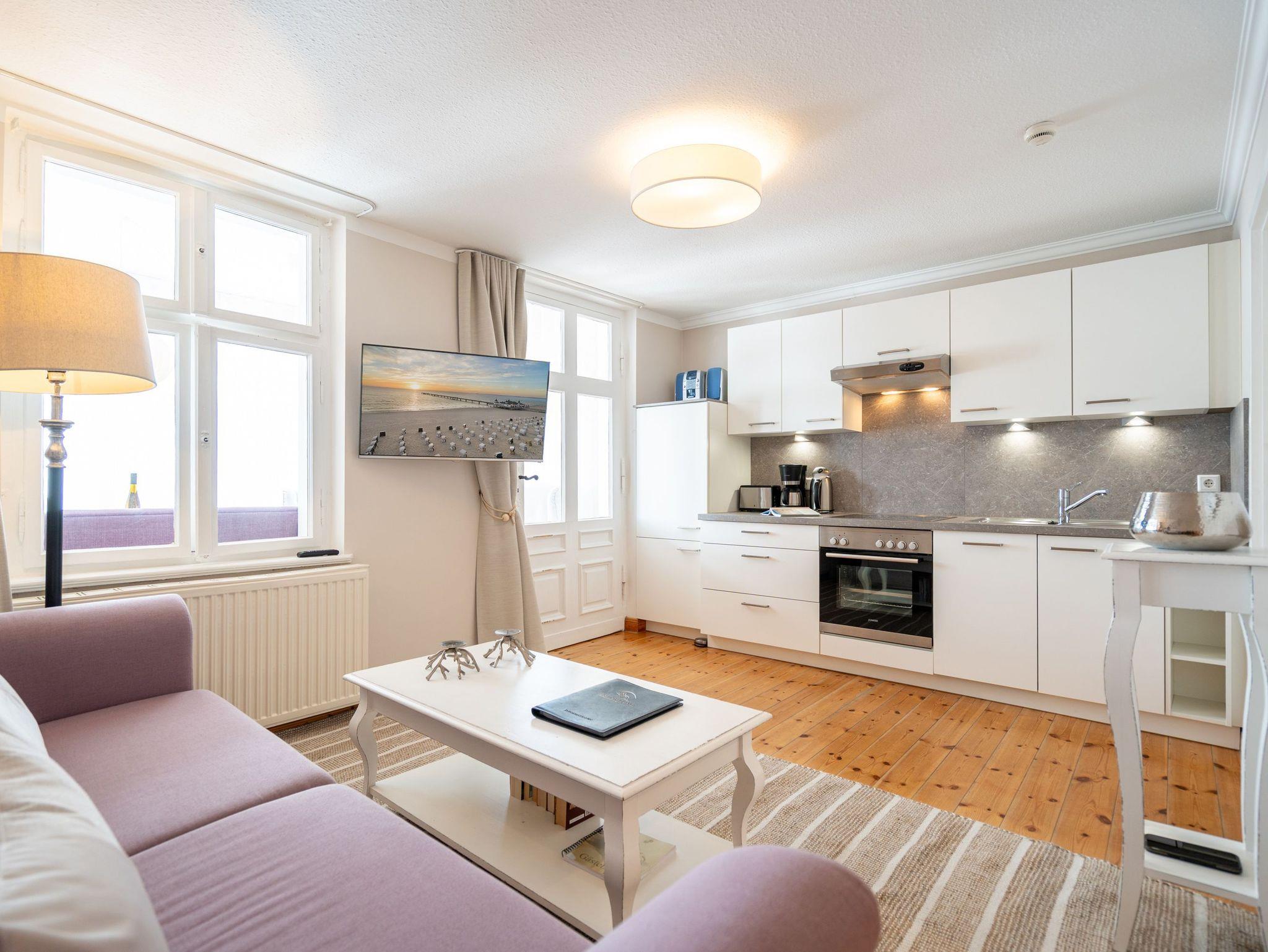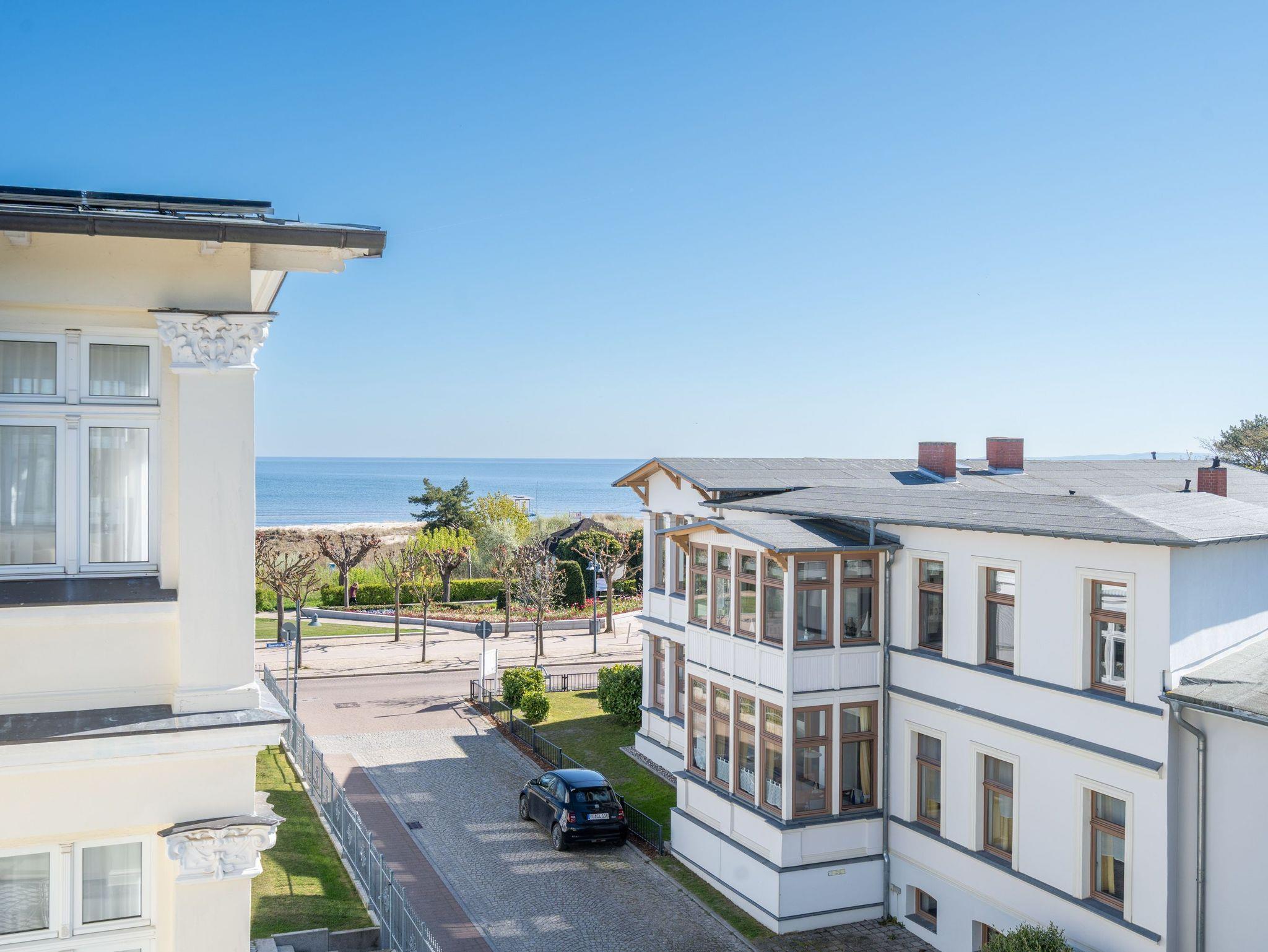 In Ihrer neu renovierten 2-Raum-Ferienwohnung (44 qm) für 2-3 Personen [&] 1 Kleinkind (bis 3 Jahre im Kinderreisebett) im Dachgeschoss logieren Sie in Bestlage mit schönem Ostseeblick! Nach dem Eingangsbereich empfängt Sie ein gemütlicher Wohnbereich mit Schlafsofa (als Aufbettungsmöglichkeit für eine 3. Person), Flat-TV und komplett ausgestatteter Küchenzeile. Genießen Sie von der verglasten Veranda aus den Blick auf die Ostsee. Ein schöner Essplatz und zwei gemütliche Ohrensessel laden zum Lesen, TV schauen oder Entspannen ein. Im Schlafzimmer sorgt ein bequemes Doppelboxspringbett (1,80m x 2,00m ) für Schlafkomfort, auch ein Kinderreisebett findet hier Platz. Ergänzt wird das Appartement durch ein modernes Badezimmer mit Dusche und WC. Ein Pkw-Stellplatz Nr. 8 befindet sich in der Tiefgarage auf dem Grundstück.