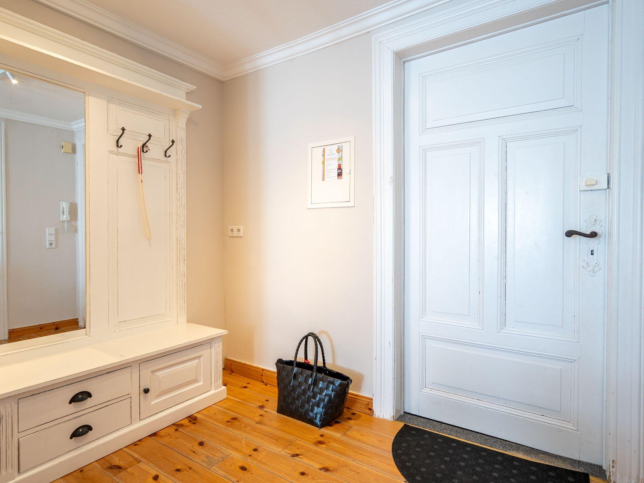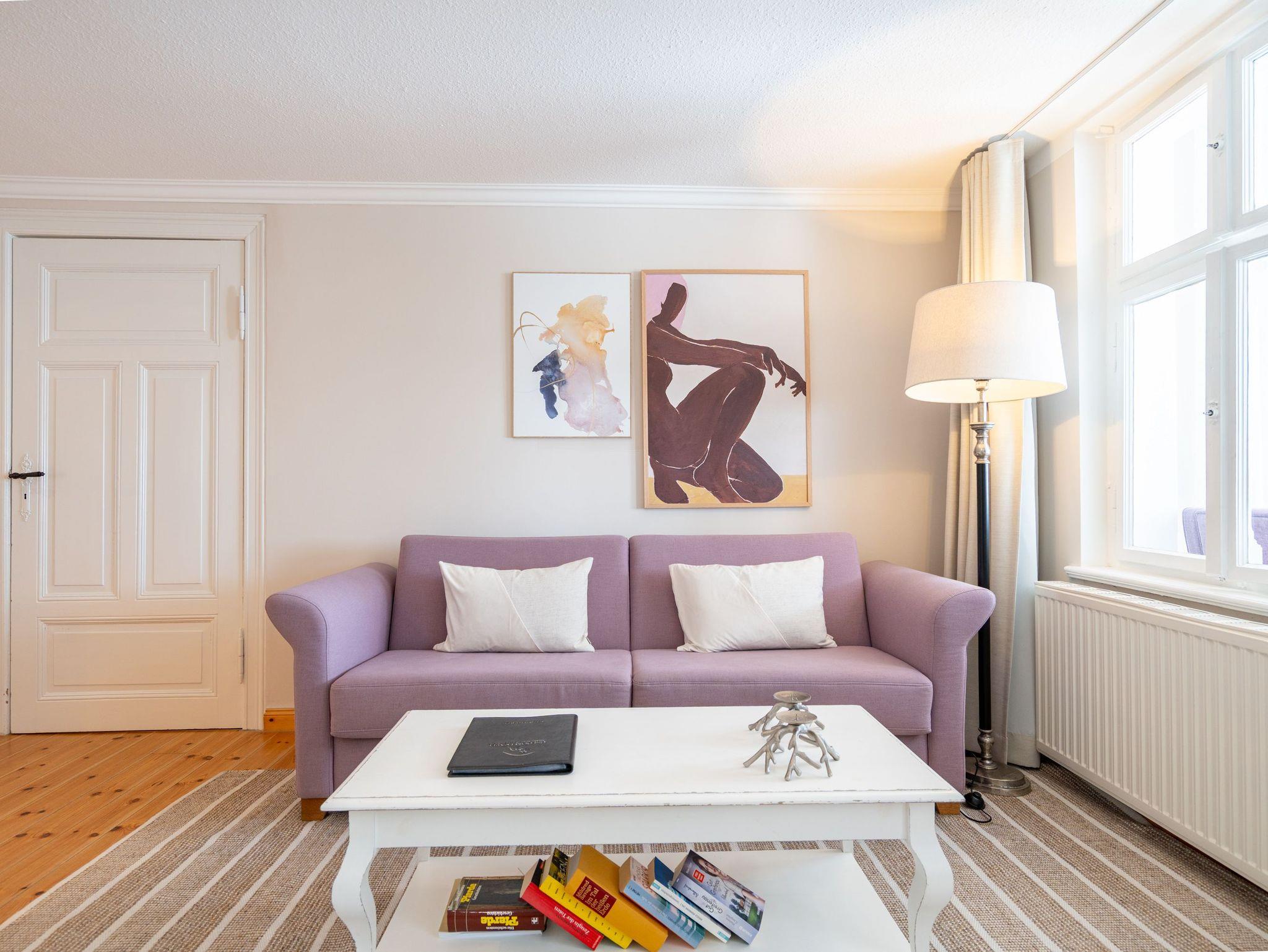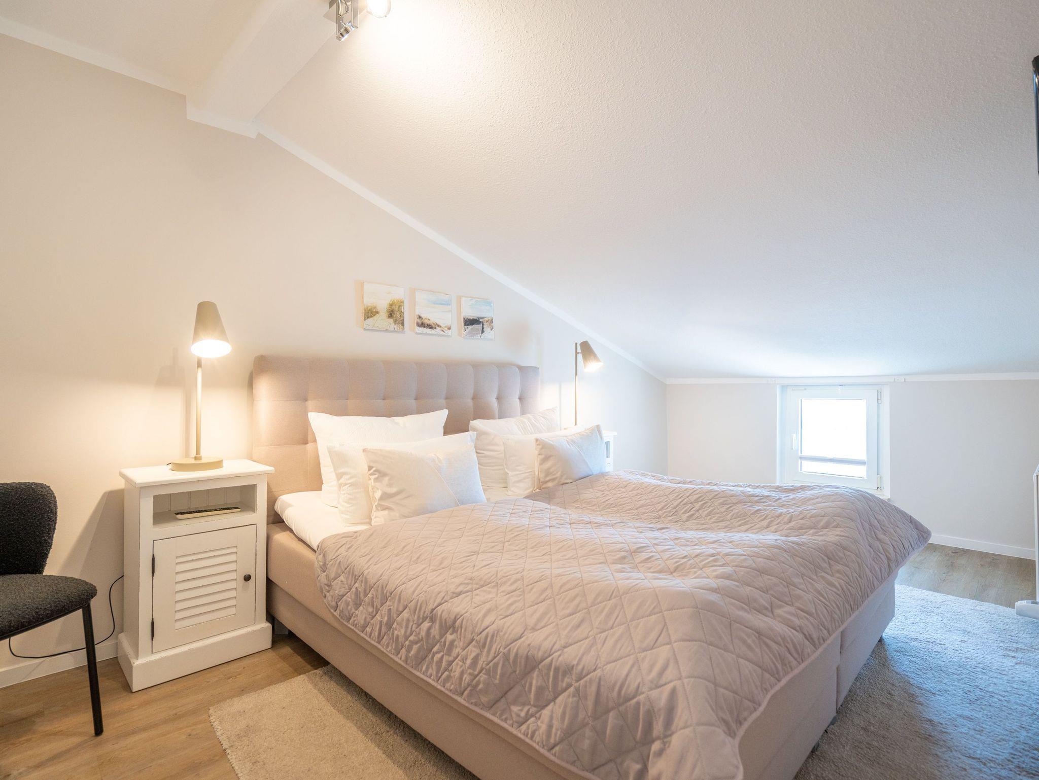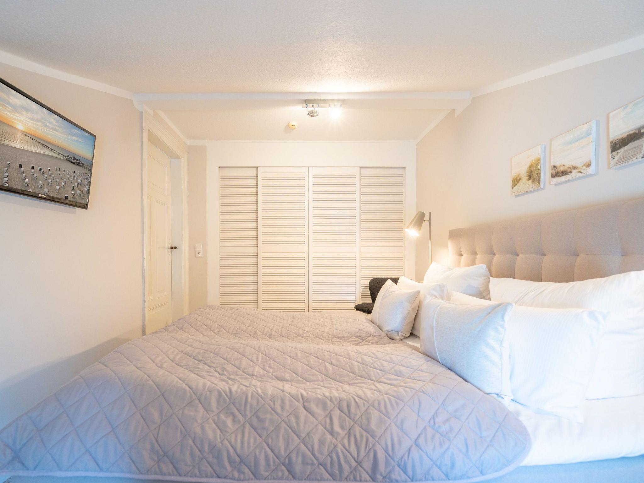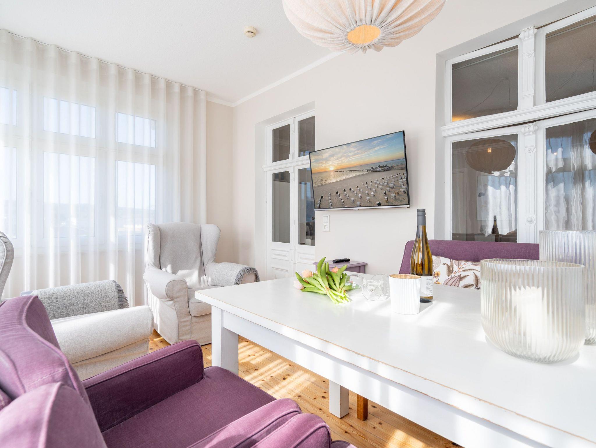 In Ihrer neu renovierten 2-Raum-Ferienwohnung (44 qm) für 2-3 Personen [&] 1 Kleinkind (bis 3 Jahre im Kinderreisebett) im Dachgeschoss logieren Sie in Bestlage mit schönem Ostseeblick! Nach dem Eingangsbereich empfängt Sie ein gemütlicher Wohnbereich mit Schlafsofa (als Aufbettungsmöglichkeit für eine 3. Person), Flat-TV und komplett ausgestatteter Küchenzeile. Genießen Sie von der verglasten Veranda aus den Blick auf die Ostsee. Ein schöner Essplatz und zwei gemütliche Ohrensessel laden zum Lesen, TV schauen oder Entspannen ein. Im Schlafzimmer sorgt ein bequemes Doppelboxspringbett (1,80m x 2,00m ) für Schlafkomfort, auch ein Kinderreisebett findet hier Platz. Ergänzt wird das Appartement durch ein modernes Badezimmer mit Dusche und WC. Ein Pkw-Stellplatz Nr. 8 befindet sich in der Tiefgarage auf dem Grundstück.