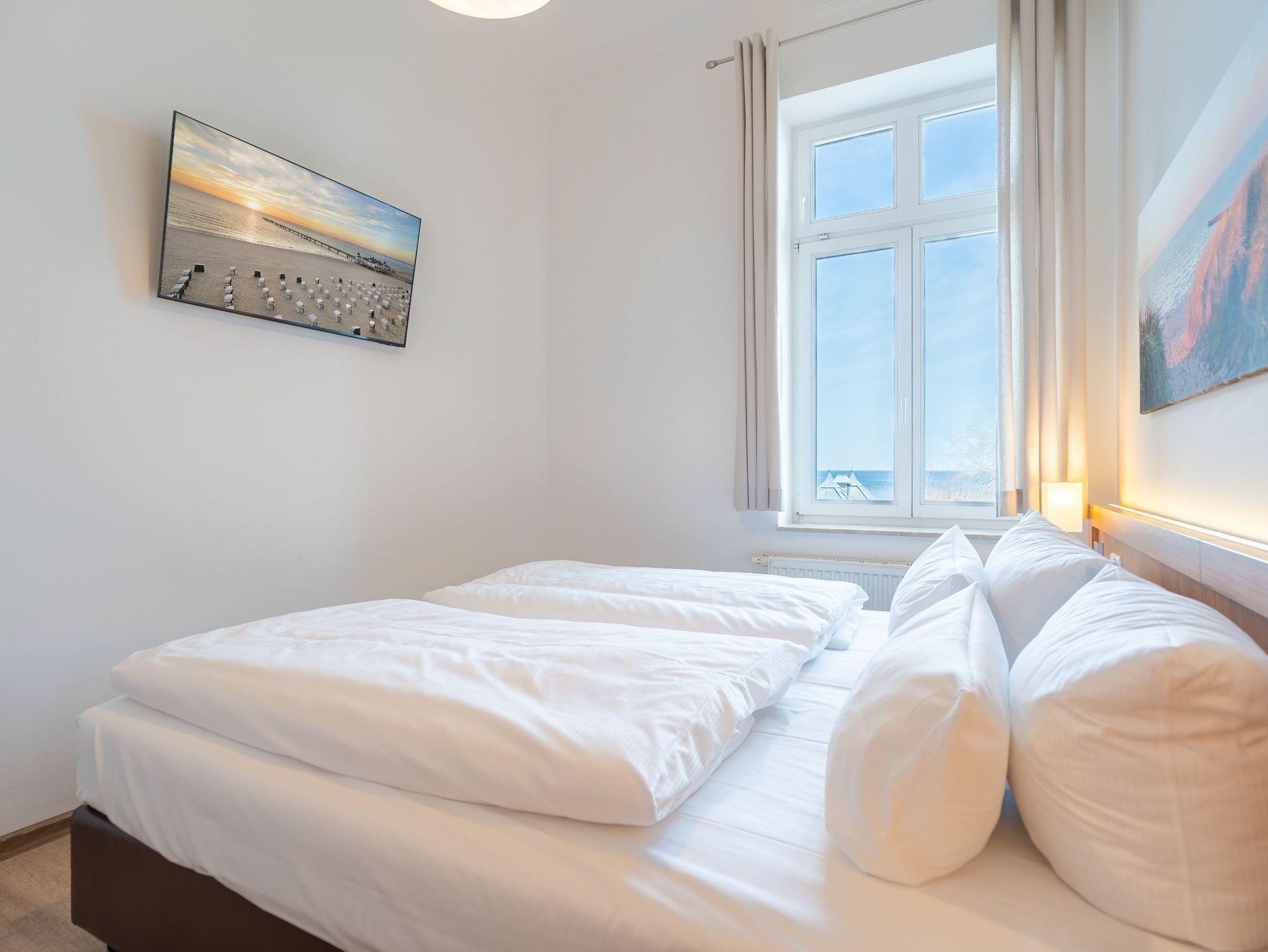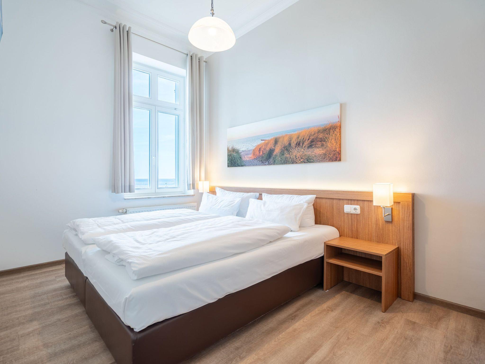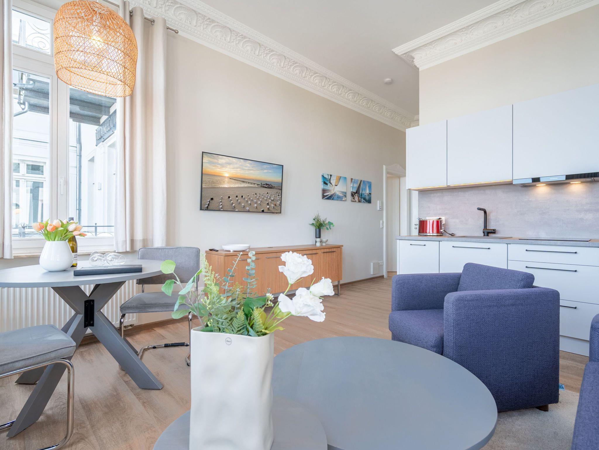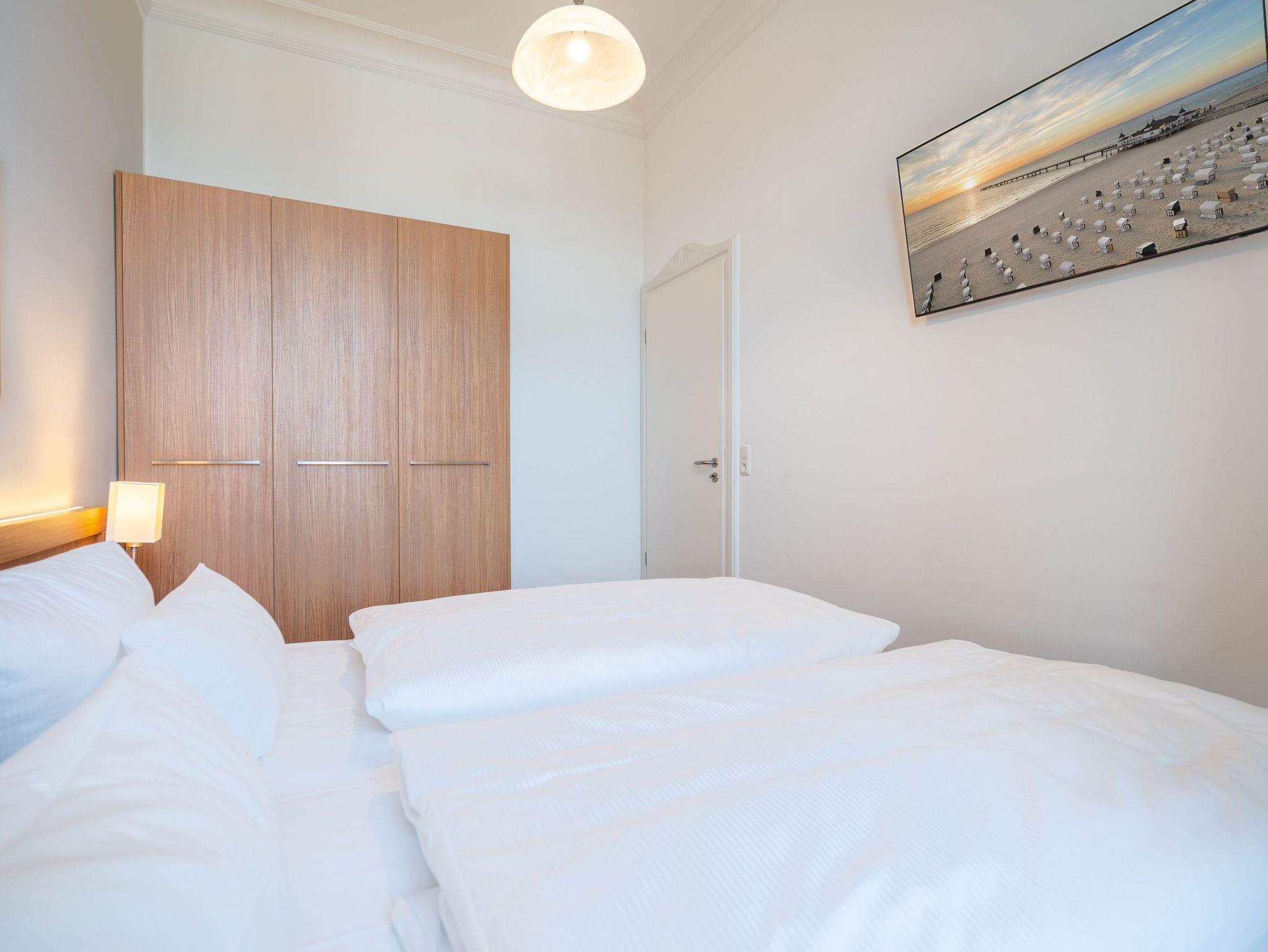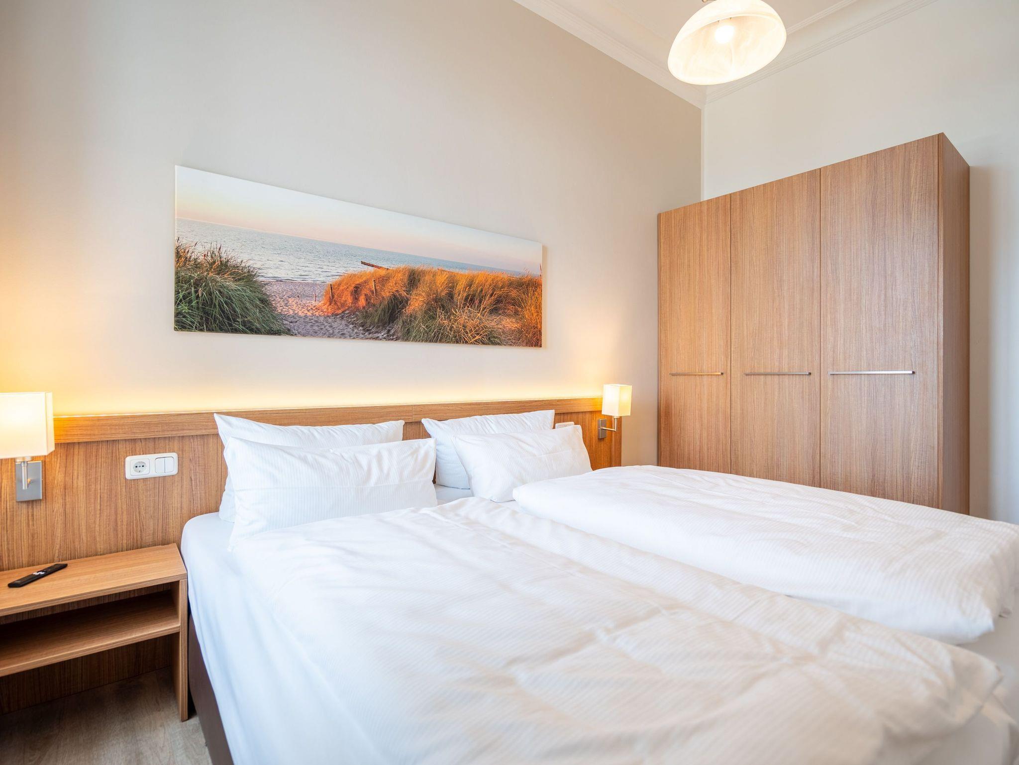 Die 2-Raum-Ferienwohnung Nr. C05 in der Villa Seedüwel bietet auf 41 qm Platz für zwei Personen und befindet sich im 1. Obergeschoss. Der offene Wohnbereich bietet einen Blick zur Promenade und Richtung Ostsee und ist mit einer Küchenzeile ausgestattet, die ein Induktionskochfeld, eine Mikrowelle und einen Kühlschrank mit Gefrierfach umfasst. Ein Essplatz für zwei Personen, eine gemütliche Sitzgruppe und ein Flat-TV sorgen für Komfort. Das Schlafzimmer verfügt über ein Doppelbett (1,80 m x 2,00 m) und einen Kleiderschrank. Auch von hier aus genießen Sie den Blick Richtung Promenade und Ostsee. Das Bad ist mit einer Dusche und einem Waschbecken ausgestattet, zudem gibt es ein separates WC. Ein Stellplatz in der Tiefgarage ( Einfahrthöhe 2,03m) des benachbarten Hauses „Strandterrasse“ ist für Sie reserviert. WLAN steht Ihnen kostenfrei zur Verfügung.