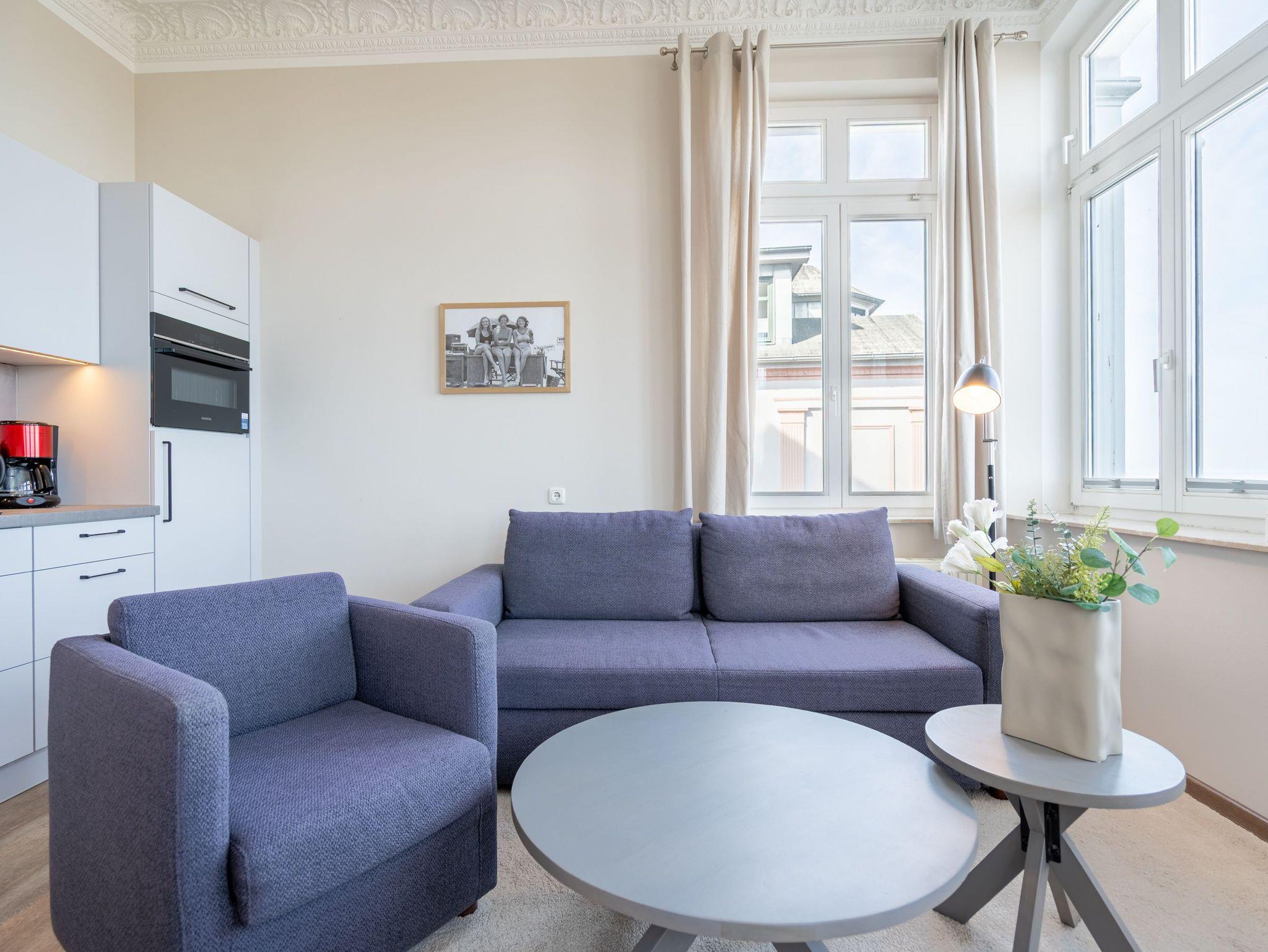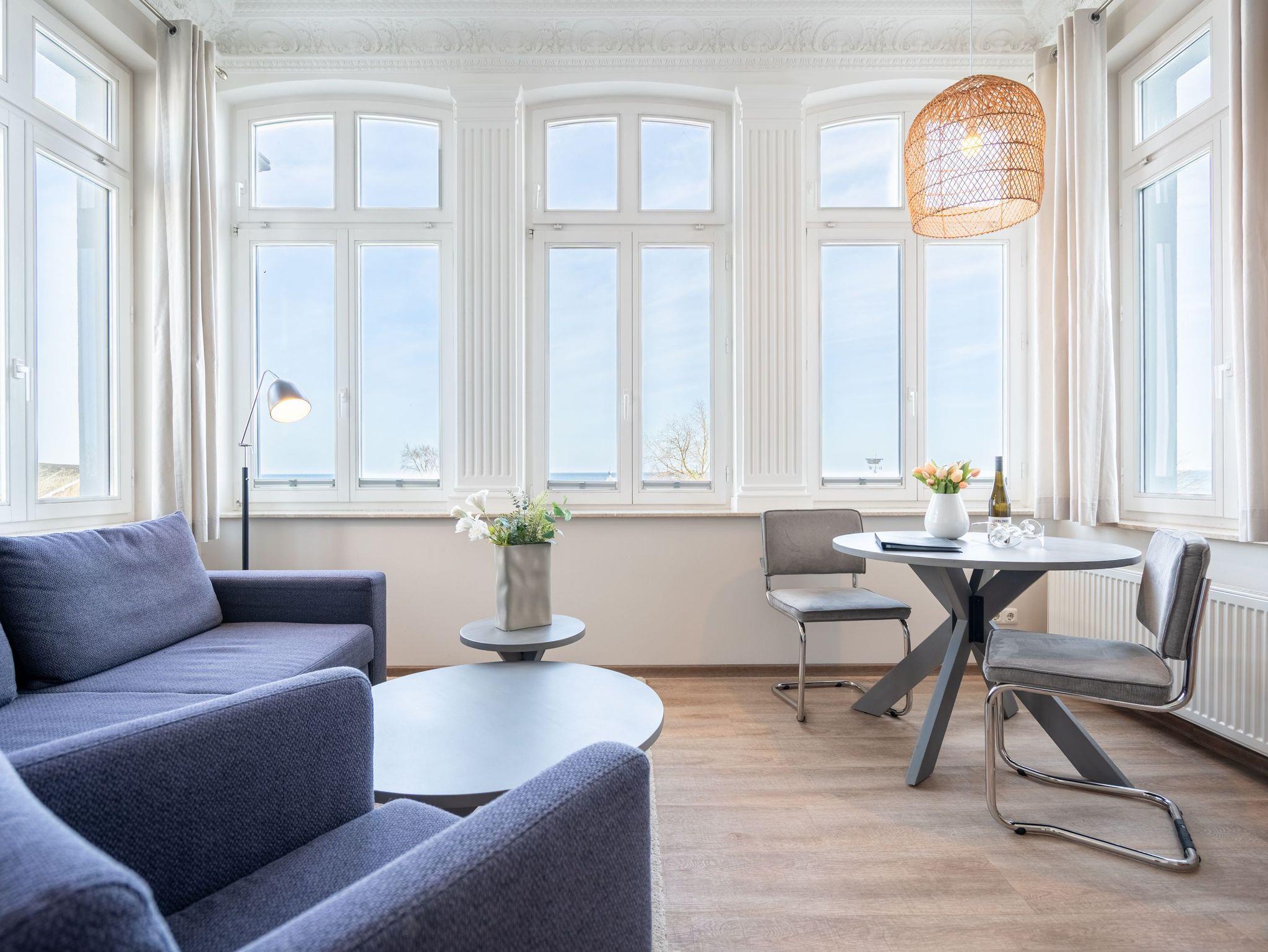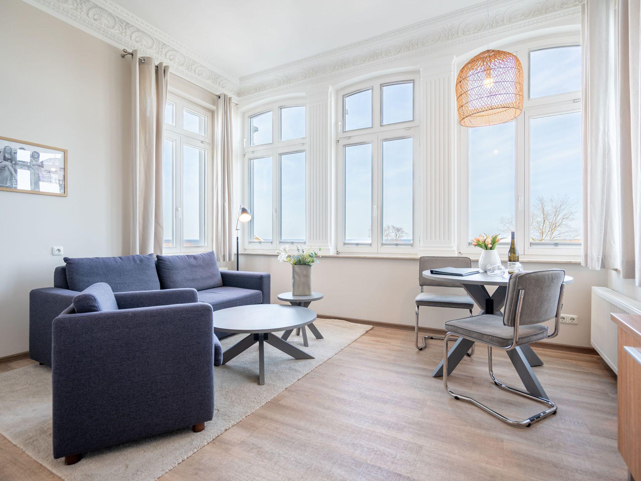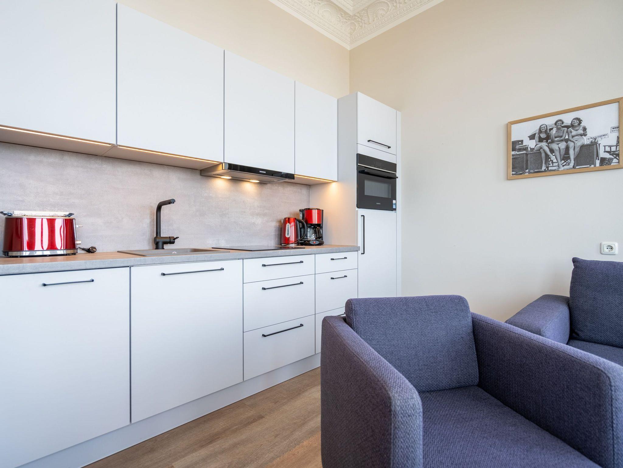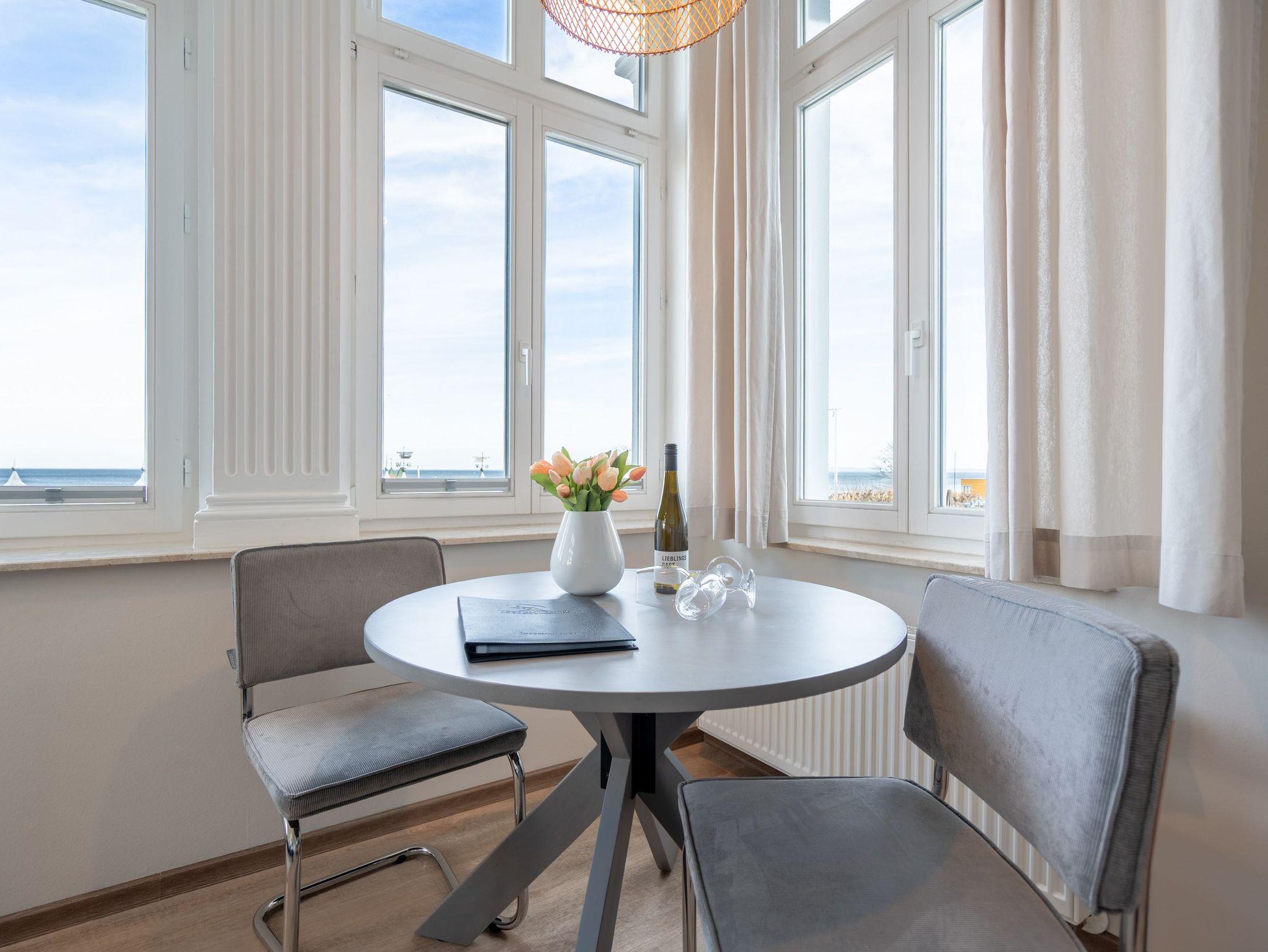 Die 2-Raum-Ferienwohnung Nr. C05 in der Villa Seedüwel bietet auf 41 qm Platz für zwei Personen und befindet sich im 1. Obergeschoss. Der offene Wohnbereich bietet einen Blick zur Promenade und Richtung Ostsee und ist mit einer Küchenzeile ausgestattet, die ein Induktionskochfeld, eine Mikrowelle und einen Kühlschrank mit Gefrierfach umfasst. Ein Essplatz für zwei Personen, eine gemütliche Sitzgruppe und ein Flat-TV sorgen für Komfort. Das Schlafzimmer verfügt über ein Doppelbett (1,80 m x 2,00 m) und einen Kleiderschrank. Auch von hier aus genießen Sie den Blick Richtung Promenade und Ostsee. Das Bad ist mit einer Dusche und einem Waschbecken ausgestattet, zudem gibt es ein separates WC. Ein Stellplatz in der Tiefgarage ( Einfahrthöhe 2,03m) des benachbarten Hauses „Strandterrasse“ ist für Sie reserviert. WLAN steht Ihnen kostenfrei zur Verfügung.