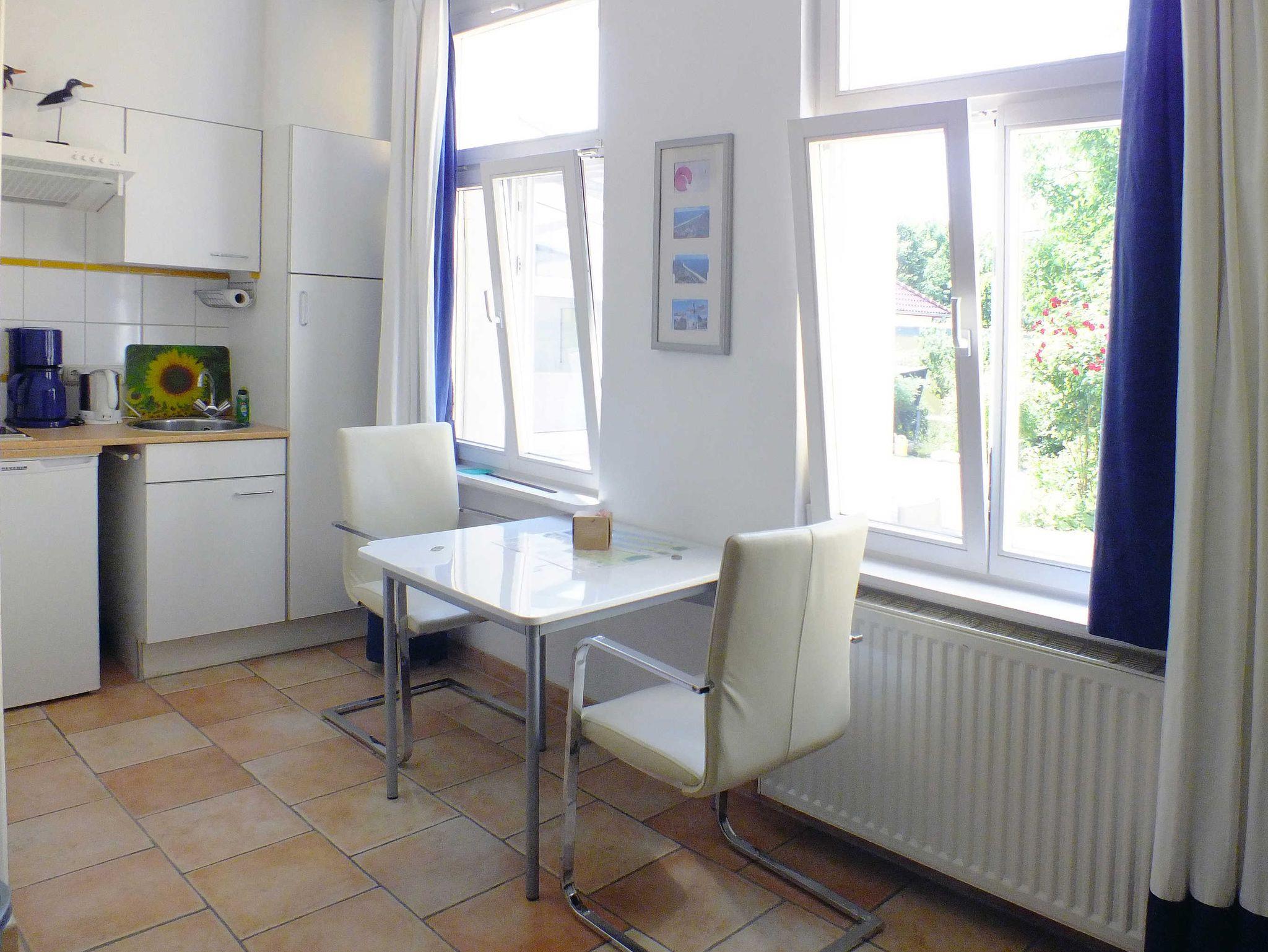 Dieses moderne, kleine 1-Raum-Appartement (vollständig gefliest) mit 22 qm befindet sich im Erdgeschoss und verfügt über einen kombinierten Wohn- und Schlafraum mit einem Kleiderschrank, TV, Esstisch mit Stühlen, Kommode, einem qualitativem Bali-Sofa-Bett mit einer Liegefläche von 1,80 x 2,00 m sowie einer Küchenzeile mit 2-Platten-Herd, Spüle, Kühlschrank, Kaffeemaschine, Toaster, Geschirr uvm. Das Bad ist mit DU/WC ausgestattet.