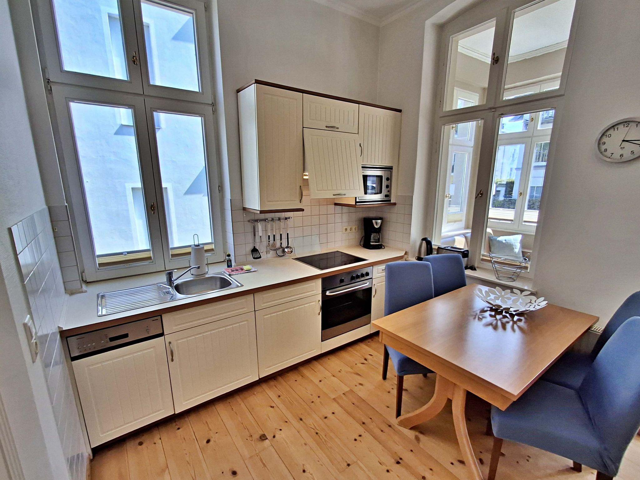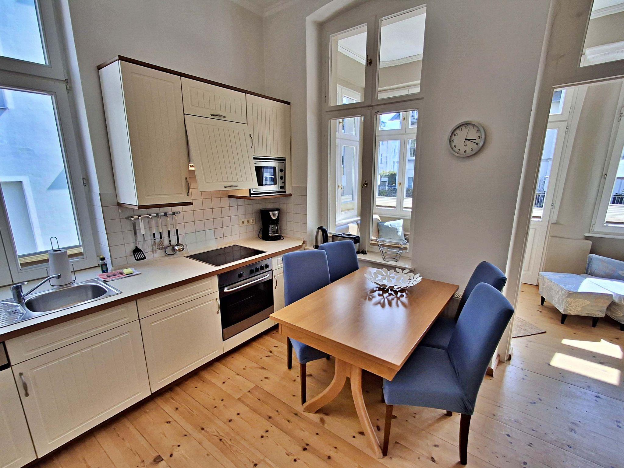 Die gemütliche 2,5 Zimmer-Wohnung Boltenhagen mit Terrasse für max. 3 Erwachsene und 1 Kleinkind bis 3 Jahre befindet sich in der stilvoll restaurierten Villa Ahlbeck - nur wenige Schritte von der Promenade und dem Strand entfernt. Die moderne Küchenzeile mit Ceranherd, Backofen, Geschirrspüler, Mikrowelle, Kaffeemaschine, Wasserkocher und Toaster lässt keine Wünsche offen. Bei schlechtem Wetter bietet der Esstisch mit 4 Stühlen genügend Platz für das Frühstück. Die absoluten Highlights der Wohnung sind die Veranda mit Couch (Aufbettungsmöglichkeit für 2 Personen) sowie die angrenzende Terrasse mit Süd-Ost-Ausrichtung. Auf der Terrasse können Sie bei herrlichstem Wetter schon morgens Ihren Kaffee genießen oder den Abend bei einem Glas Wein ausklingen lassen. Für die Unterhaltung sorgen ein Flachbild-TV, Radio-CD-Player und kostenfreies W-LAN. Das Schlafzimmer verfügt über ein Doppelbett und das Badezimmer hat DU/WC.