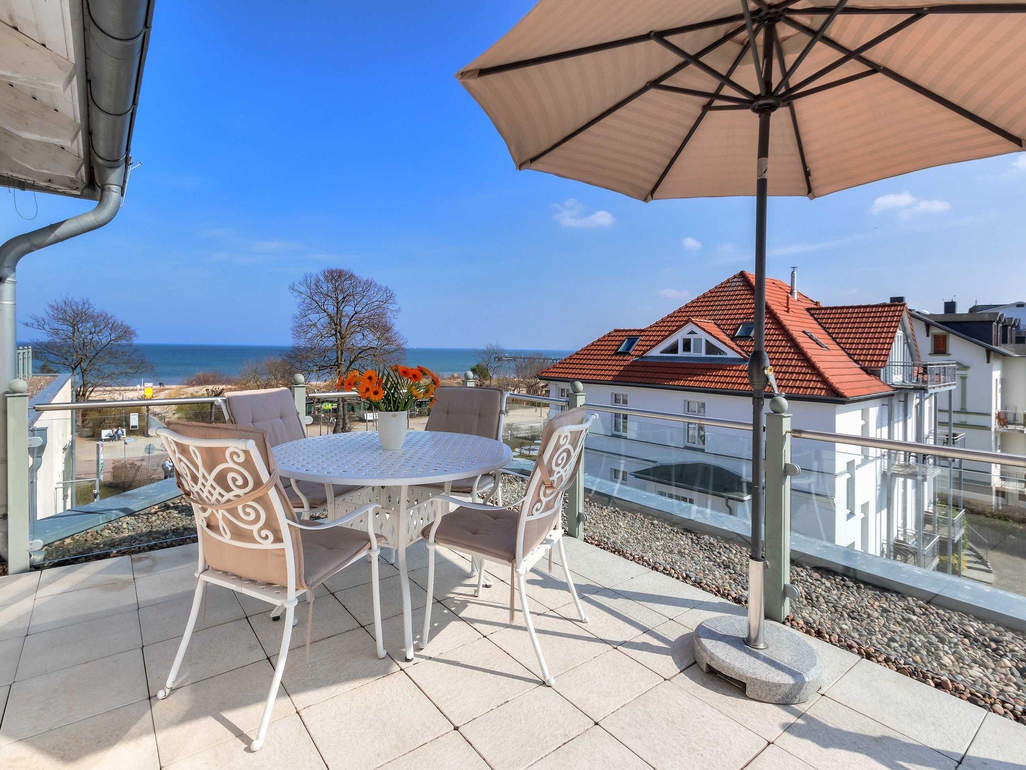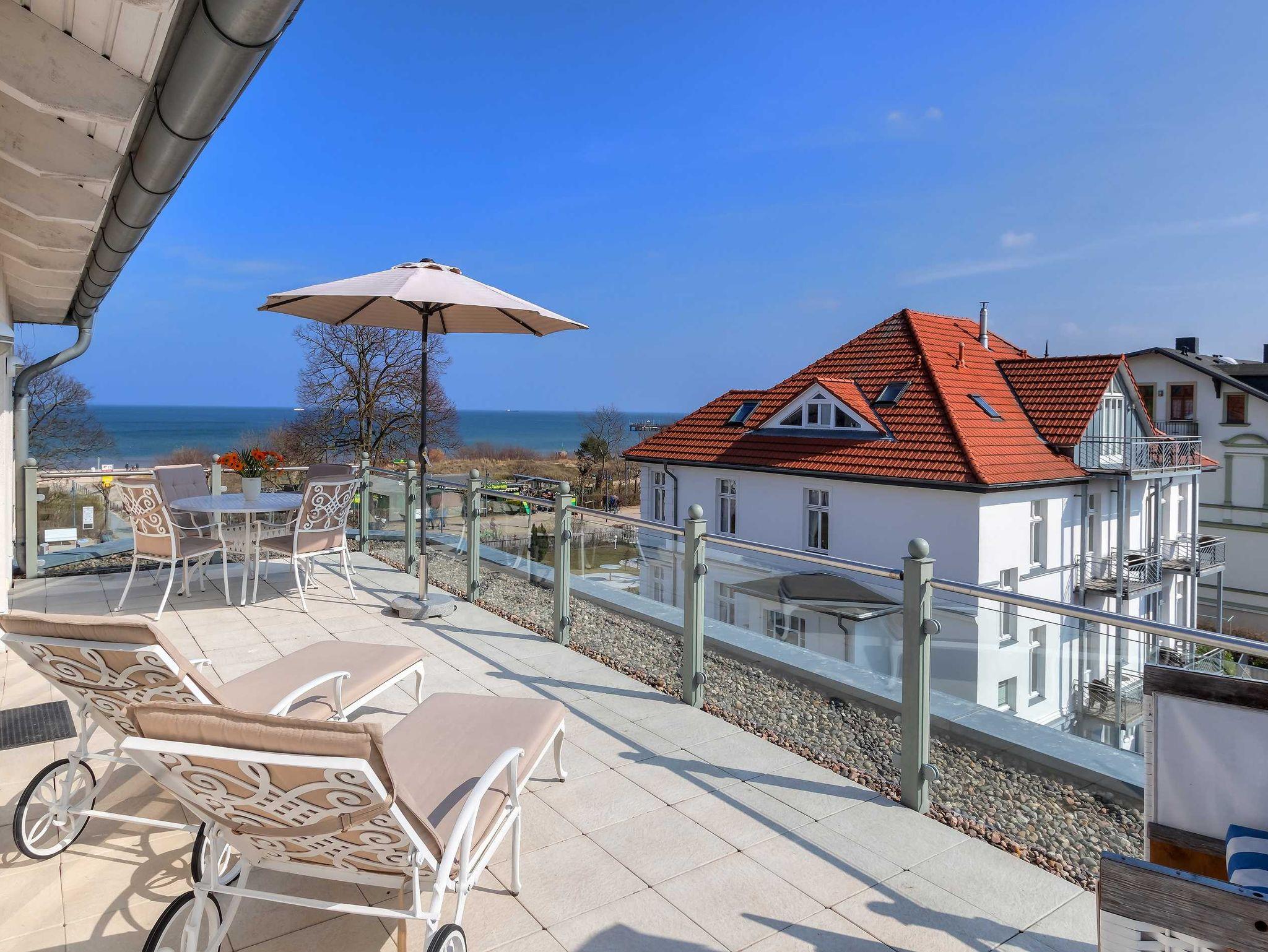 1. Reihe, PENTHOUSE direkt an der Strandpromenade mit SEEBLICK, DACHTERRASSE und FAHRSTUHL im Haus! Chices geräumiges 3-Zimmer-Apartment (ca. 55 m²) mit moderner hochwertiger Ausstattung. Zwei separate Schlafzimmer, Wohnzimmer mit Küchenbereich und Essplatz, Duschbad, 45 qm Dachterrasse über Eck nach Osten und Süden mit Sonne von morgens bis abends und herrlichem Seeblick. Die Wohnung verfügt über einen Tiefgaragen-Pkw-Stellplatz. In der Garage können auch Fahrräder und ähnliches untergestellt werden. In unserer Villa Germania nebenan gibt es eine Sauna. Von der Villa Aquamarina sind es zum Ortszentrum und der Seebrücke ca. 3 Minuten zu Fuß. Zum Strand sind es 50 m.