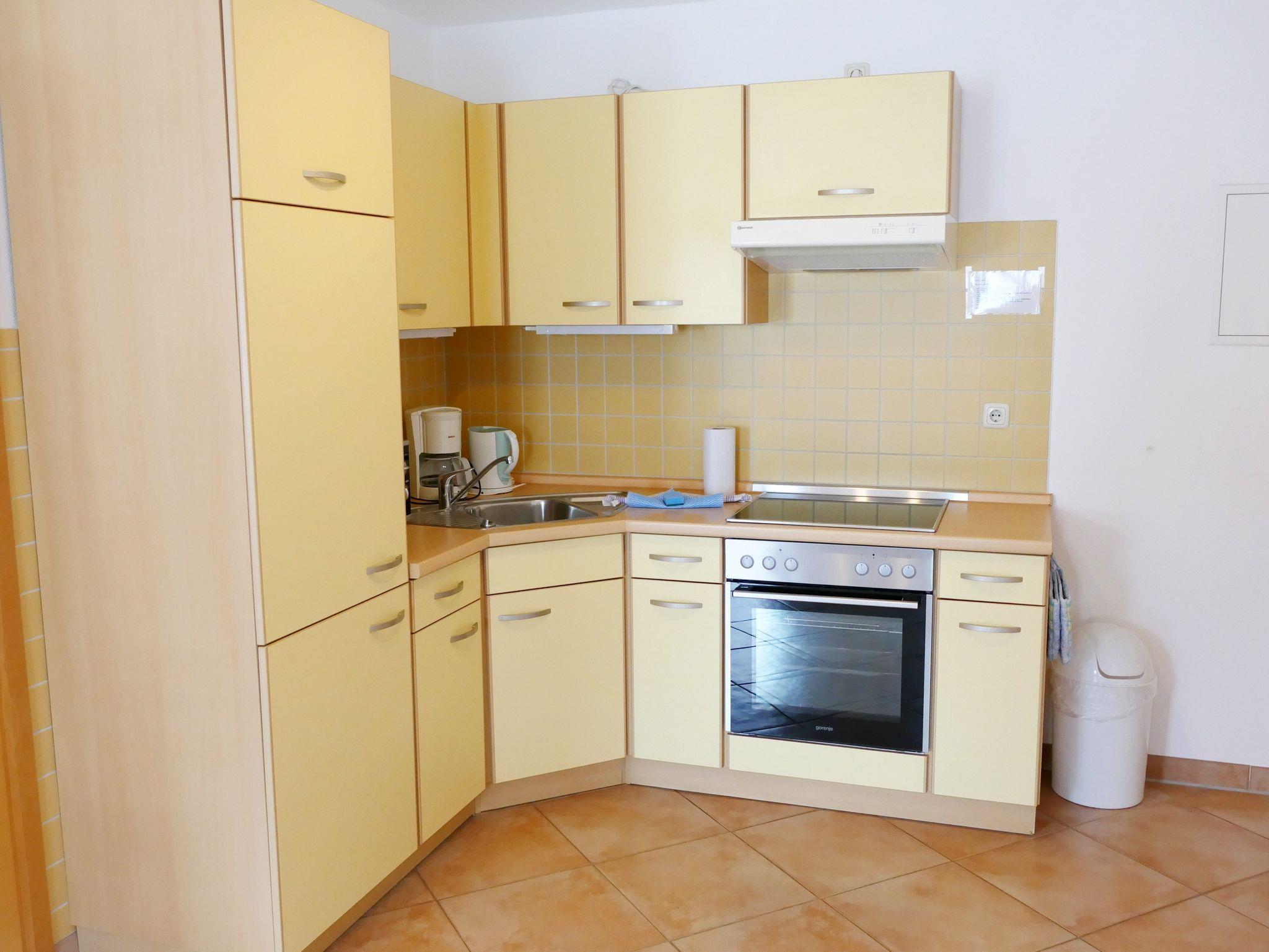 Die Küchenzeile verfügt über einen E-Herd, eine Kühl-/Gefrierkombination und ist mit Küchengeräten und Küchengeschirr vollständig ausgestattet.
