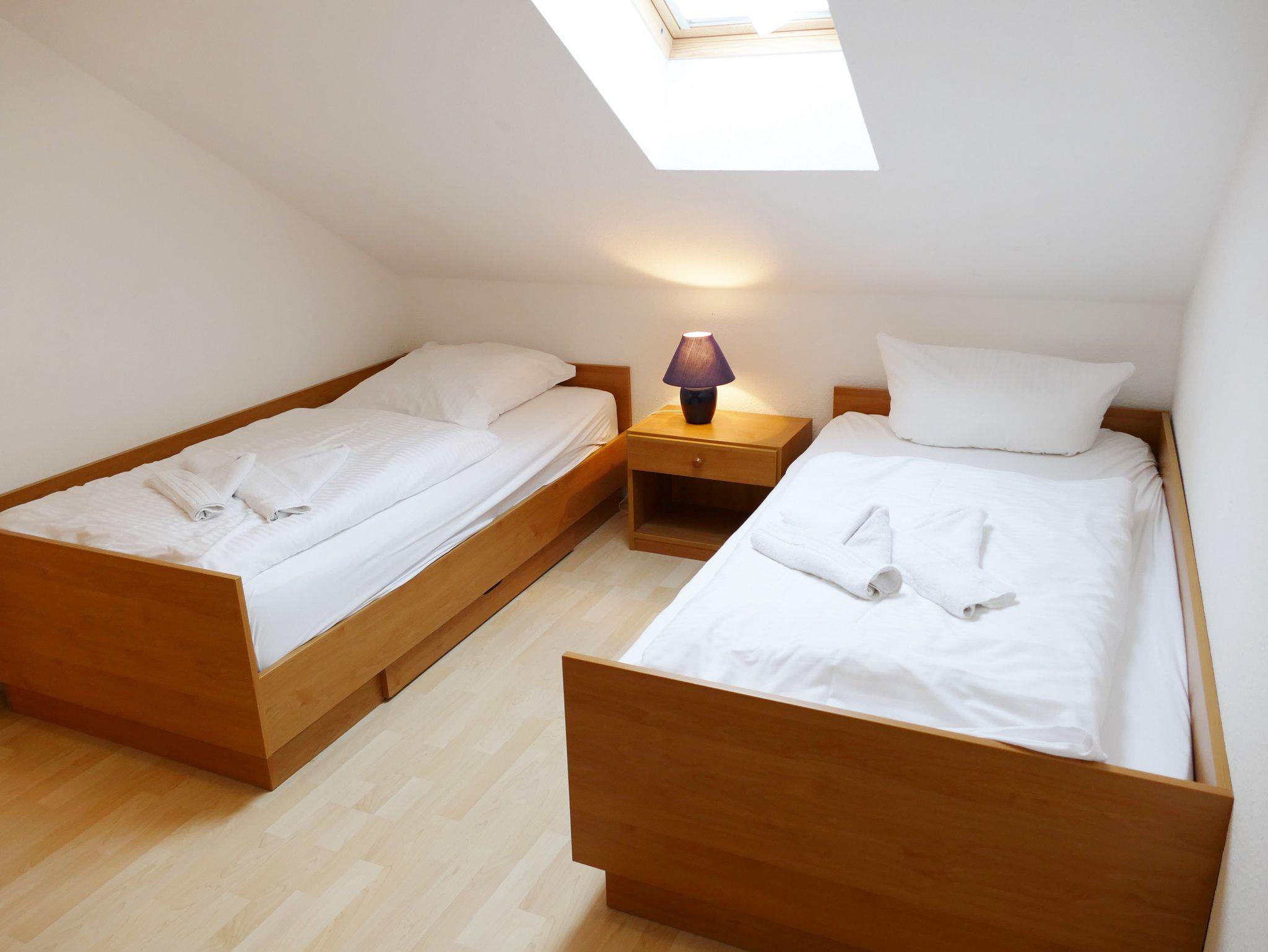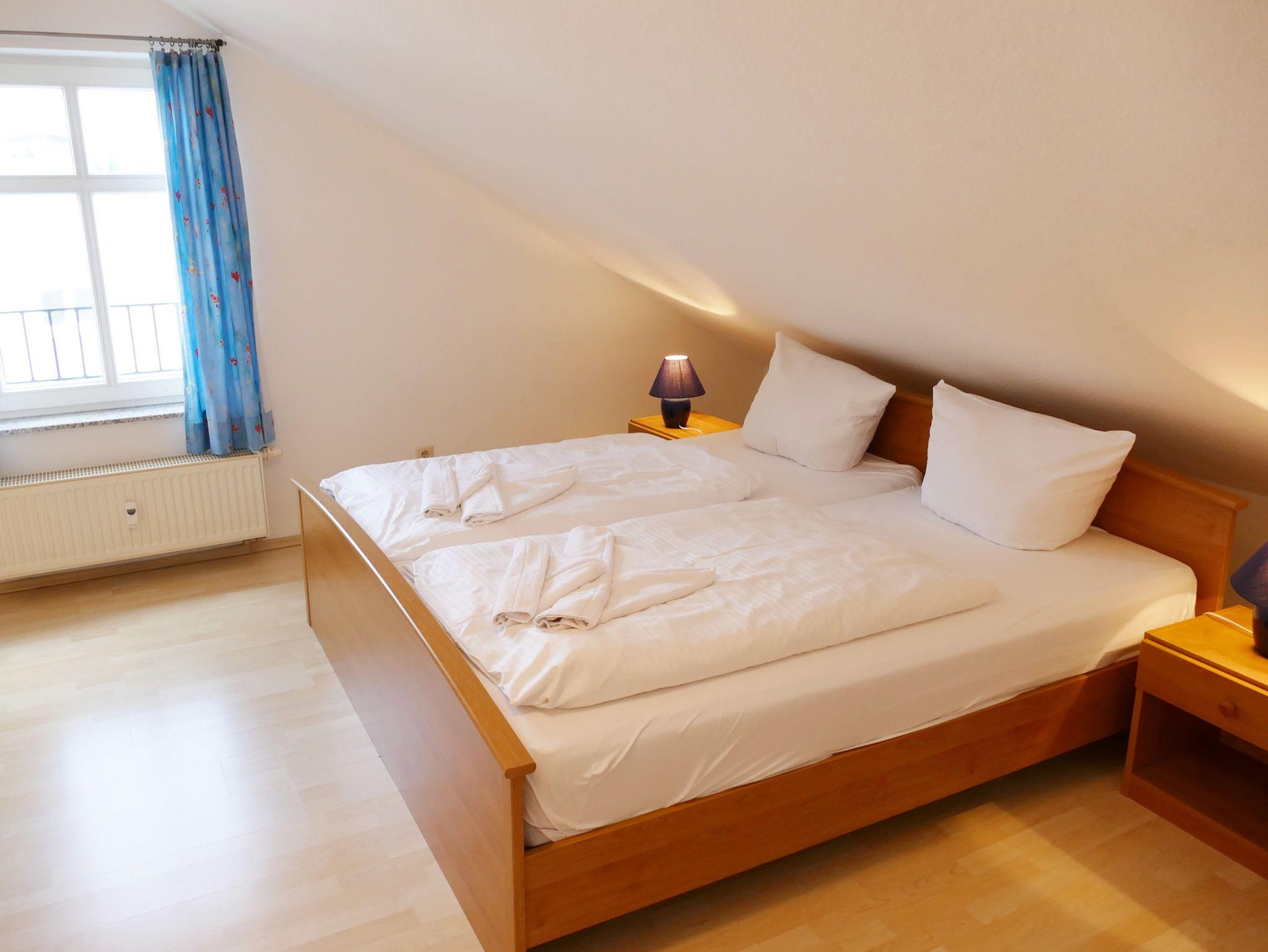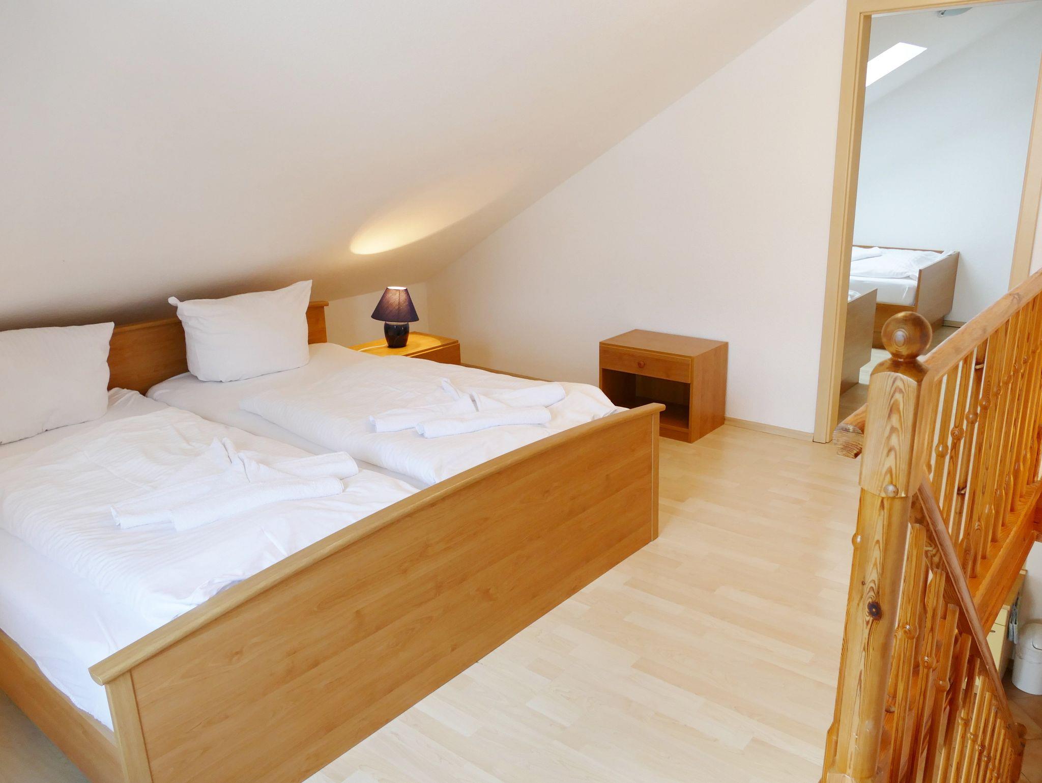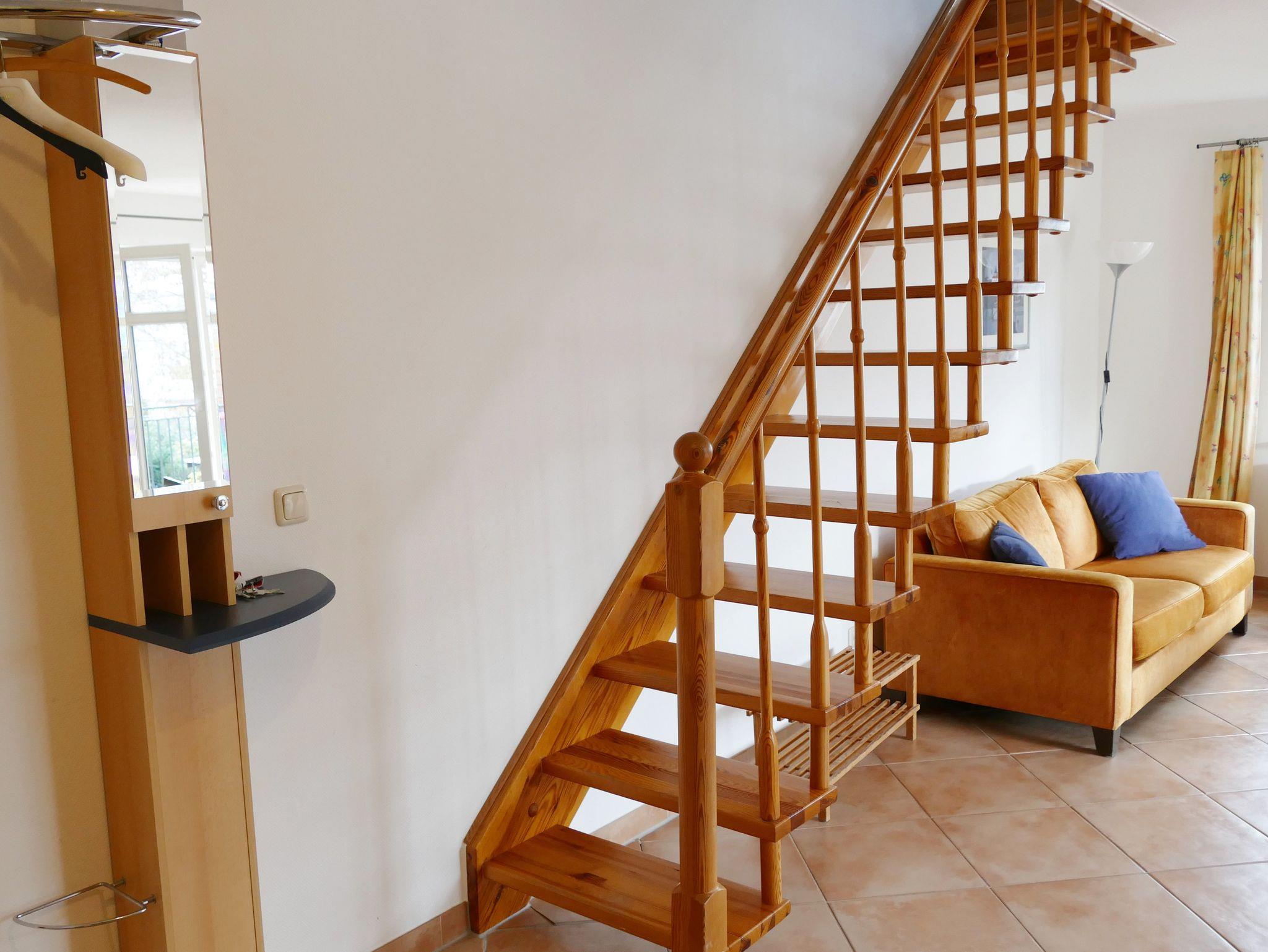 Die 53 qm große Maisonette-Ferienwohnung bietet Platz für max. 4 Personen. Die Wohnung verfügt über einen Wohnbereich und Küchenzeile, ein Badezimmer mit Dusche und WC und in der oberen Etage über ein Schlafzimmer mit einem Doppelbett und ein Schlafzimmer mit 2 Einzelbetten. Die Wohnung hat einen Balkon zur Gartenseite. Der Wohnbereich ist mit einer gemütlichen Sitzgruppe und einem Essplatz eingerichtet. Ebenso sind Kabel-TV und CD-Spieler mit Radio vorhanden.