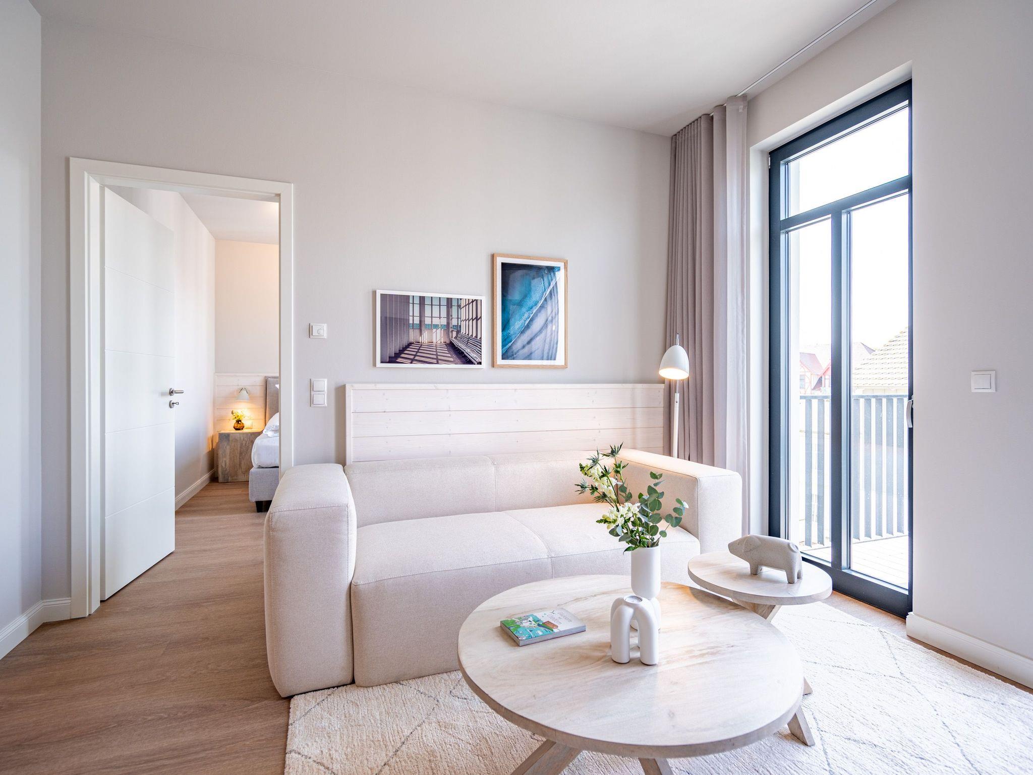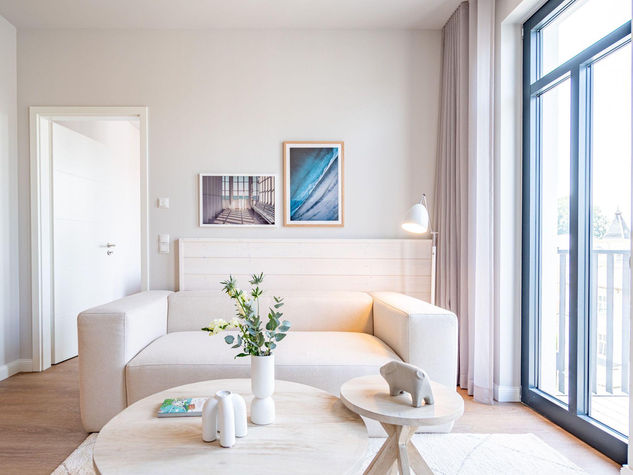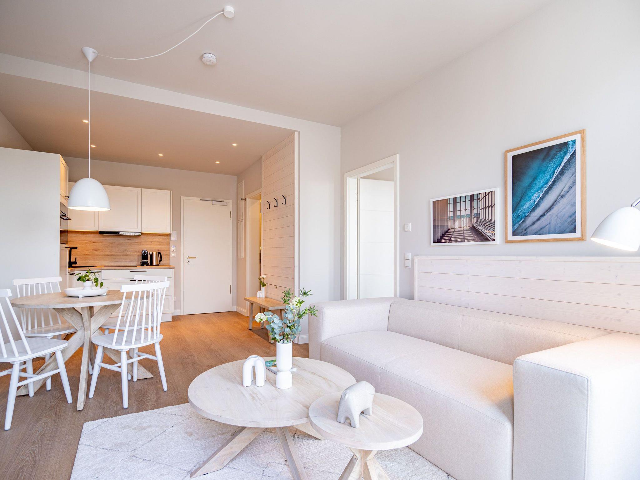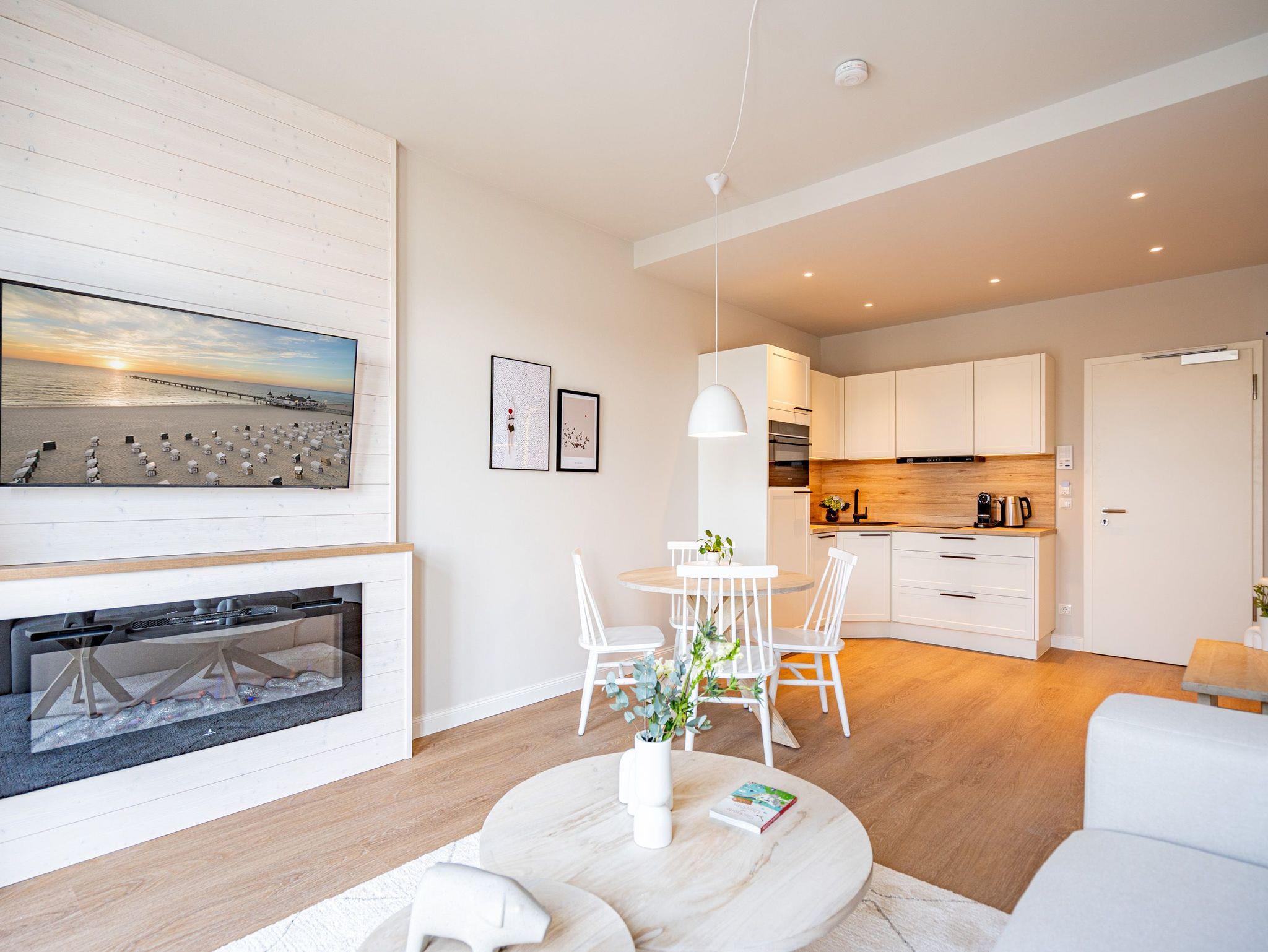 Wohnen wie auf Wolke sieben ? Das Strandterrasse-Appartement A 3.2 im Haus A im 3. Obergeschoss empfängt Sie mit viel Komfort und einer modernen und stylischen Einrichtung. Das 46 Quadratmeter große 2-Raum-Appartement ist Ihr ganz persönliches Wohlfühlreich mit Meerblick und vielen Annehmlichkeiten. Bis zu zwei Personen können es sich in diesem charmanten Domizil in dem geräumigen Wohn-Esszimmer und dem dazugehörigen Schlafzimmer so richtig gemütlich machen. Entspannen Sie auf der hyggeligen Couch vor dem Elektrokamin (ohne Wärmeabgabe). Ein 50-Zoll-Flachbildfernseher sorgt für Kinoatmosphäre. Die offene Küchenzeile ist mit allen nötigen Geräten hochwertig ausgestattet. Dazu gehören ein Induktionsherd, ein Backofen und zwei verschiedene Kaffeemaschinen. Kochen wird hier zu Ihrem Lieblingshobby. Ein schöner Essplatz lädt zu gemeinsamen Mahlzeiten ein. Doch das Highlight der Wohnung sind die beiden Nord-West-Balkone mit einem Tisch und zwei Stühlen und mit einer Sonnenliege, von denen aus Sie seitlich über die Seebrücke Ahlbeck und die dahinter liegende Ostsee schauen können. Genießen Sie die Aussicht und tanken Sie beim Blick über das grenzenlose Blau neue Energie. Weil frische Seeluft müde macht, verspricht das komfortable Boxspringdoppelbett (1,80m x 2,00m) herrliche Träume und einen erholsamen Schlaf. Das Schlafzimmer verfügt zudem über einen geräumigen Kleiderschrank, eine Kommode und einen weiteren 43-Zoll-Flachbildfernseher. Von hier aus haben Sie Zugang auf den zweiten Balkon. So können Sie direkt nach dem Aufwachen die Meeresluft tief einatmen, während Ihre Augen sich an der blauen Weite gar nicht satt sehen können. Zum Appartement gehört ein innenliegendes Bad mit einer Dusche, einem Waschtisch und einer Toilette. In der Tiefgarage ist für Ihr Auto ein PKW-Stellplatz reserviert. Verliebt? Dann kann es ja losgehen mit der Auszeit an der Ahlbecker Promenade. Erleben Sie unvergessliche Tage am Meer.