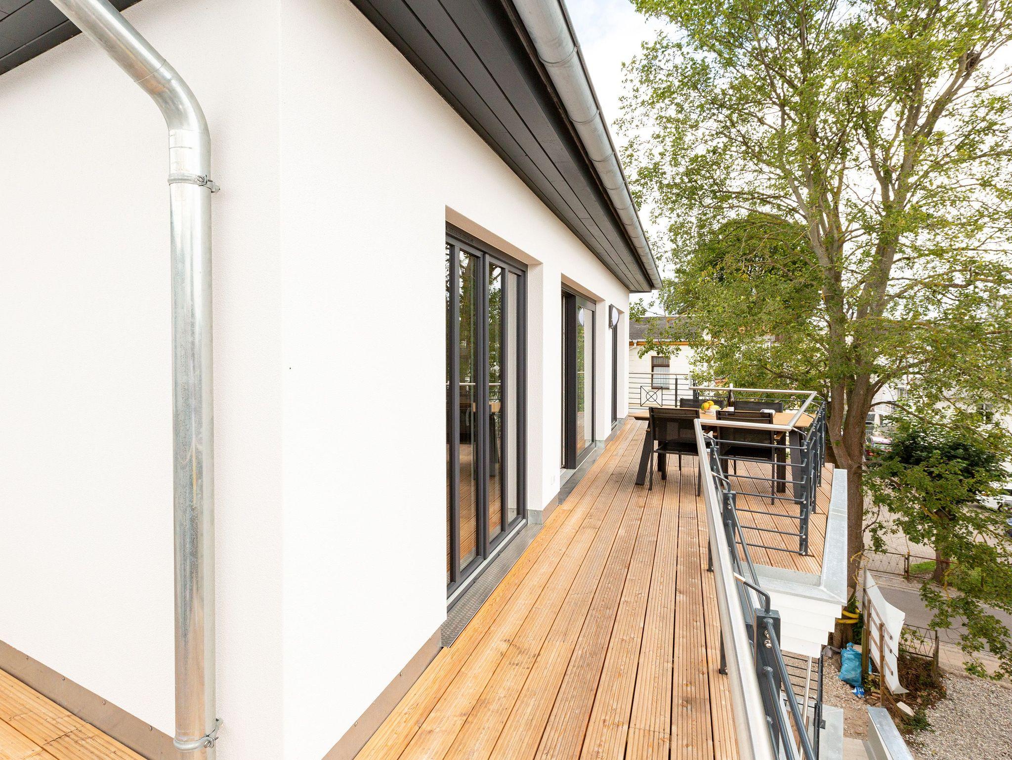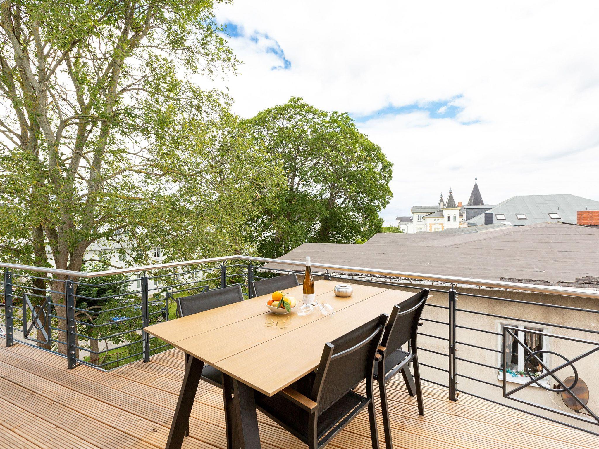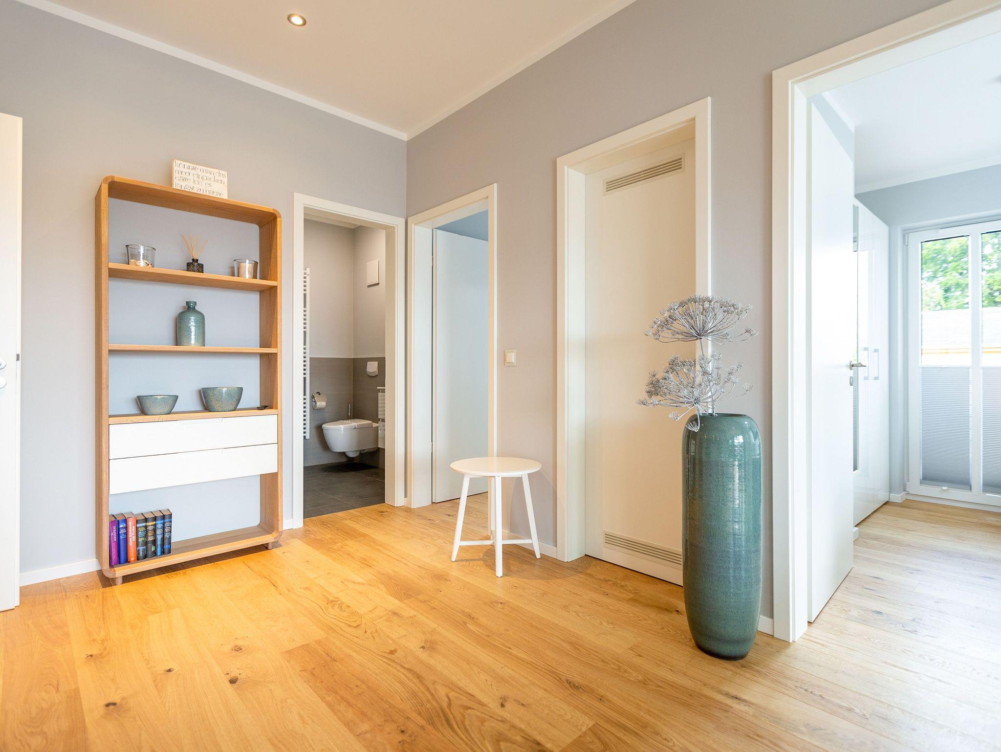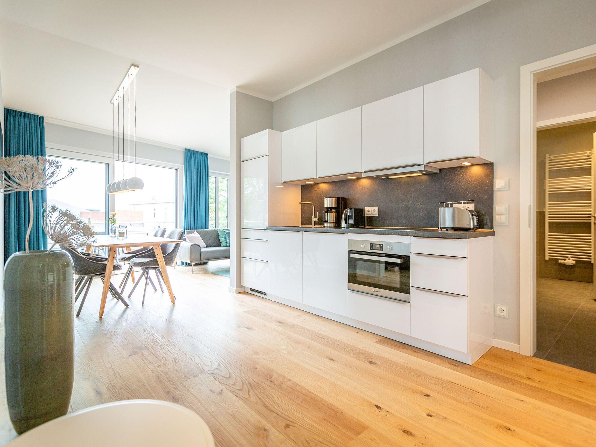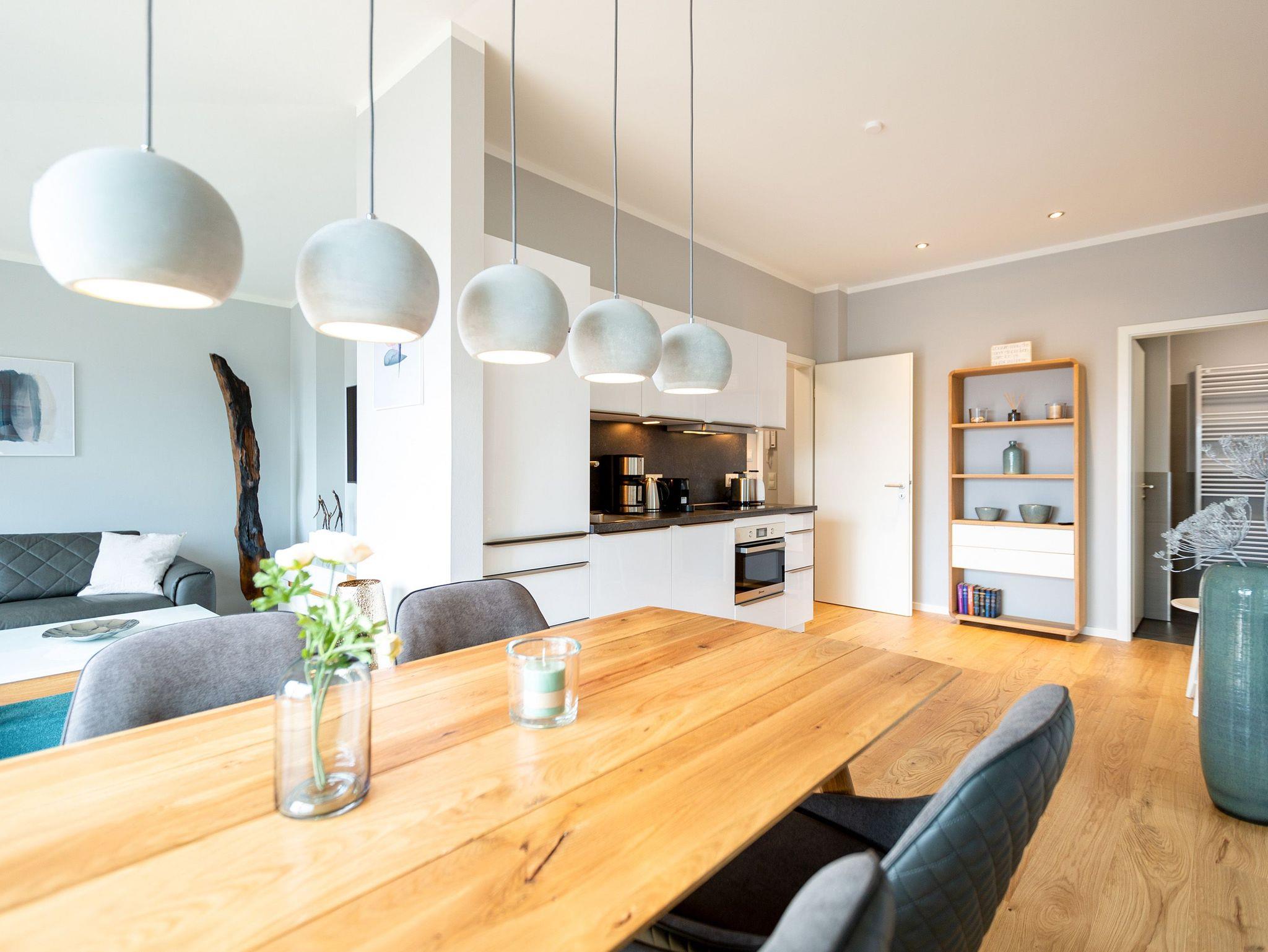 Im Dachgeschoss, erreichbar via Fahrstuhl, befindet sich ein 70 Quadratmeter großer Urlaubstraum, der Sie vom ersten Moment an in die lang ersehnte Ostseeauszeitstimmung versetzt. Hier können Sie mit bis zu vier Personen eine wundervolle Auszeit erleben. Helle, großzügige Räume verleihen dem Appartement eine freundliche Atmosphäre. Der absolute Clou: Die 15 Quadratmeter große, Dachterrasse mit schönen Gartenmöbeln. Hier oben können Sie die Ostsee rauschen hören. Das Appartement ist mit modernen, eleganten Design-Möbeln ausgestattet. Ein großer Holztisch mit gemütlichen Sesseln ist für stilvolle Mahlzeiten genauso geeignet wie für Spieleabende oder gemütliche Gesprächsrunden. Das große Wohn-Esszimmer geht nahtlos in die schicke Küche über, die voll ausgestattet keine Wünsche offenlässt. Auch Geschirr finden Sie in der Küchenzeile. Die Liebe zum Detail wird in dieser Ferienwohnung in jeder Ecke spürbar. So wirkt das Appartement trotz des stylischen Designs warm und heimelig. Schwemmholzstrandfunde und Kunstgegenstände gehen hier Hand in Hand. Zwei moderne, aber mehr als kuschelige Leder-Sofas bieten Entspannungsfläche. Ein großer Flat-TV sorgt für Unterhaltung. Die Wohnung hat zwei Schlafzimmer, die mit je einem bequemen Boxspring-Doppelbett (1,80 m x 2,00 m), geräumigen Schränken und einem Flat-TV ausgestattet sind. Bodentiefe Fenster machen die Zimmer sonnig hell. Zu jedem Schlafzimmer gehört ein Badezimmer mit Dusche und WC. Die Betten sind bezogen. Handtücher liegen für Sie bei Anreise bereit. Eines der beiden Bäder verfügt über eine finnische Sauna. Dem kuscheligen Herbst- oder Winterabend steht also nichts mehr im Weg. Das Appartement 14 besitzt eine eigene Waschmaschine. In der Tiefgarage ist für Ihr Auto ein Stellplatz reserviert. Zudem gehört zu der Ferienwohnung ein eigener Kellerraum, in dem Sie Fahrräder abstellen können.