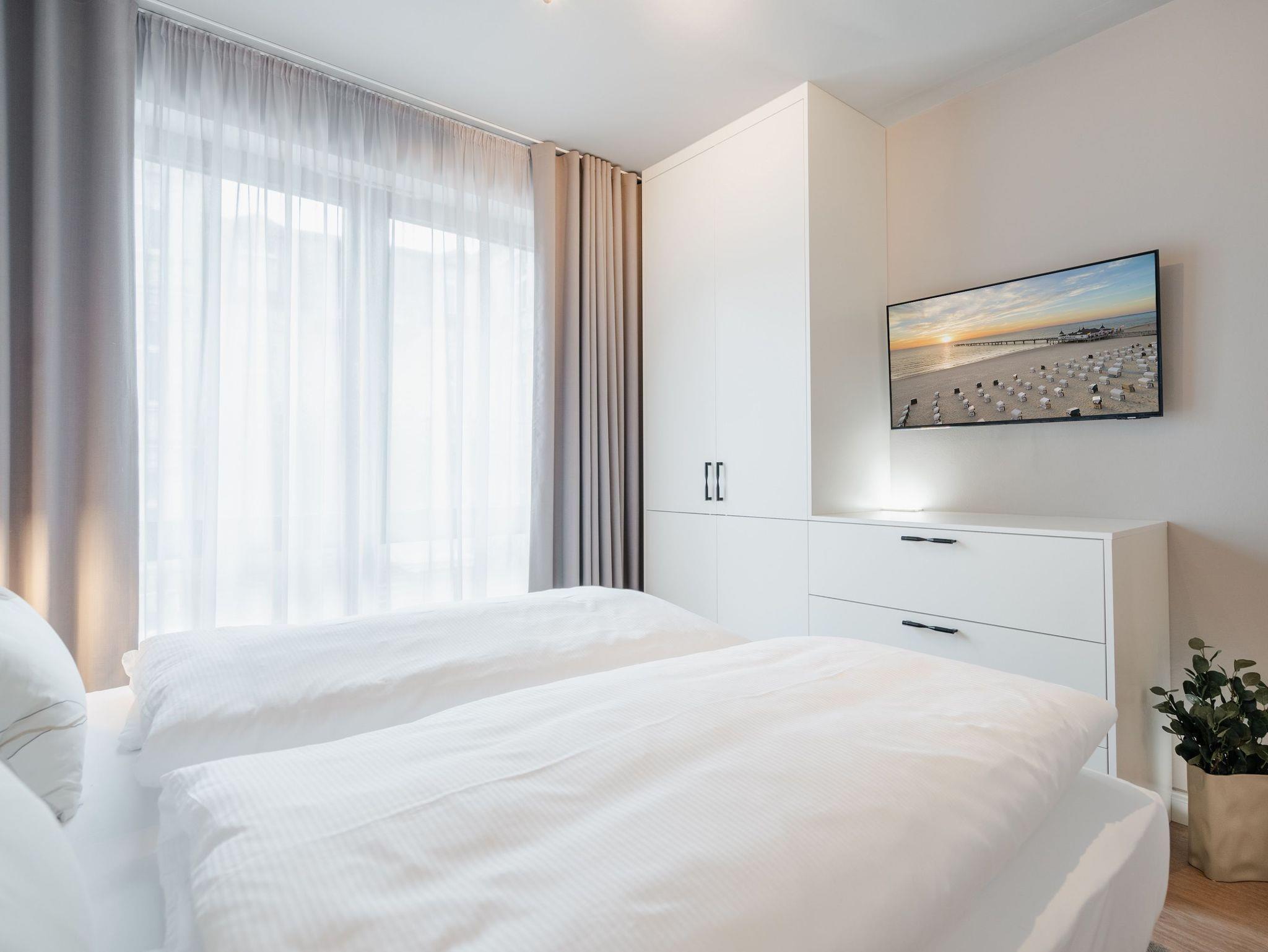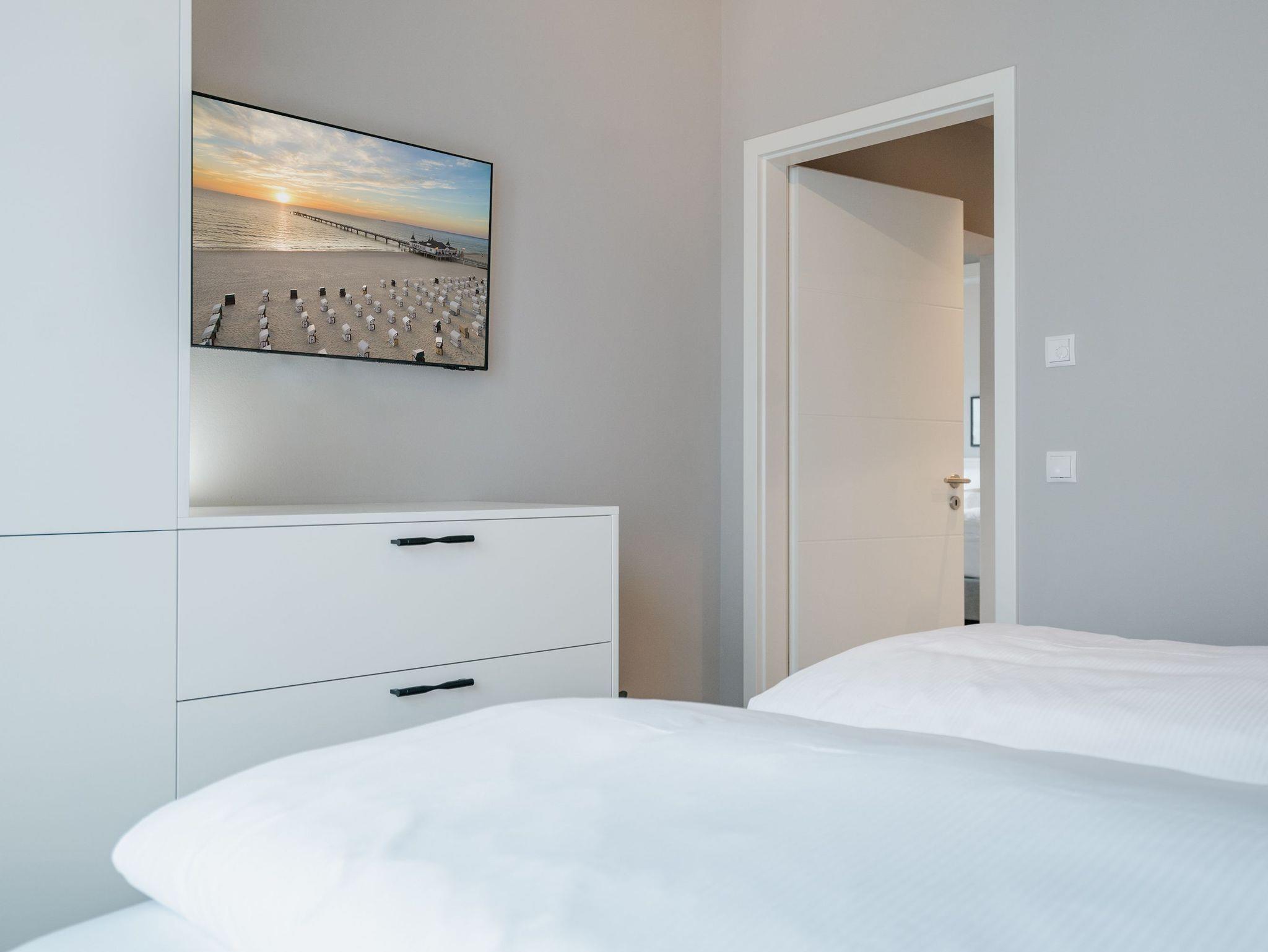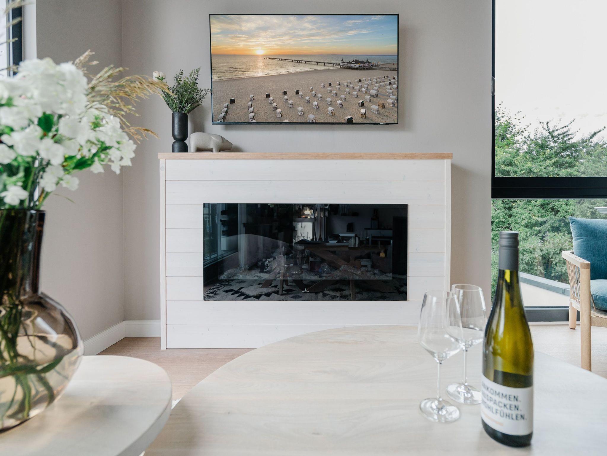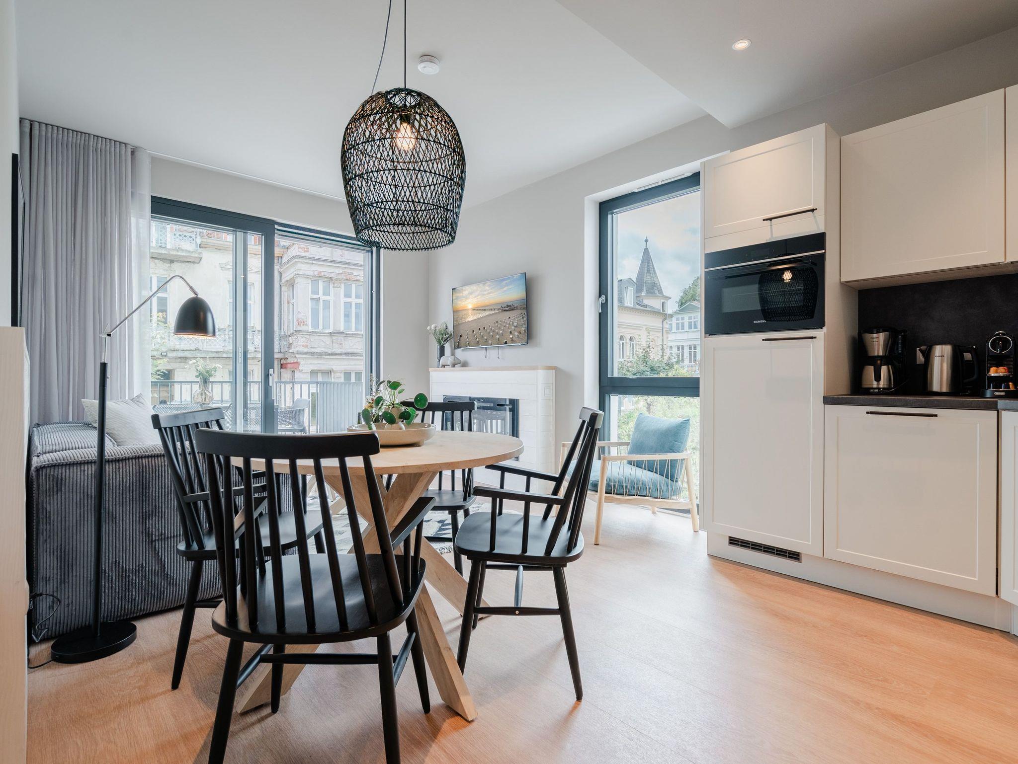Zum Abschalten, Runterkommen und Entspannen ist das 3-Raum-Appartement B 1.7 im Haus B der Strandterrasse bestens geeignet. Denn die 58 Quadratmeter in der 1. Etage sind ein kuscheliges Traumdomizil, um mit der Familie oder mit Freunden eine erholsame Auszeit direkt an der Ostsee zu genießen. Bis zu 4 Personen bietet dieses moderne und komfortable Wohlfühlreich Platz. Der offene Wohn- und Essbereich ist mit einer hochwertigen Küchenzeile ausgestattet, in der Sie alle Utensilien vorfinden, die Sie für ein rundum gelungenes Essvergnügen benötigen. Der Backofen und der 4-Platten-Induktionsherd machen aus Hobbyköchen wahre Gourmets. Weitere Markengeräte wie ein Geschirrspüler, ein Toaster, ein Wasserkocher oder eine Nespresso-Kapselmaschine erleichtern die Küchenarbeit ungemein. Der gemütliche Essplatz lädt zum Genießen und zu gemeinsamen Mußestunden ein, während eine stylische Sitzgruppe für Entspannung und ein großer Flat-TV (50 Zoll) für Unterhaltung sorgen. Ein Elektrokamin (ohne Wärmeabgabe) zaubert eine gemütliche Atmosphäre. Vom Wohnzimmer aus haben Sie Zutritt zum West-Balkon. Der Blick auf die alten Bädervillen hat Charme. Nehmen Sie auf einem der beiden Stühle Platz. Können Sie das Rauschen der nur knapp 80 Meter entfernten Ostsee hören? Die Wohnung verfügt über zwei Schlafzimmer. Beide sind mit einem bequemen Boxspringdoppelbett (1,80m x 2,00m), einem Kleiderschrank, einer Kommode und einem Flat-TV (43 Zoll) ausgestattet. Zu jedem Zimmer gehört jeweils ein Duschbad mit Waschtisch und WC. So hat jeder seine Privatsphäre. In der Tiefgarage steht Ihnen ein PKW-Stellplatz zur Verfügung. Kommen Sie in aller Ruhe an. In dieser stilvollen Ferienwohnung erwartet Sie während Ihres Aufenthaltes viel Flair und viel Meer.