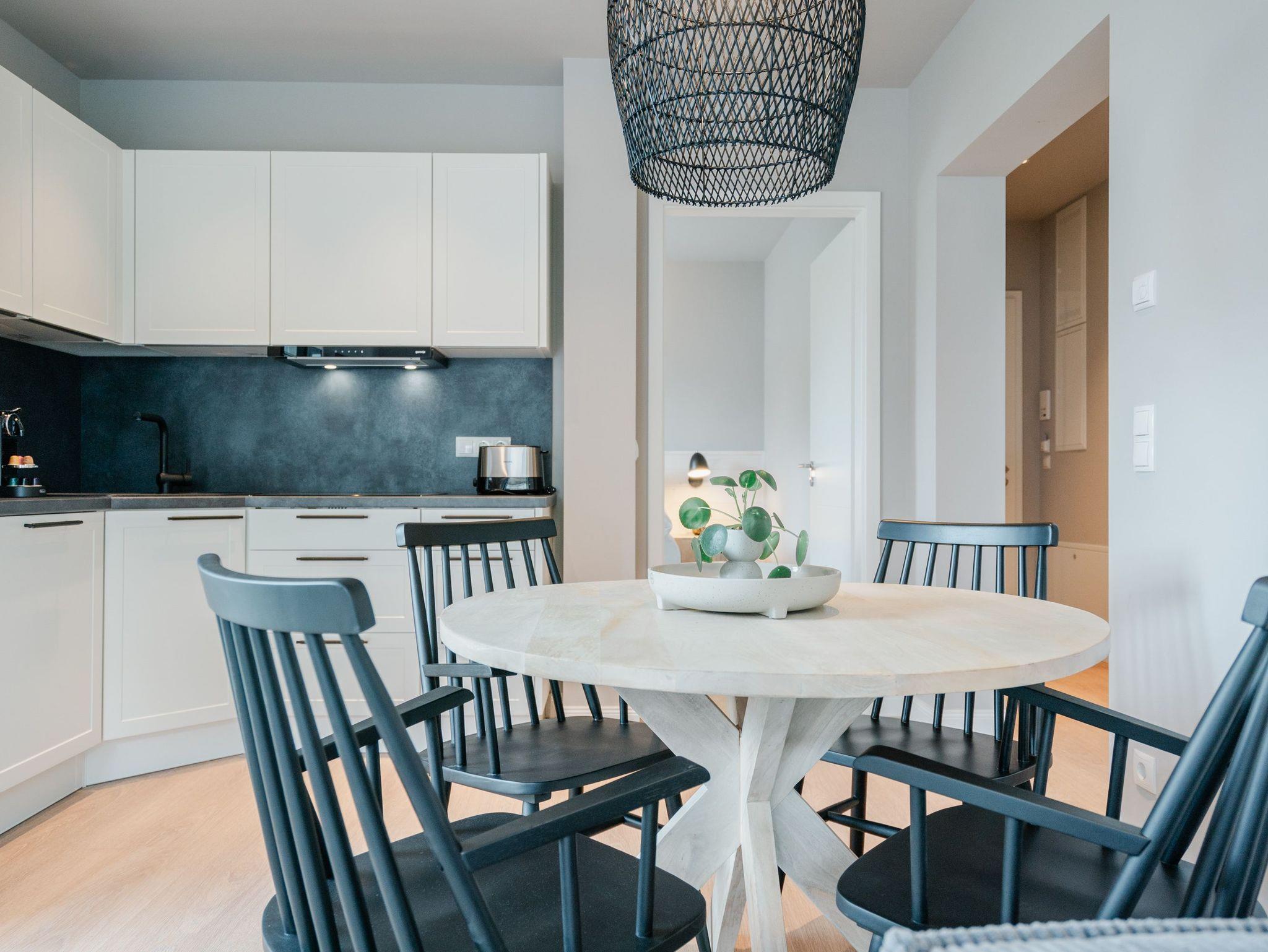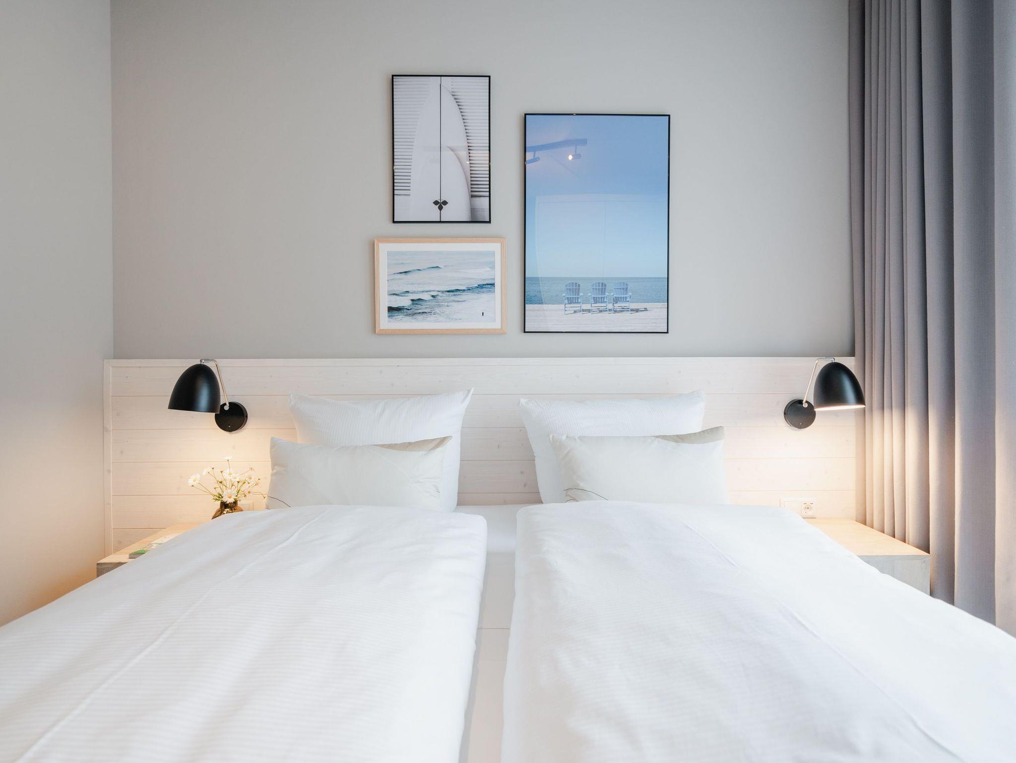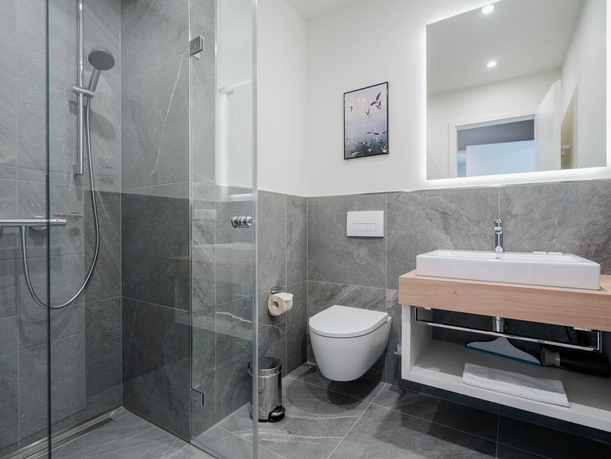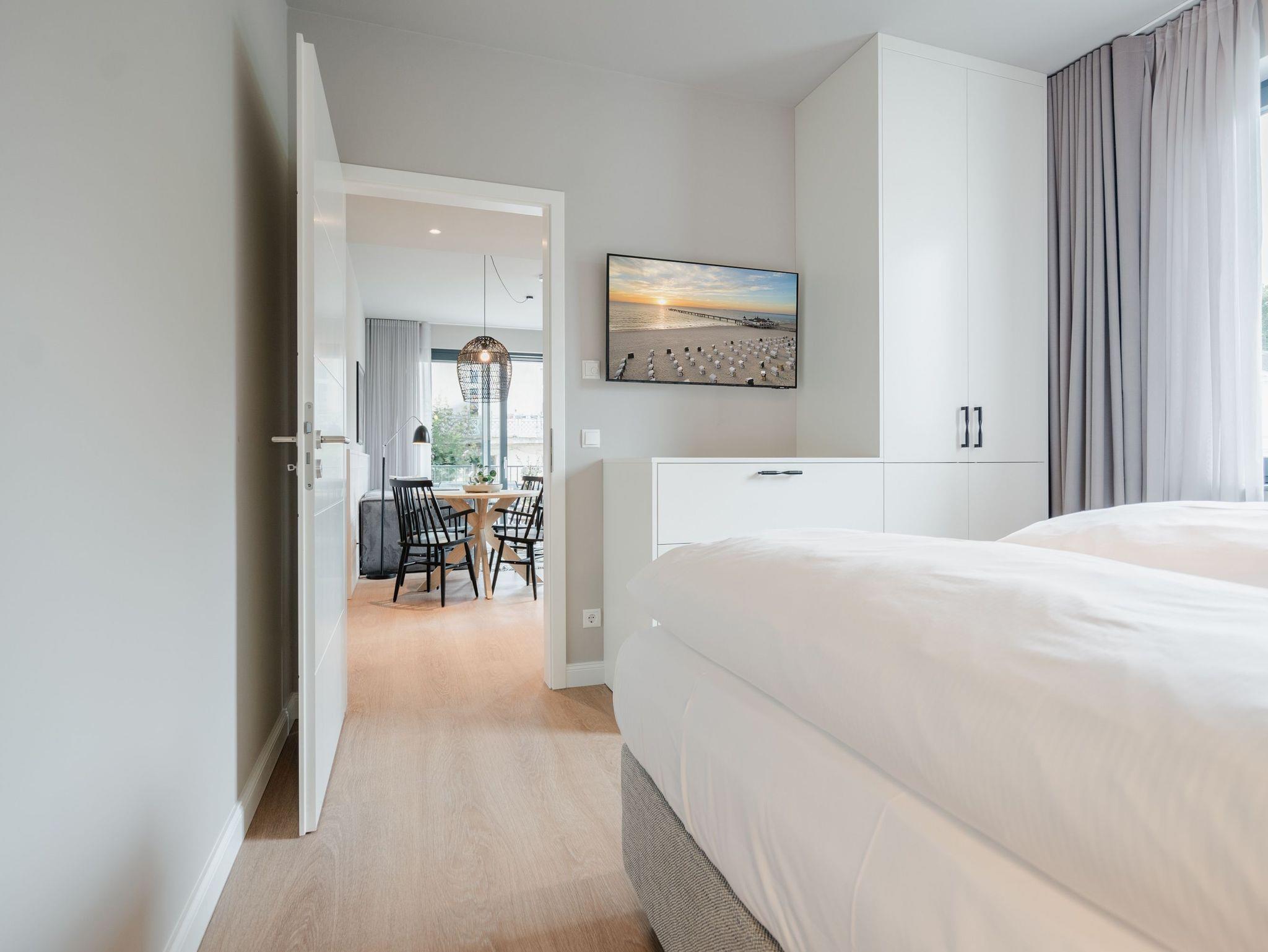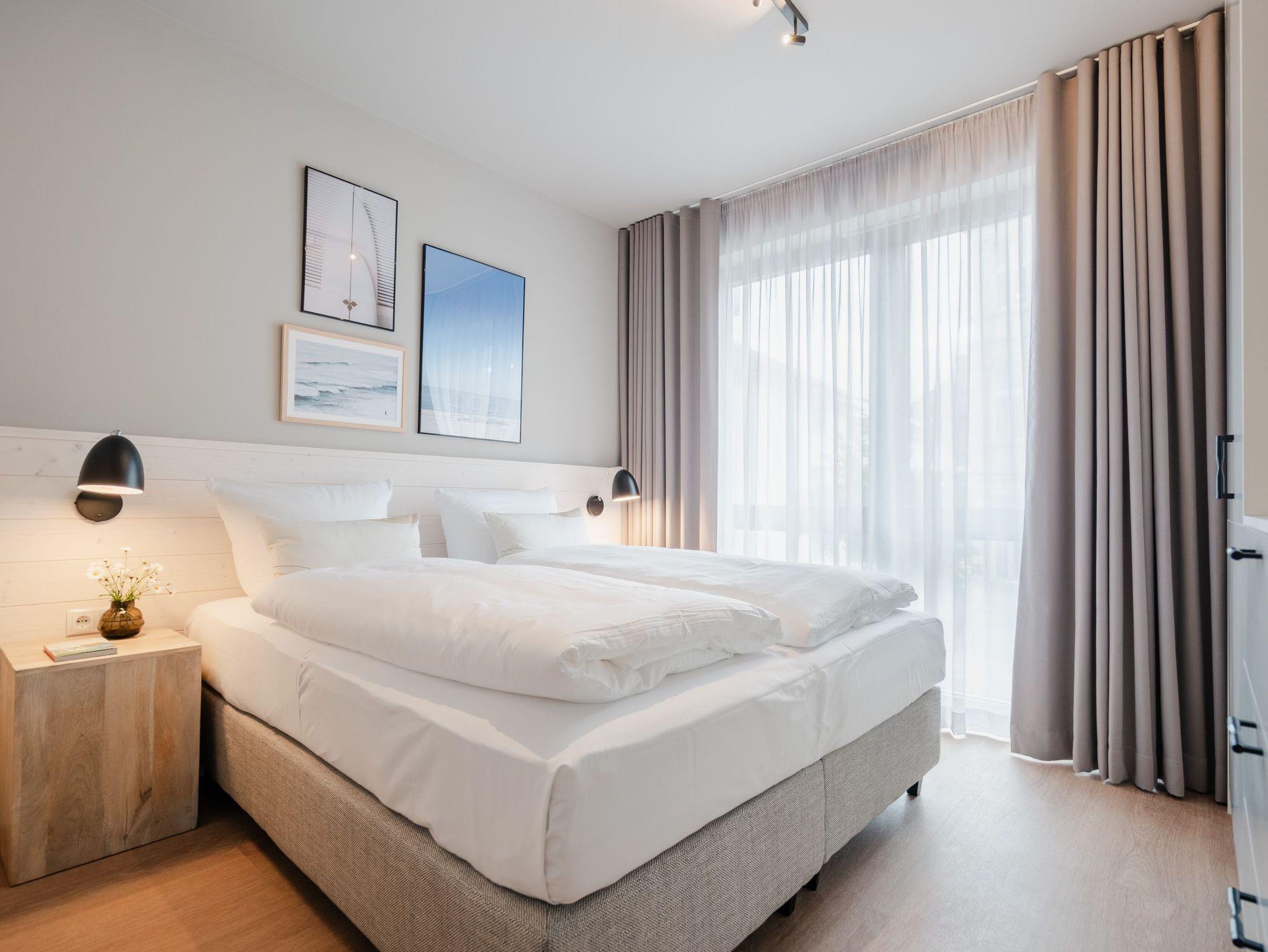 Zum Abschalten, Runterkommen und Entspannen ist das 3-Raum-Appartement B 1.7 im Haus B der Strandterrasse bestens geeignet. Denn die 58 Quadratmeter in der 1. Etage sind ein kuscheliges Traumdomizil, um mit der Familie oder mit Freunden eine erholsame Auszeit direkt an der Ostsee zu genießen. Bis zu 4 Personen bietet dieses moderne und komfortable Wohlfühlreich Platz. Der offene Wohn- und Essbereich ist mit einer hochwertigen Küchenzeile ausgestattet, in der Sie alle Utensilien vorfinden, die Sie für ein rundum gelungenes Essvergnügen benötigen. Der Backofen und der 4-Platten-Induktionsherd machen aus Hobbyköchen wahre Gourmets. Weitere Markengeräte wie ein Geschirrspüler, ein Toaster, ein Wasserkocher oder eine Nespresso-Kapselmaschine erleichtern die Küchenarbeit ungemein. Der gemütliche Essplatz lädt zum Genießen und zu gemeinsamen Mußestunden ein, während eine stylische Sitzgruppe für Entspannung und ein großer Flat-TV (50 Zoll) für Unterhaltung sorgen. Ein Elektrokamin (ohne Wärmeabgabe) zaubert eine gemütliche Atmosphäre. Vom Wohnzimmer aus haben Sie Zutritt zum West-Balkon. Der Blick auf die alten Bädervillen hat Charme. Nehmen Sie auf einem der beiden Stühle Platz. Können Sie das Rauschen der nur knapp 80 Meter entfernten Ostsee hören? Die Wohnung verfügt über zwei Schlafzimmer. Beide sind mit einem bequemen Boxspringdoppelbett (1,80m x 2,00m), einem Kleiderschrank, einer Kommode und einem Flat-TV (43 Zoll) ausgestattet. Zu jedem Zimmer gehört jeweils ein Duschbad mit Waschtisch und WC. So hat jeder seine Privatsphäre. In der Tiefgarage steht Ihnen ein PKW-Stellplatz zur Verfügung. Kommen Sie in aller Ruhe an. In dieser stilvollen Ferienwohnung erwartet Sie während Ihres Aufenthaltes viel Flair und viel Meer.