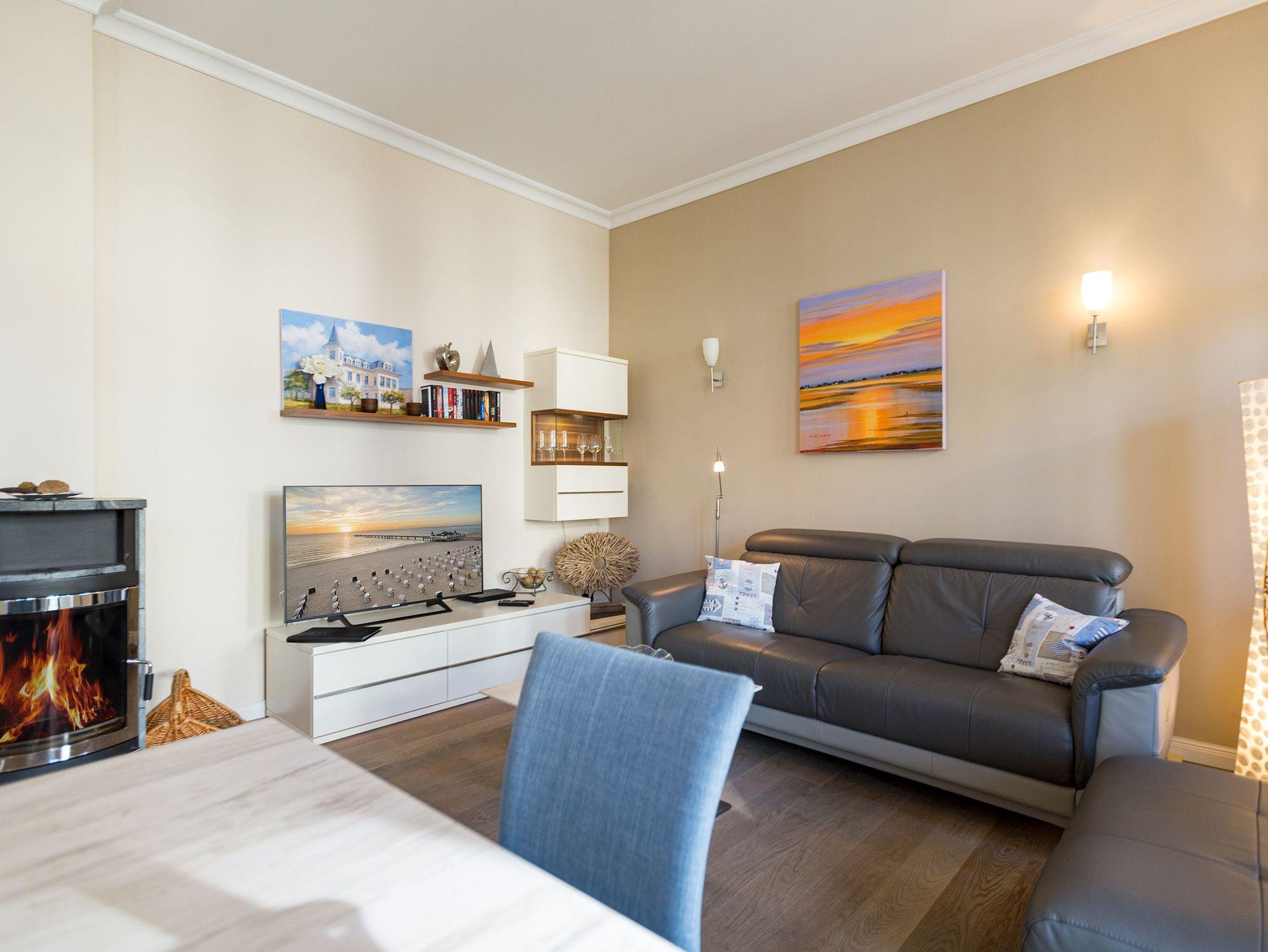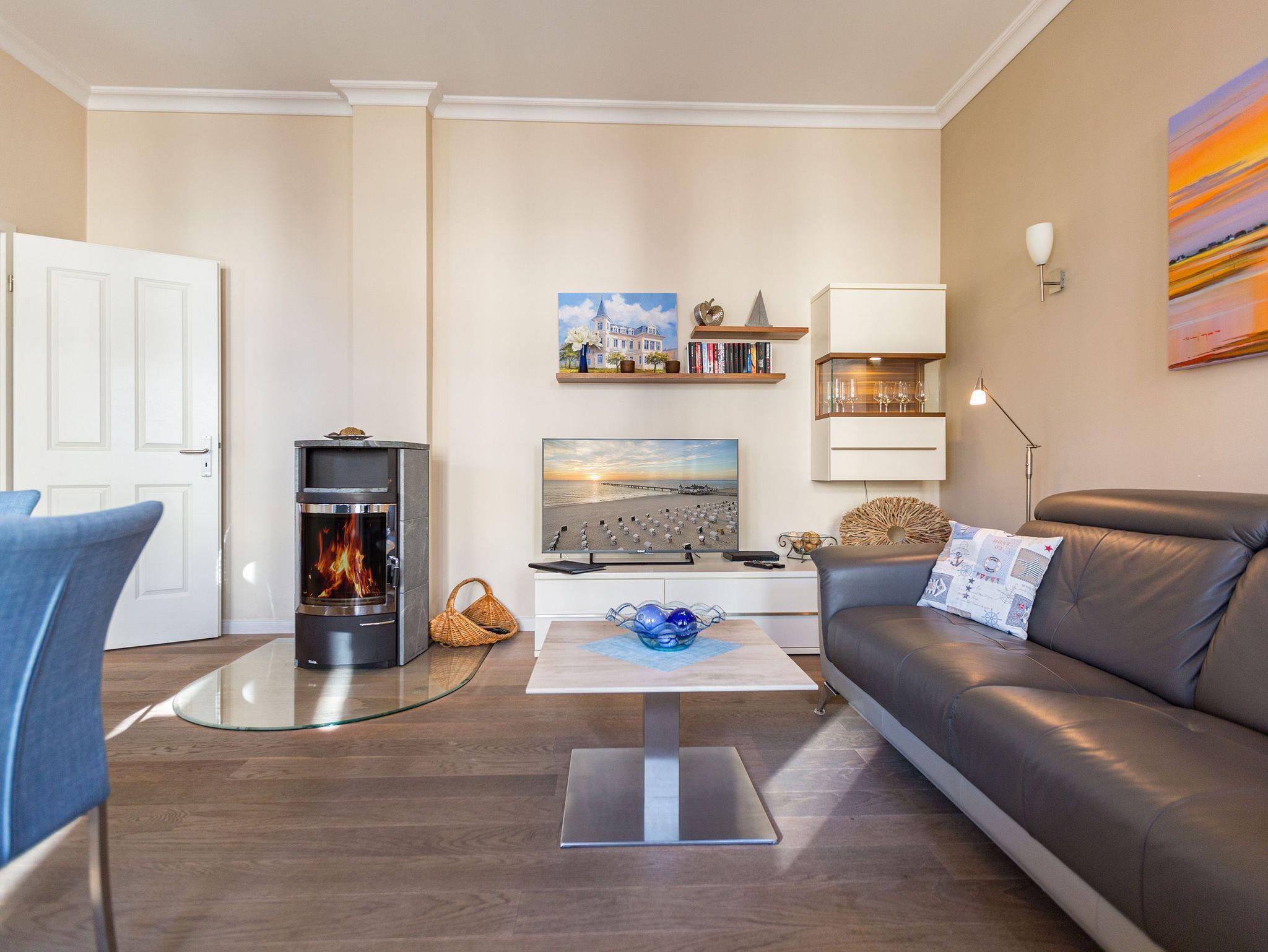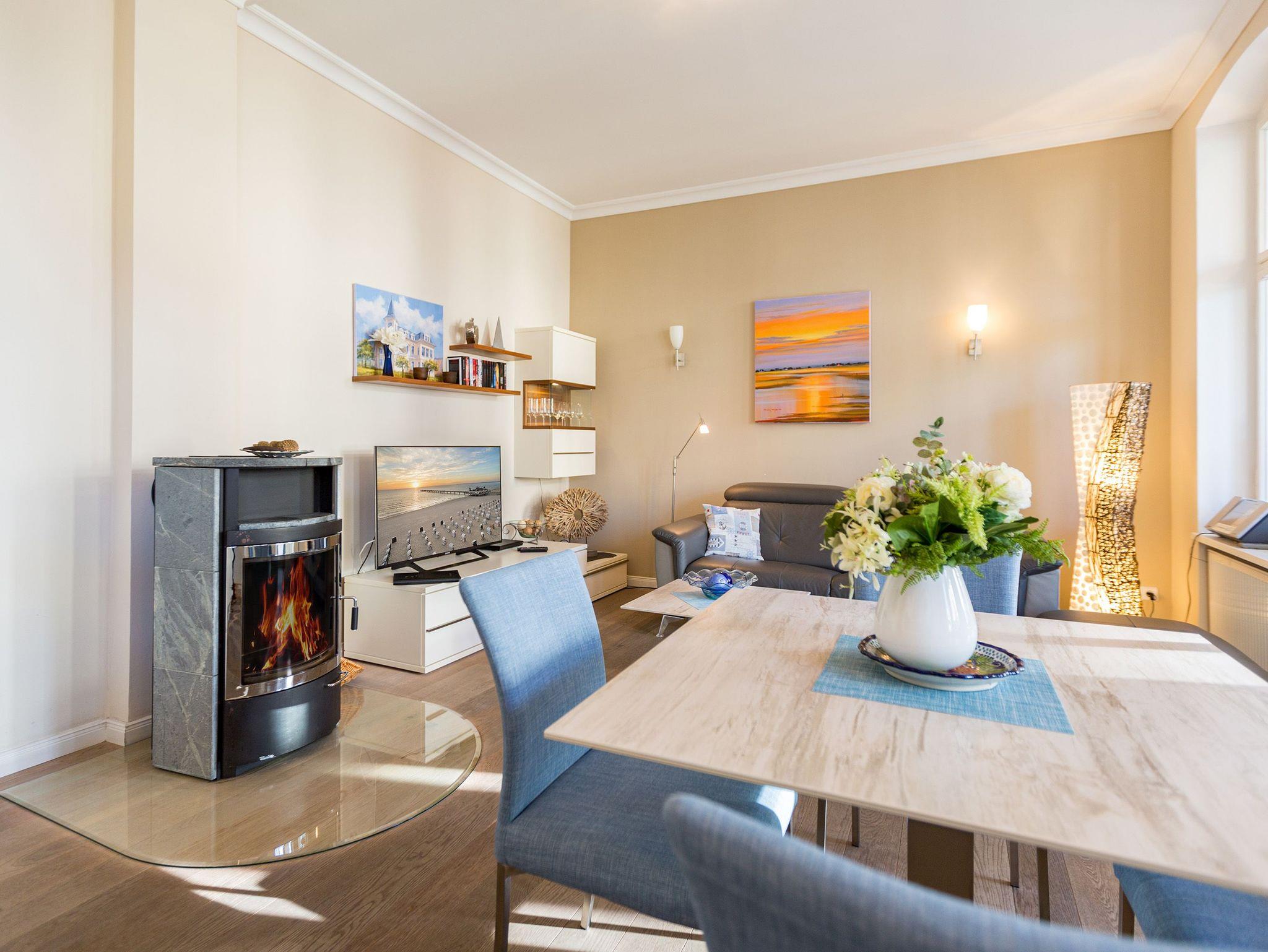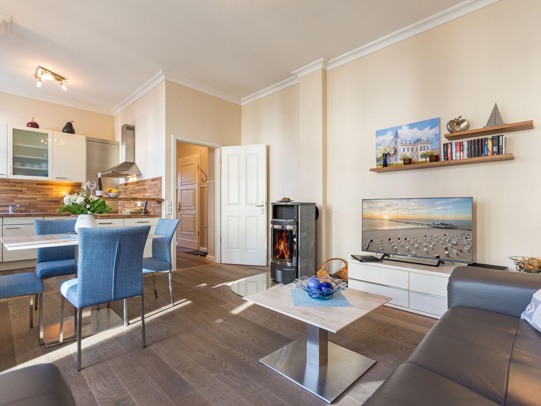 Räume zum Wohlfühlen... Moderner Komfort, geschmackvolle hochwertige Ausstattung und liebevolle Dekorationen. Der große Wohnbereich mit Kamin und offener Küche, die verglaste Veranda und ein Schlafzimmer (Doppelbett mit mobilem Lattenrost 1,80m x 2m) (2.TV) mit kleinem Erker, Zimmer für Ihre Garderobe, bieten Platz für zwei bis vier Personen. Genießen Sie auf Ihren beiden Terrassen die Usedomer Sonne. Im Winter relaxen Sie am knisternden Kaminfeuer. Auf Wunsch stellen wir für unsere kleinen Gäste ein Kinderreisebett (ohne zusätzliche Matratze [&] Bettzeug) und einen Kinderhochstuhl ( gegen einen Aufpreis) zur Verfügung. Für Ihren Komfort sind die Betten bei der Anreise bezogen und Handtücher liegen bereit. Das WLAN-Netz ist kostenfrei nutzbar. In der Tiefgarage befindet sich zwischen den Stellplätzen 2 und 5 eine Wallbox mit einem Ladepunkt zugänglich für beide Wohnungen. Ankommen, abschalten, Urlaub genießen.