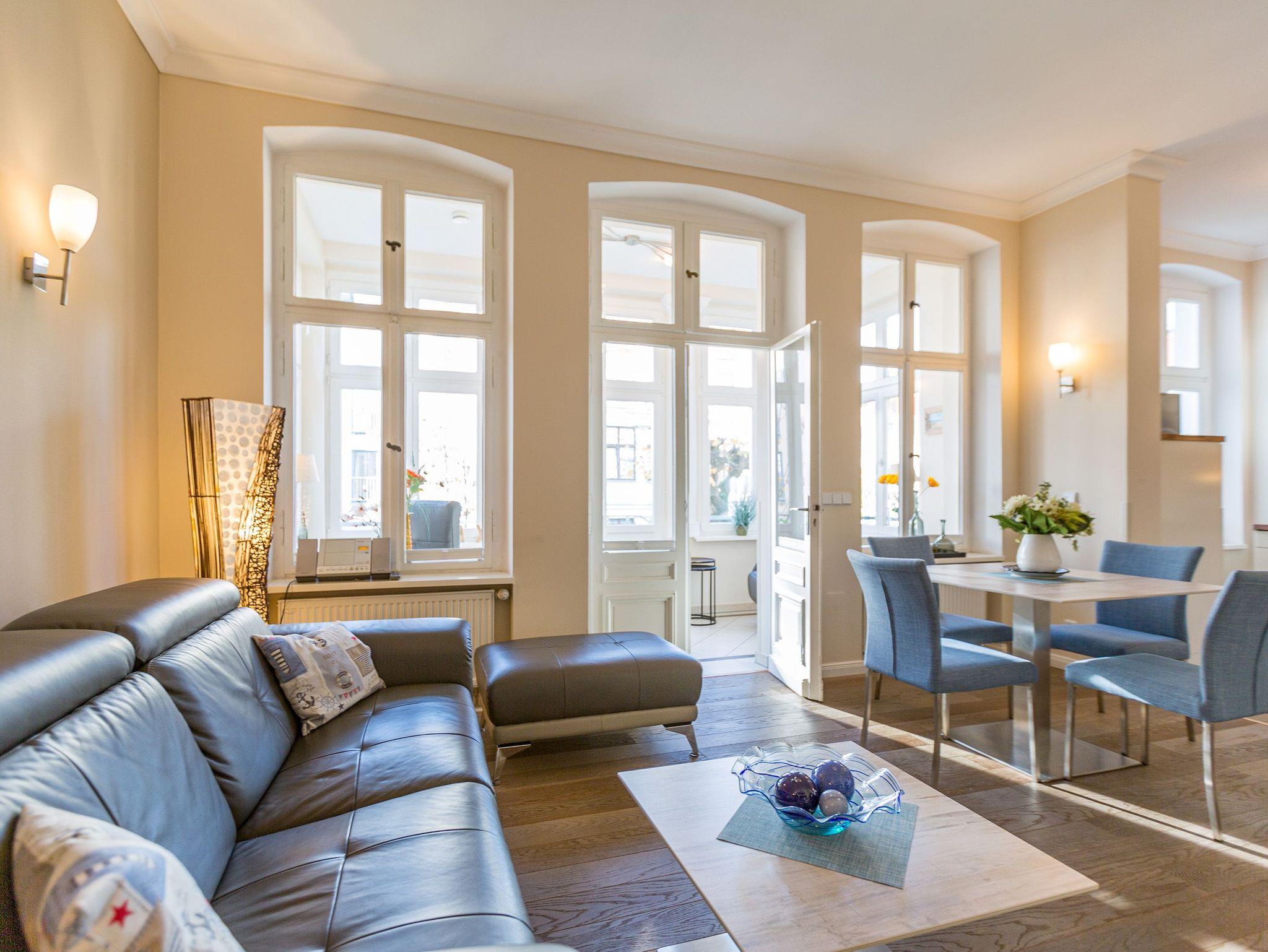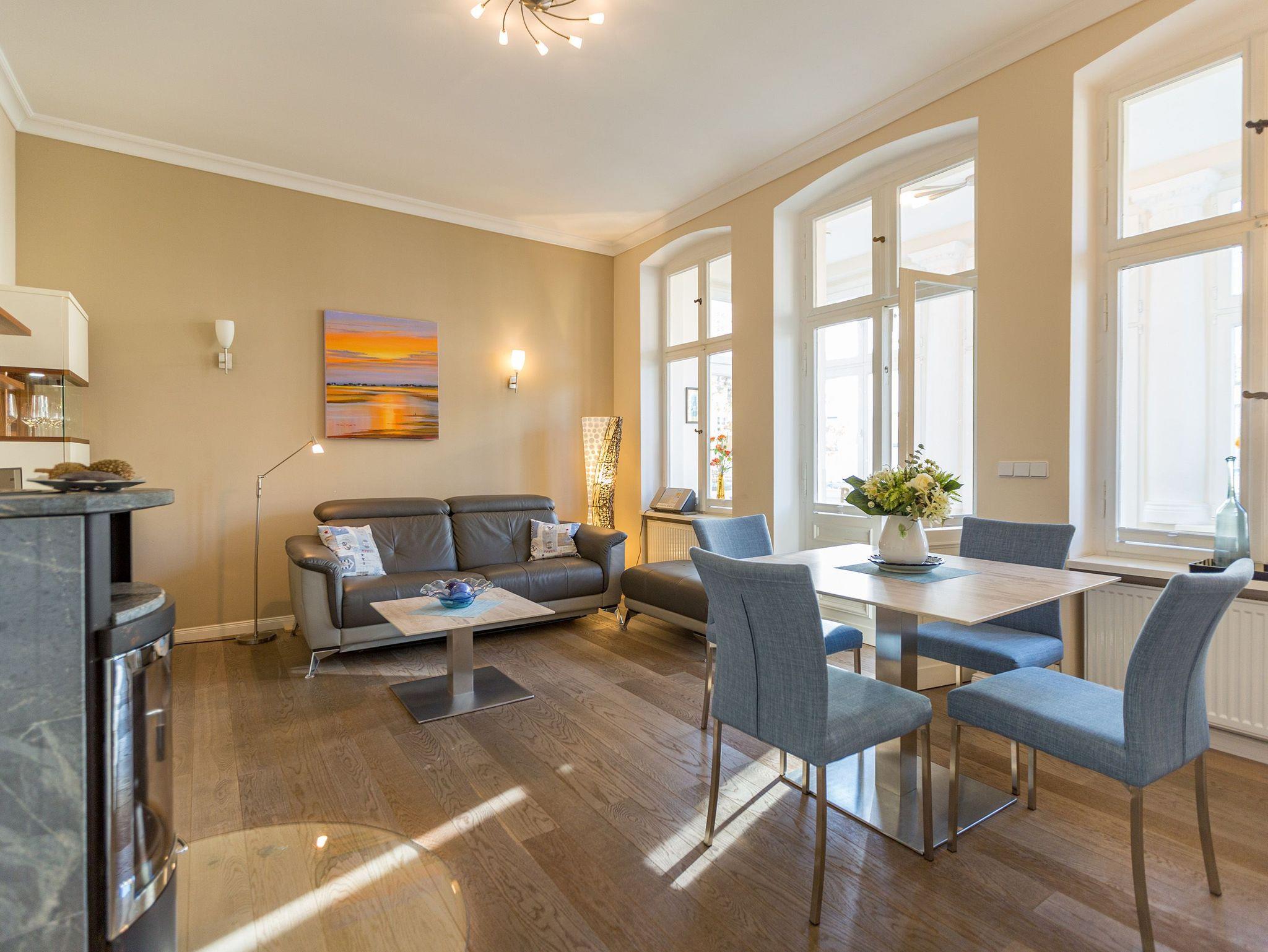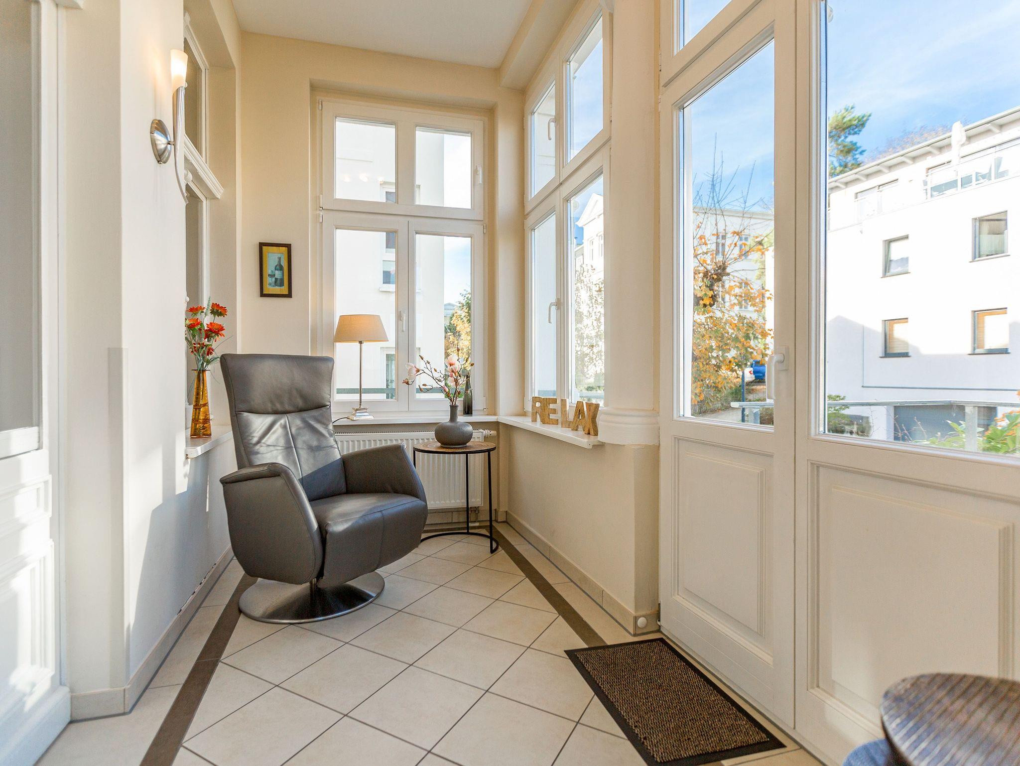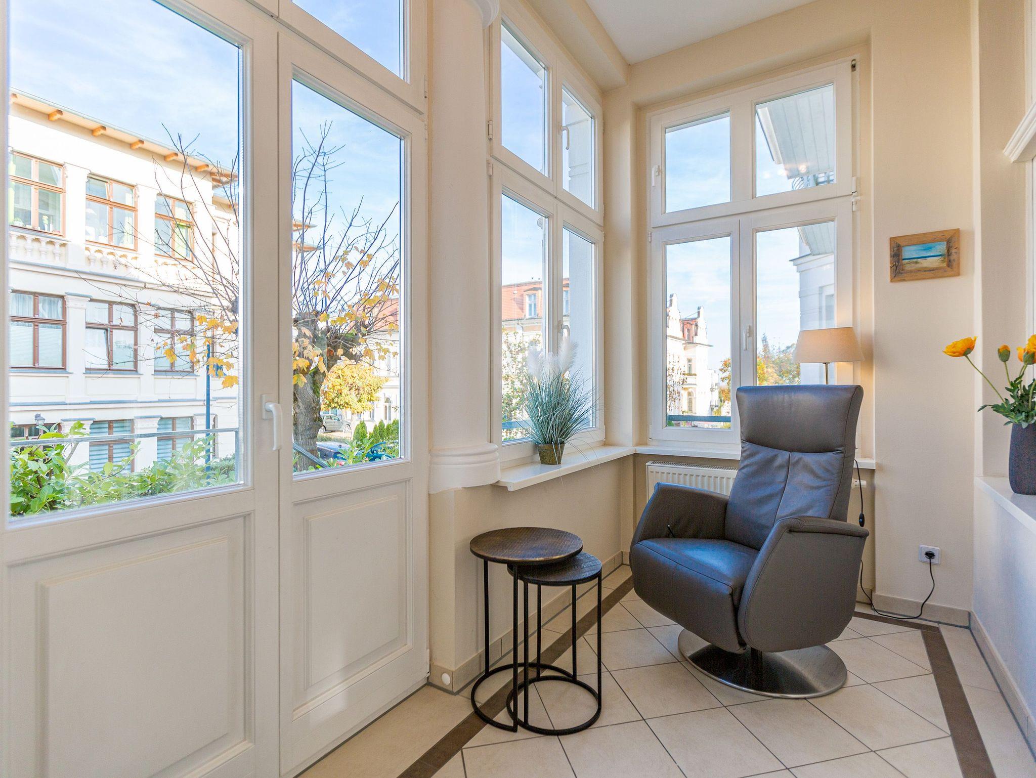 Räume zum Wohlfühlen... Moderner Komfort, geschmackvolle hochwertige Ausstattung und liebevolle Dekorationen. Der große Wohnbereich mit Kamin und offener Küche, die verglaste Veranda und ein Schlafzimmer (Doppelbett mit mobilem Lattenrost 1,80m x 2m) (2.TV) mit kleinem Erker, Zimmer für Ihre Garderobe, bieten Platz für zwei bis vier Personen. Genießen Sie auf Ihren beiden Terrassen die Usedomer Sonne. Im Winter relaxen Sie am knisternden Kaminfeuer. Auf Wunsch stellen wir für unsere kleinen Gäste ein Kinderreisebett (ohne zusätzliche Matratze [&] Bettzeug) und einen Kinderhochstuhl ( gegen einen Aufpreis) zur Verfügung. Für Ihren Komfort sind die Betten bei der Anreise bezogen und Handtücher liegen bereit. Das WLAN-Netz ist kostenfrei nutzbar. In der Tiefgarage befindet sich zwischen den Stellplätzen 2 und 5 eine Wallbox mit einem Ladepunkt zugänglich für beide Wohnungen. Ankommen, abschalten, Urlaub genießen.