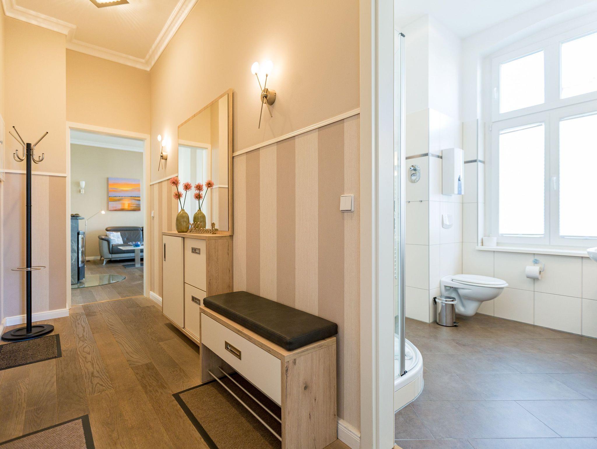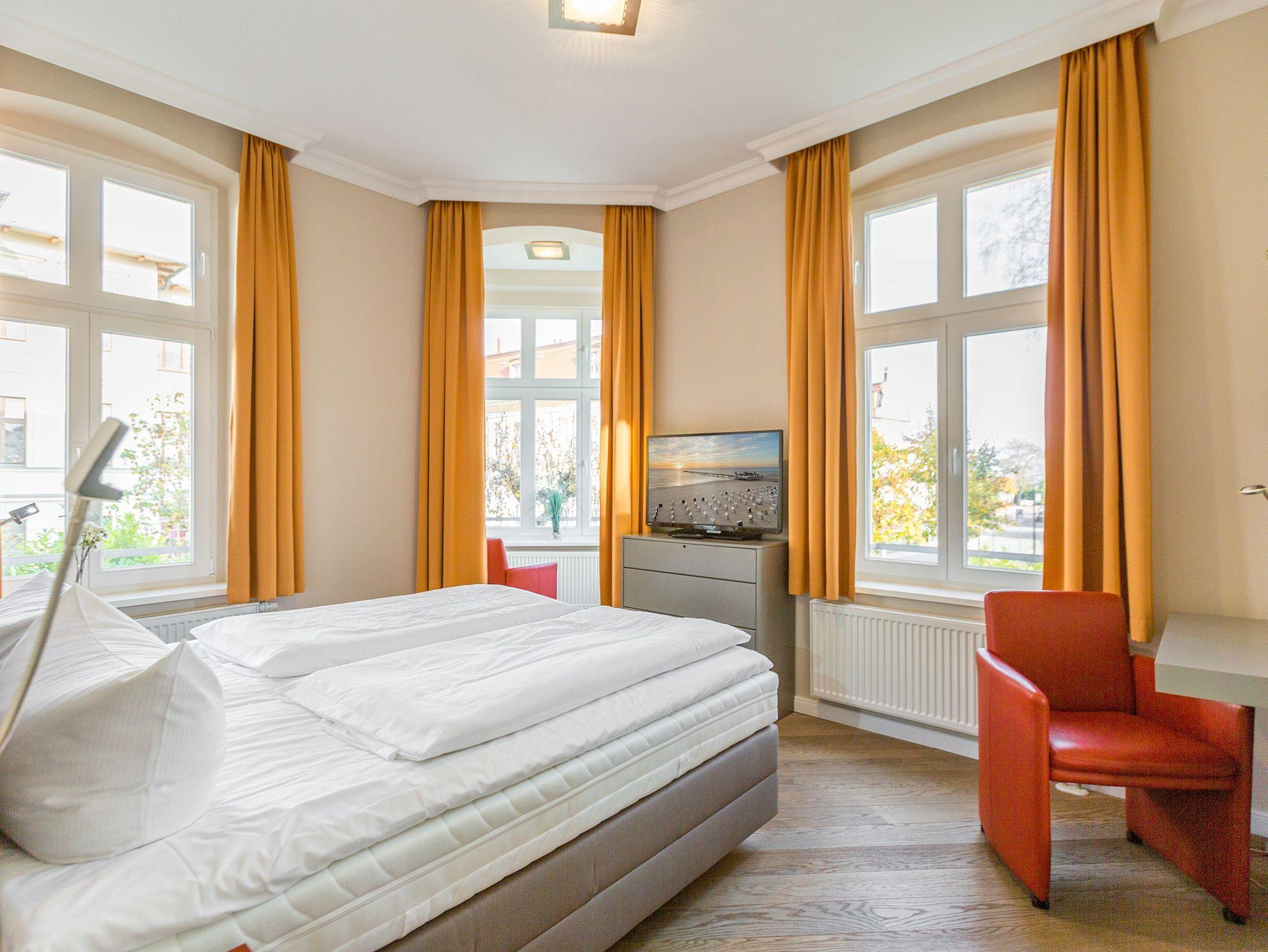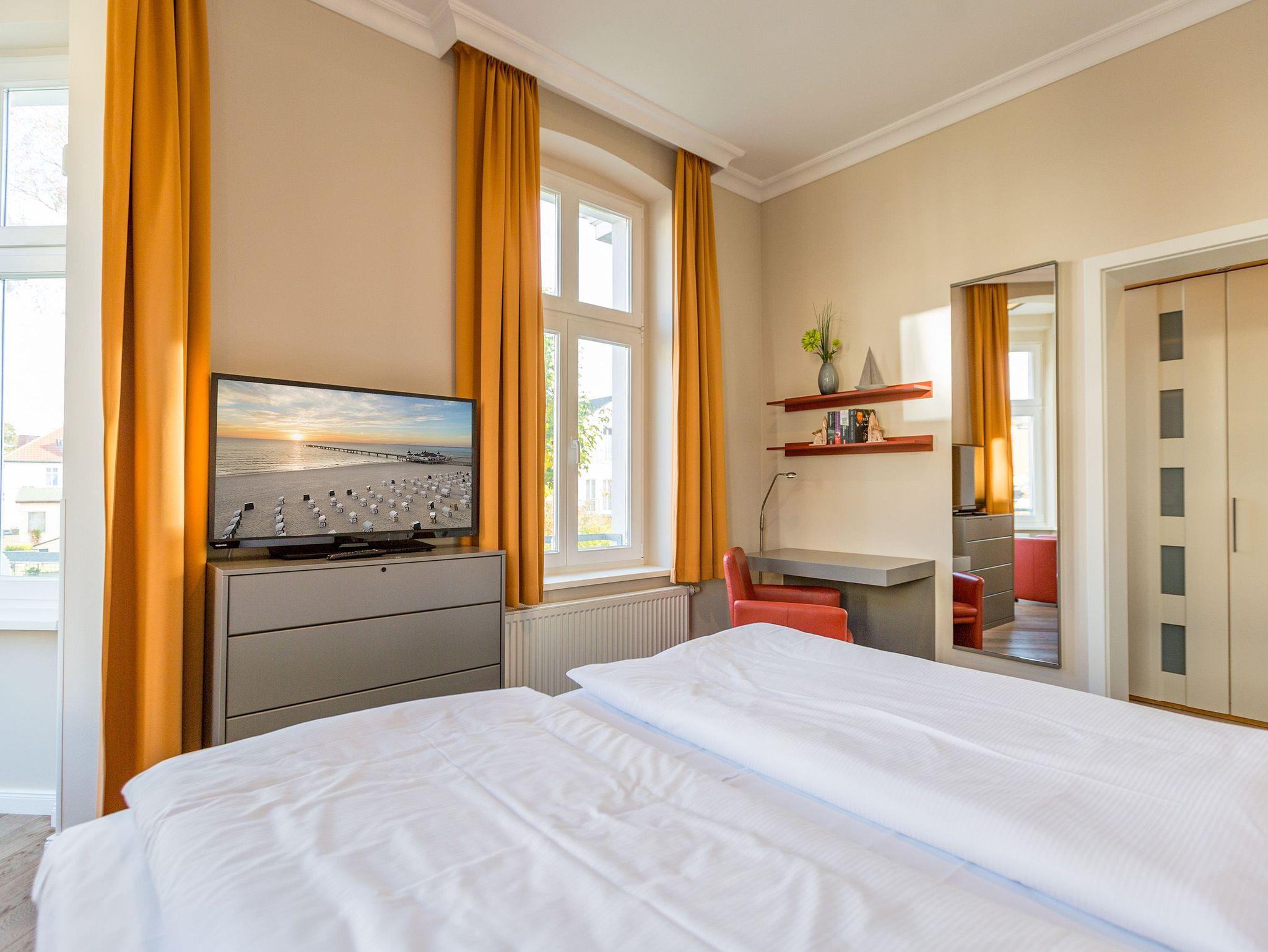 Liebevoll saniert, erstrahlt das Schloss am Meer im neuen alten Glanz. Wunderschön restauriert und exklusiv ausgestattet, bieten Ihnen die Wohnungen ein fantastisches, strandnahes Urlaubsdomizil (nur 80 m) im Seebad Ahlbeck. Stilvoll romantische Bäderarchitektur gepaart mit modernem Komfort. Diese elegante Villa verfügt über einen Fahrstuhl und teilweisen Meerblick, die einzelnen Ferienwohnungen sind mit Balkonen oder Terrassen ausgestattet. Als besonderes Highlight finden Sie in jedem Appartement einen Kaminofen. Im Schwesternhaus, der Residenz Bismarck befindet sich ein Saunabereich (gegen Gebühr). Jede Wohnung verfügt über einen Stellplatz in der Tiefgarage für Fahrzeuge bis 1,90 m Höhe ( Stellplätze relativ eng, eingeschränkte Wendemöglichkeit). Für Ihren Komfort steht die Erstausstattung Wäsche für Sie bereit. Bitte beachten Sie, dass Kaminholz in der Wohnung nicht vorhanden ist. Das WLAN-Netz ist kostenfrei nutzbar.