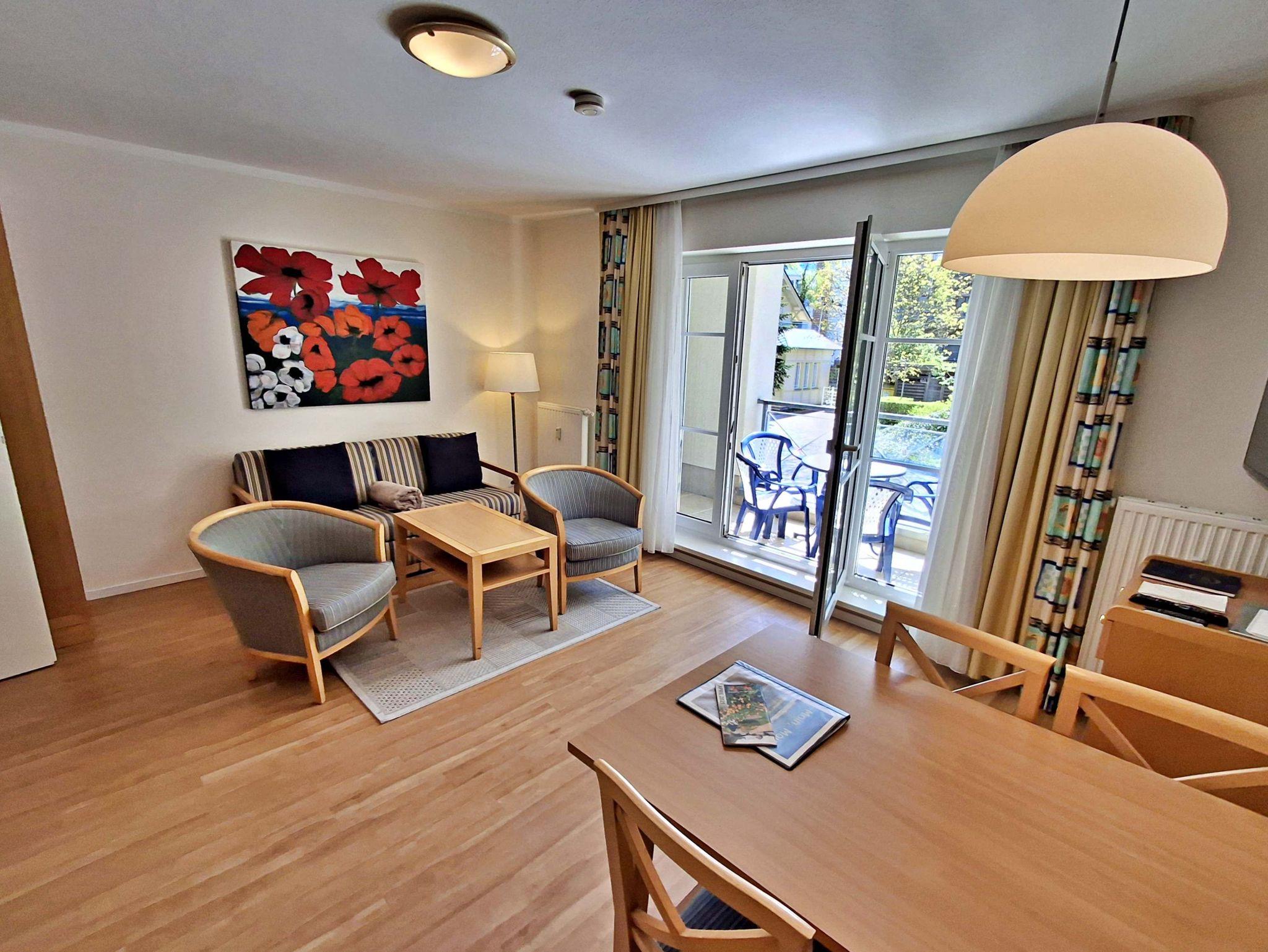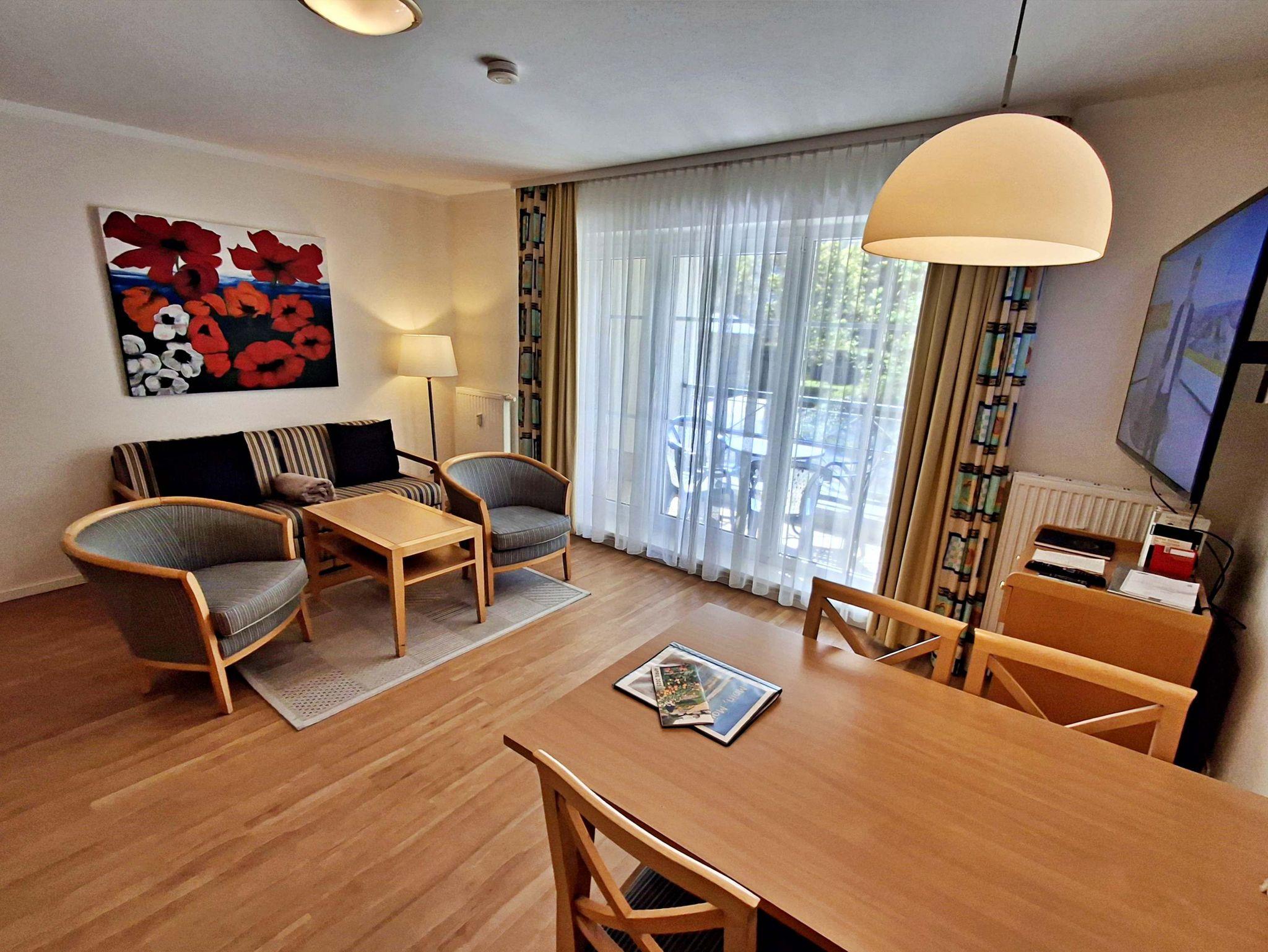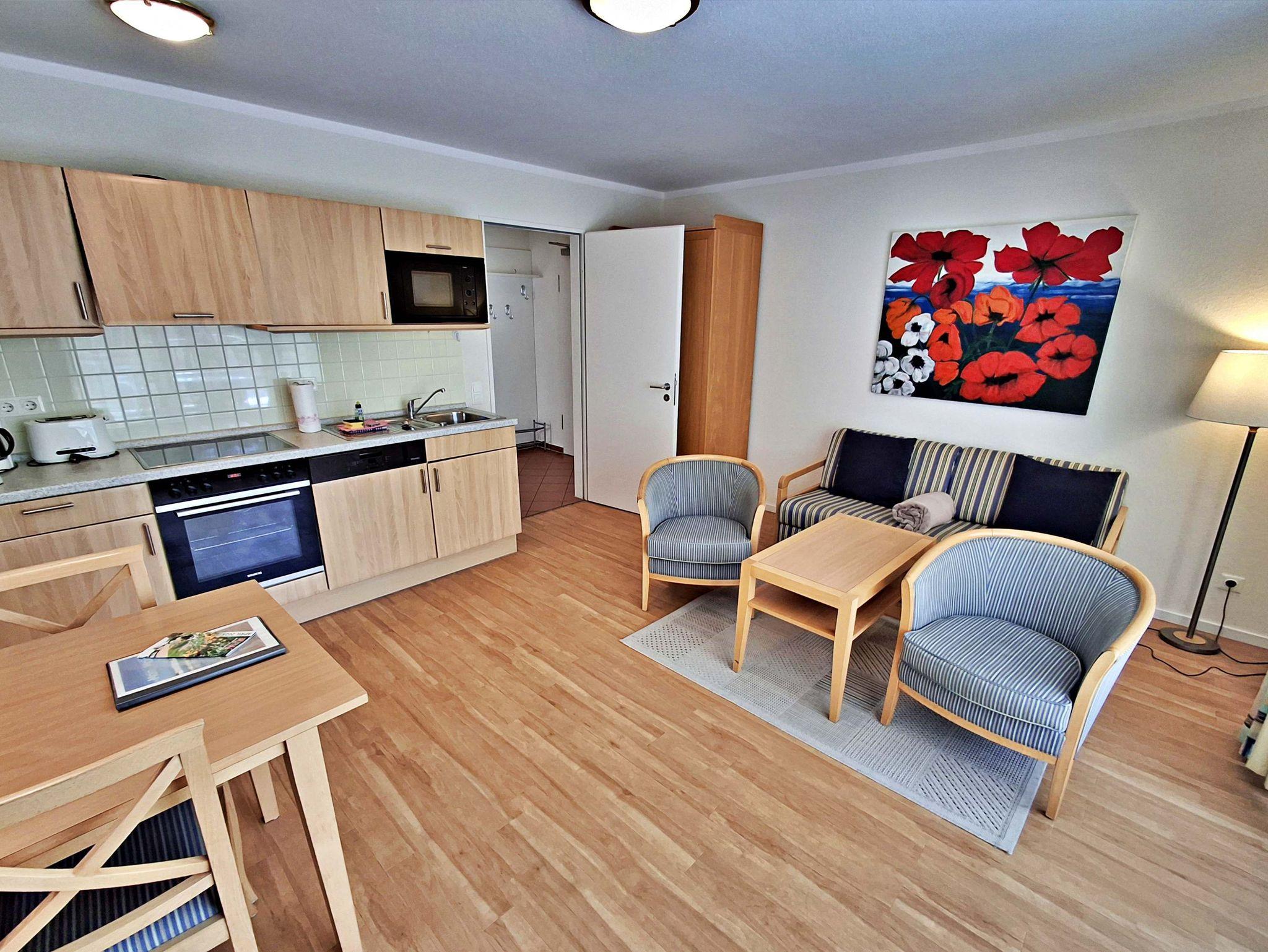 Die 47 qm große 2-Raum-Ferienwohnung befindet sich im 1. OG (mit Lift) der Appartementanlage und ist für bis zu vier Personen ausgestattet. Die Wohnung verfügt über ein Wohnzimmer mit einem gemütlichen Sofa (Schlafsofa), TV, Stereo-Anlage, Gratis W-LAN, eine vollständig ausgestattete Küche mit modernem Ceranherd mit Umluftbackofen, Mikrowelle, Kühlschrank mit Gefrierfach, Spülmaschine etc. Im Schlafzimmer befindet sich ein Doppelbett und ein zweiter Flachbild-TV. Das Tageslicht-Bad ist mit Dusche/WC, Haarfön sowie Kosmetikspiegel ausgestattet. Ein überdachter Balkon/Loggia mit Sitzgruppe lädt zum Sitzen und Verweilen ein.