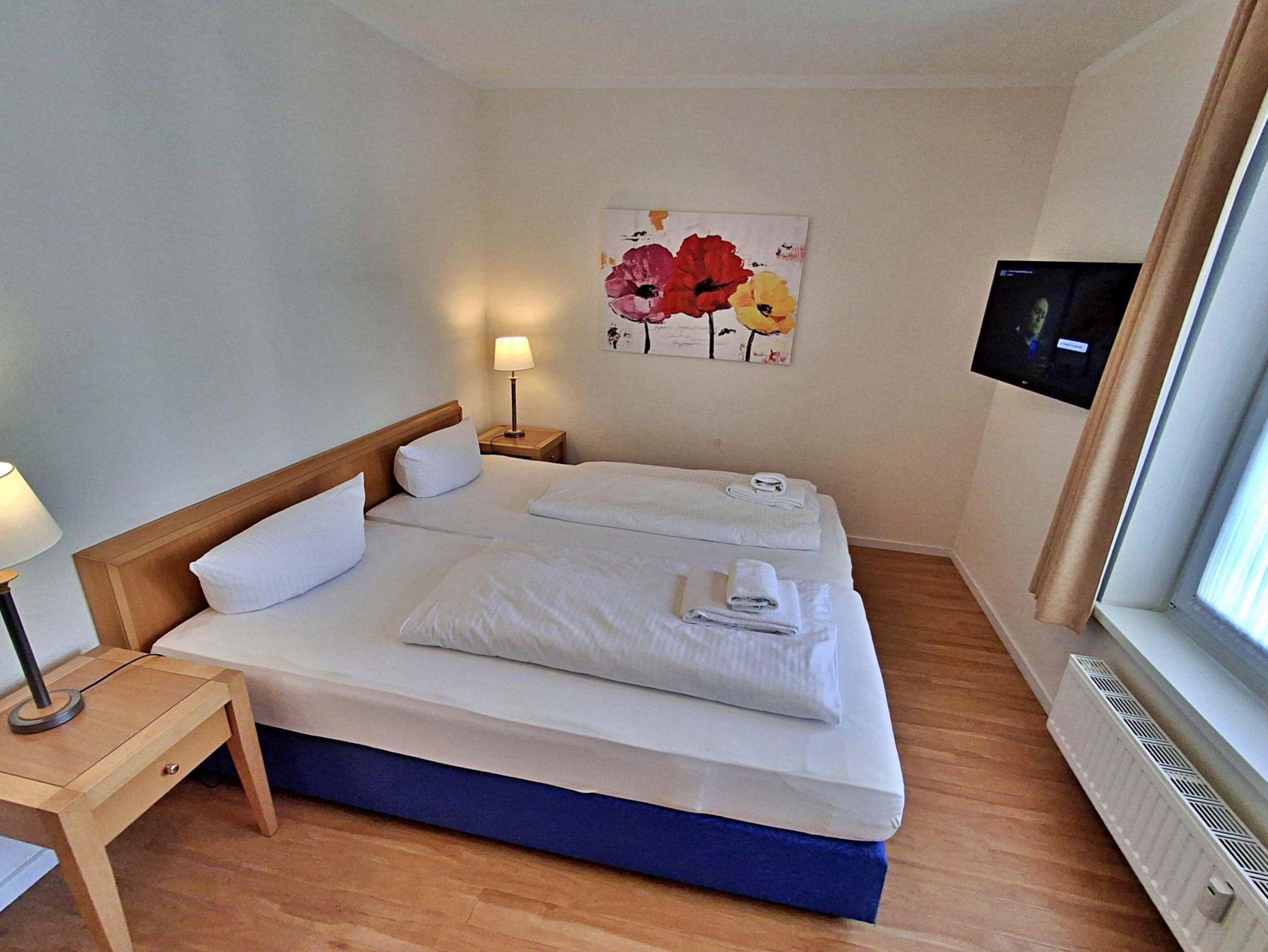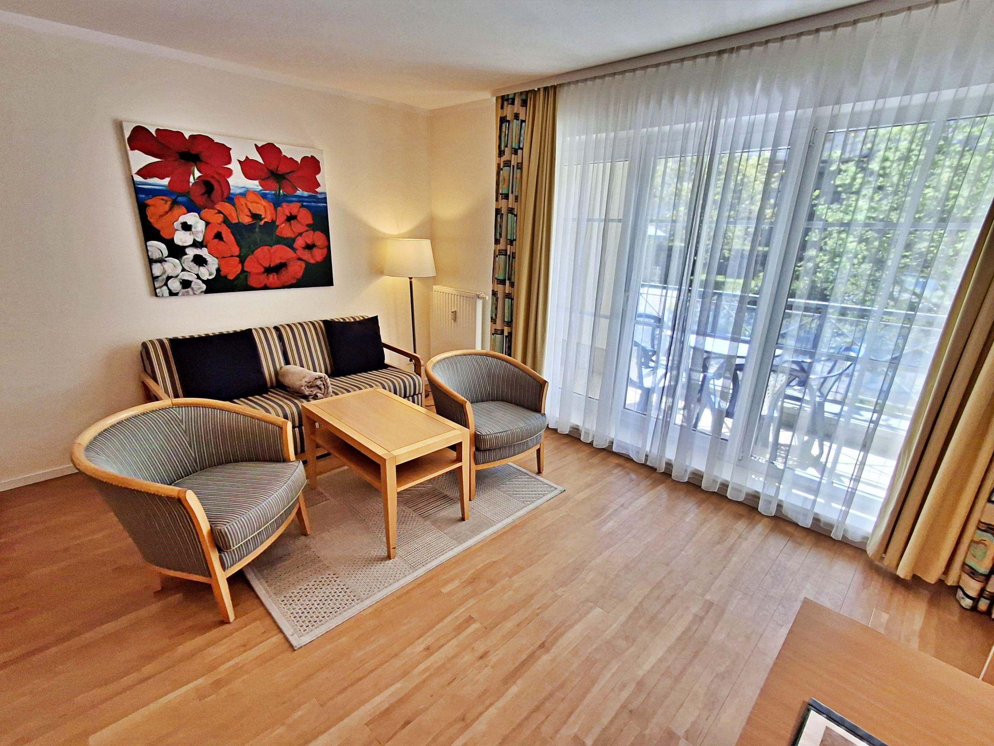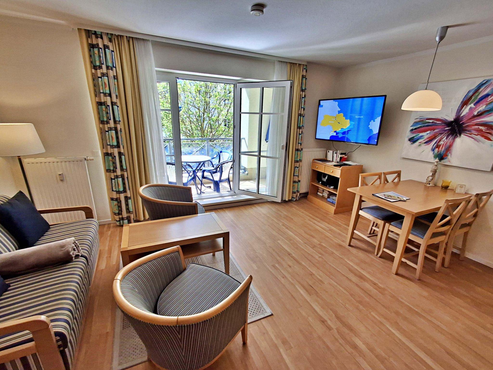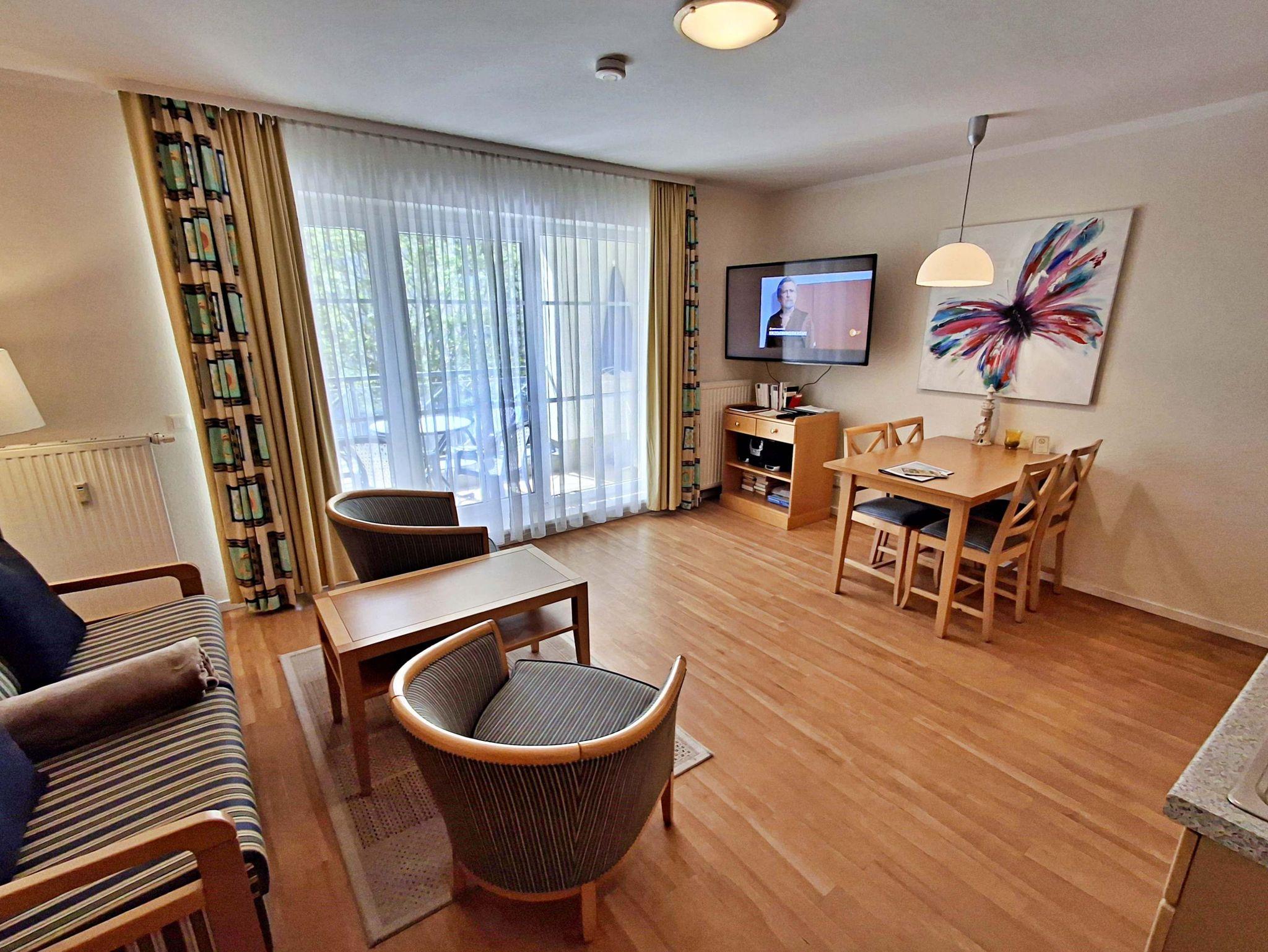 Die 47 qm große 2-Raum-Ferienwohnung befindet sich im 1. OG (mit Lift) der Appartementanlage und ist für bis zu vier Personen ausgestattet. Die Wohnung verfügt über ein Wohnzimmer mit einem gemütlichen Sofa (Schlafsofa), TV, Stereo-Anlage, Gratis W-LAN, eine vollständig ausgestattete Küche mit modernem Ceranherd mit Umluftbackofen, Mikrowelle, Kühlschrank mit Gefrierfach, Spülmaschine etc. Im Schlafzimmer befindet sich ein Doppelbett und ein zweiter Flachbild-TV. Das Tageslicht-Bad ist mit Dusche/WC, Haarfön sowie Kosmetikspiegel ausgestattet. Ein überdachter Balkon/Loggia mit Sitzgruppe lädt zum Sitzen und Verweilen ein.