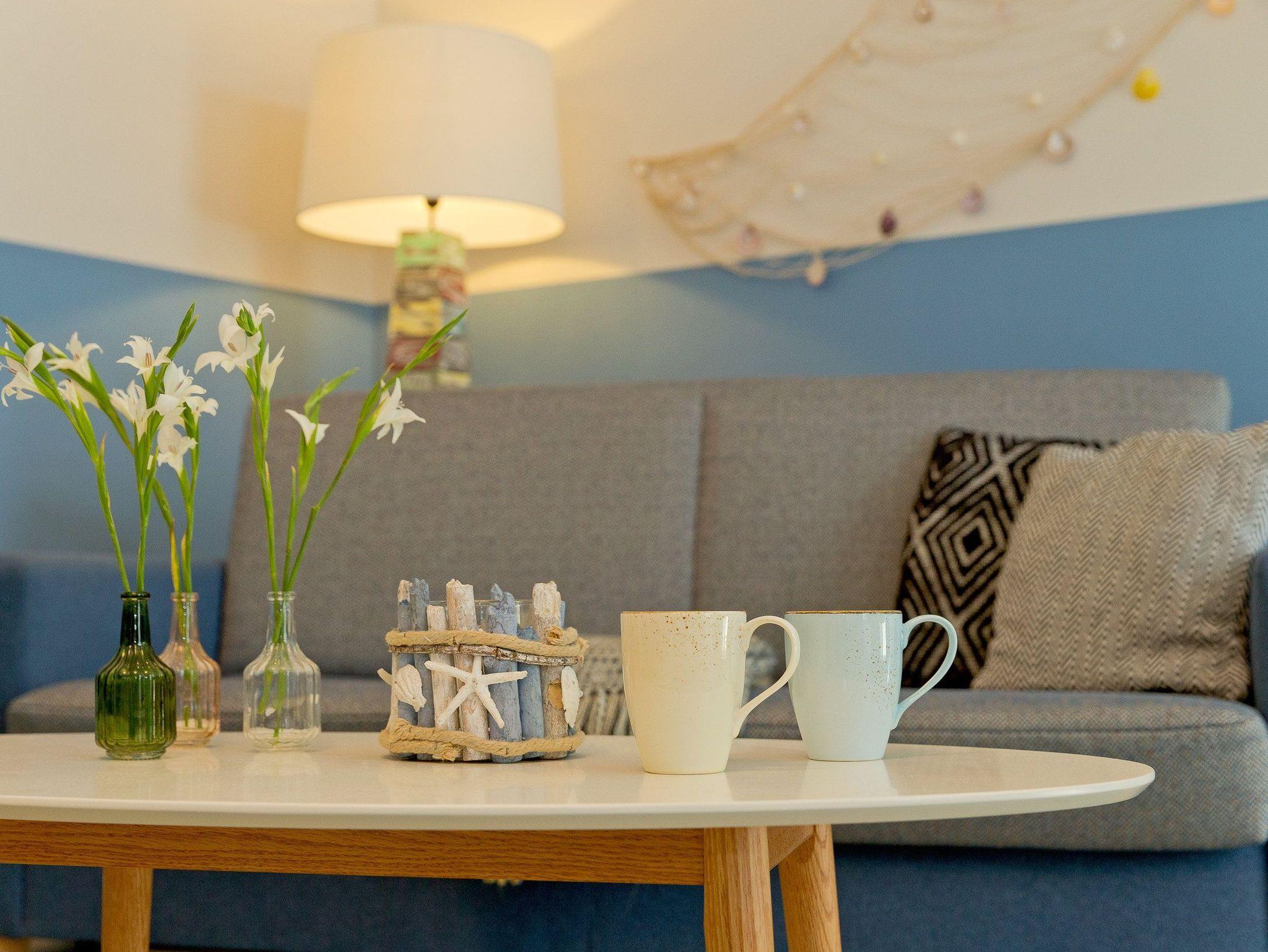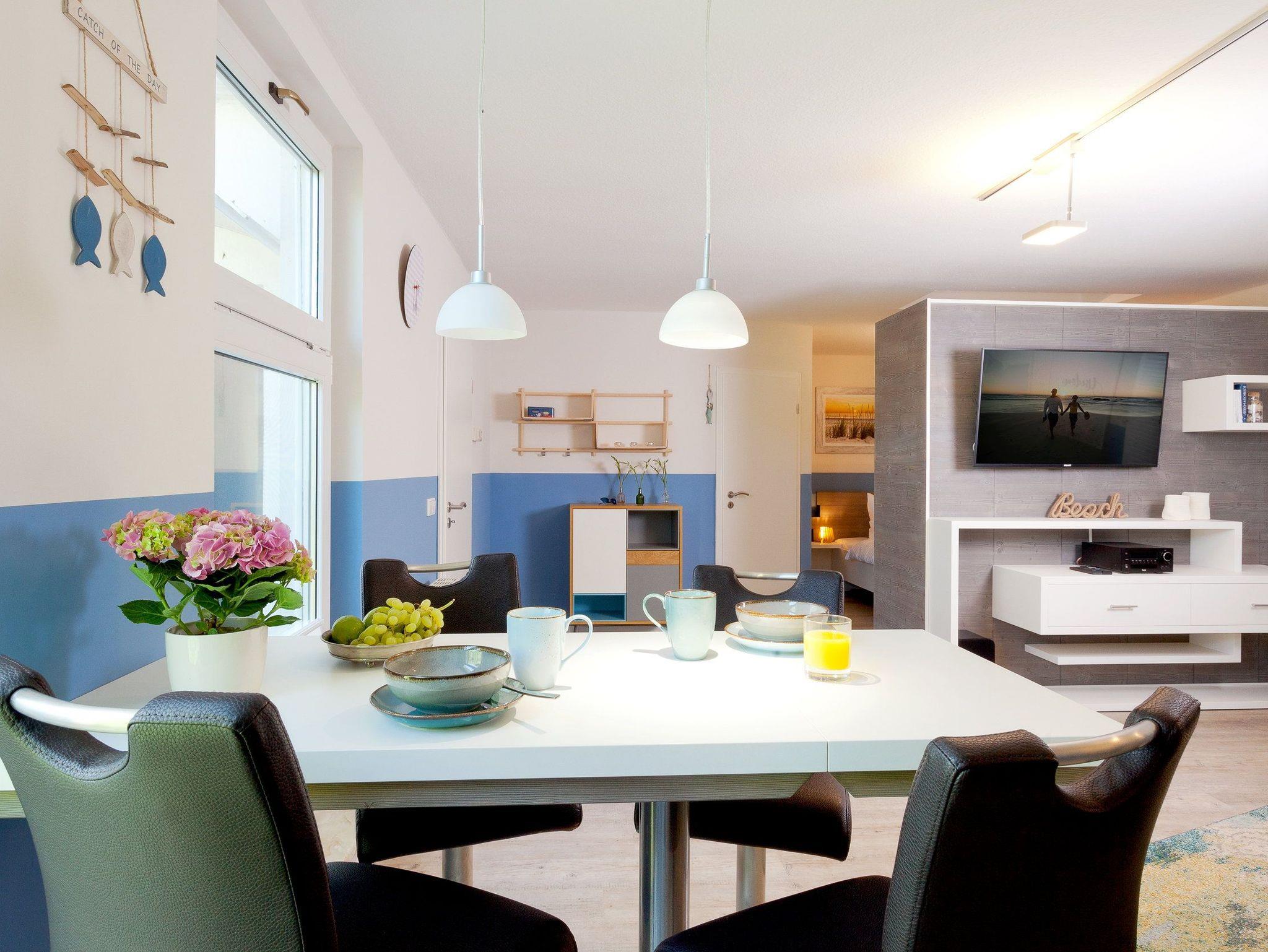 Der Wohnbereich verfügt über eine gemütliche Couch und Flachbild TV sowie einem Esstisch mit Sitzgelegenheit für bis zu vier Personen. Die bequeme Couch kann mit wenigen Handgriffen zu einem Schlafplatz für zwei Gäste umgewandelt werden.