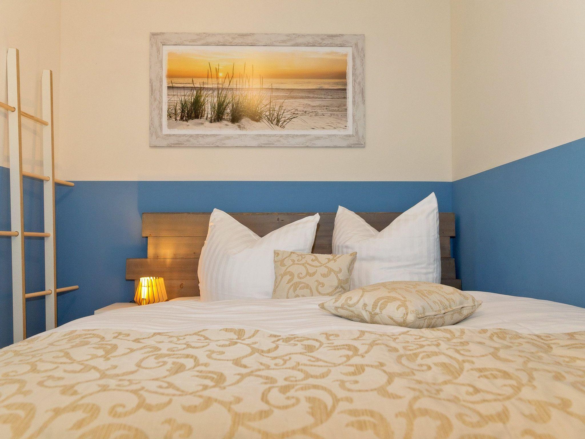 Durch eine kleine Wand vom Wohnbereich abgetrennt befindet sich das bequeme Doppelbett (160 x 200cm / zwei getrennte Matratzen) sowie ein geräumiger Kleiderschrank für Ihre Habseligkeiten. Damit Sie Ihre wohlverdiente Urlaubszeit bereits am Anreisetag in vollen Zügen genießen können, haben wir das Bett für Sie und das für Ihre lieben Mitreisenden bereits bezogen und ein Duschtuch sowie ein kleines Handtuch bereitgelegt.