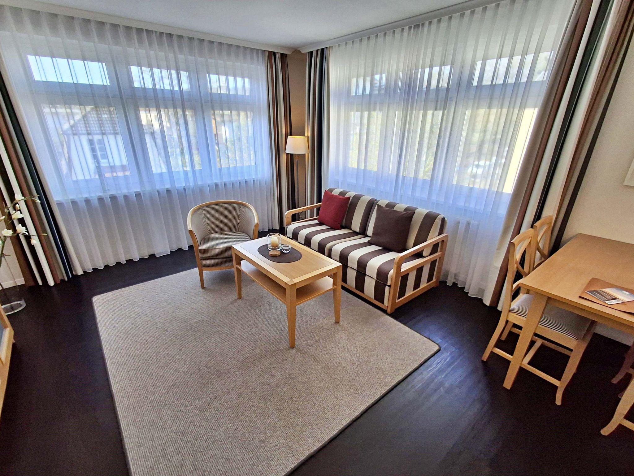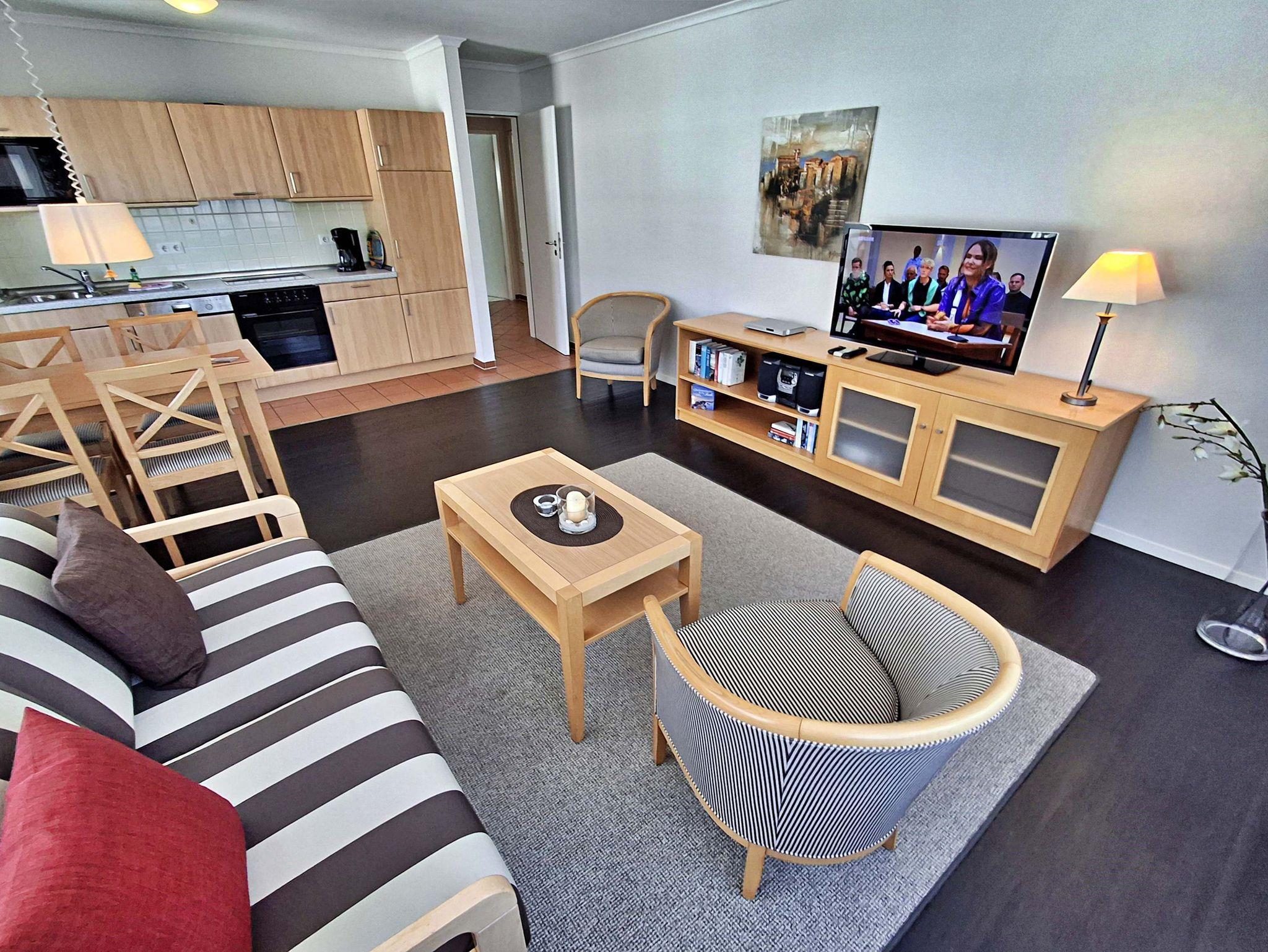 Die 54 qm große 2-Raum-Ferienwohnung befindet sich im 2. Obergeschoss (Westlage) der Appartementanlage und ist für 2 Erwachsene und 1 Kleinkind bis 1 Jahr ausgestattet. Die Wohnung verfügt über ein großes Wohnzimmer mit bequemer Couch, Sessel und eine Essecke mit 4 Stühlen. Für die Unterhaltung sorgen ein Flachbild-TV und eine Stereo-Anlage. Die vollständig ausgestattete Küchenzeile mit Ceranherd, Backofen, Mikrowelle, Kühlschrank mit Gefrierfach und Geschirrspülmaschine lässt keine Wünsche offen. Im Schlafzimmer befindet sich ein gemütliches Doppelbett. Das Tageslicht-Bad ist mit Dusche/WC, Haarfön sowie Kosmetikspiegel ausgestattet. Ein Balkon lädt zum Sitzen und Verweilen ein. Ein Kinderbett mit Wäsche sowie ein Hochstuhl können auf Anfrage gegen eine Gebühr von einmalig 50 € vom Verwalter zur Verfügung gestellt werden.