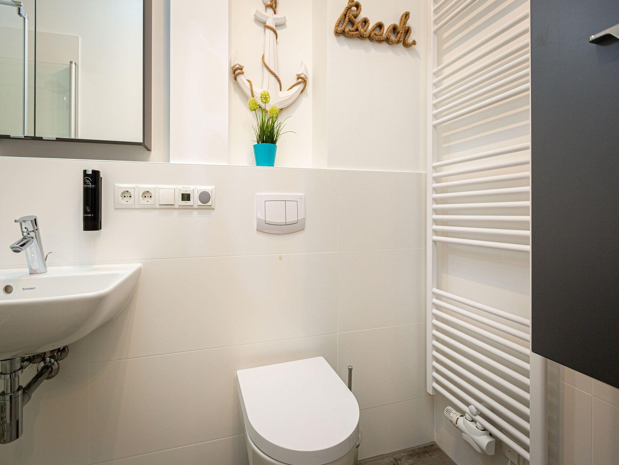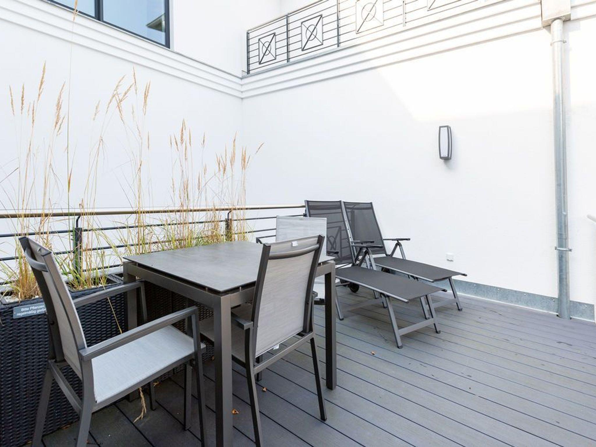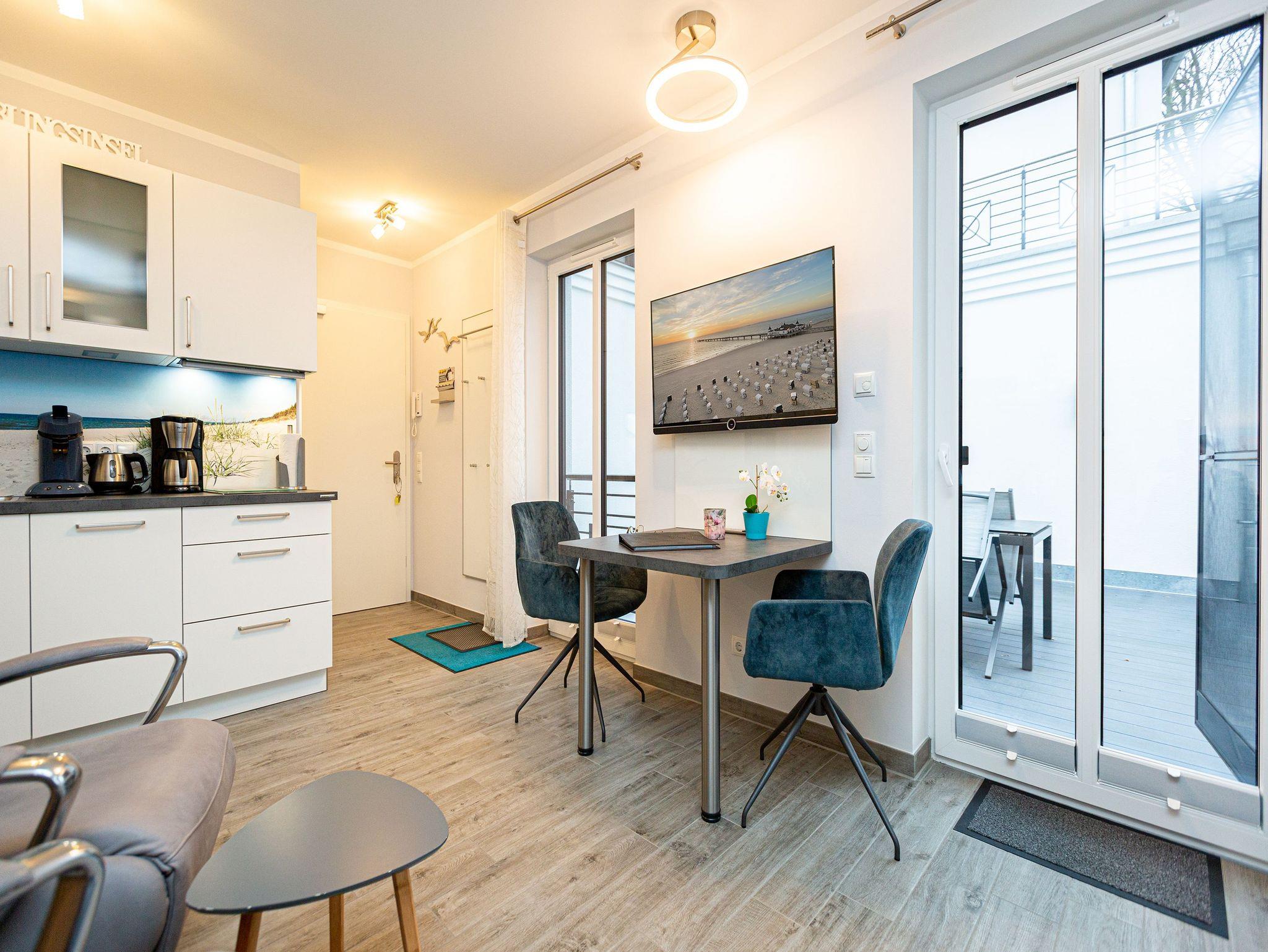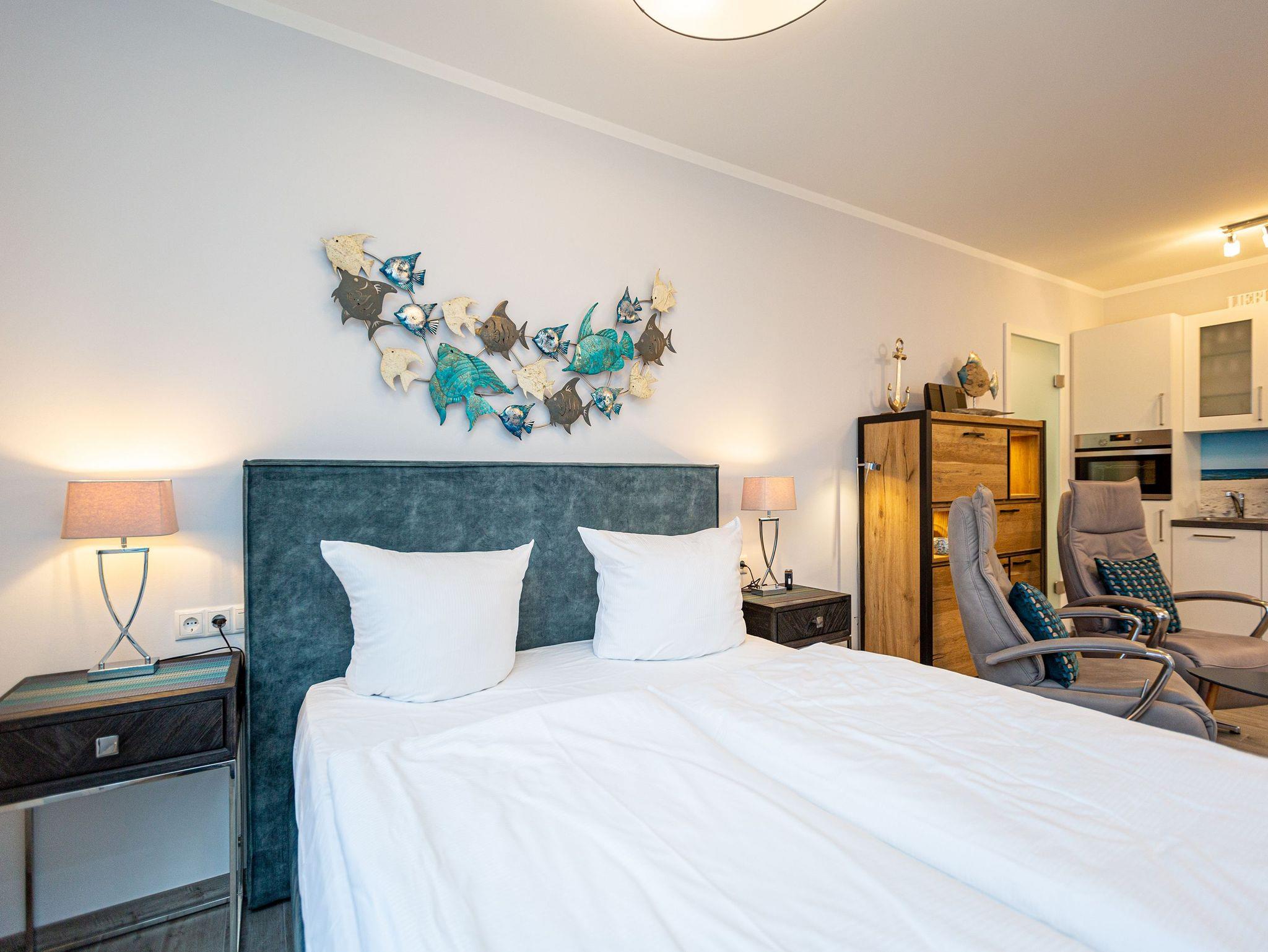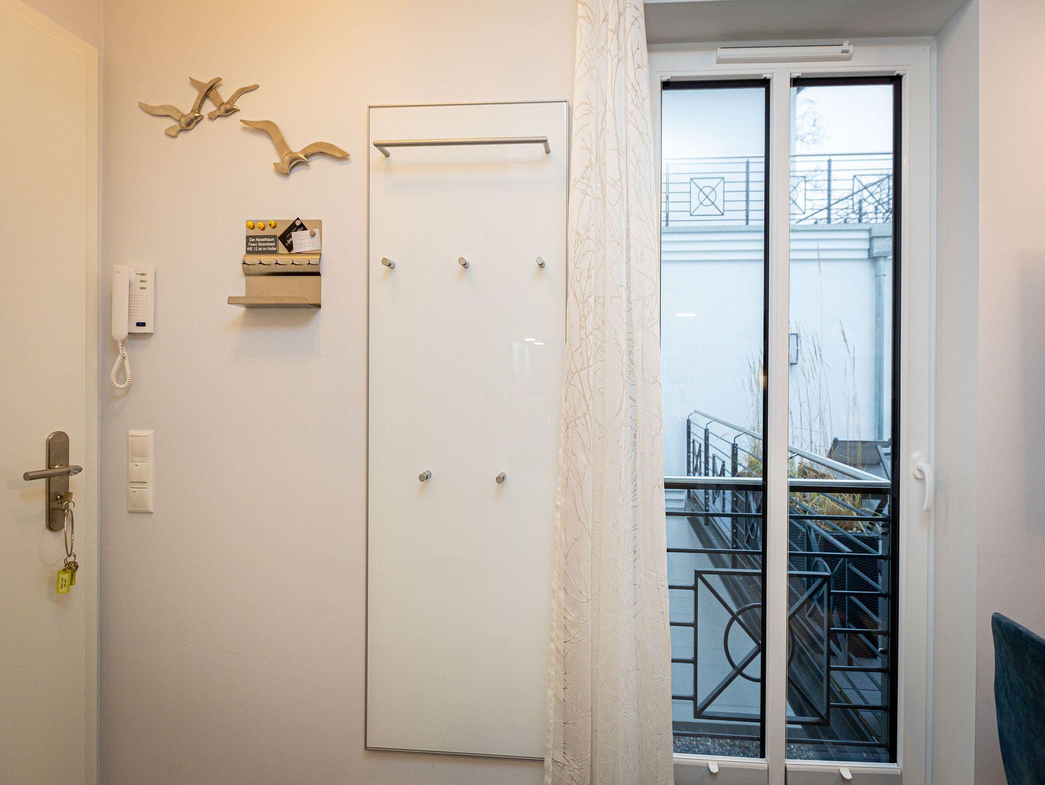 Genießen Sie die Nähe zum Ostseestrand und die zentrale Lage dieses gemütlichen Ein-Raum-Appartements Strandnest im 1. Obergeschoss. Die 27qm sind ideal für zwei Personen und bieten neben einem Schlafbereich mit Boxspringbett (1,60m x 2,00m), eine Küchenzeile (2-Platten-Induktionskochfeld, Backofen, Spülmaschine) und einen Wohn-Essbereich mit Lounge Sesseln und Essplatz für Sie und Ihre Begleitung. Ein 40 Zoll Flat-TV sowie ein Radio mit CD-Player gehören ebenso zur Ausstattung wie eine Senseo-Kaffeemaschine. Die bequemen Sonnenliegen und der Esstisch für bis zu drei Personen auf dem 15qm großen Ost-Balkon laden zum entspannten Verweilen an der frischen Luft ein. Das Badezimmer verfügt über eine Dusche und ein WC. Ein Stellplatz in der hauseigenen Tiefgarage und kostenfreies W-Lan runden Ihren Aufenthalt in diesem Appartement ab. Ein separater Abstellraum für Ihre Fahrräder steht Ihnen außerdem zur Verfügung.