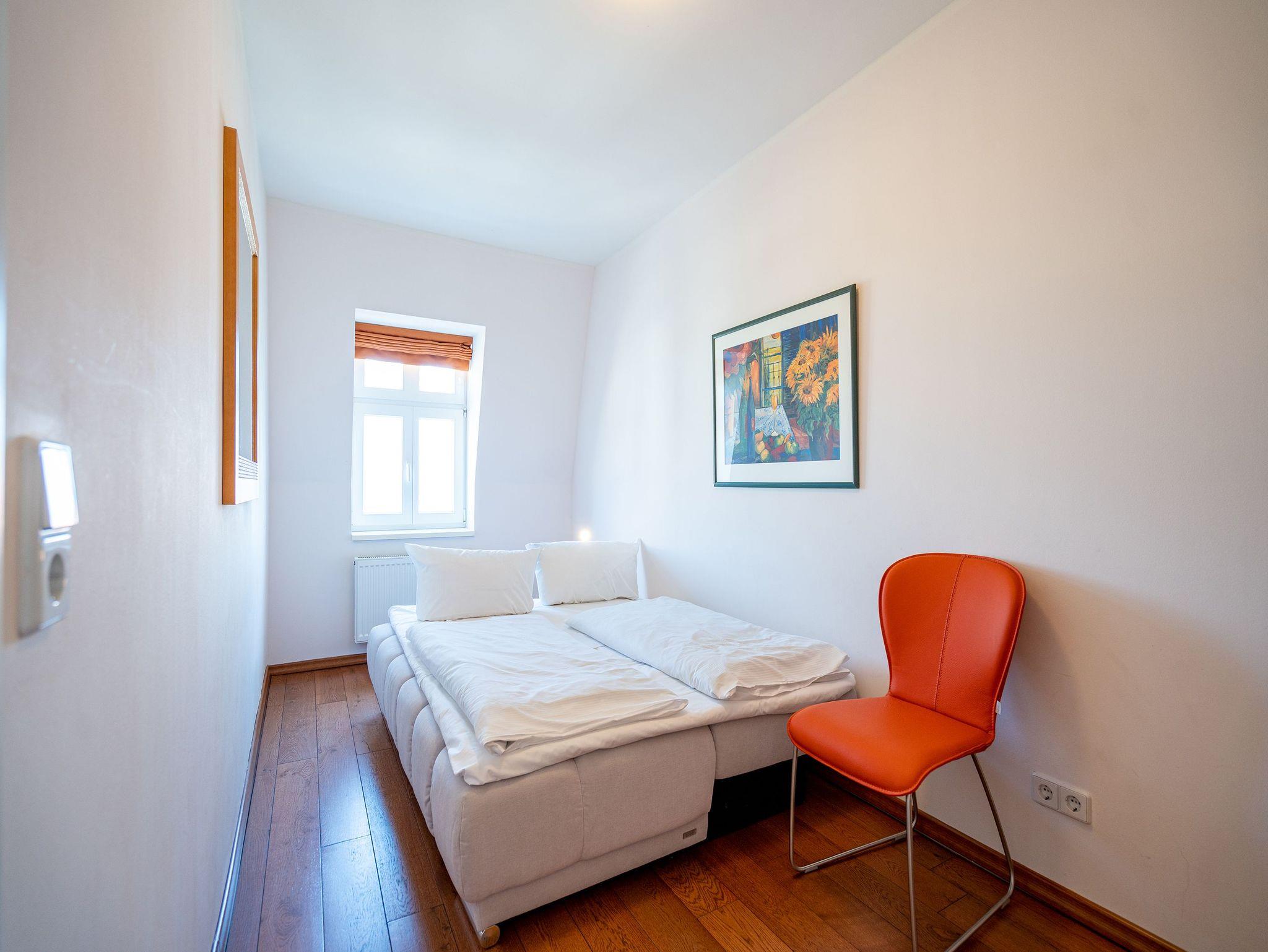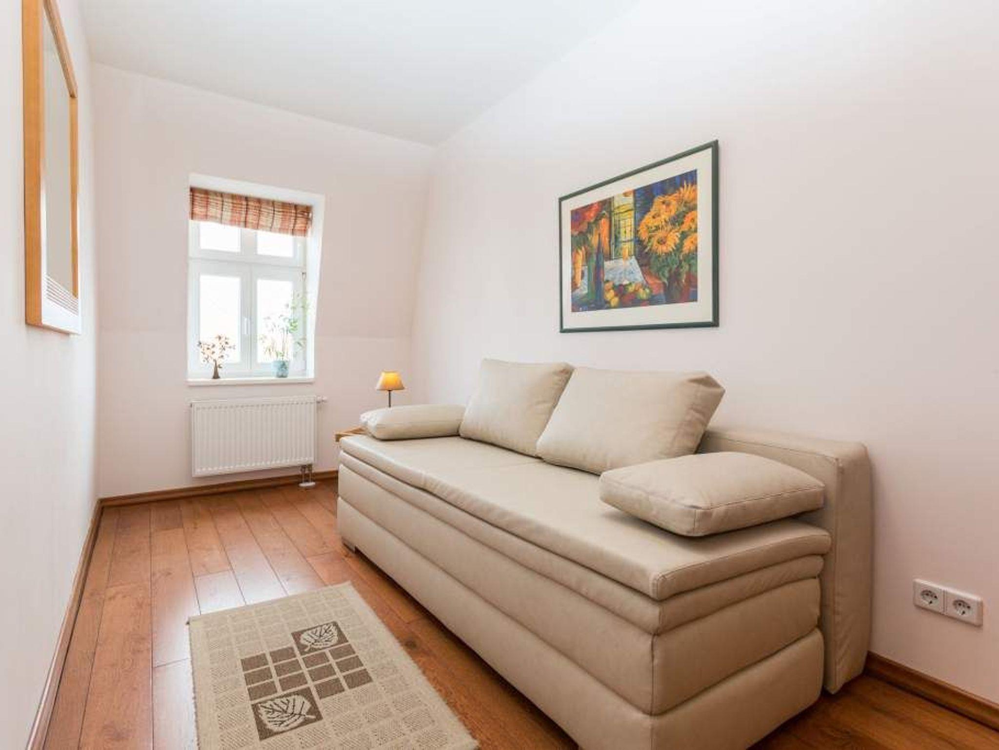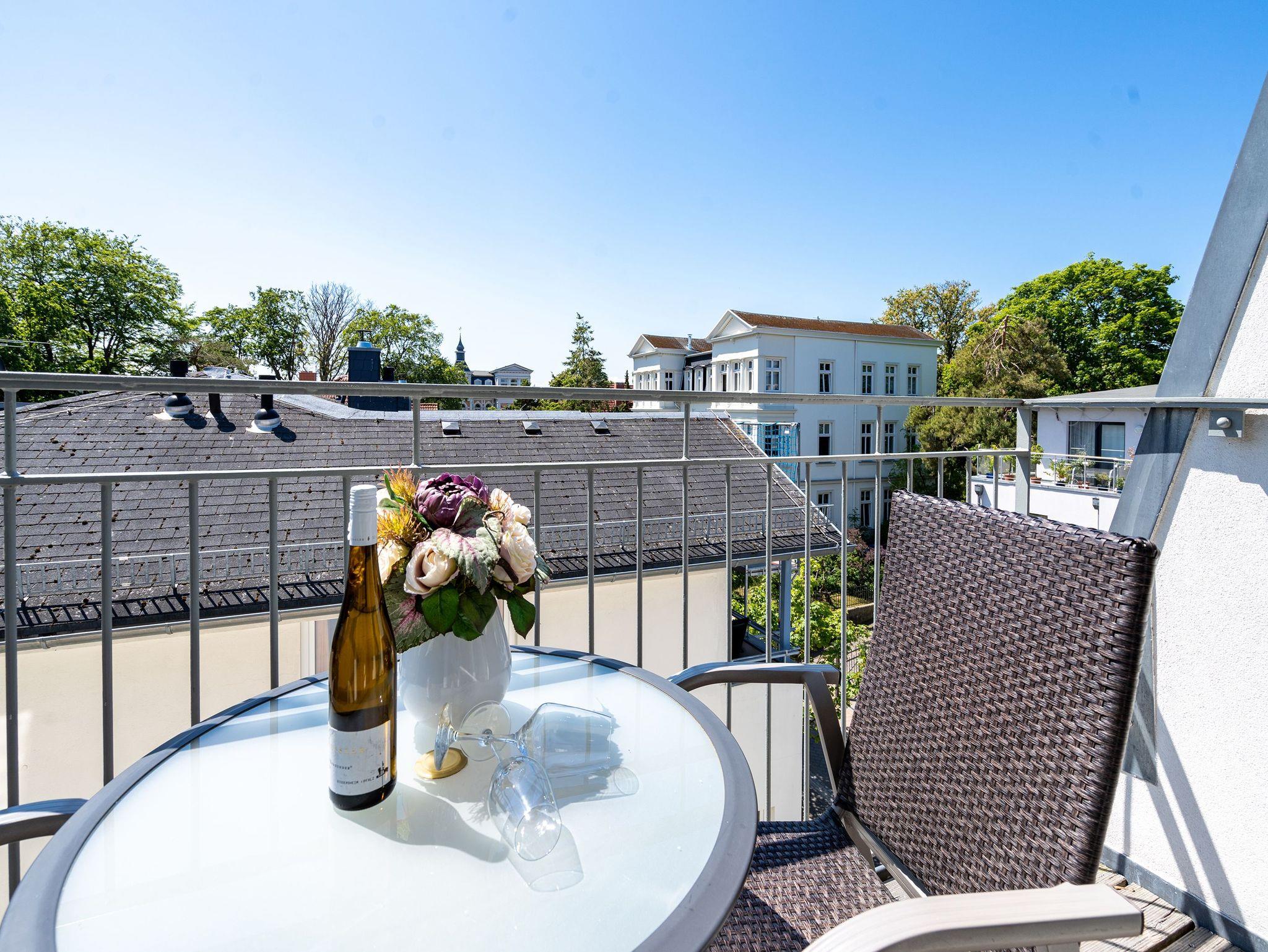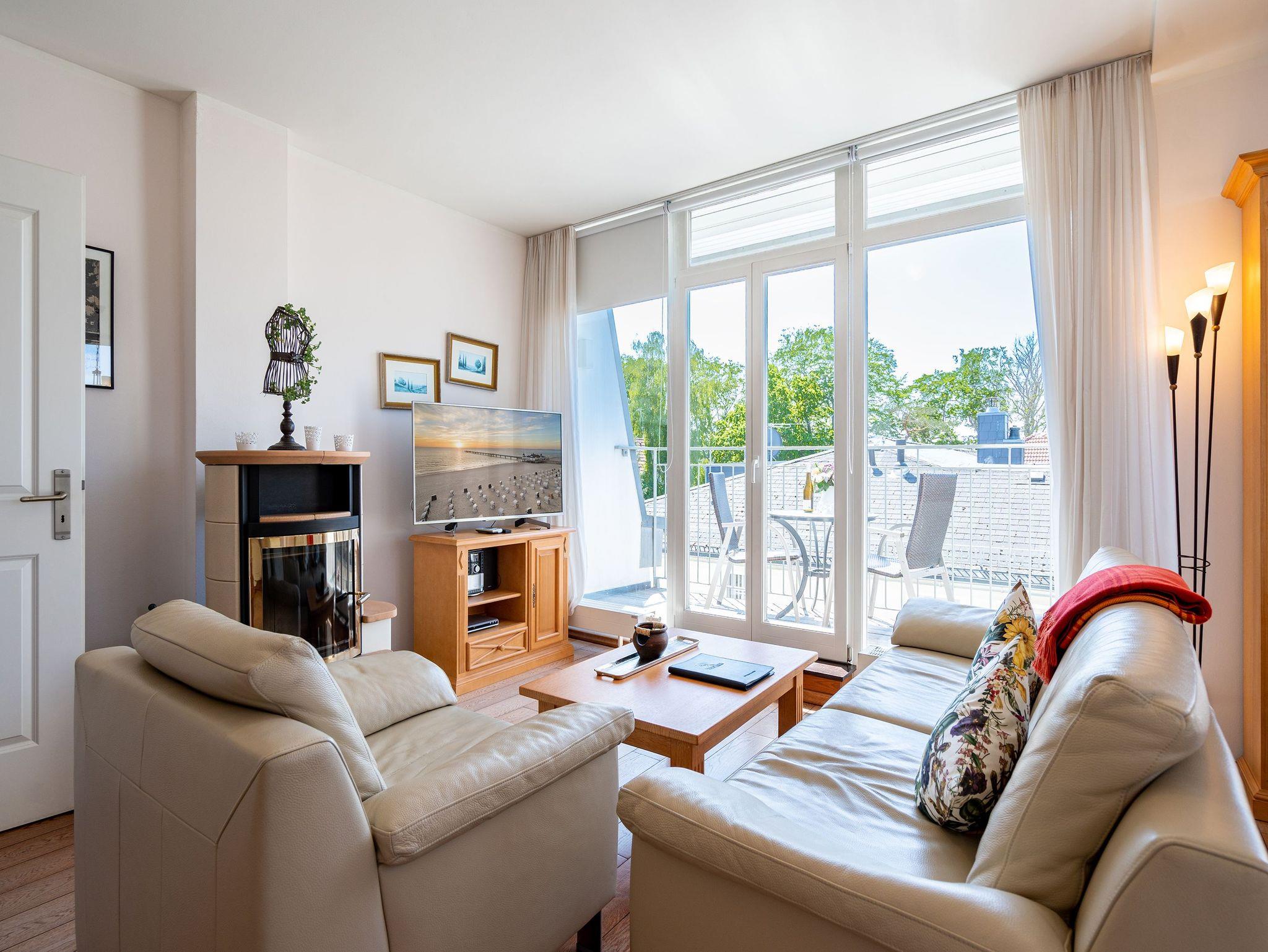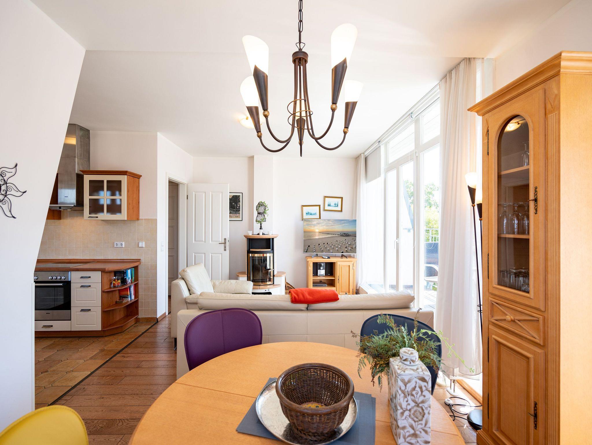 Stilvoll, Exklusiv, Extraklasse! Die Ferienwohnung 6 im Obergeschoß der Villa fasziniert durch warme, harmonierende Farben und Stoffe. Hier überzeugen edle Materialien ? mediterrane Möblierung von Chalet, Echtholzböden und ein Kaminofen im Wohnbereich. Ein Schlafzimmer mit Doppelbett ( Breite 1,80m) und ein weiterer Schlafbereich mit komfortabler Schlafcouch, die man zu einer Doppelliege umfunktionieren kann, bieten 4 Personen Platz für erholsame Nächte. Für Ihren Komfort ist die Erstausstattung Wäsche (Bettwäsche [&] Handtücher) für Sie bezogen. Im Erker mit großem Lesesessel entspannt man beim Blick auf die Ostsee oder Sie genießen die Abendsonne auf Ihrem Südbalkon. Schöner wohnen im Urlaub!