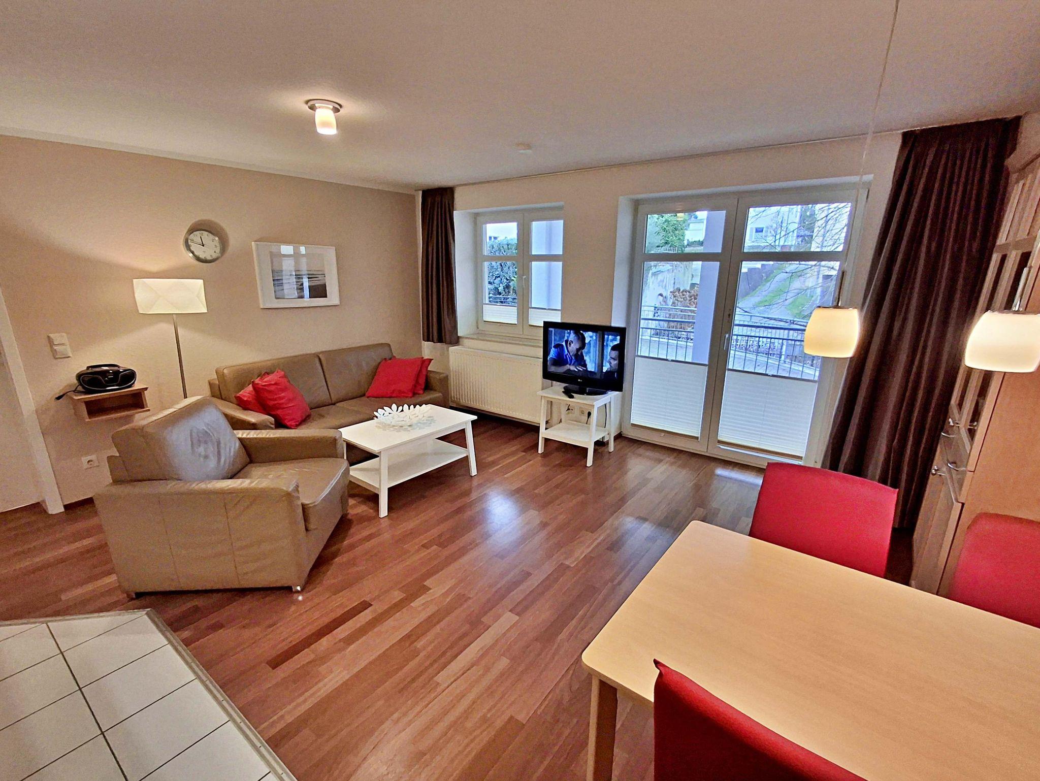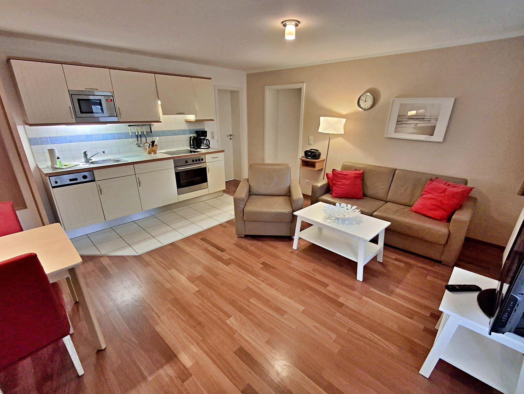 Die gemütliche 2-Zimmer-Wohnung Austernfischer im 1. Obergeschoss mit Balkon für max. 3 Erwachsene und 1 Kind bis 14 Jahre befindet sich im Nebengebäude der stilvoll restaurierten Villa Ahlbeck - nur wenige Schritte von der Promenade und dem Strand entfernt. Im Wohnbereich befinden sich neben der Couch auch ein Sessel sowie ein Esstisch mit 4 Stühlen, der genügend Platz für 4 Personen bietet. Das Highlight der Wohnung ist der Balkon in West-Ausrichtung, welcher vom Wohnbereich aus begehbar ist. Hier können Sie bei schönem Wetter bereits morgens Ihren Kaffee genießen oder den Abend bei einem Glas Wein ausklingen lassen. Die moderne Küchenzeile mit Ceranherd, Backofen, Geschirrspüler, Mikrowelle, Kaffeemaschine, Wasserkocher und Toaster lässt keine Wünsche offen. Für die Unterhaltung sorgen ein Flachbild-TV, Radio-CD-Player und kostenfreies W-LAN. Das Schlafzimmer verfügt über ein Doppelbett und einen hochwertigen Frame-TV. Das Badezimmer hat DU/WC.