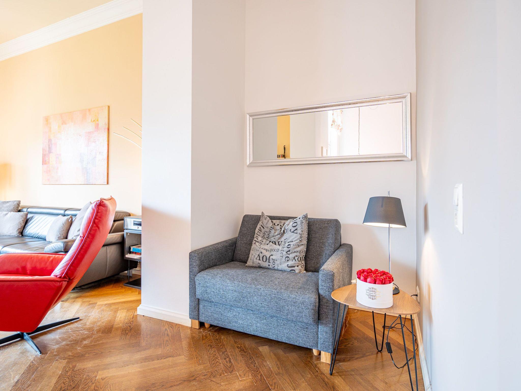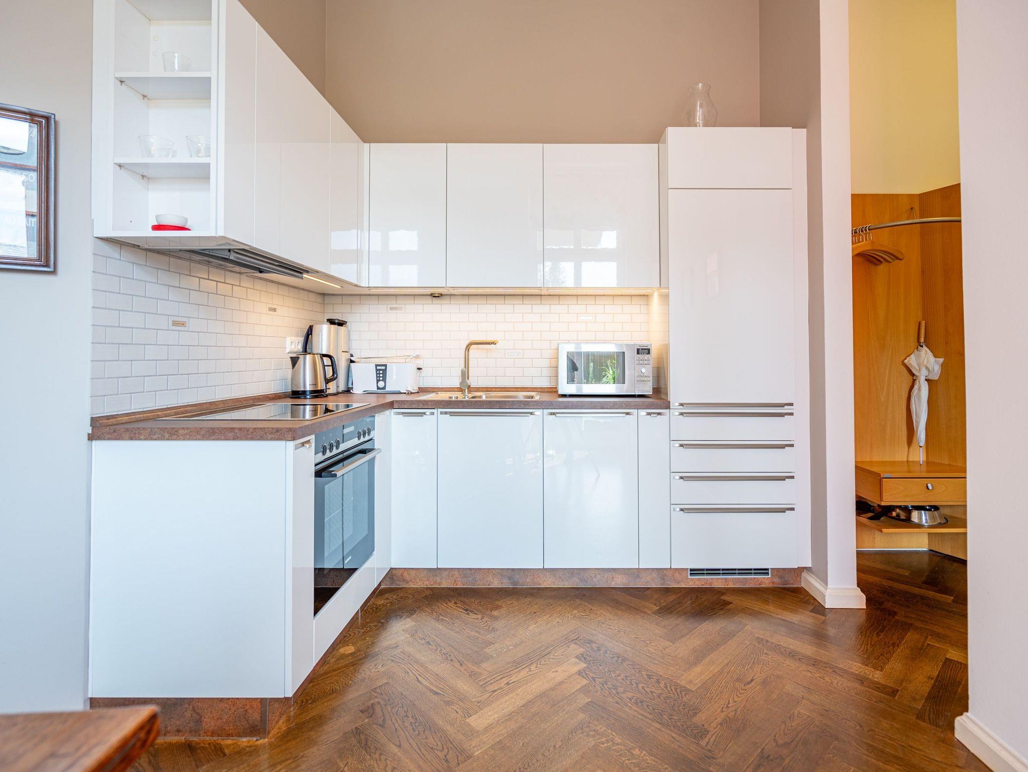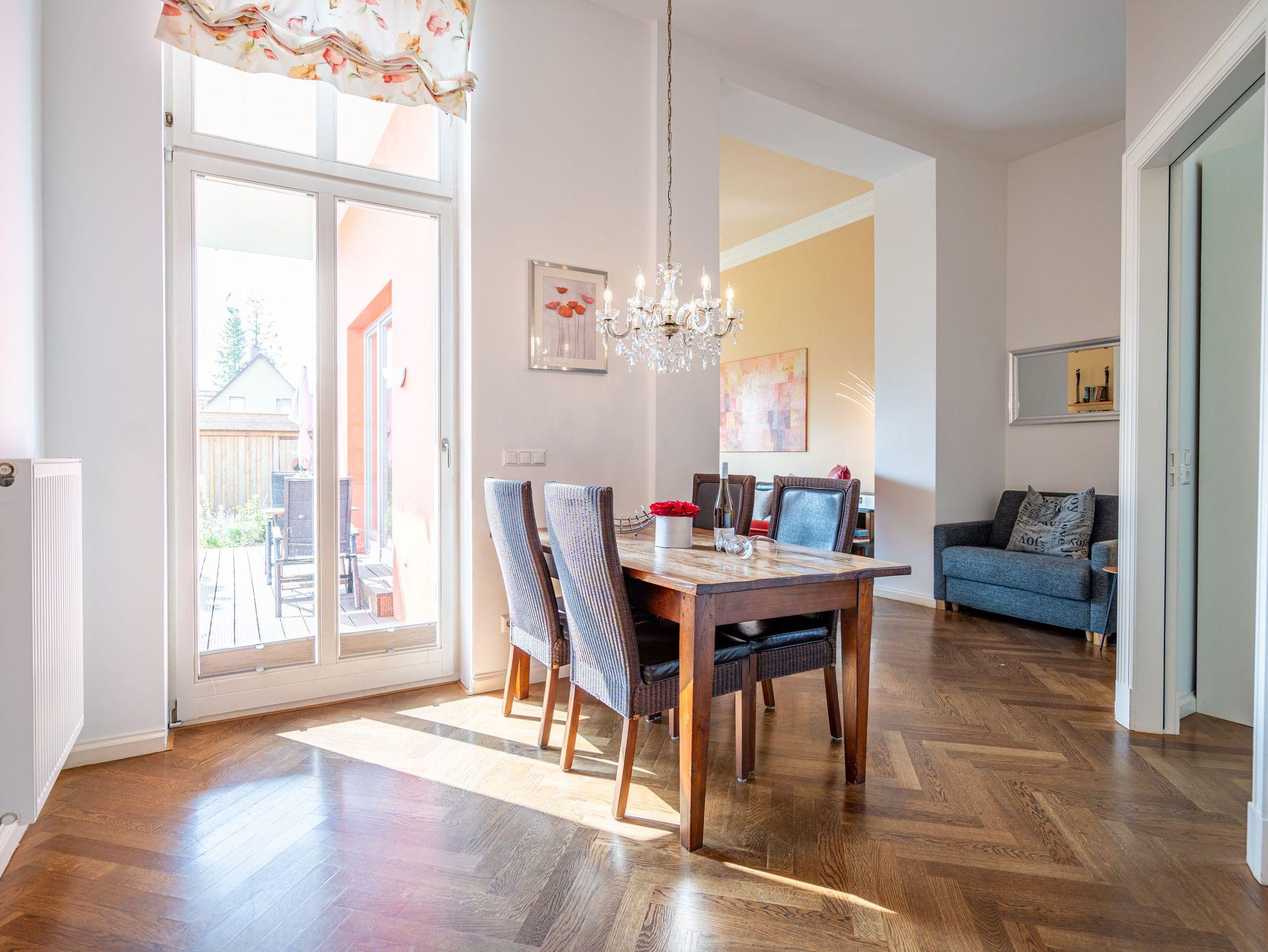 Ihre Ferienwohnung 3 (57qm), im Parterre der Villa, verwöhnt Sie mit moderner Möblierung und farblich gekonnt kombinierten Farben und Stoffen. Helle Räume, ein aufwendig sanierter Parkettboden und die geschmackvollen Dekorationen lassen keine Wünsche offen. Die offene Wohnküche, das Wohnzimmer mit großzügiger Couch, Schlafsessel und das Schlafzimmer mit Doppelbett (1,80m x 2,00m) bieten Platz für 2 bis 3 Personen [&] Kleinkind (bis 2 Jahre). Auf der Terrasse, die zur Südseite ausgerichtet ist, genießen Sie die Nachmittagssonne. Für kleine Gäste stellen wir gern ein Kinderreisebett und einen Hochstuhl zur Verfügung. Für Ihren Komfort sind bei Ihrer Anreise die Betten liebevoll bezogen, auch der erste Satz Handtücher liegt für Sie bereit. Ein Pkw-Stellplatz steht am Haus, unter dem Carport, zur Verfügung.