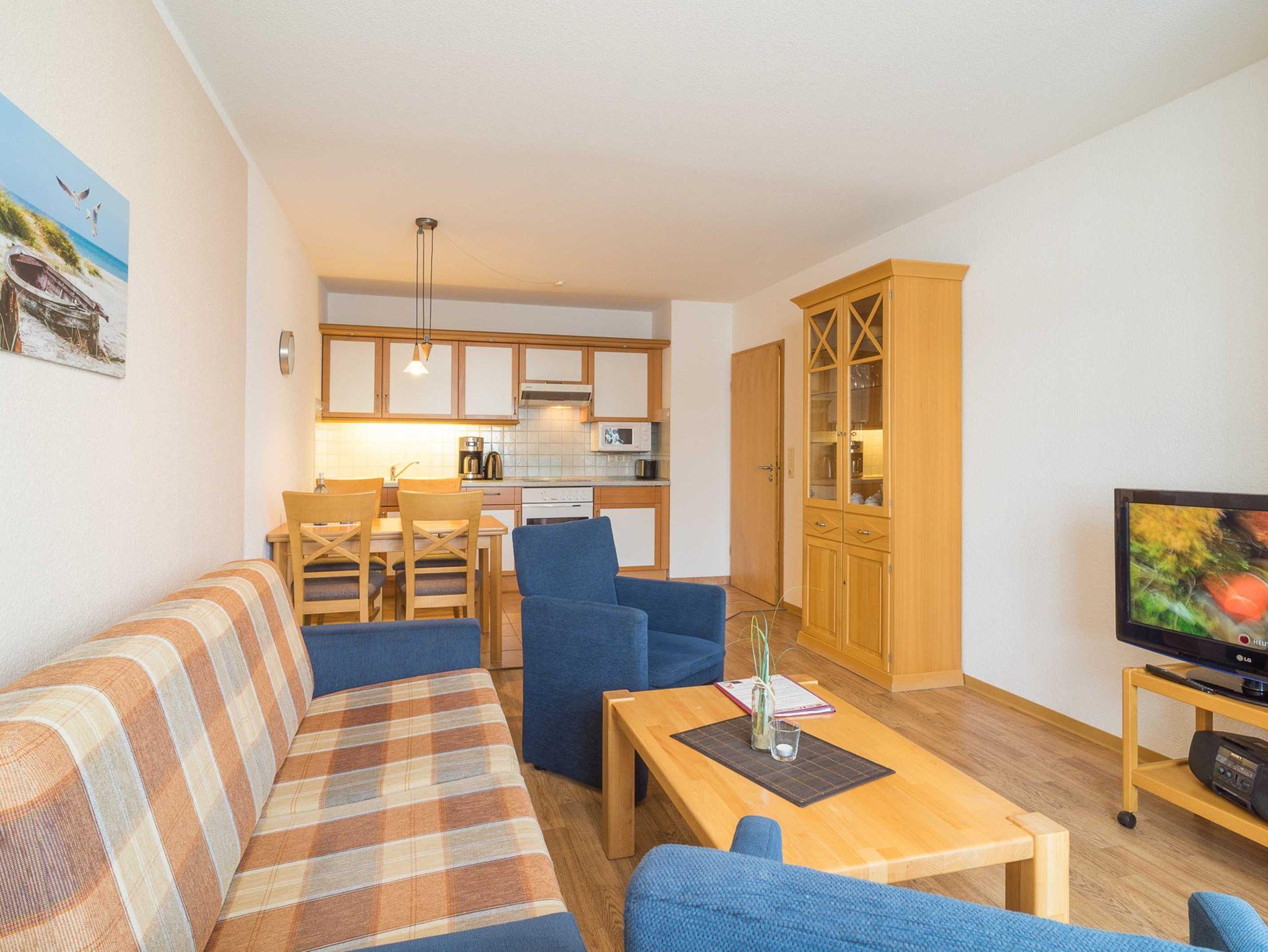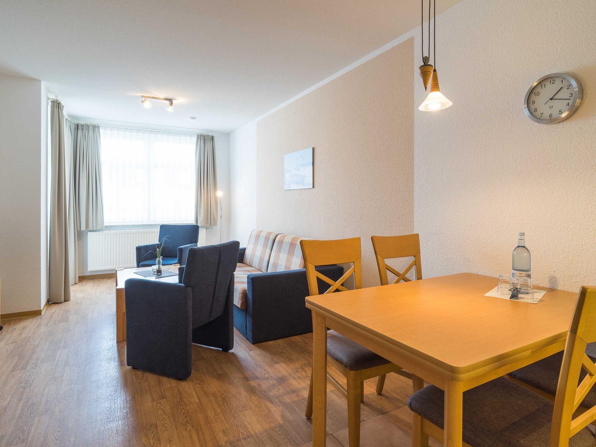 Der helle Wohnbereich ist mit einer gemütlichen Couch (Aufbettungsmöglichkeit für 1 Person), zwei Sesseln sowie einem Esstisch mit 4 Stühlen ausgestattet. Von hier aus gelangen Sie direkt auf den Balkon zur ruhigen Hofseite perfekt für ein Frühstück im Freien oder ein Glas Wein am Abend.