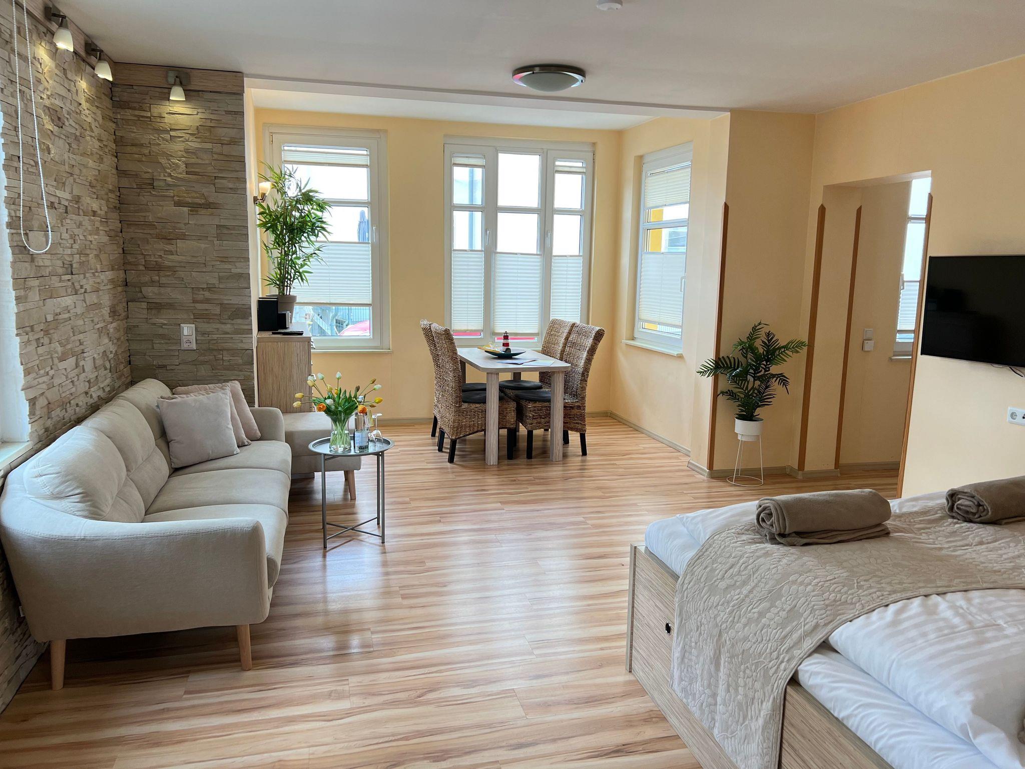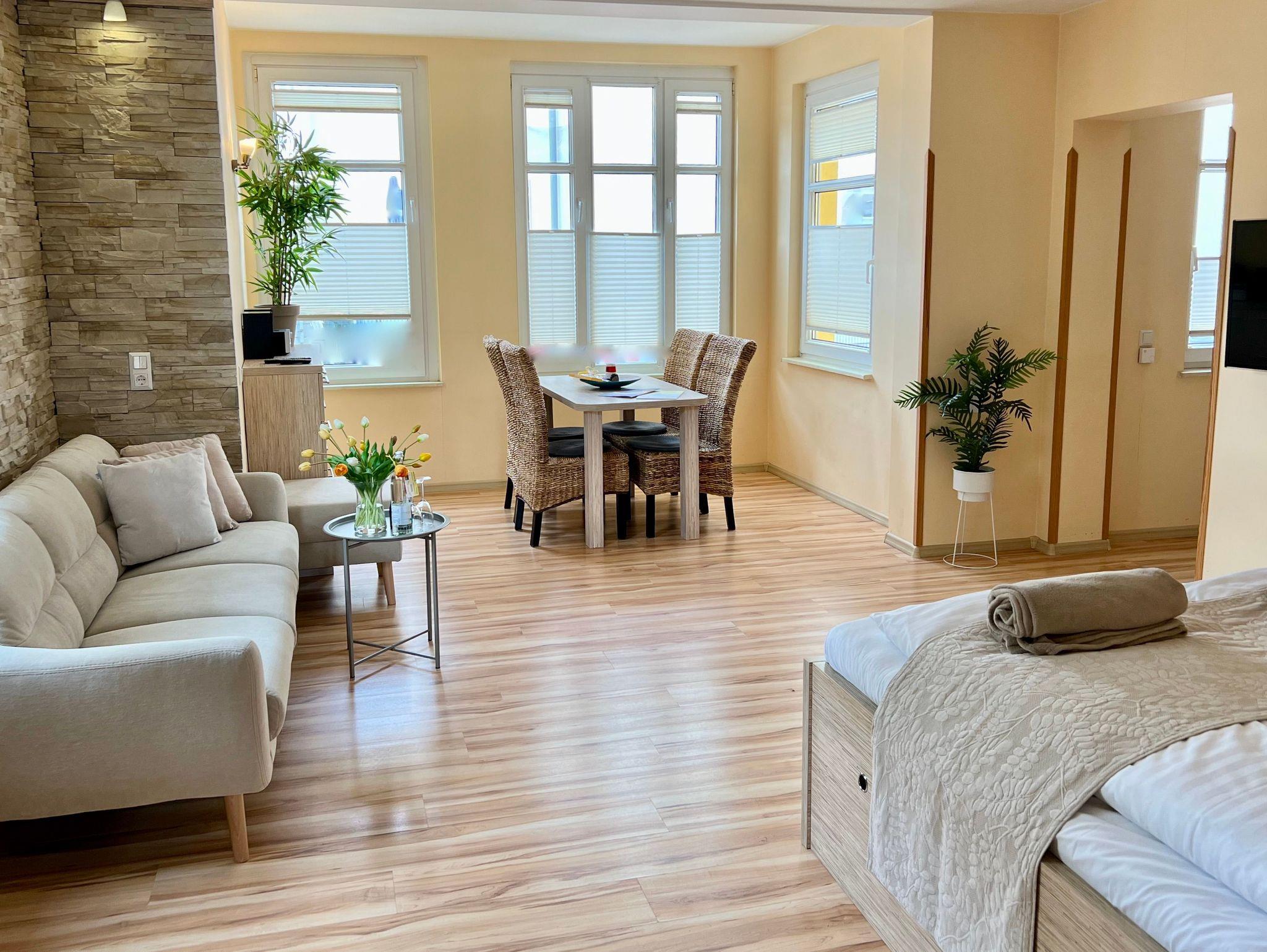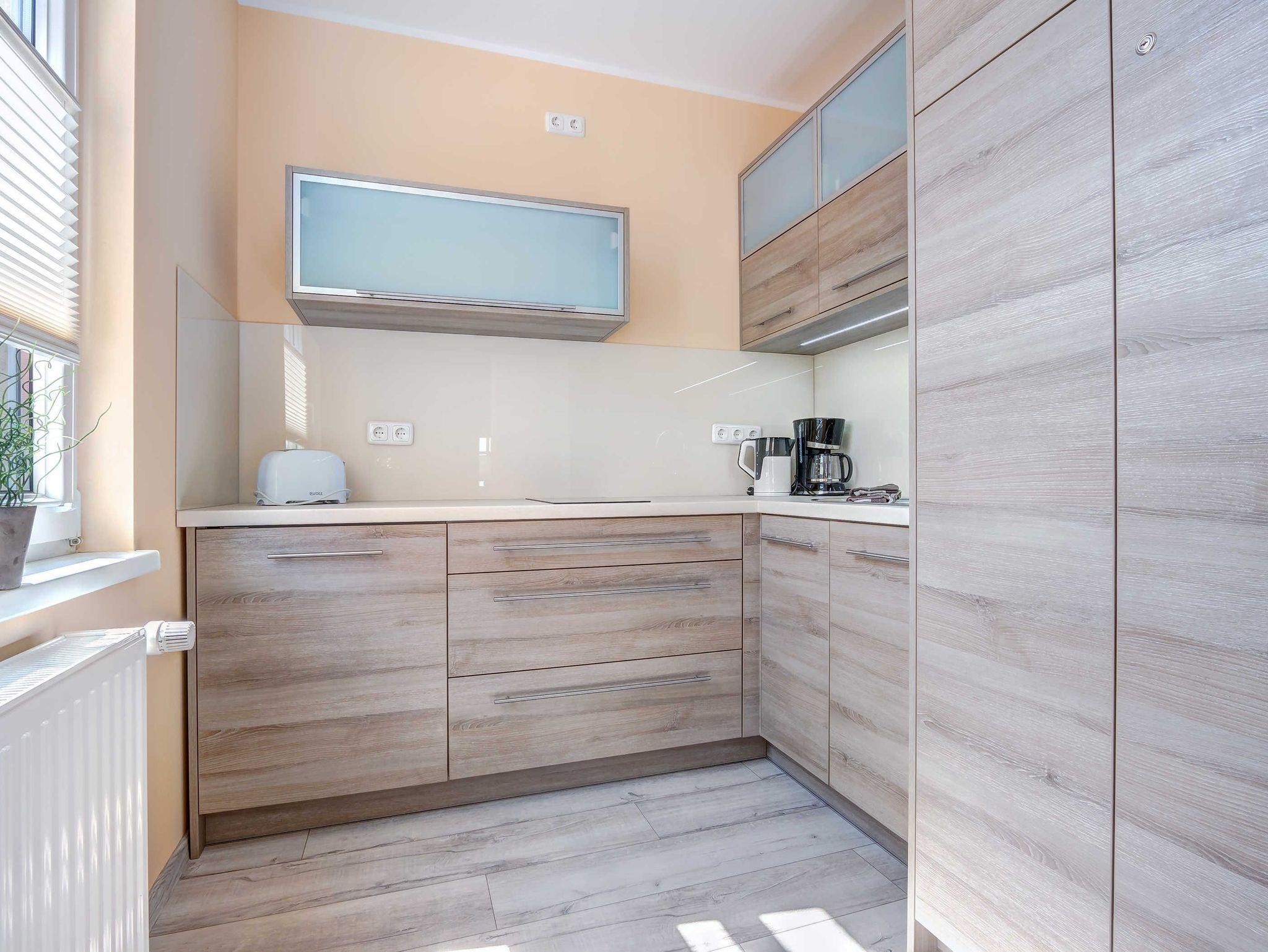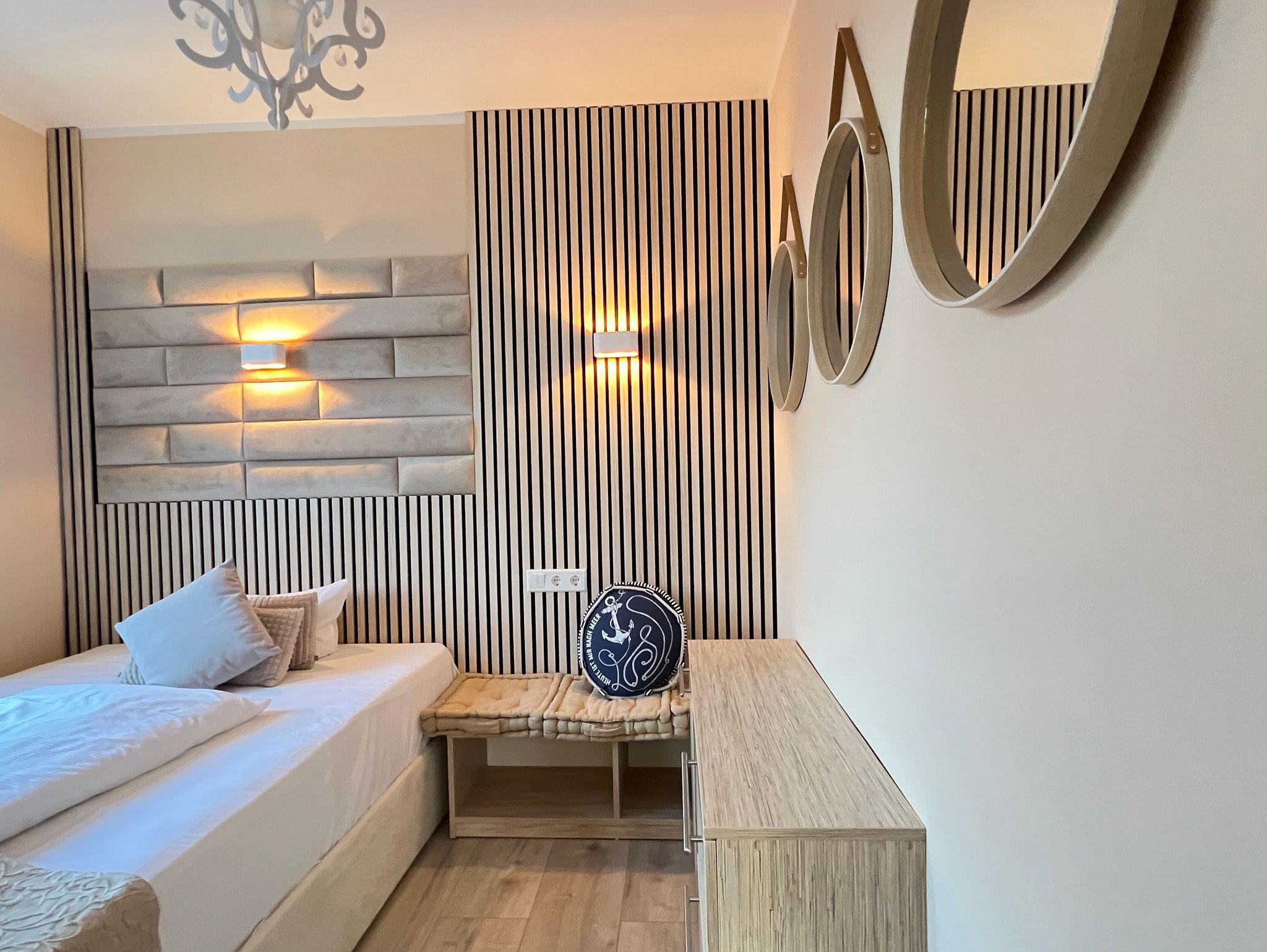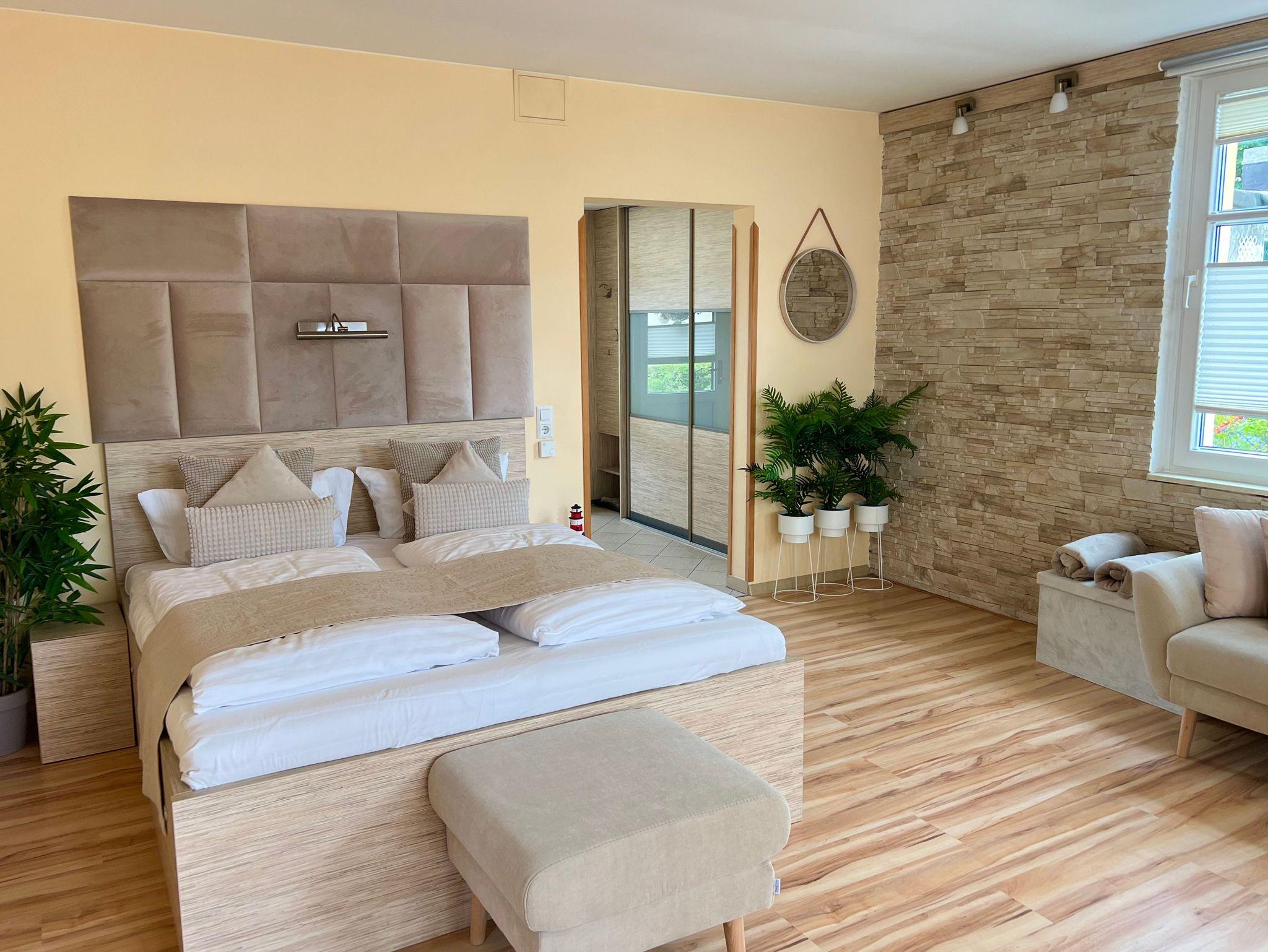 Die nur 80 Meter vom Strand entfernte Erdgeschosswohnung hat einen separaten Eingang. Sie ist besonders familienfreundlich und für Rollstuhlfahrer geeignet durch einen stufenlosen Zugang. Selbst die gesamte Ferienwohnung ist barrierefrei. Allergiker fühlen sich so wohl wie unsere Nichtraucher. In den Schlafzimmern befinden sich zwei extrahohe, bequeme Betten (160cm und 140cm). Selbstverständlich erwartet Sie eine komfortable Vollausstattung. Ansprechende Laminat- und Steinfliesenböden sorgen für Behaglichkeit und eine warme, heimische Atmosphäre. Die gesamte Ferienwohnung wird von einer Fußbodenheizung erwärmt. Ihnen steht ein LED-Fernseher, freier Internetzugang sowie eine moderne, grundausgestattete Einbauküche zur Verfügung. Ein Parkplatz direkt vor Ihrem Feriendomizil sorgt für kürzeste Wege. Weiße, kräftige Baumwollbettwäsche und weiche Handtücher werden Ihnen schmeicheln. Geschirrtücher sowie Duschvorleger sind ebenfalls vorhanden. Hochstühle und Kinderreisebetten können nach Rücksprache zur kostenlosen Nutzung bereitgestellt werden. Toilettenhalterung und behindertengerechte Duschhocker sind für unsere bedürftigen Gäste ebenfalls auf Anfrage inklusive. Jungen Familien und gehandicapten Personen werden sämtliche, barrierefreien Zugänge zum Strand, zur Seebrücke und der Ortschaft Ahlbeck sehr entgegenkommen.