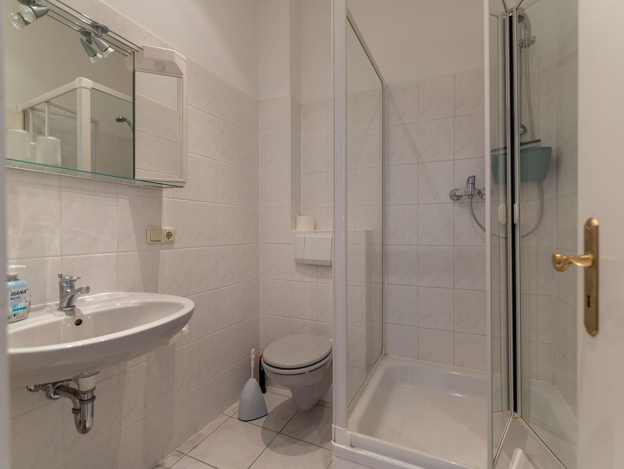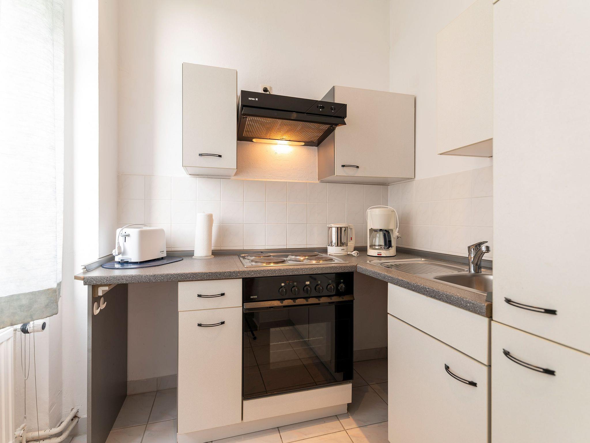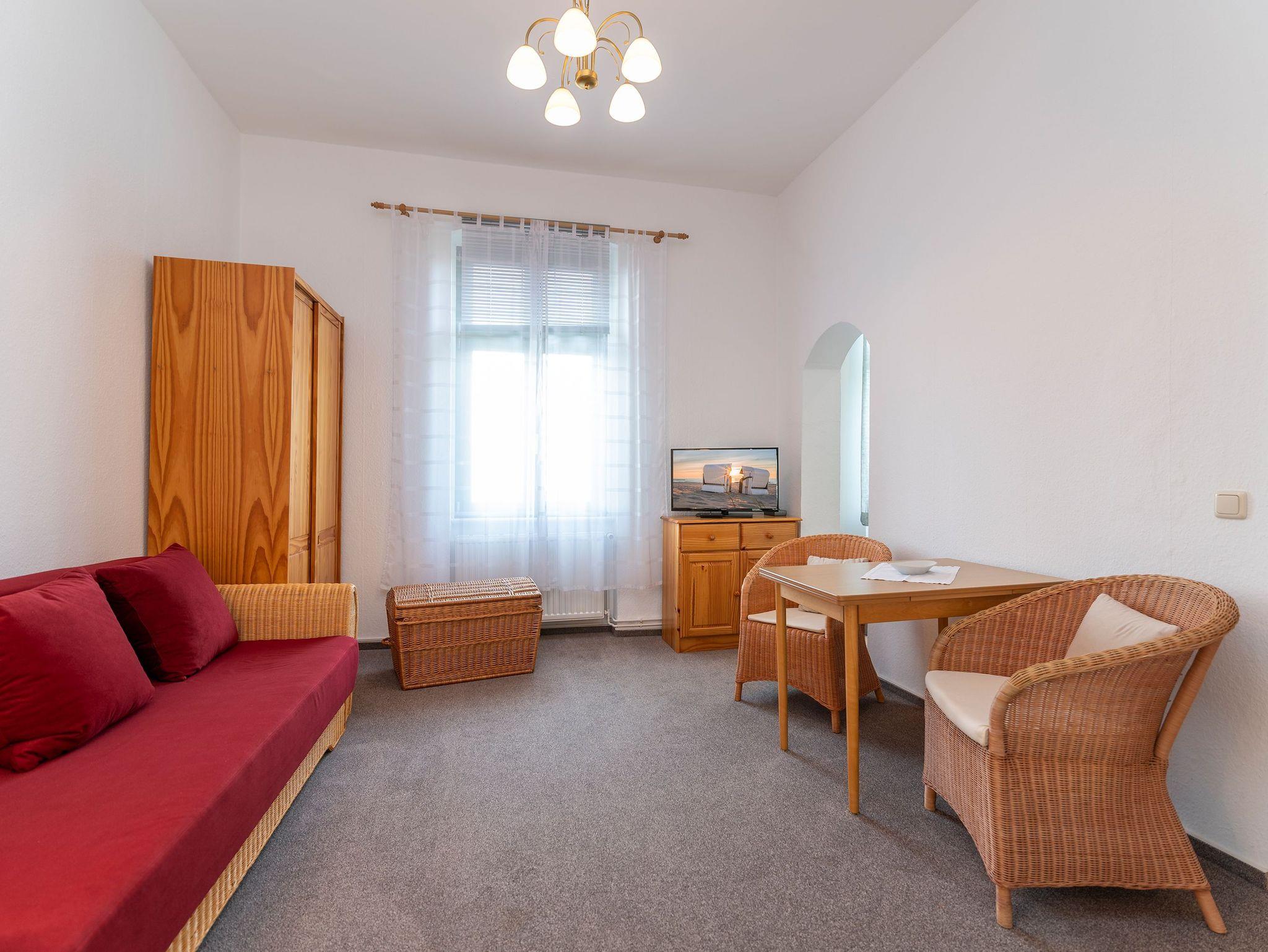 Dieses 1-Zimmer-Appartement liegt im Erdgeschoss der Villa Krause und hat einen Wohn-Schlafraum mit Schlafsofa, eine kleine Küche und ein Badezimmer.