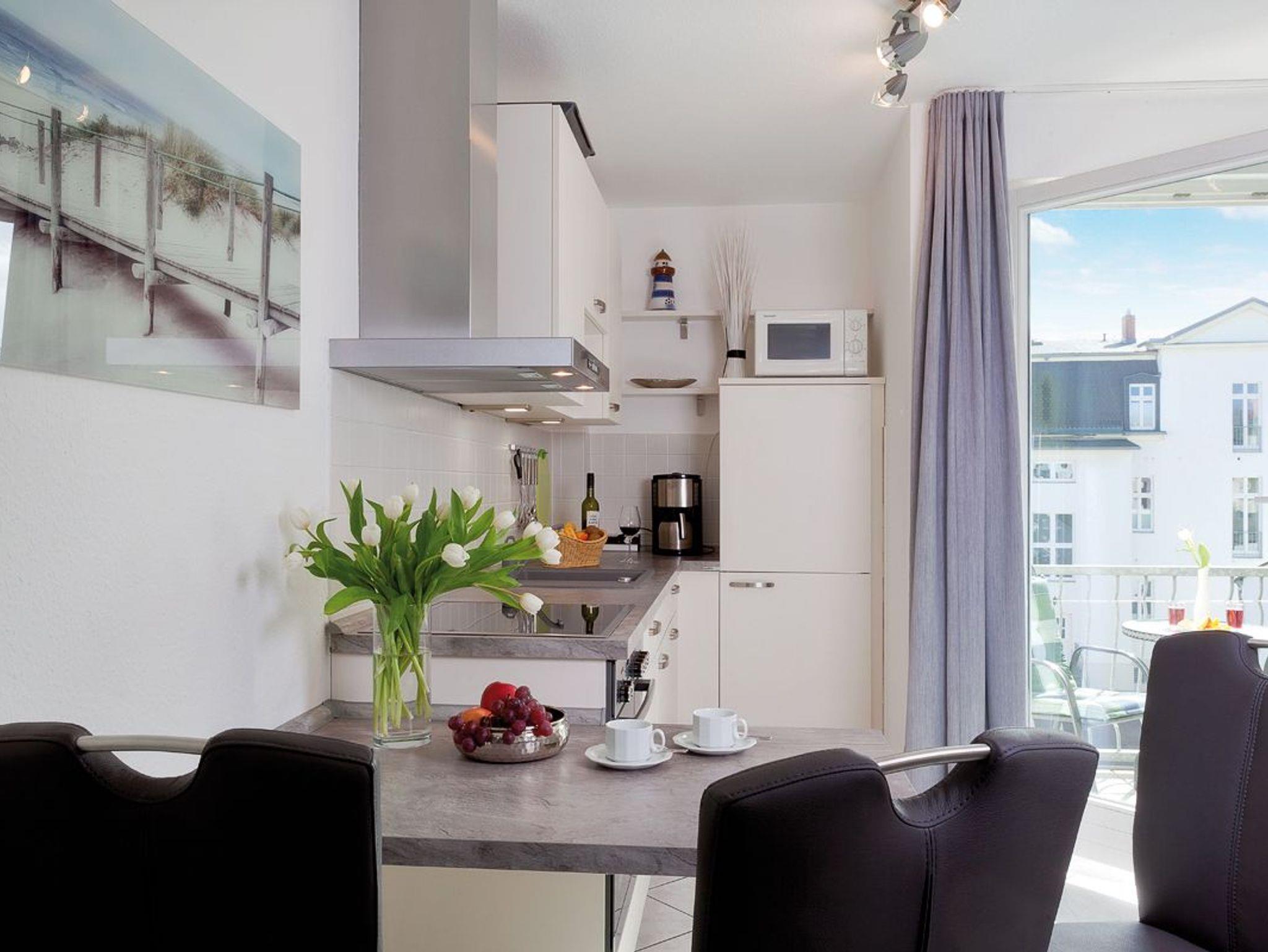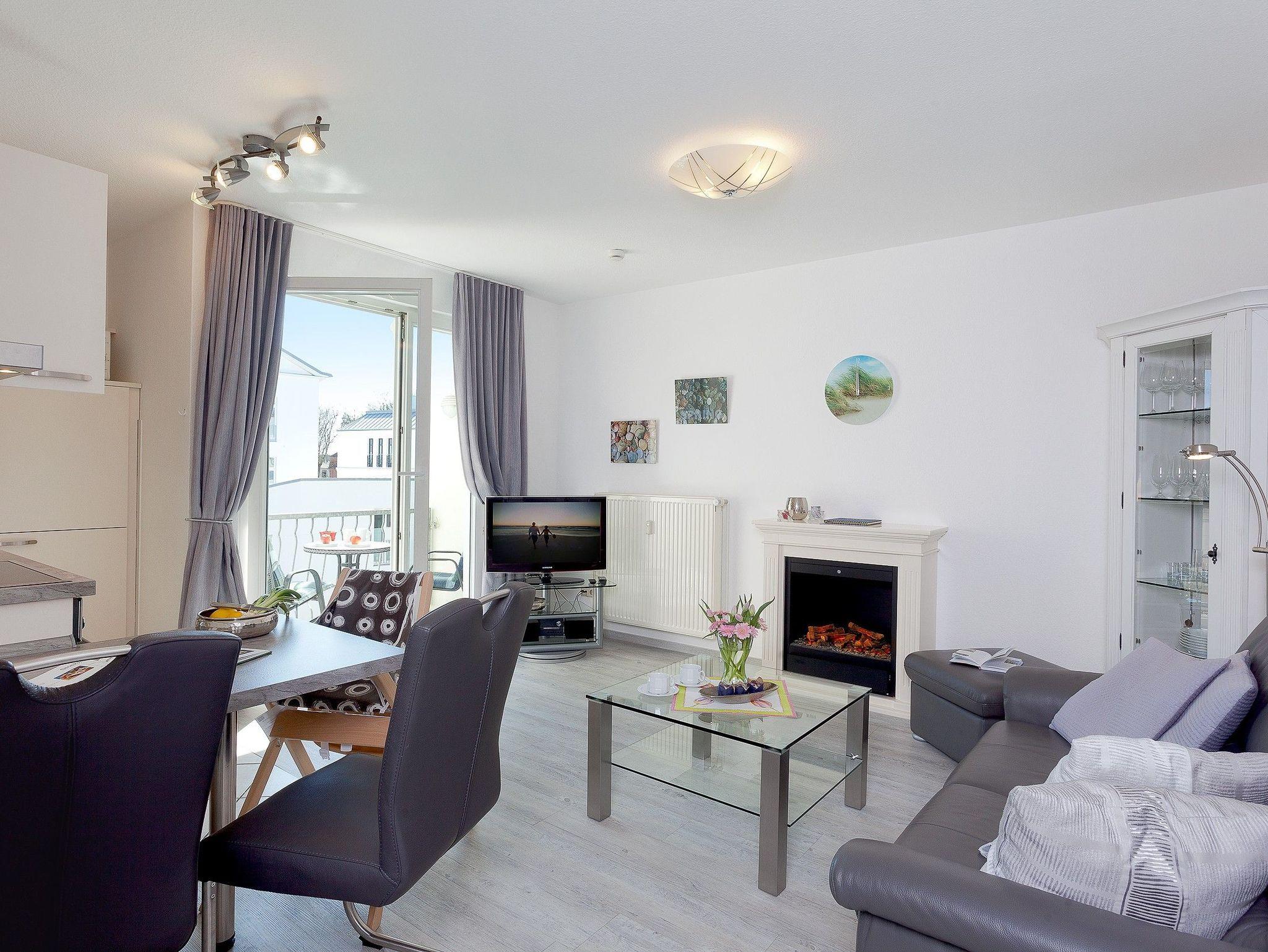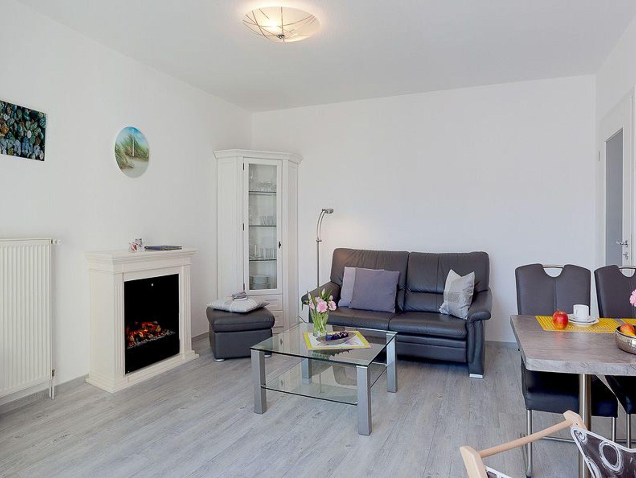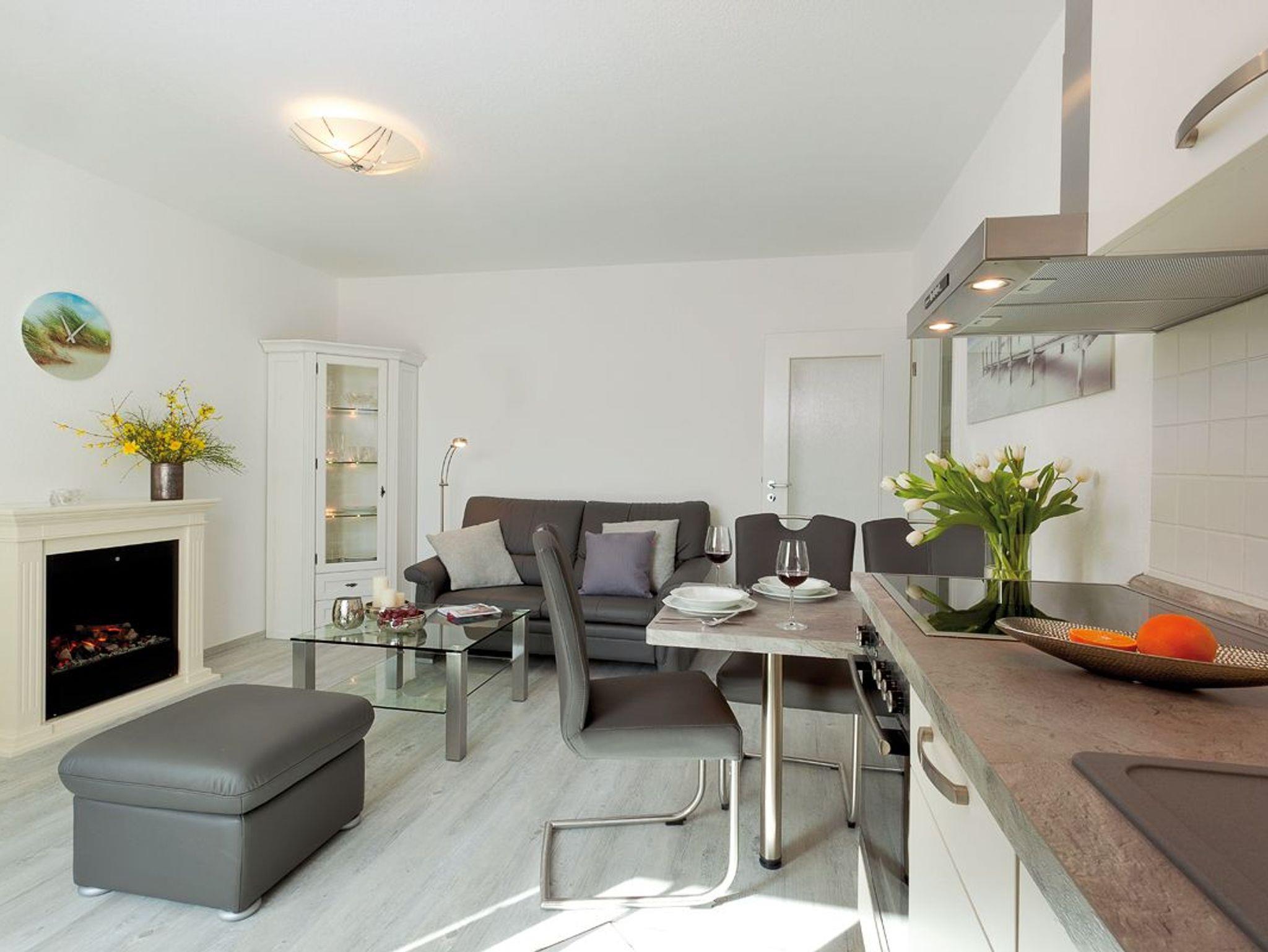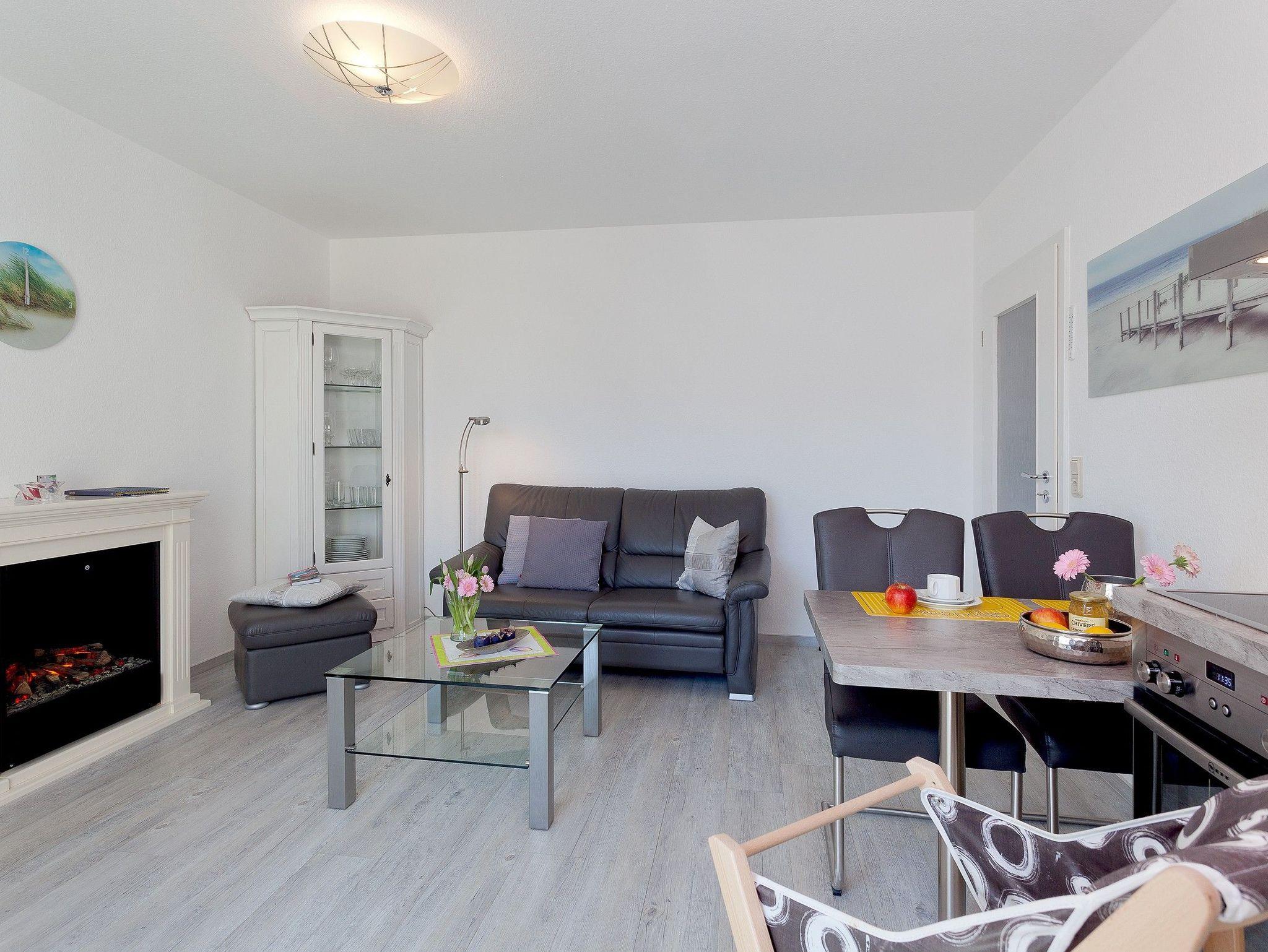 Herzlich Willkommen im Appartement 24 des Haus Miramar, es befindet sich in der 2. Etage und bietet auf 43 qm ausreichend Platz für 2 Personen sowie ein Kleinkind im Kinderreisebett. Der offene Wohnbereich ist modern und komfortabel eingerichtet, mit einer voll ausgestatteten Küchenzeile, einem Essplatz für 3 Personen und einer gemütlichen Ledercouch, die zum Verweilen einlädt. Für wohlige Abende sorgt ein Elektrokamin mit Fernbedienung, und für Unterhaltung steht ein Flat-TV bereit. Vom Wohnbereich aus gelangt man auf den angrenzenden Süd-Ost-Balkon, der mit einem Tisch und zwei Stühlen ausgestattet ist und zum Entspannen im Freien einlädt. Das separate Schlafzimmer verfügt über ein großes Doppelbett (1,80m x 2,00m, getrennte Matratzen), einen geräumigen Kleiderschrank sowie einen weiteren Flat-TV. Hier besteht zudem die Möglichkeit, ein Babyreisebett aufzustellen. Das moderne Badezimmer ist mit einer flachen Echtglas-Dusche, einem Waschtisch, WC und einem Handtuchtrockner ausgestattet. WLAN steht den Gästen kostenfrei zur Verfügung. Ein eigener PKW-Stellplatz (Nr. 24) befindet sich direkt am Haus. Fahrräder können im gemeinschaftlichen Fahrradabstellraum sicher untergebracht werden.