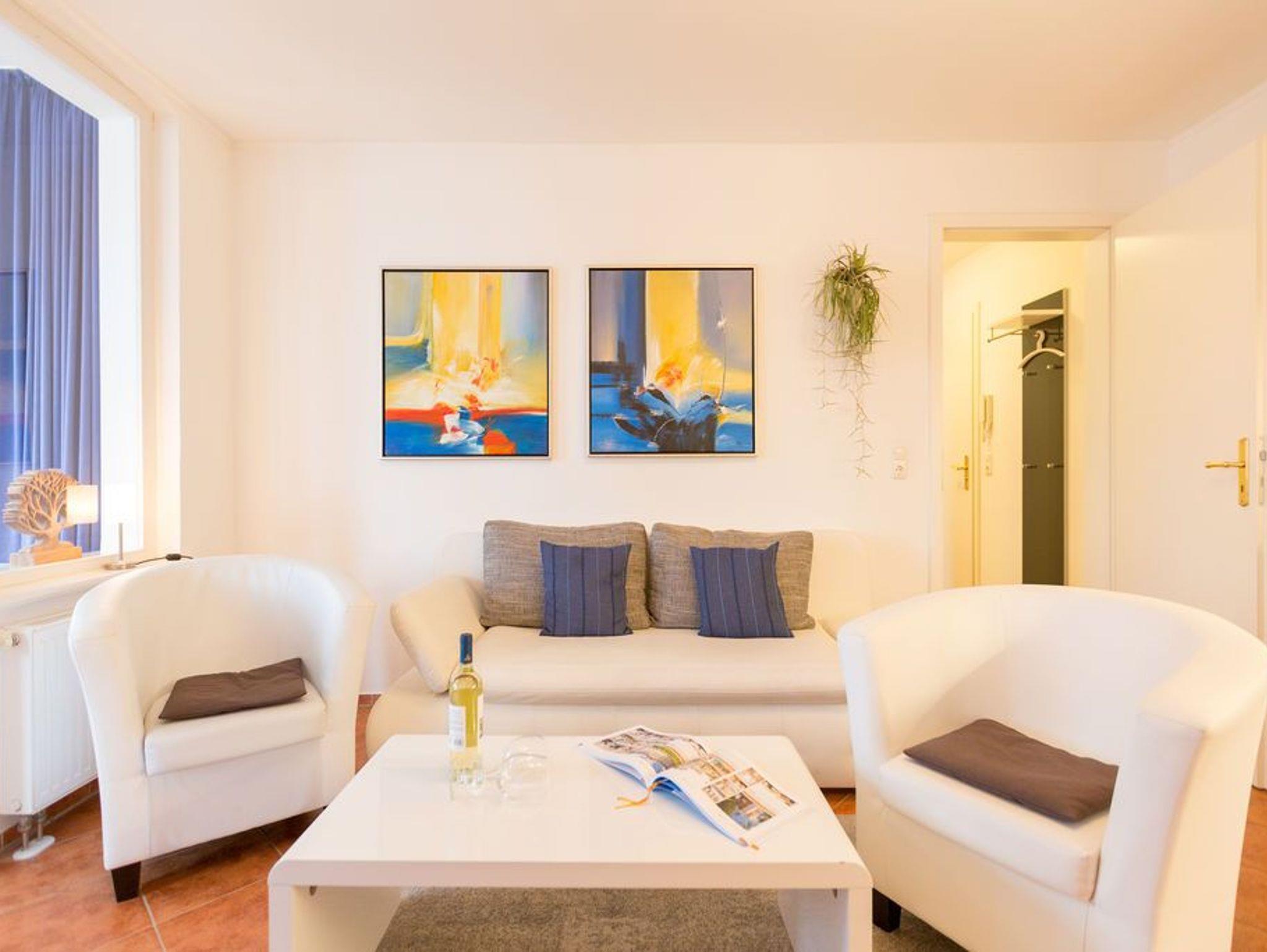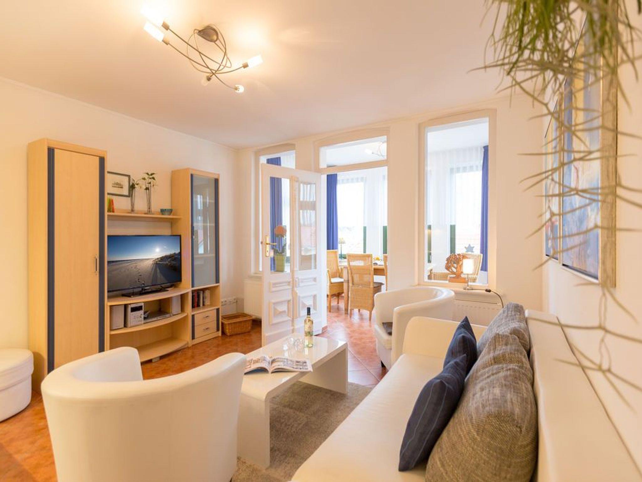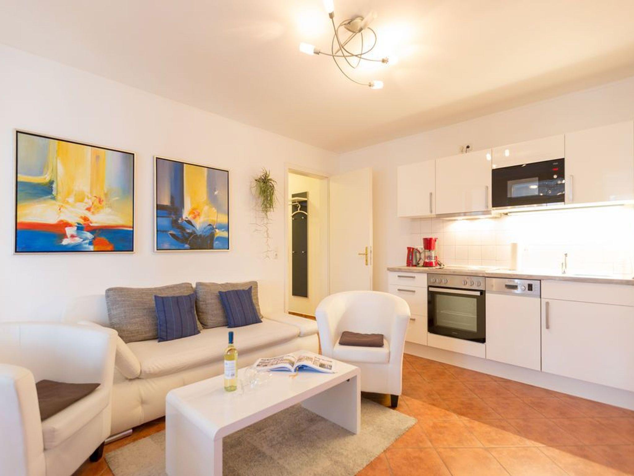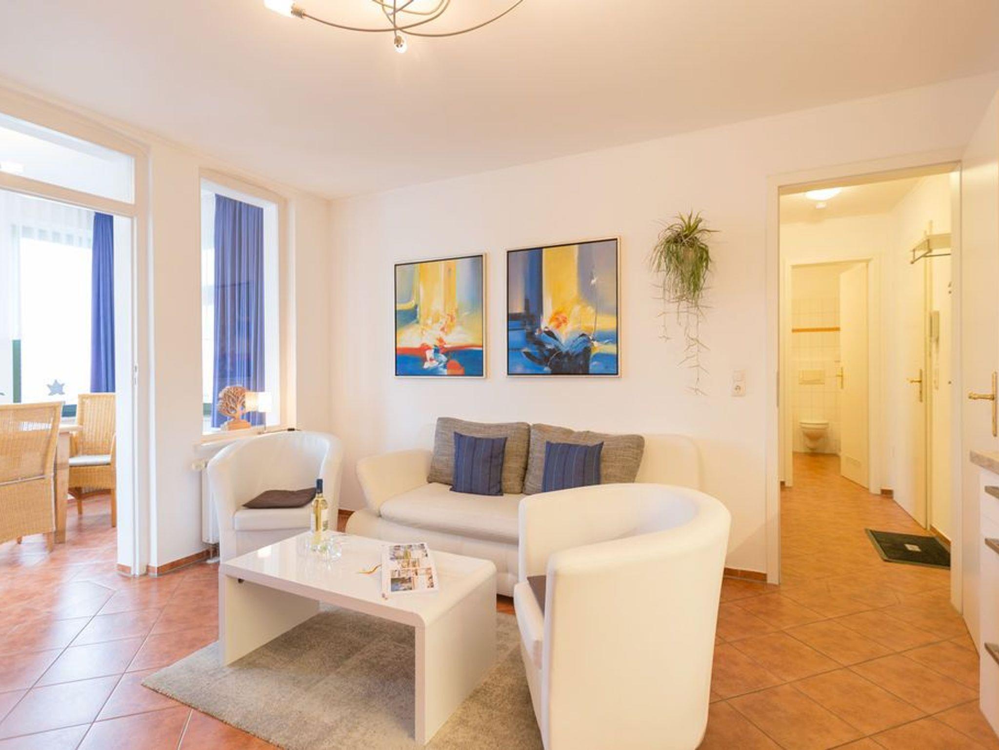 Diese wunderschöne 2-Raum-Ferienwohnung im Obergeschoss der Villa Goodewind präsentiert sich Ihnen modern und zeitlos eingerichtet. Durch seine Lage im 2. Obergeschoß der Villa bietet es Ruhe- und Erholungssuchenden ein ideales Urlaubsdomizil. Komfortabel ausgestattet, verfügt das Appartement über ein Wohnzimmer mit Küchenzeile, ein Schlafzimmer mit Doppelbett, ein Duschbad und eine verglaste Veranda mit seitlichem Meerblick. Auf Wunsch stellen wir für unsere kleinen Gäste ein Kinderreisebett (ohne zusätzliche Matratze [&] Bettzeug) und einen Kinderhochstuhl ( gegen einen Aufpreis) zur Verfügung. Für Ihren Komfort sind die Betten bei der Anreise bezogen und Handtücher liegen bereit (Erstausstattung). Das WLAN-Netz im Haus kann kostenfrei genutzt werden.