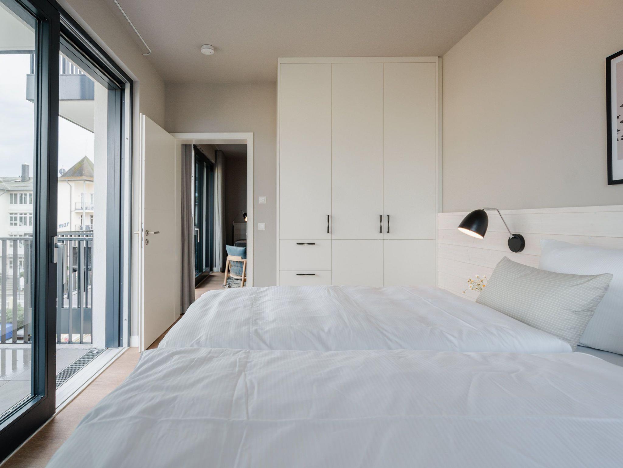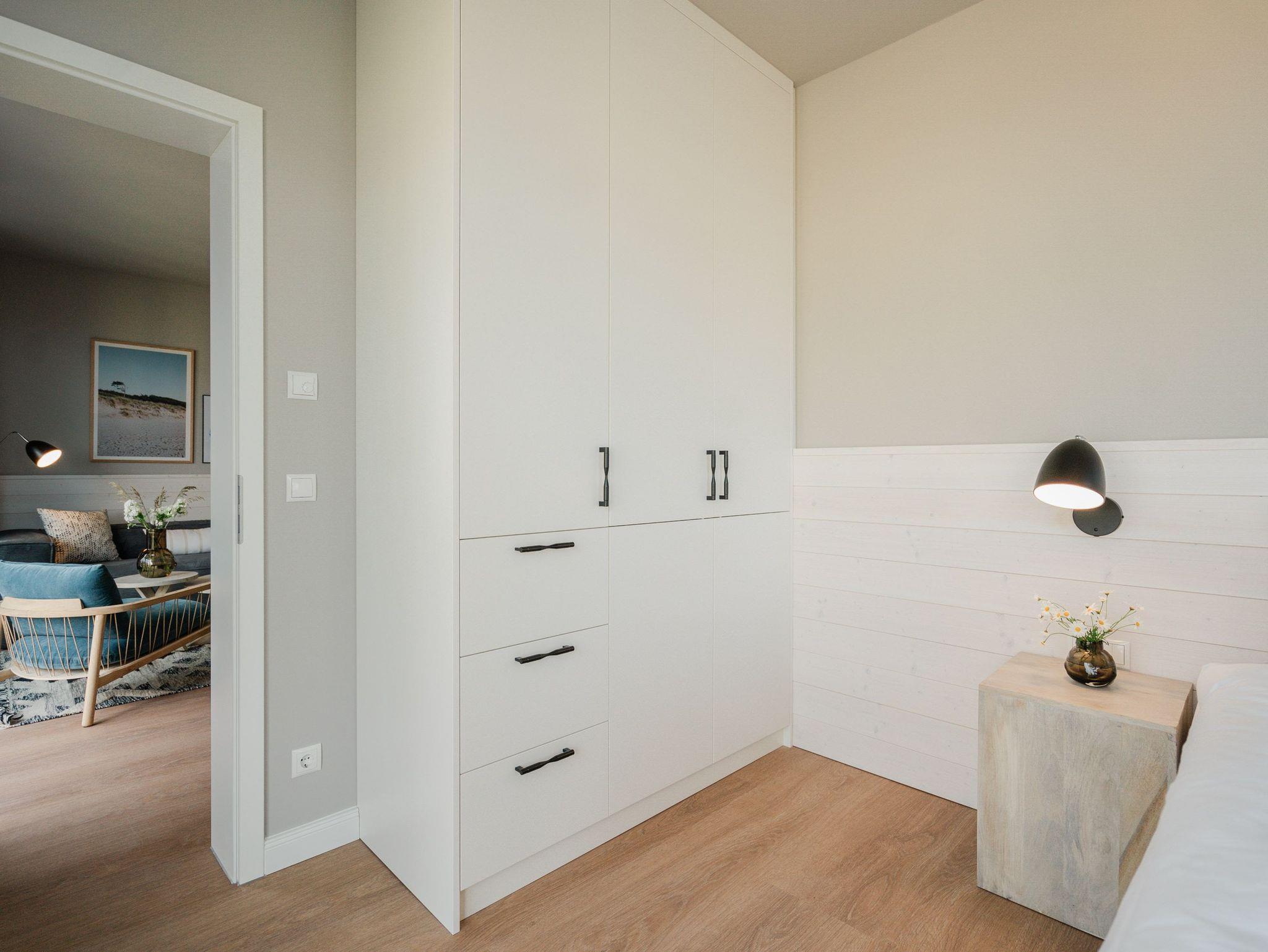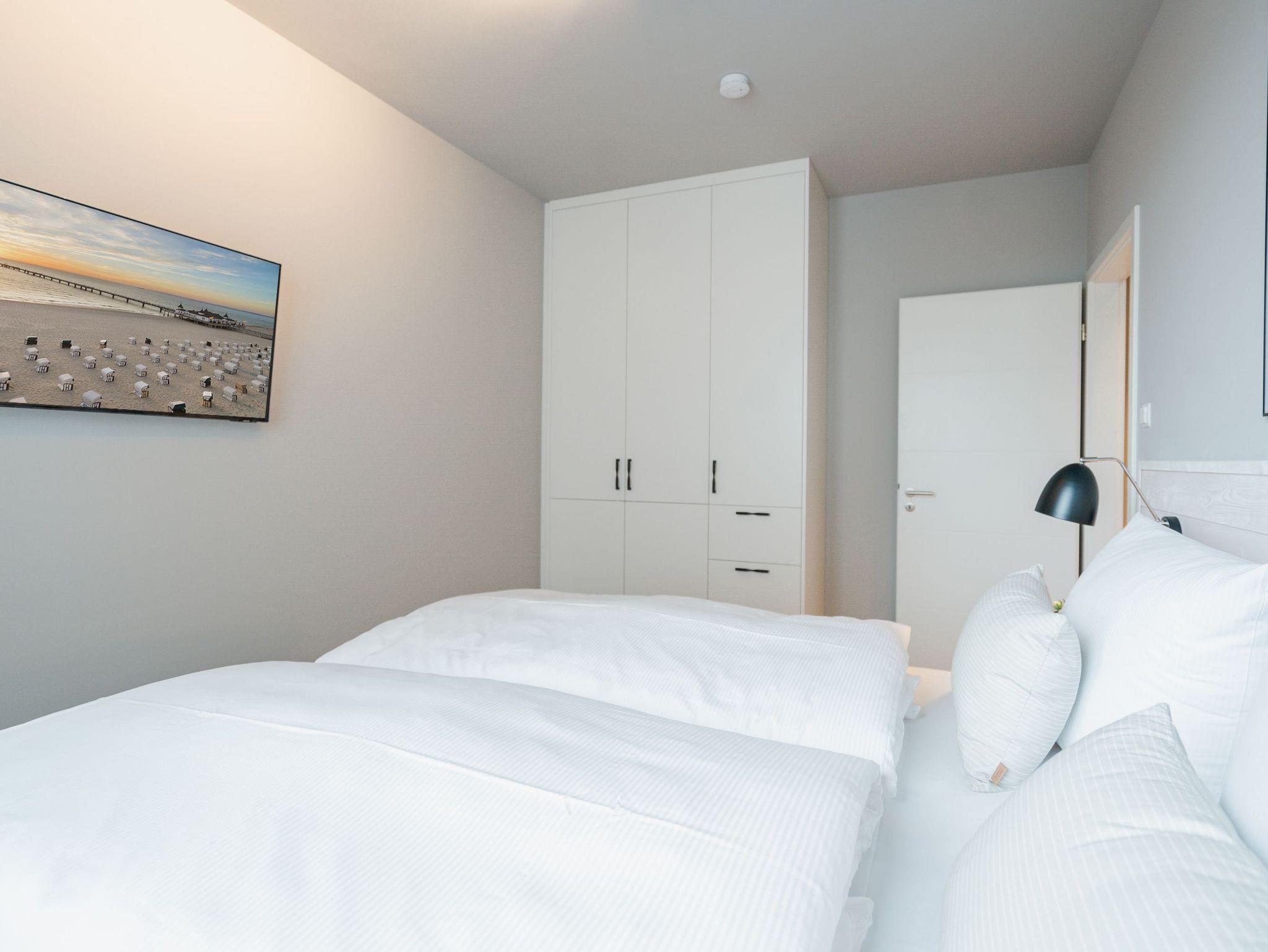 Drei Räume zum Verlieben bietet das Appartement B 2.2 in der 2. Etage der Strandterrasse. Helle, große Zimmer lassen viel Licht in dieses Auszeitparadies für bis zu 4 Personen. Die 76 Quadratmeter sind ein gemütliches und schickes Domizil, um gemeinsam mit der Familie oder mit Freunden eine unvergesslich schöne Zeit am Meer zu verbringen. Nordisches Design erwartet Sie im Wohn-Esszimmer und in den beiden Schlafzimmern. Dazu ist die Wohnung mit allen Annehmlichkeiten ausgestattet, die man für entspannte Tage brauchen kann. Die offene Küche verfügt über modernste Elektrogeräte wie einem Backofen , einen 4-Platten-Induktionsherd und eine Nespresso-Kapselmaschine. Ein gemütliches Wohnzimmer mit bequemem Sofa, Sessel und einem schönen, großen Esstisch sorgt für das ersehnte Urlaubsgefühl. Genießen Sie die Stunden vor dem Elektrokamin (ohne Wärmeabgabe) oder auf dem Balkon, der einen herrlichen, seitlichen Ausblick auf die Ostsee und auf die Seebrücke Ahlbeck gewährt. Was will man mehr. Ein Gartentisch mit Stühlen erlaubt sogar das Essen unter freiem Himmel. Die Süd-Ost-Ausrichtung ist perfekt für sonnige Frühstücke. Ein großer Flat-TV (50 Zoll) sorgt im Wohnzimmer für spannende Heimkinoabende. Zwei Schlafzimmer gibt es in dieser tollen Wohnung. Das erste Schlafzimmer verfügt über ein komfortables Boxspringdoppelbett (1,80m x 2,00m), einen Kleiderschrank, einen Flat-TV (43 Zoll) und den Zugang zu einem zweiten Balkon mit Gartenliege. Von hier aus können Sie auf die belebte Promenade von Ahlbeck und die dahinter liegende Ostsee schauen. Nur 80 Meter ist sie von Ihrem Domizil entfernt. Das zweite Schlafzimmer bietet ebenfalls ein Boxspringdoppelbett und einen Kleiderschrank sowie einen Flat-TV (32 Zoll). Die beiden Bäder sind mit Dusche, Waschtisch und WC ausgestattet. Sie lieben kuschelige Wärme? Dann entspannen Sie doch in der Infrarotsaunakabine, die in eines der beiden Bäder eingebaut ist. Alles ist da, damit Sie sich rundum wohlfühlen können. Sie brauchen also nur noch ankommen, Ihr Auto in der Tiefgarage auf Ihrem PKW-Stellplatz parken und schon kann die wundervolle Ostseeauszeit beginnen.
