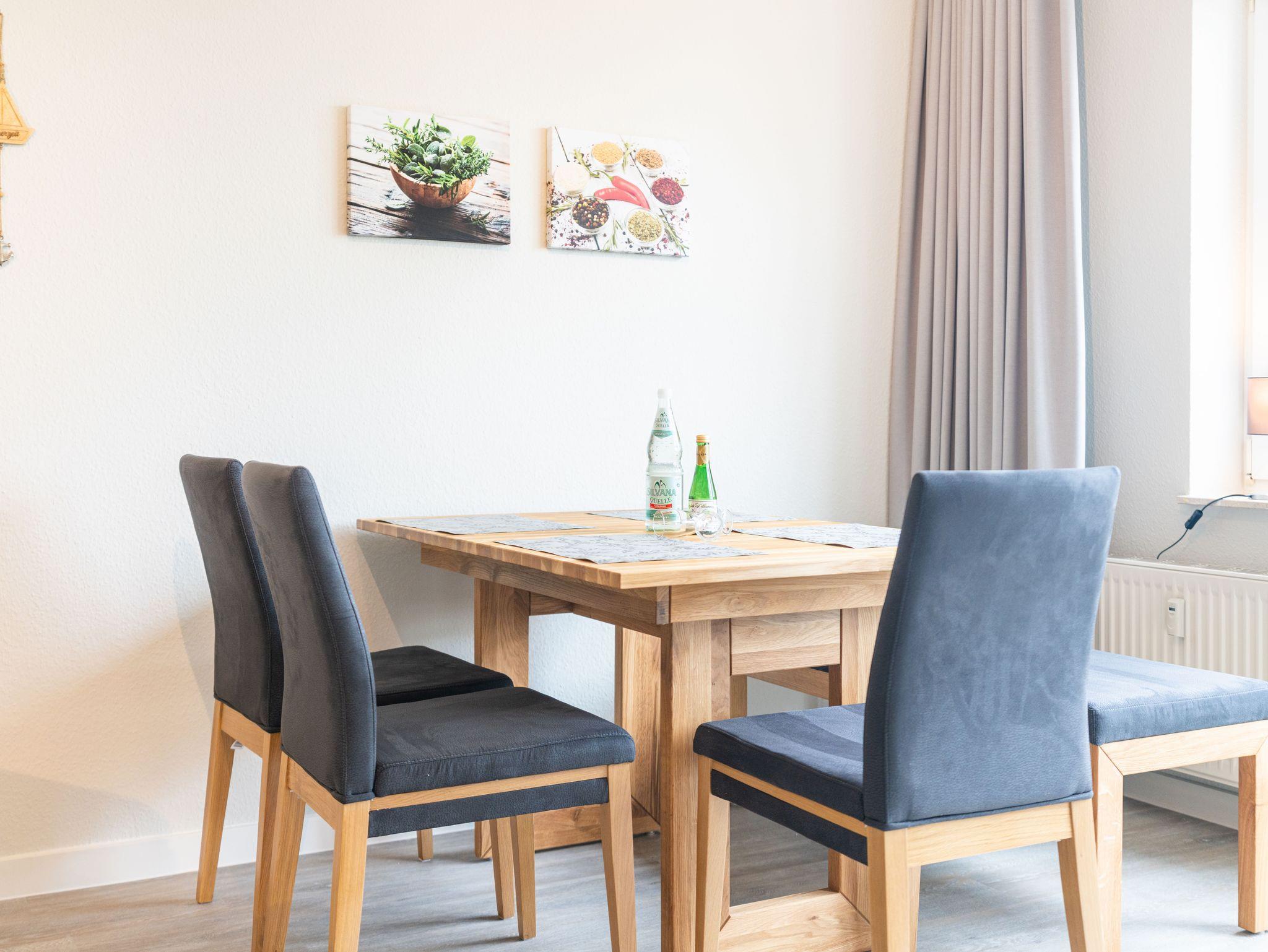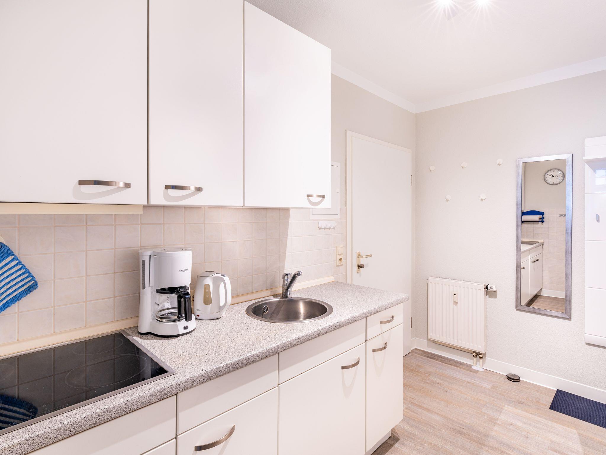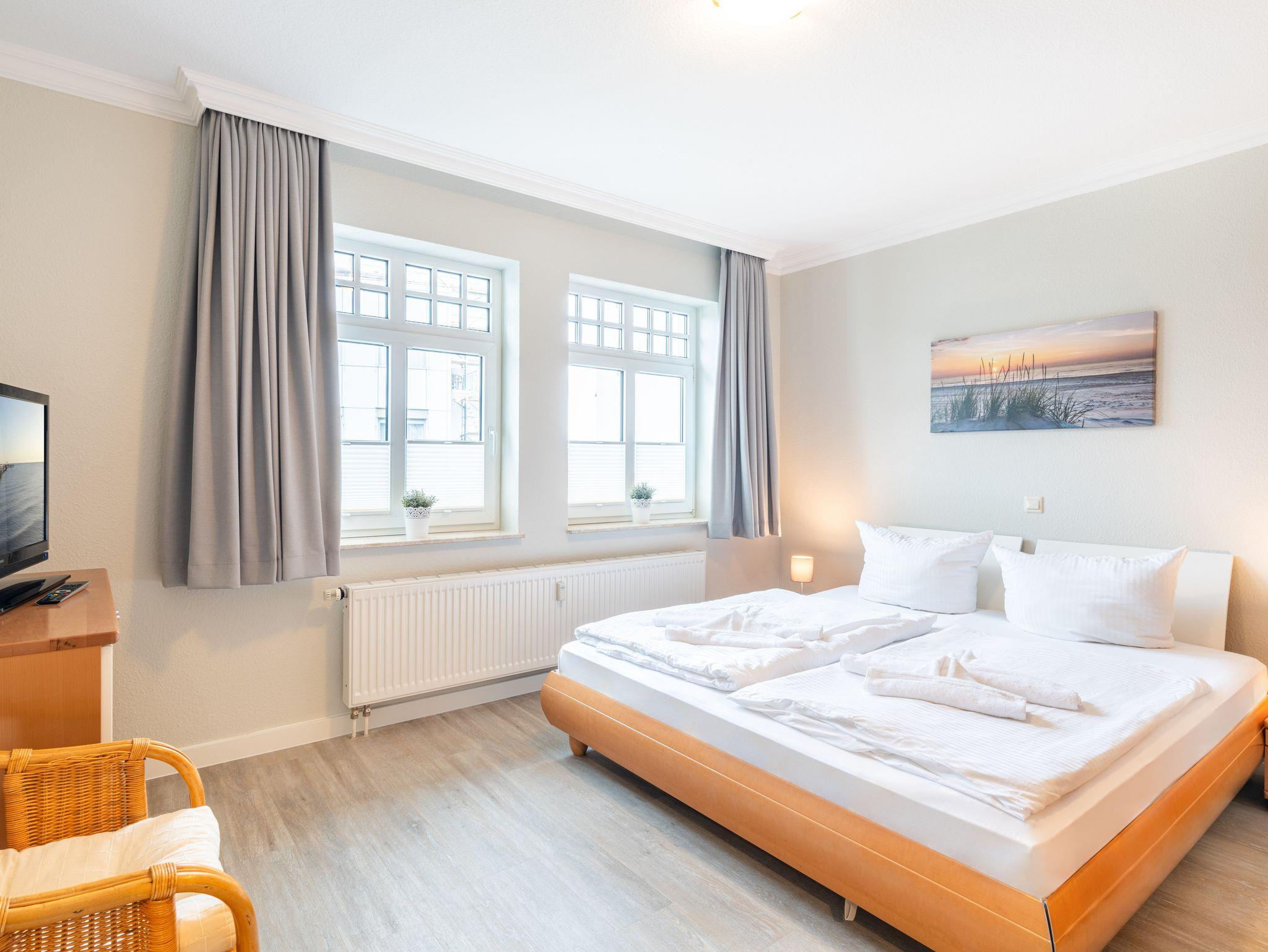 Die 46 qm große Wohnung befindet sich im ersten Obergeschoss und ist für drei Personen ausgestattet. Die Wohnung verfügt über ein separates Schlafzimmer mit Doppelbett und Sitzgelegenheit, ein geräumiges Wohnzimmer mit Schlafcouch und einem Essplatz. Die kleine Küchenzeile ist mit Kühlschrank, Herd u.v.m. ausgestattet. Bad mit Dusche und WC.