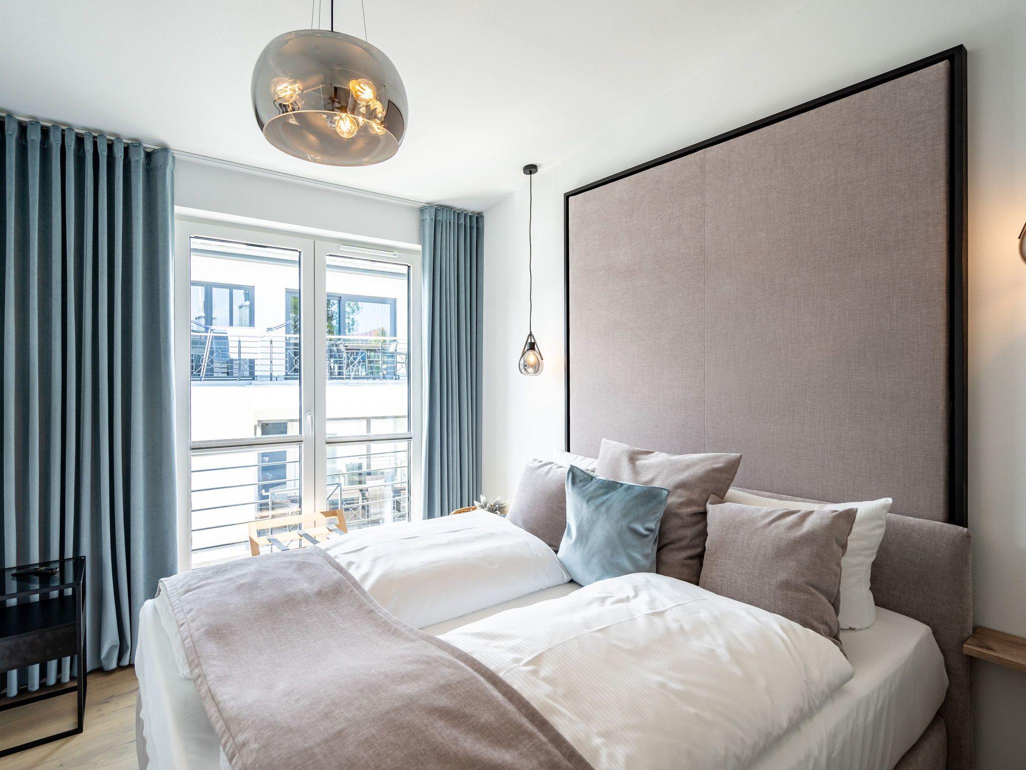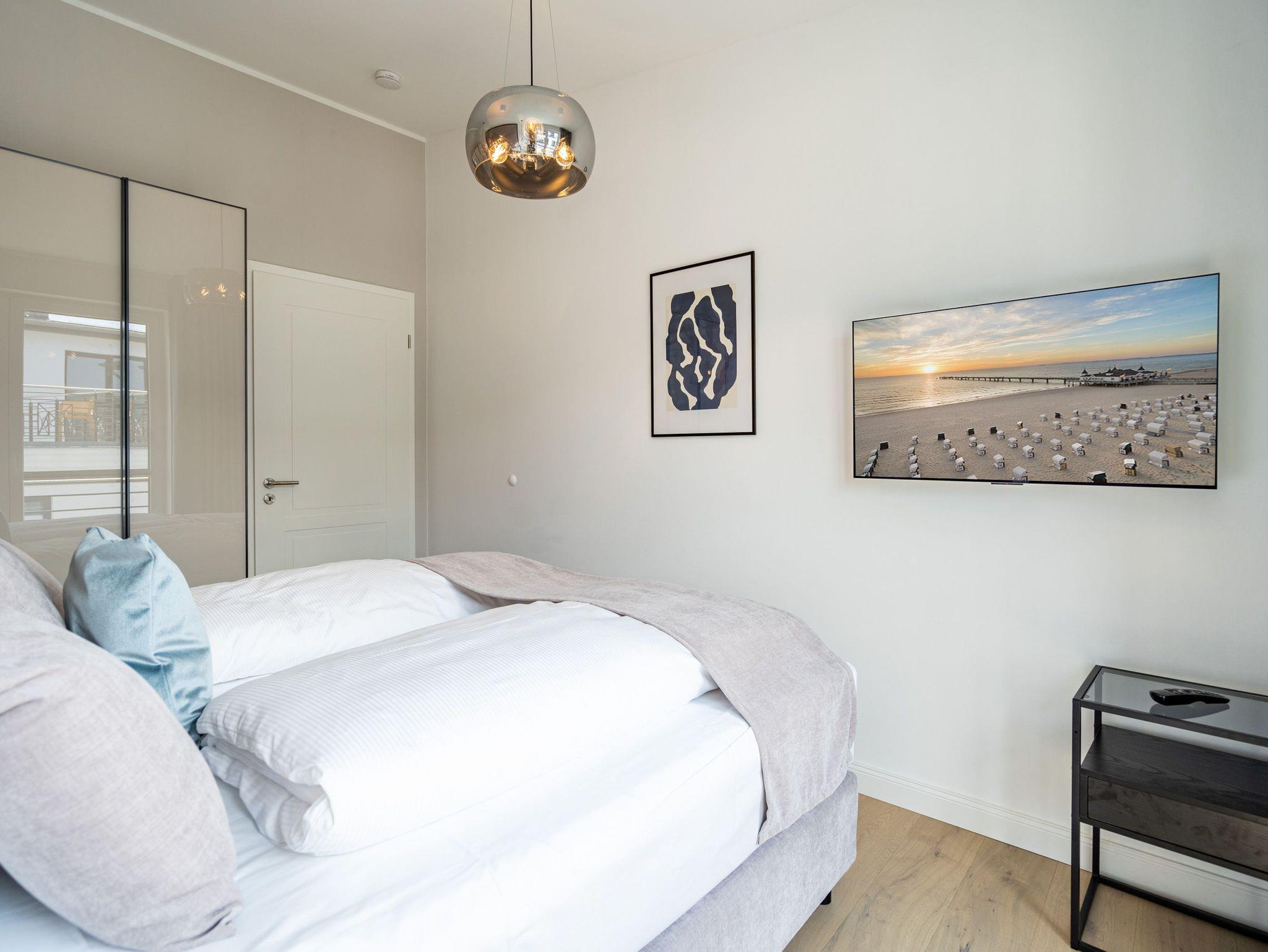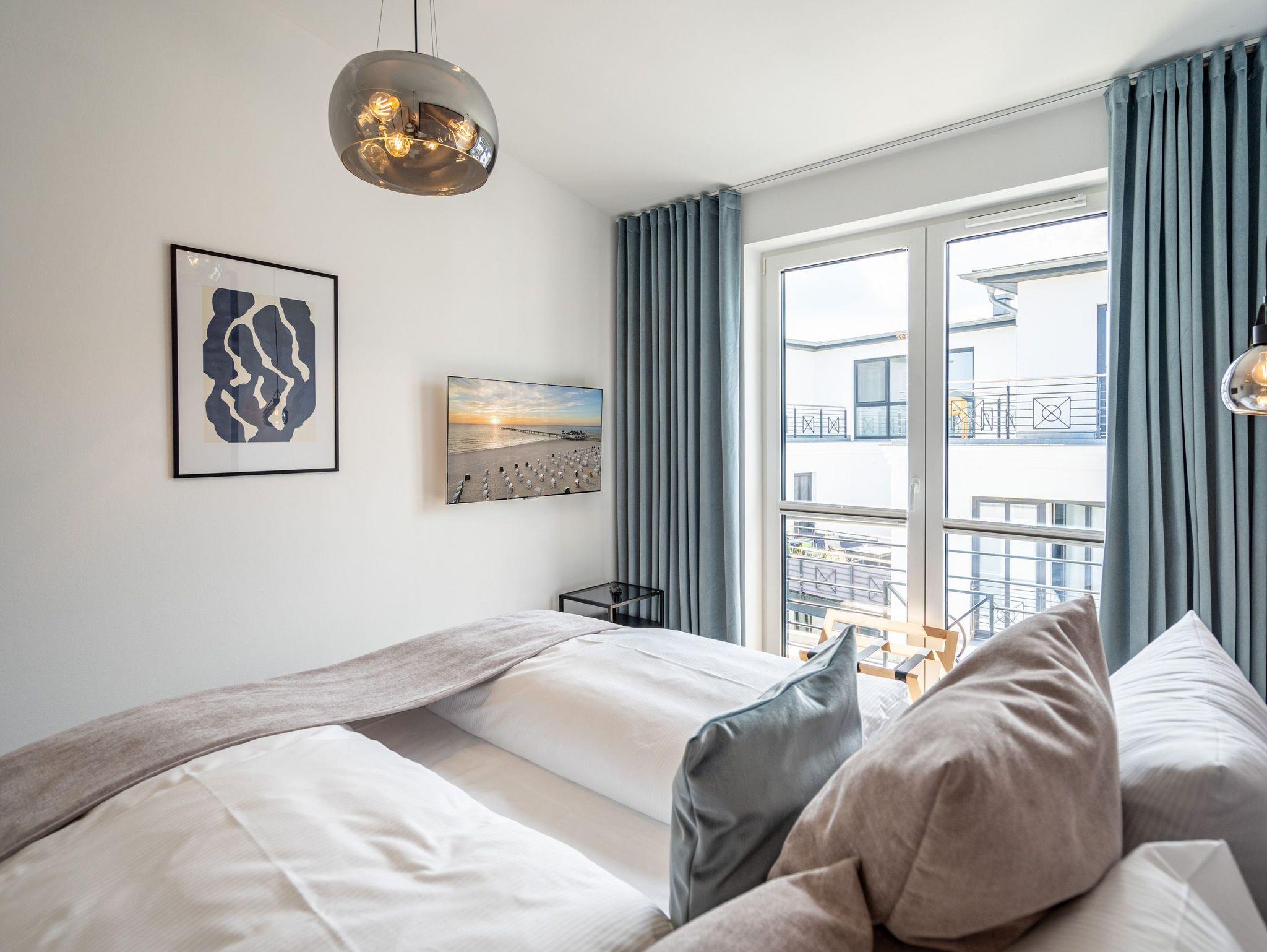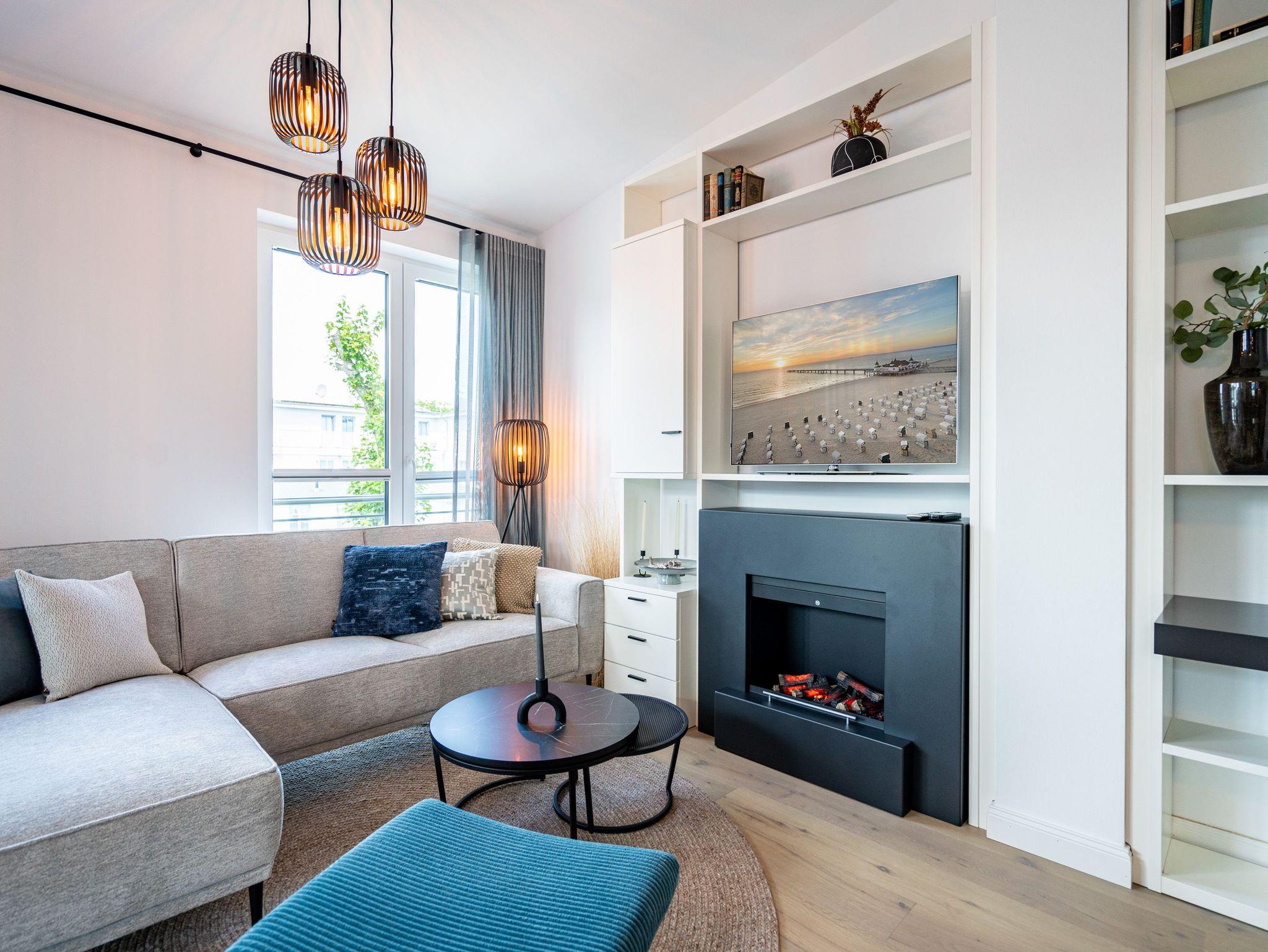 Willkommen in unserem charmanten 2-Raum-Appartement im Dachgeschoss des exklusiven Quartier 6, ideal für einen unvergesslichen Urlaub zu zweit. Auf großzügigen 57 Quadratmetern erwartet Sie ein offener Wohnbereich, der keine Wünsche offen lässt. Die voll ausgestattete Küchenzeile bietet Ihnen modernste Annehmlichkeiten wie ein Induktionskochfeld und einen Backofen. Hier können Sie Ihre Lieblingsgerichte zaubern und diese anschließend am gemütlichen Essplatz genießen. Der behagliche Wohnbereich lädt mit einer bequemen Sitzecke, einem Elektrokamin mit Fernbedienung und einem Flat-TV zu entspannten Abenden ein. Von hier aus gelangen Sie direkt auf die 12 Quadratmeter große Süd-West-Dachterrasse, die mit Gartenmöbeln und einem Strandkorb ausgestattet ist und einen seitlich eingeschränkten Blick zur Ostsee bietet. Das Schlafzimmer besticht durch ein komfortables Boxspringdoppelbett (1,80m x 2,00m), einen geräumigen Kleiderschrank und einen zusätzlichen Flat-TV, damit Sie es sich auch hier rundum gemütlich machen können. Im eleganten Badezimmer finden Sie eine Dusche, ein WC, einen Doppelwaschtisch und eine Finnische Sauna, die zum Entspannen einlädt. Ihr Fahrzeug parken Sie bequem auf dem Stellplatz N° 09 in der Tiefgarage, und für Ihre Fahrräder steht Ihnen ein wohnungseigener Abstellraum im Keller zur Verfügung. Dieses Appartement bietet Ihnen alles, was Sie für einen erholsamen Aufenthalt benötigen. Wir freuen uns darauf, Sie in unserem Quartier 6 willkommen zu heißen!