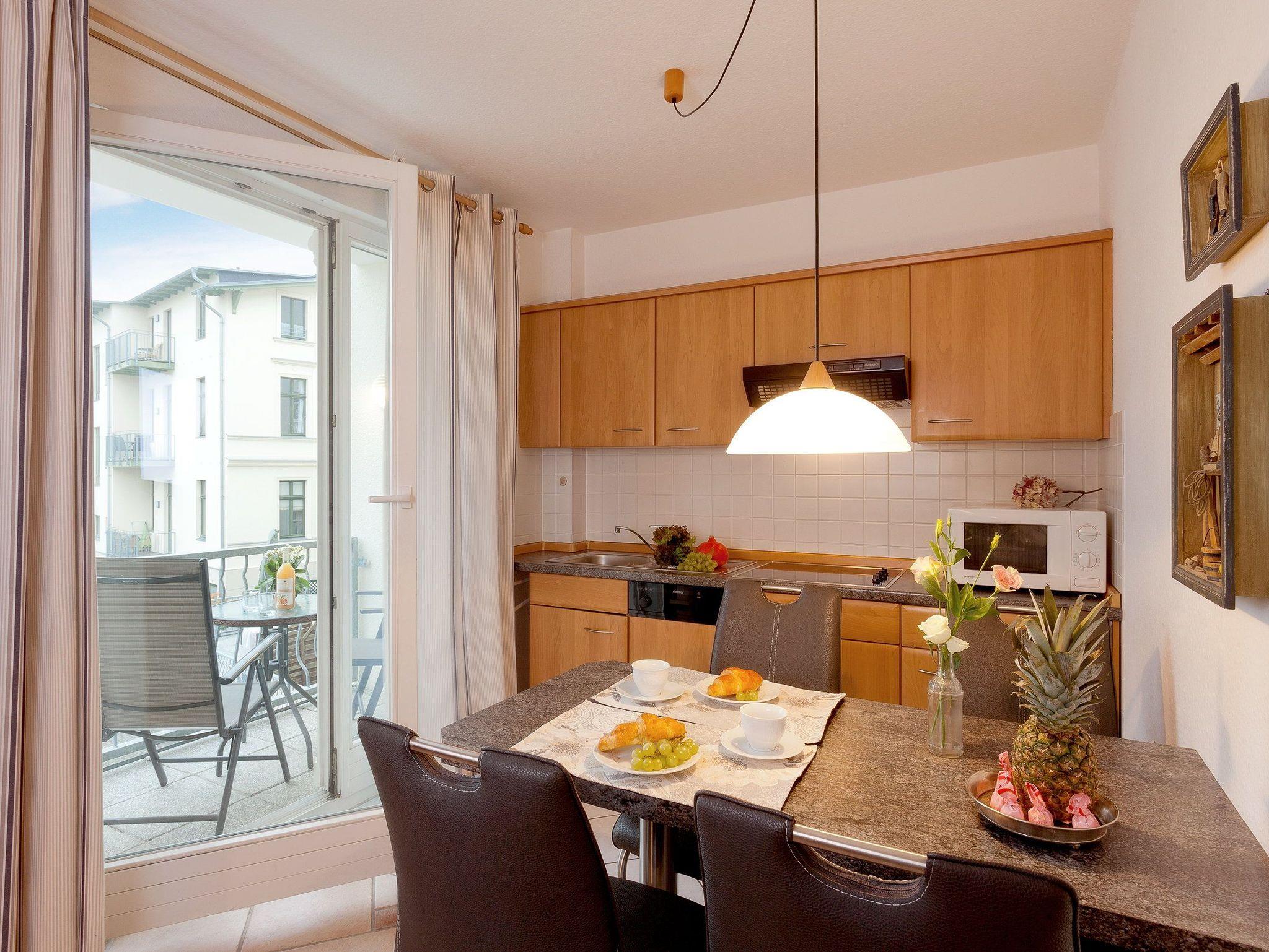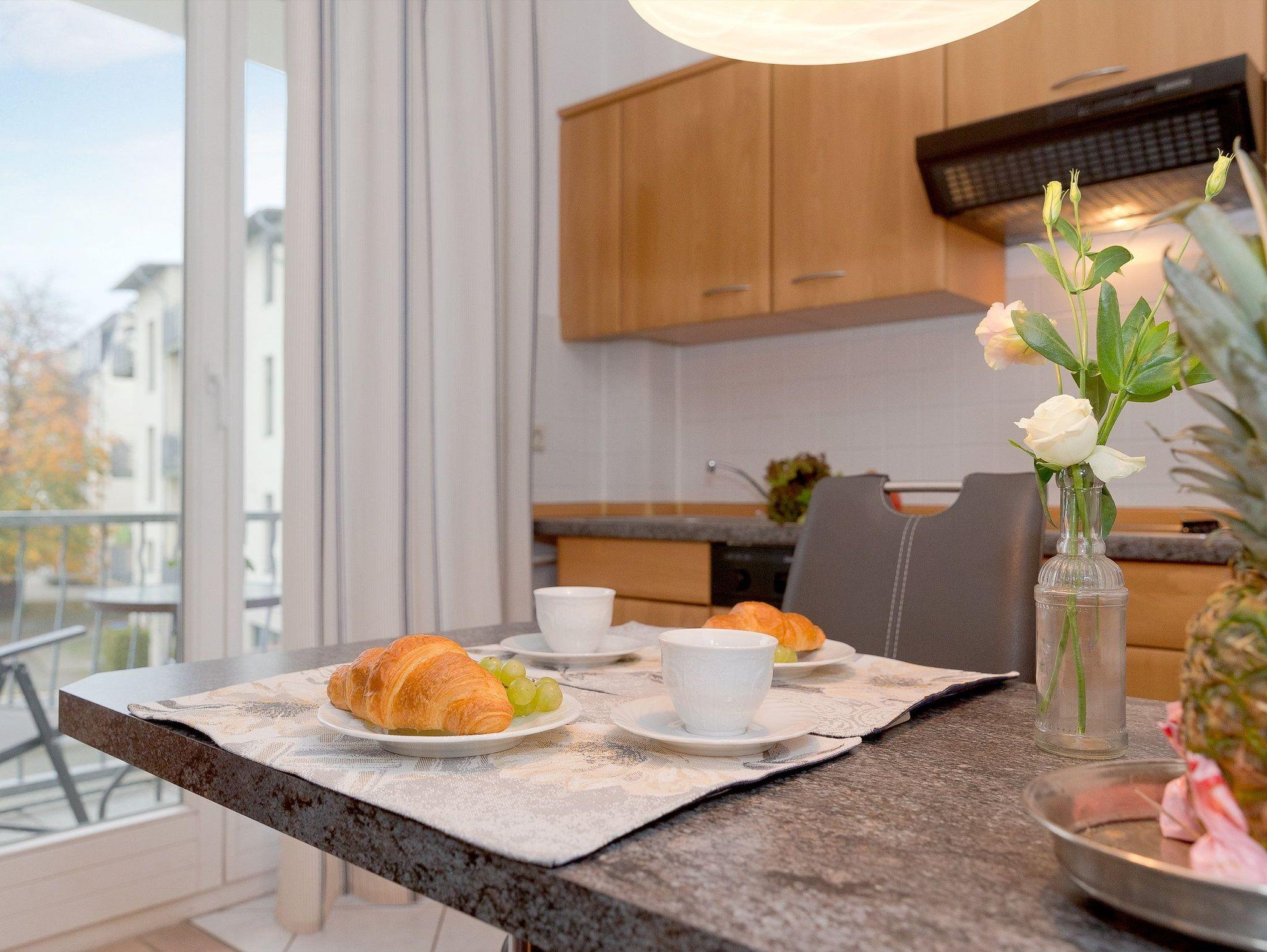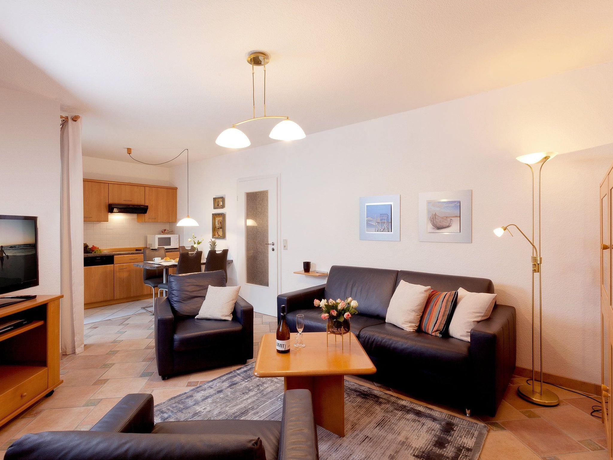 Das mit Liebe zum Detail eingerichtete Appartement ermöglicht bis zu drei Personen auf 42 m² einen erholsamen und erlebnisreichen Urlaub. Im Wohnzimmer mit Ledergarnitur, Flat TV und Mini-Bibliothek muss man sich einfach wohlfühlen. Die integrierte Küchenzeile mit Ceranfeld (4 Platten), Mikrowelle, Toaster, Kaffeemaschine, Kühlschrank mit Gefrierfach, Geschirrspüler und Wasserkocher fügt sich harmonisch ein. Der angrenzende Balkon ist zur Südseite ausgerichtet und verspricht bei Sonnenschein Wärme pur. Im Schlafzimmer wartet ein komfortables Doppelbett (180x200 cm / mit zwei ausgewählten getrennten Matratzen) und ein Flat TV auf Sie.
