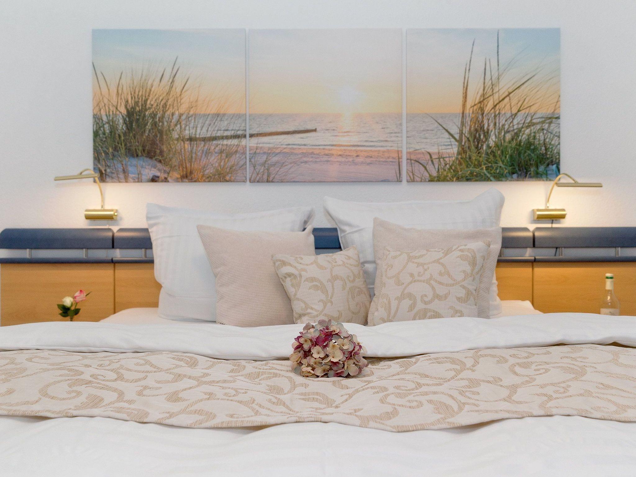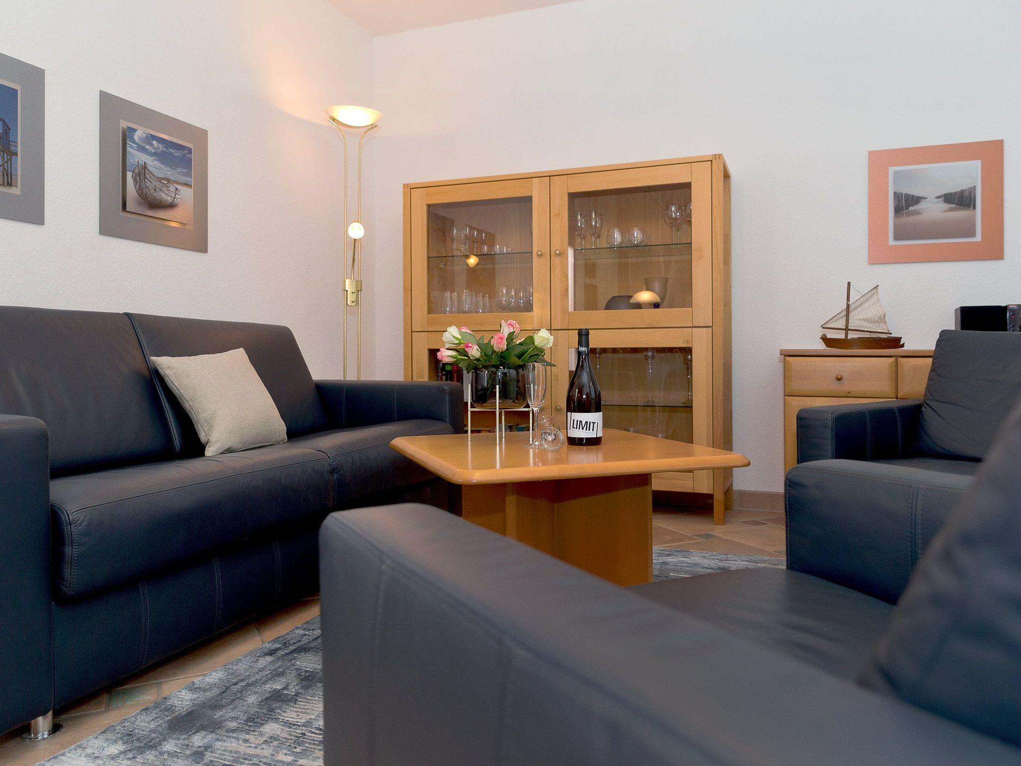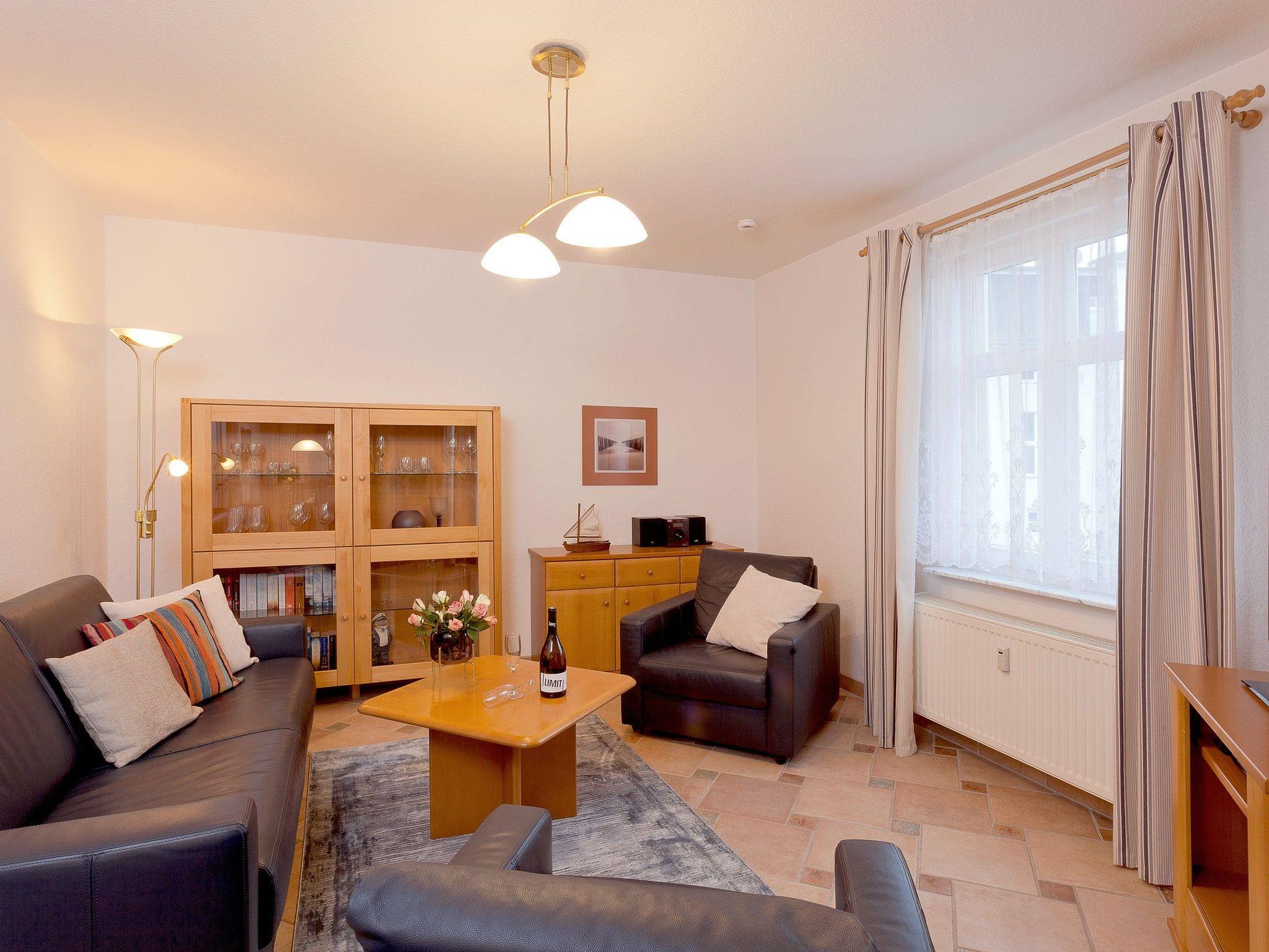 Das mit Liebe zum Detail eingerichtete Appartement ermöglicht bis zu drei Personen auf 42 m² einen erholsamen und erlebnisreichen Urlaub. Im Wohnzimmer mit Ledergarnitur, Flat TV und Mini-Bibliothek muss man sich einfach wohlfühlen. Die integrierte Küchenzeile mit Ceranfeld (4 Platten), Mikrowelle, Toaster, Kaffeemaschine, Kühlschrank mit Gefrierfach, Geschirrspüler und Wasserkocher fügt sich harmonisch ein. Der angrenzende Balkon ist zur Südseite ausgerichtet und verspricht bei Sonnenschein Wärme pur. Im Schlafzimmer wartet ein komfortables Doppelbett (180x200 cm / mit zwei ausgewählten getrennten Matratzen) und ein Flat TV auf Sie.