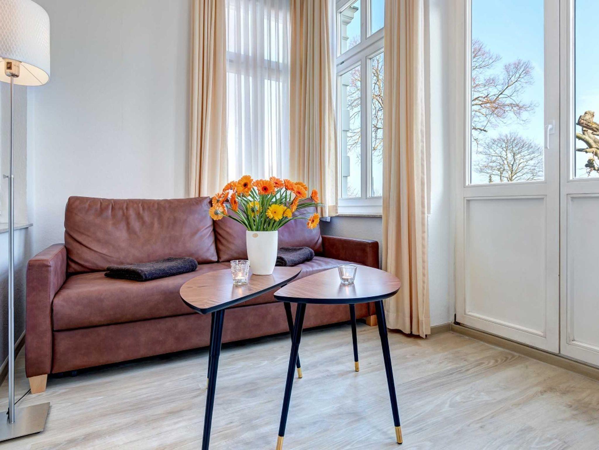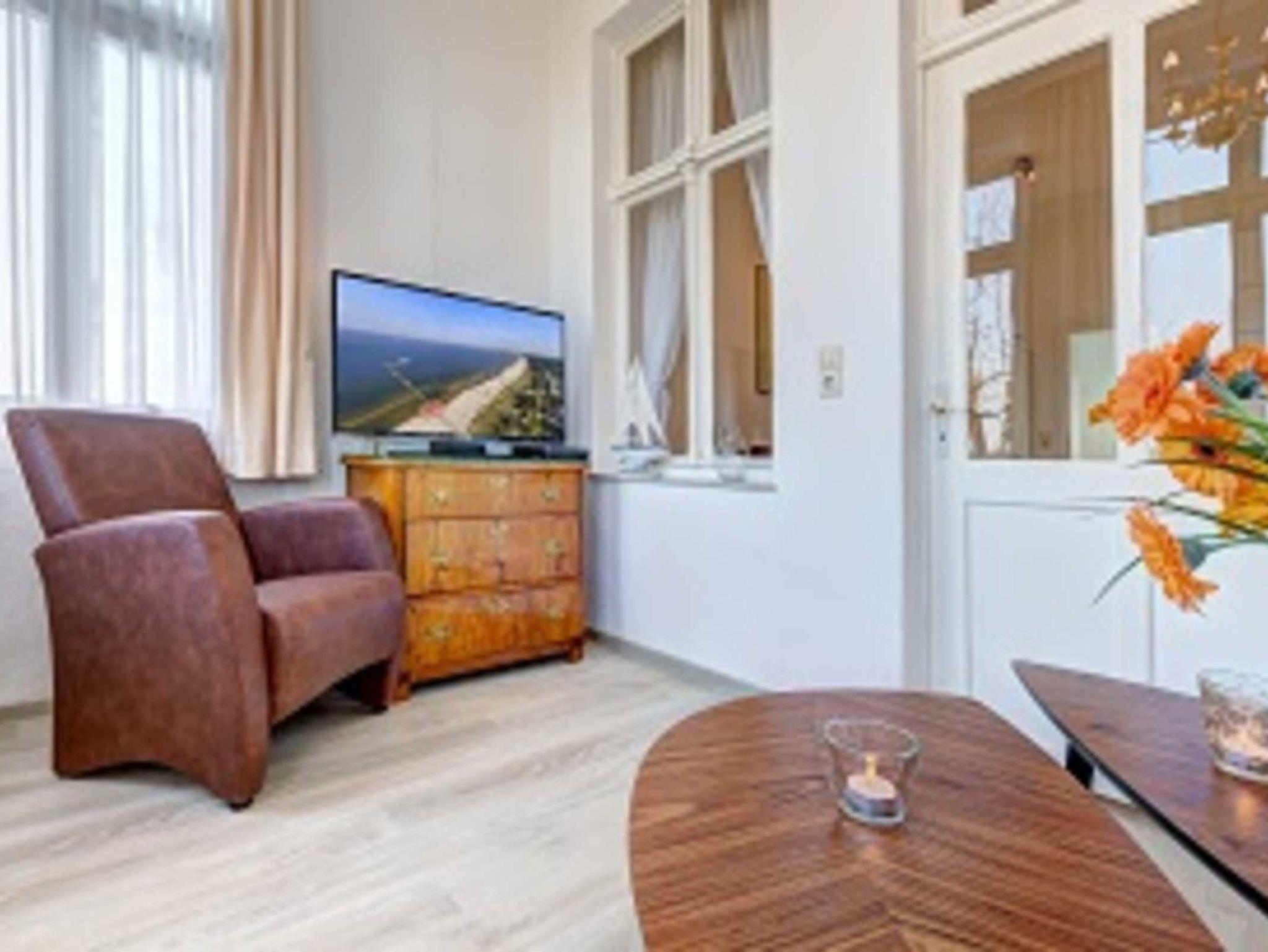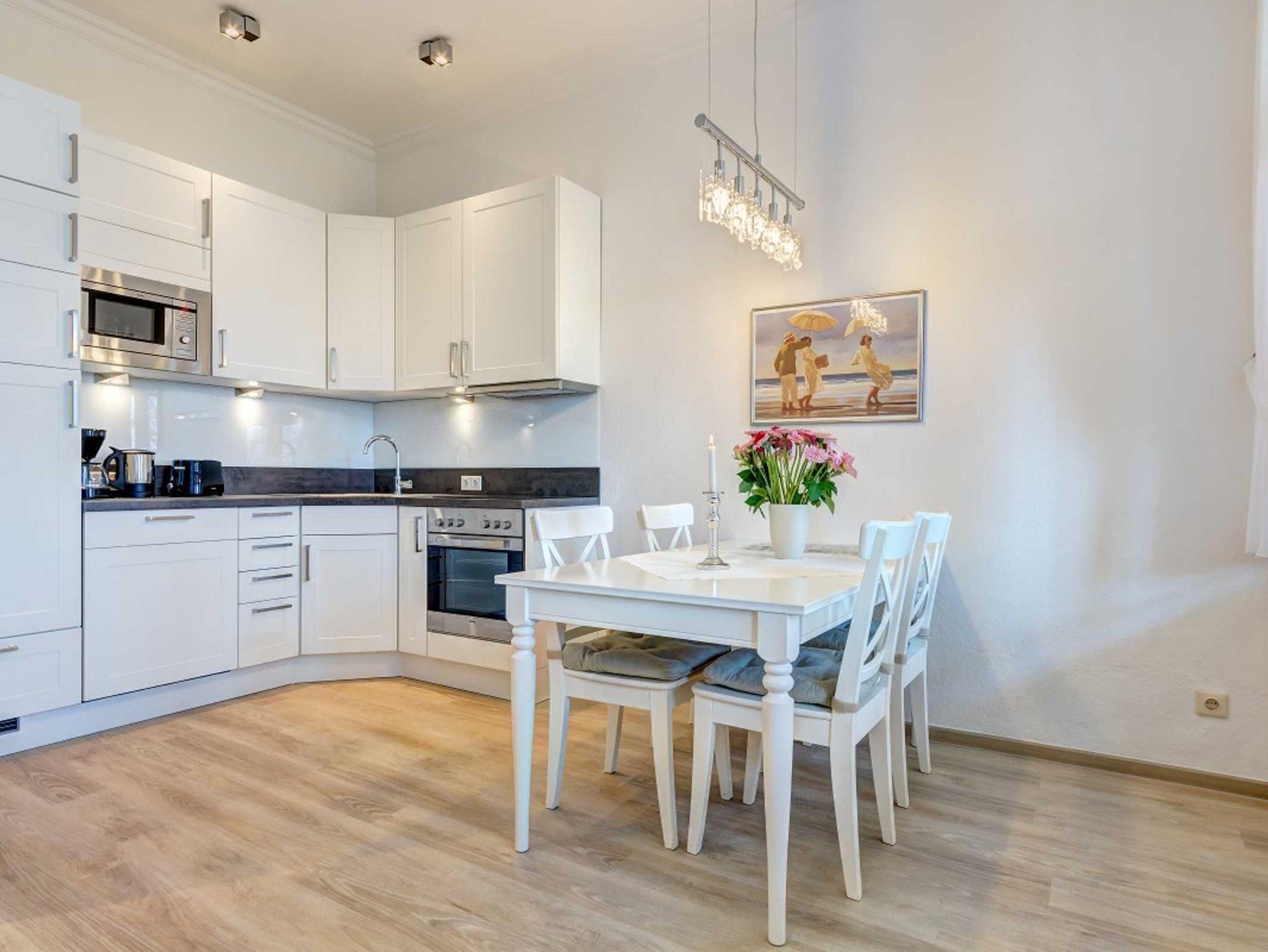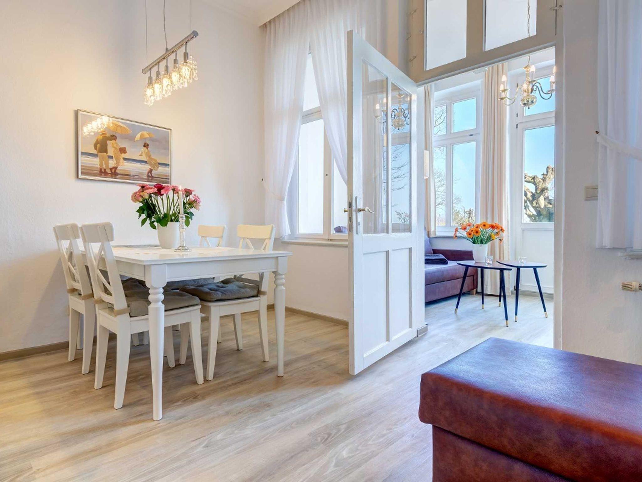 Das komfortable 3-Zimmer-Appartement EG 3 befindet sich im Erdgeschoss der Villa Germania nur 40 Meter vom Strand entfernt und hat einen separaten Eingang. Es verfügt über ein separates Schlafzimmer mit einem großen Doppelbett, einem Kombiraum mit Doppelbett, Essbereich sowie einer integrierten Küchenzeile, die mit Kaffeemaschine, Wasserkocher, Toaster, Mikrowelle, Backofen und Geschirrspüler voll ausgestattet ist. Der Wohnbereich befindet sich in der geschlossenen, verglasten Veranda, von welcher aus Sie einen direkten Zugang in den großen möblierten Garten und auf die Terrasse haben. Außerdem hat die Wohnung einen Südbalkon, auf welchem Sie bis Abends die Sonne genießen können. Das Bad ist mit einer Wanne und Dusche sowie WC ausgestattet.