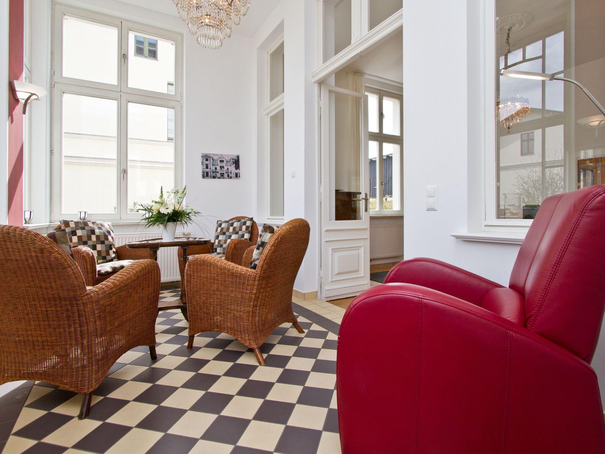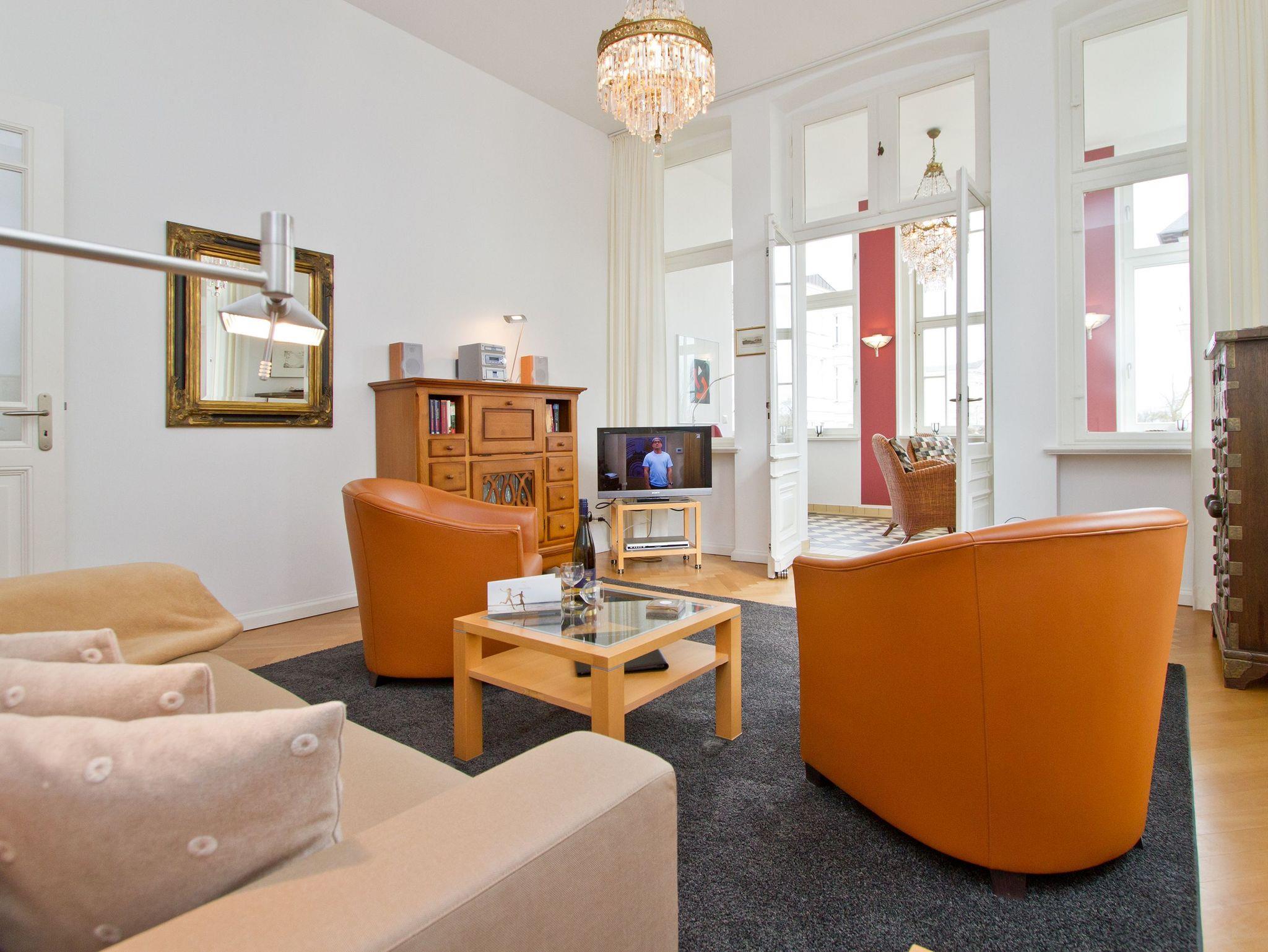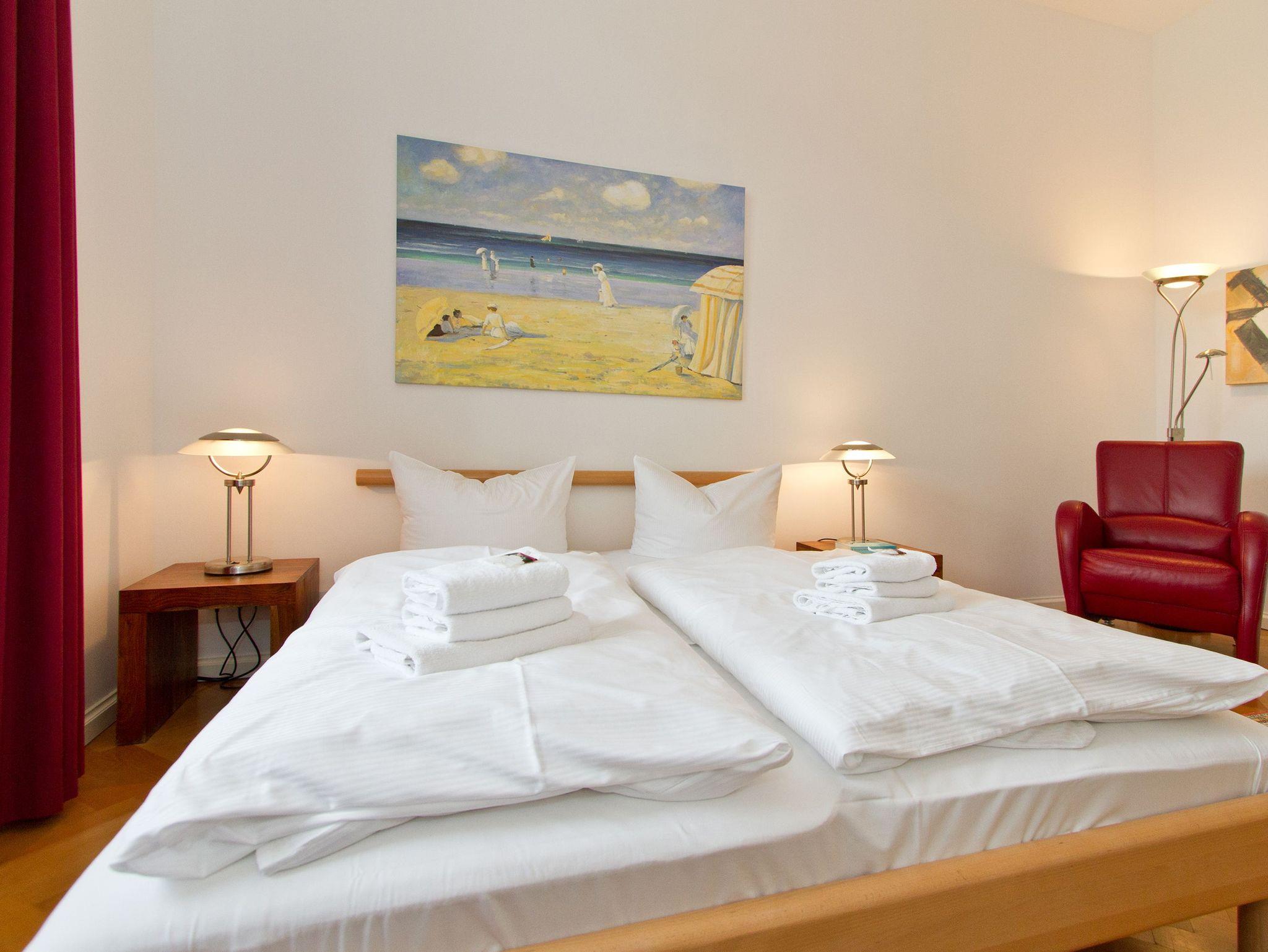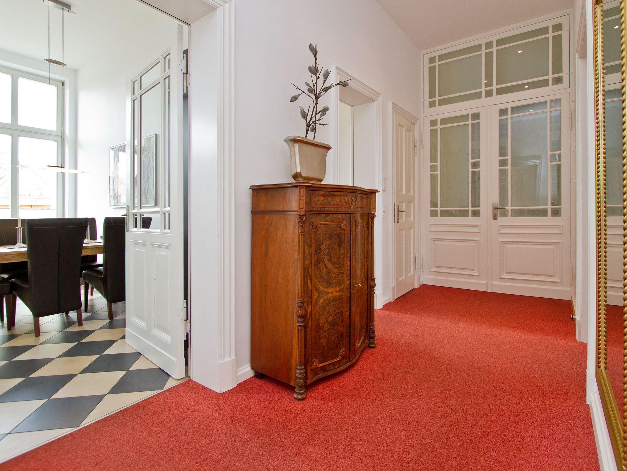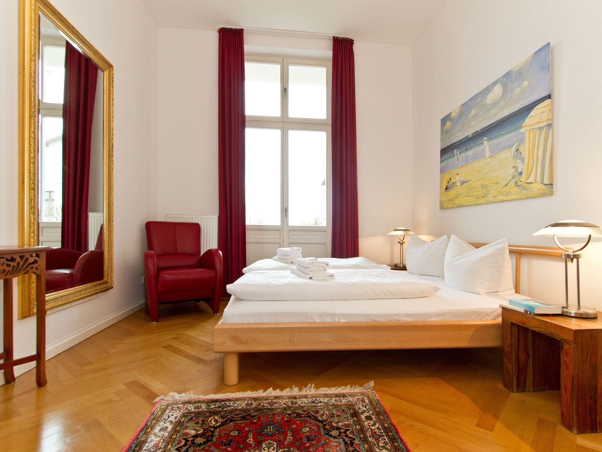 Im Hochparterre der Villa heißt Sie die Ferienwohnung 1 (100 qm) Willkommen. Ein besonderes Wohnerlebnis bereiten Ihnen die lichten Räumlichkeiten, aufwendig verlegtes Parkett, ein exklusives Bad und ausgesuchte Accessoires, wie die antiken Kronleuchter. Eine elegante Wohnküche, das großzügige Wohnzimmer, die vorgelagerte historische Veranda mit den original eingebauten Schiebefenstern, zwei Schlafzimmer mit Doppelbetten (hier passt ein Kinderreisebett bequem hinein), ein zum Meer ausgerichteter Balkon und eine zur Südseite gelegene Terrasse bieten Platz für 2 bis 4 Erwachsene und ein Kleinkind (bis 3 Jahre). Ein separates Gäste-WC ergänzt die Wohnung. Bei Bedarf buchen Sie bitte das Wäschepaket ( Bettwäsche [&] Handtücher) im Voraus dazu. Für kleine Gäste kann ein Kinderreisebett und ein Kinderhochstuhl ( gegen Gebühr) bestellt werden. Ein Pkw-Stellplatz steht am Haus unter dem Carport zur Verfügung.