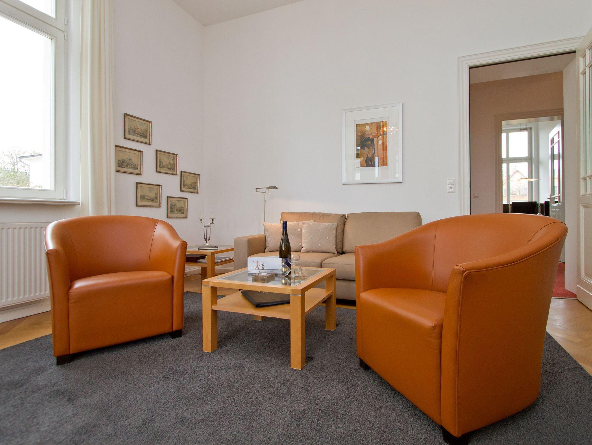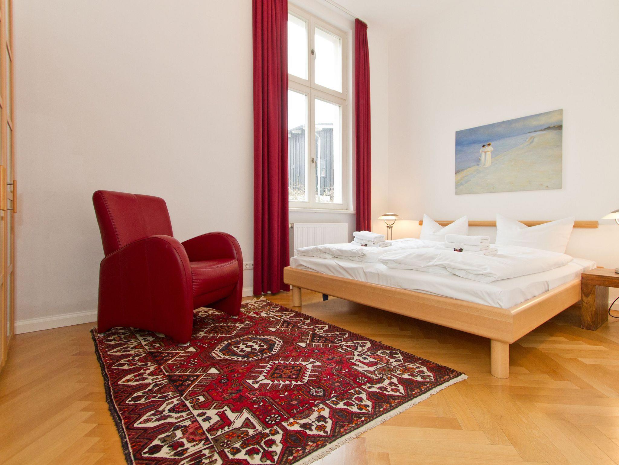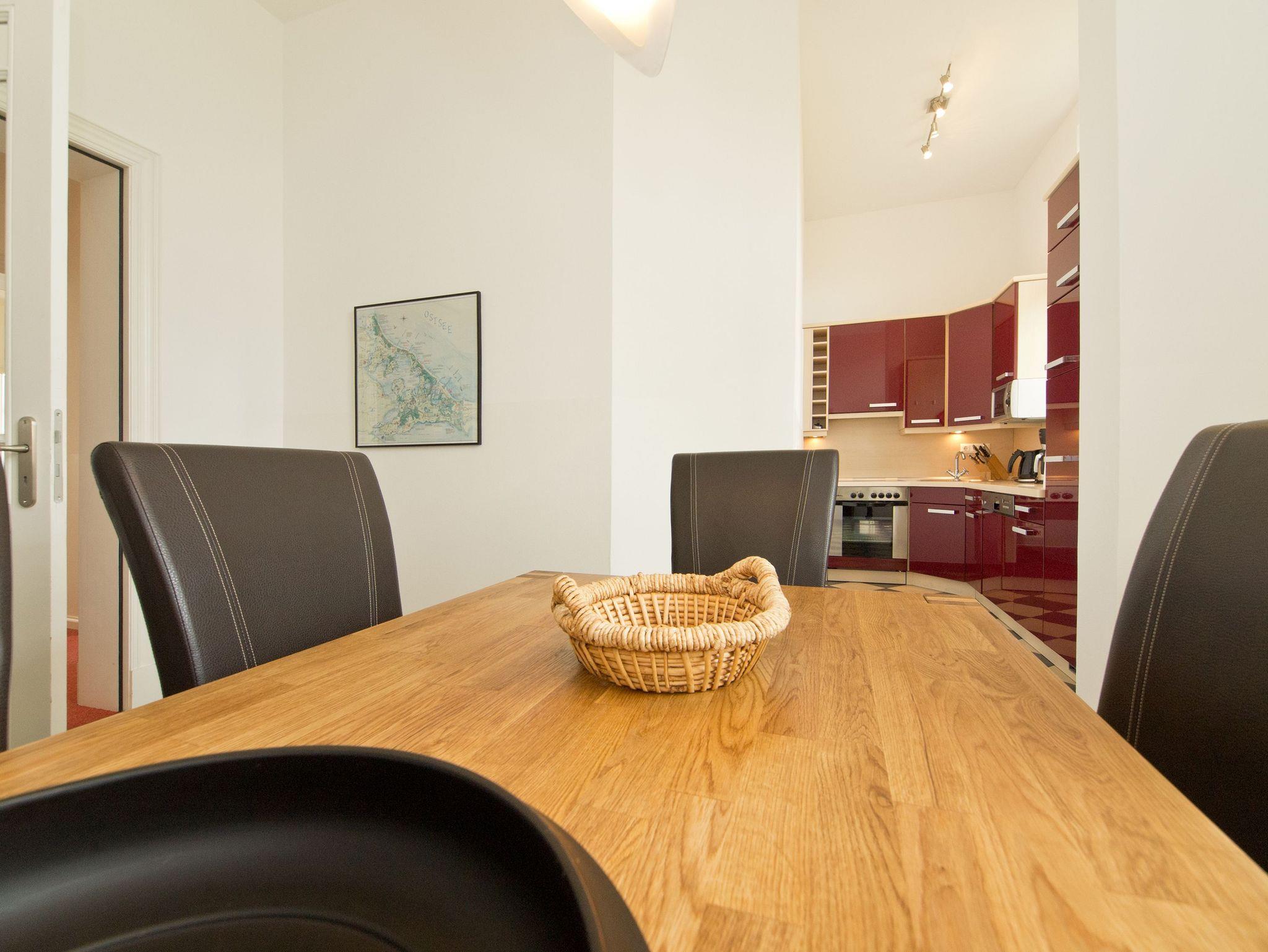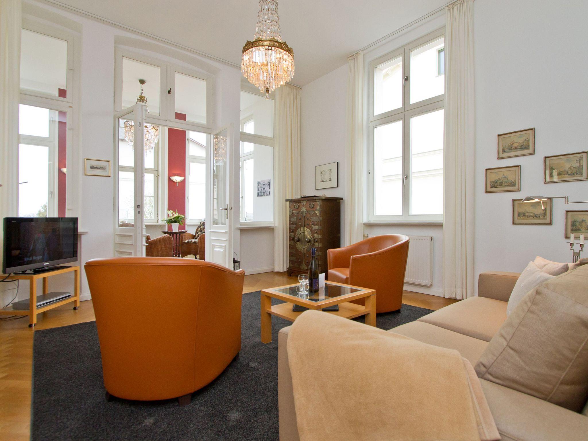 Im Hochparterre der Villa heißt Sie die Ferienwohnung 1 (100 qm) Willkommen. Ein besonderes Wohnerlebnis bereiten Ihnen die lichten Räumlichkeiten, aufwendig verlegtes Parkett, ein exklusives Bad und ausgesuchte Accessoires, wie die antiken Kronleuchter. Eine elegante Wohnküche, das großzügige Wohnzimmer, die vorgelagerte historische Veranda mit den original eingebauten Schiebefenstern, zwei Schlafzimmer mit Doppelbetten (hier passt ein Kinderreisebett bequem hinein), ein zum Meer ausgerichteter Balkon und eine zur Südseite gelegene Terrasse bieten Platz für 2 bis 4 Erwachsene und ein Kleinkind (bis 3 Jahre). Ein separates Gäste-WC ergänzt die Wohnung. Bei Bedarf buchen Sie bitte das Wäschepaket ( Bettwäsche [&] Handtücher) im Voraus dazu. Für kleine Gäste kann ein Kinderreisebett und ein Kinderhochstuhl ( gegen Gebühr) bestellt werden. Ein Pkw-Stellplatz steht am Haus unter dem Carport zur Verfügung.