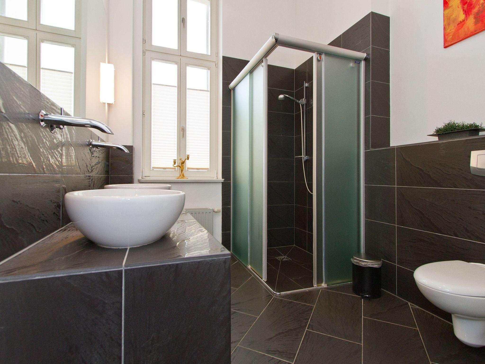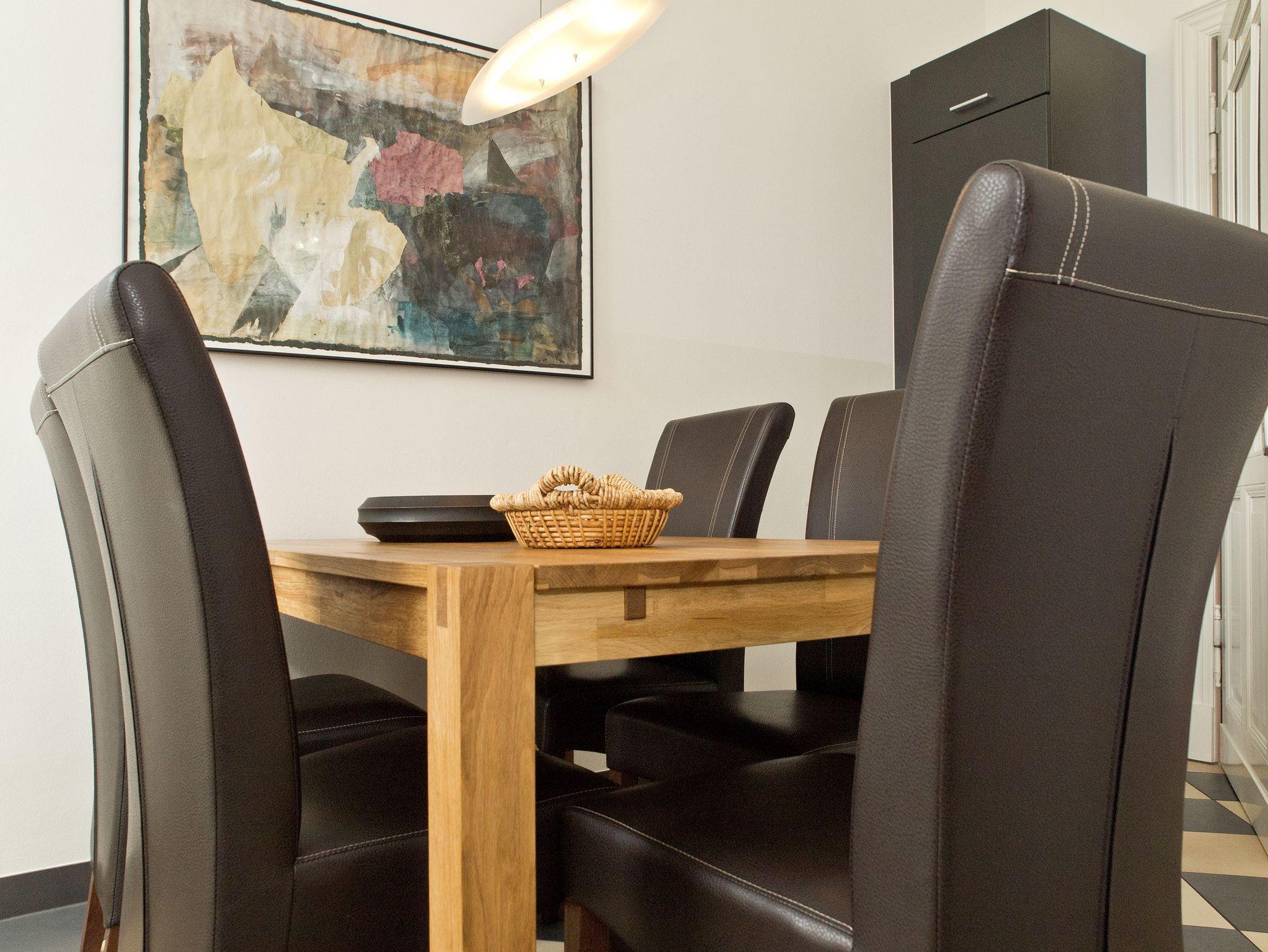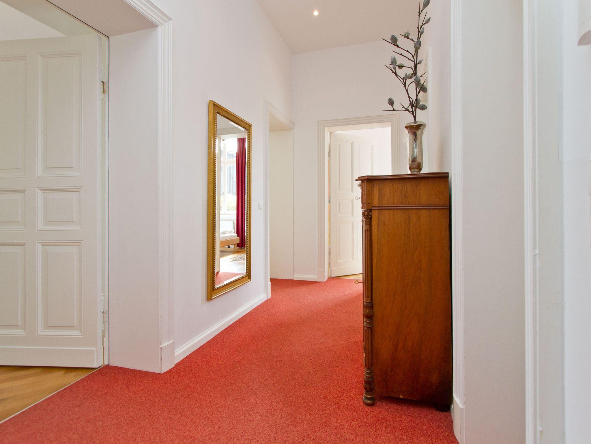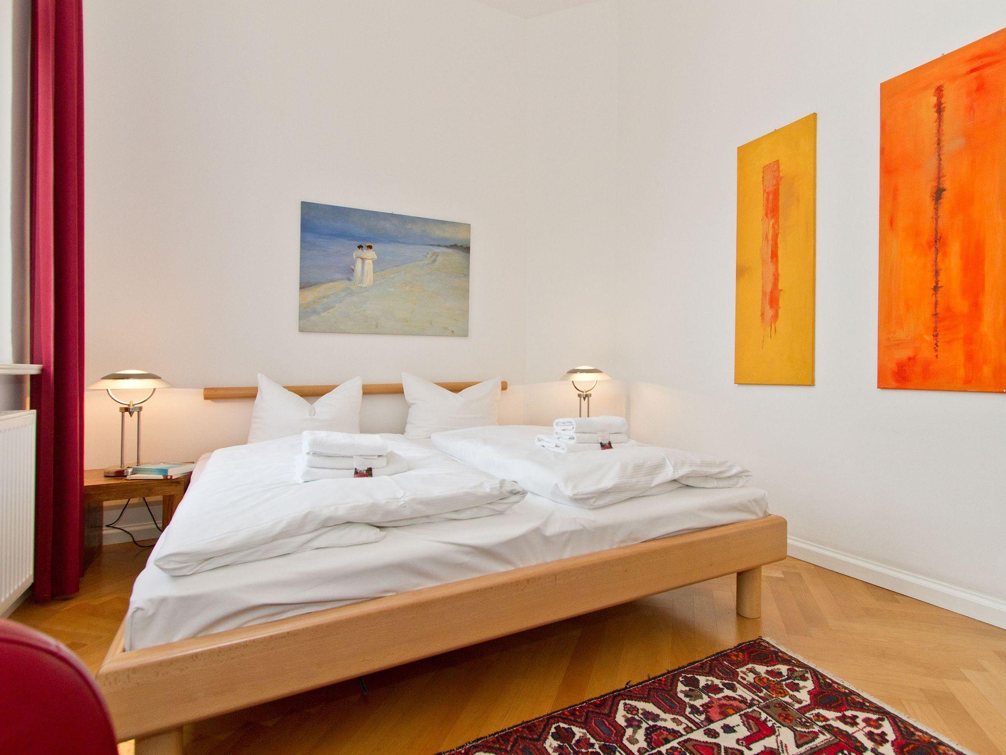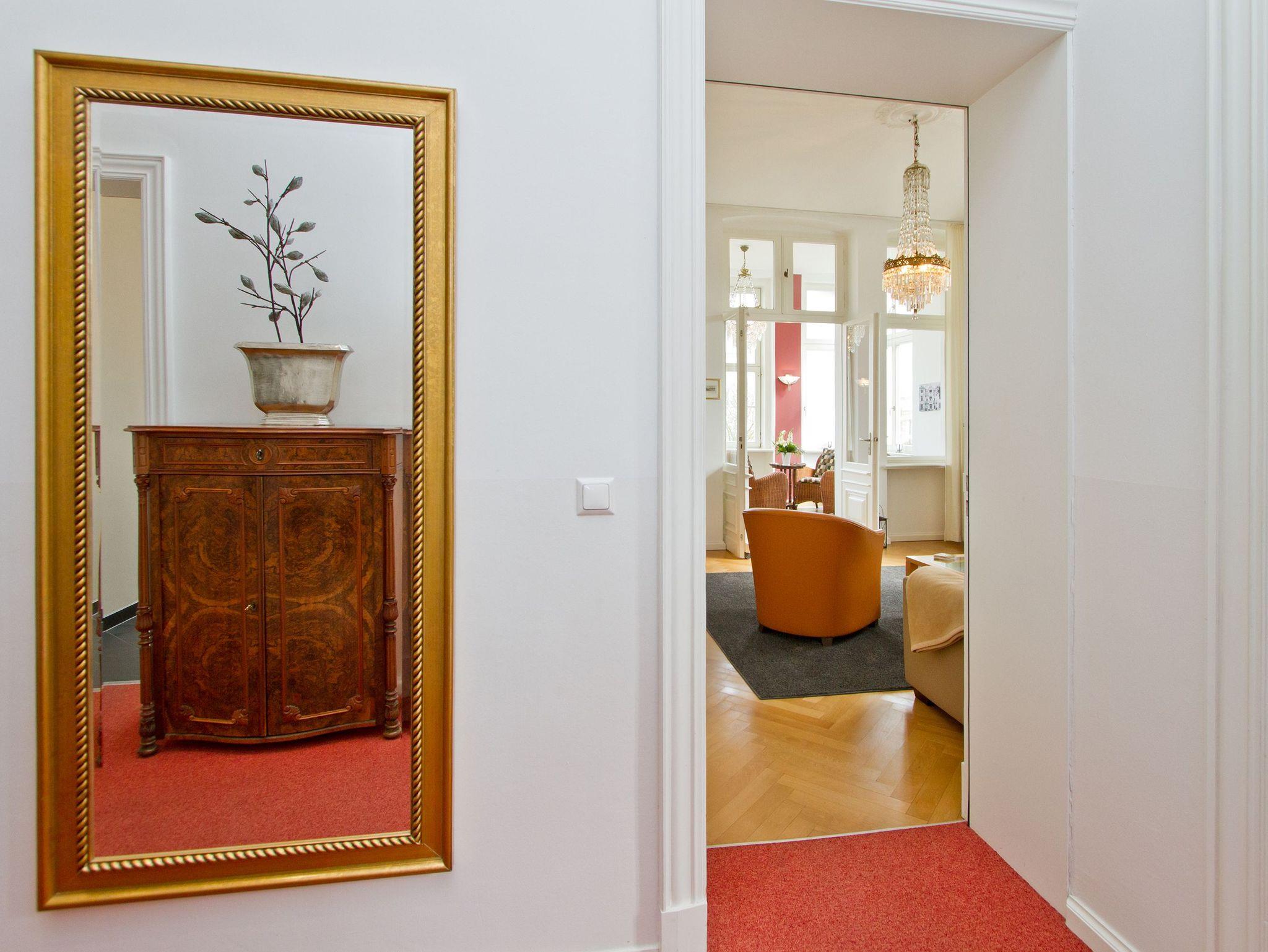 Im Hochparterre der Villa heißt Sie die Ferienwohnung 1 (100 qm) Willkommen. Ein besonderes Wohnerlebnis bereiten Ihnen die lichten Räumlichkeiten, aufwendig verlegtes Parkett, ein exklusives Bad und ausgesuchte Accessoires, wie die antiken Kronleuchter. Eine elegante Wohnküche, das großzügige Wohnzimmer, die vorgelagerte historische Veranda mit den original eingebauten Schiebefenstern, zwei Schlafzimmer mit Doppelbetten (hier passt ein Kinderreisebett bequem hinein), ein zum Meer ausgerichteter Balkon und eine zur Südseite gelegene Terrasse bieten Platz für 2 bis 4 Erwachsene und ein Kleinkind (bis 3 Jahre). Ein separates Gäste-WC ergänzt die Wohnung. Bei Bedarf buchen Sie bitte das Wäschepaket ( Bettwäsche [&] Handtücher) im Voraus dazu. Für kleine Gäste kann ein Kinderreisebett und ein Kinderhochstuhl ( gegen Gebühr) bestellt werden. Ein Pkw-Stellplatz steht am Haus unter dem Carport zur Verfügung.