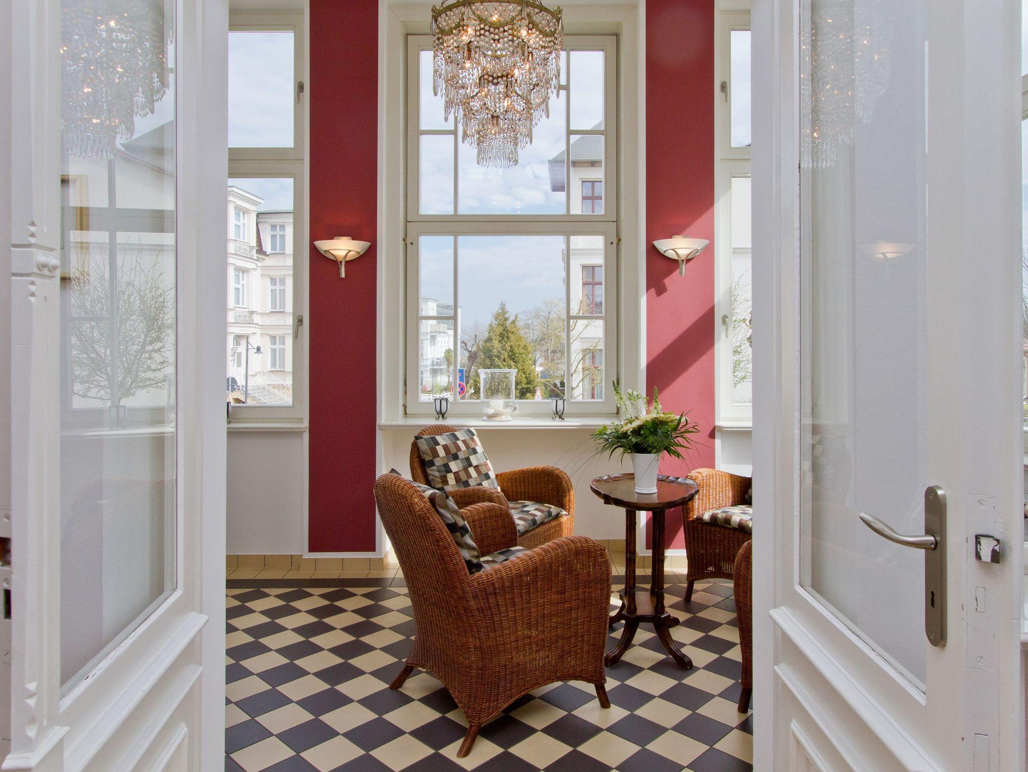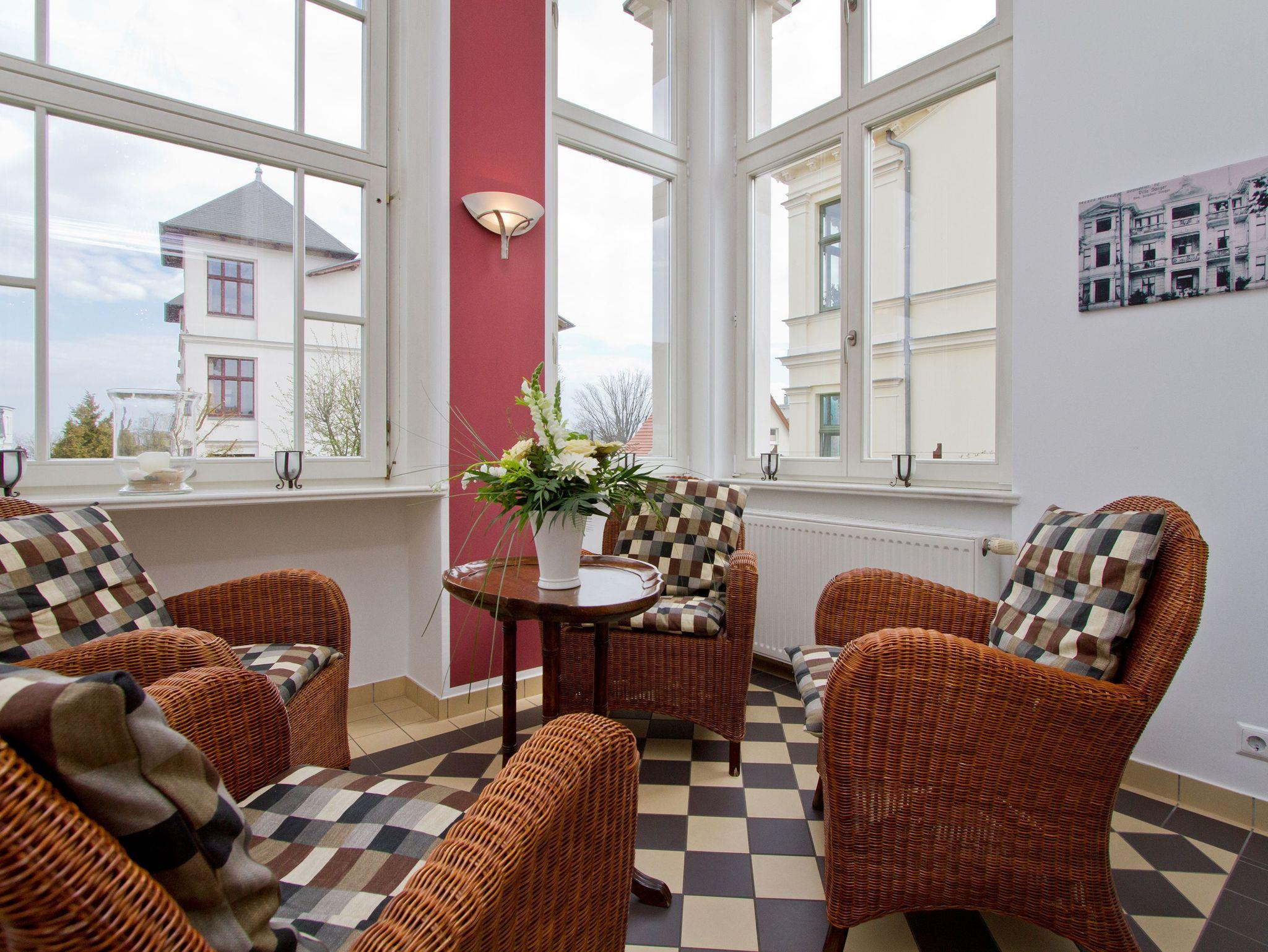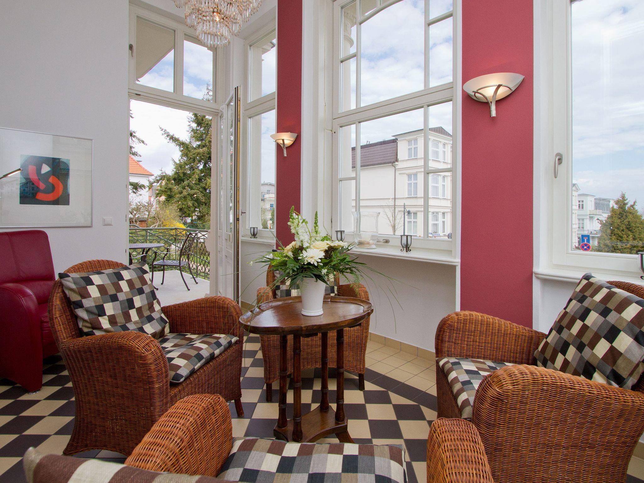 Mit diesem Domizil entscheiden Sie sich für eine exklusive Möglichkeit, Ihren Urlaub in den Kaiserbädern zu verbringen. Die 1898, im wilhelminischen Baustil errichtete Villa, präsentiert Ihnen seit Januar 2005 hochherrschaftliches Wohnen in ruhiger Lage. Großzügige Räumlichkeiten, historische Veranden und Balkone sorgen für rundherum gelungene Urlaubstage. Der große Saunabereich (kostenfrei) im Untergeschoss der Villa bietet Ihnen an kälteren Tagen eine angenehme Abwechslung. Für jede Wohnung steht ein PKW-Stellplatz am Haus zur Verfügung (größtenteils überdacht), für Fahrräder gibt es teileweise separate Abstellräume (abschließbar). Waschmaschine und Trockner (im Untergeschoss) im Haus sind gegen eine Gebühr nutzbar. Das WLAN-Netz steht kostenfrei zur Verfügung.