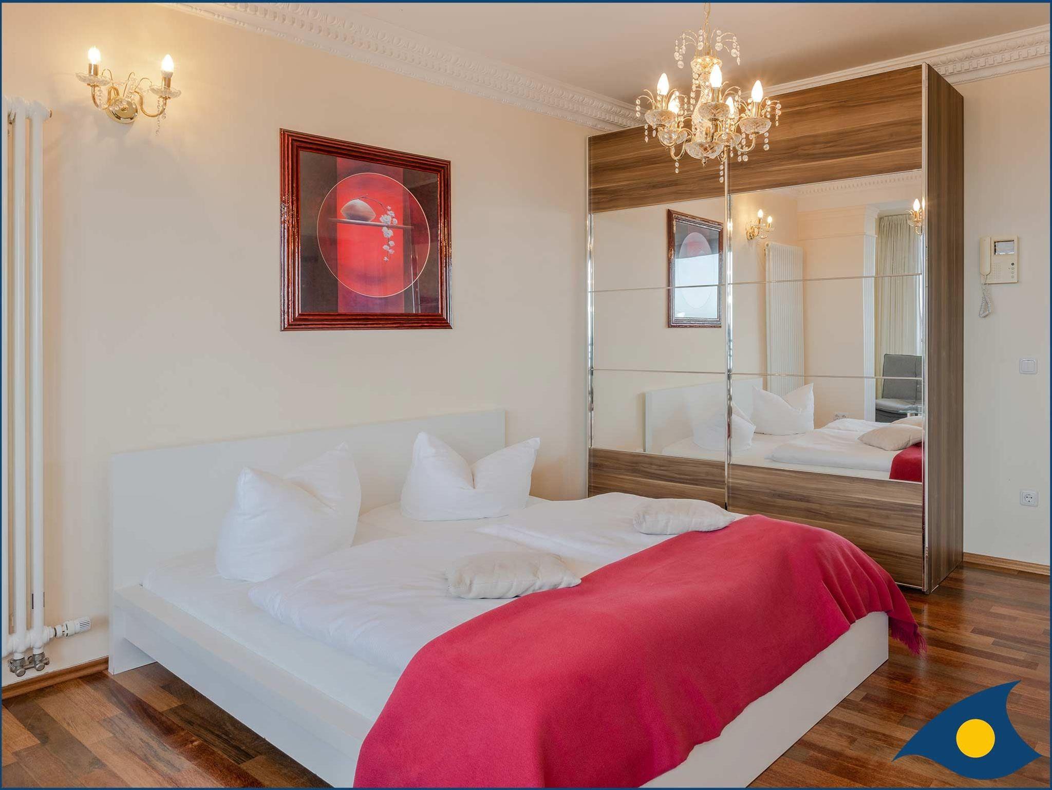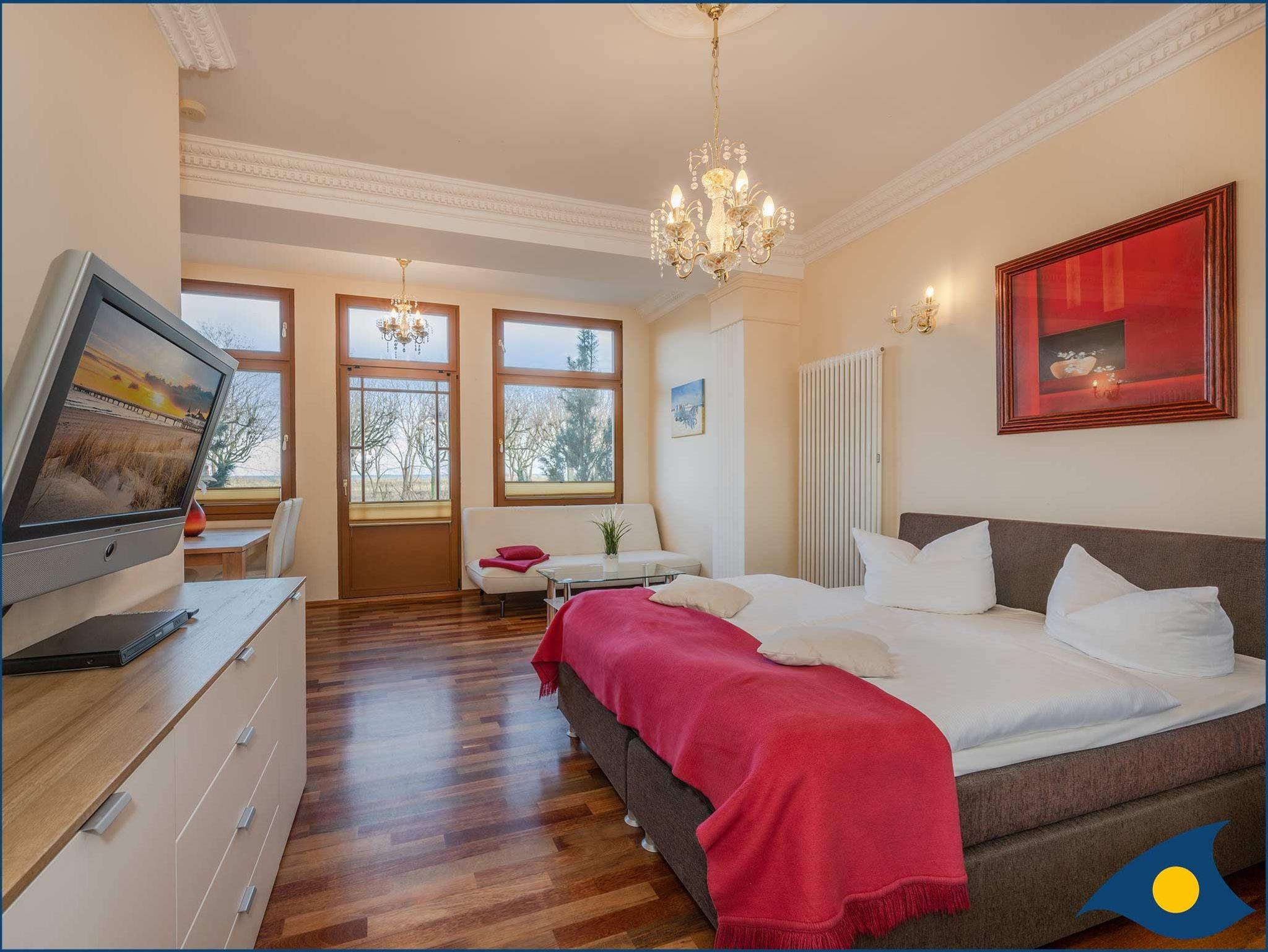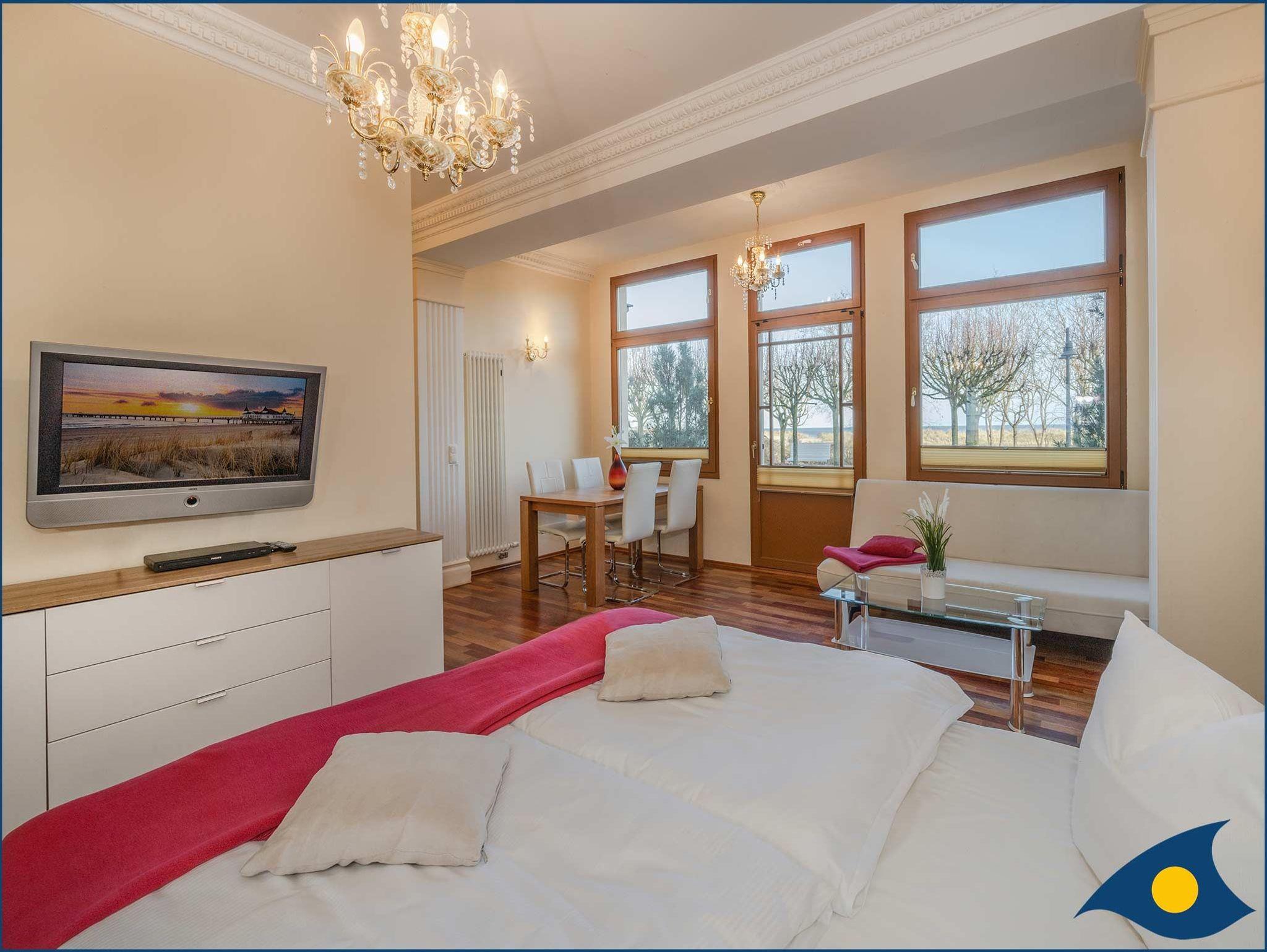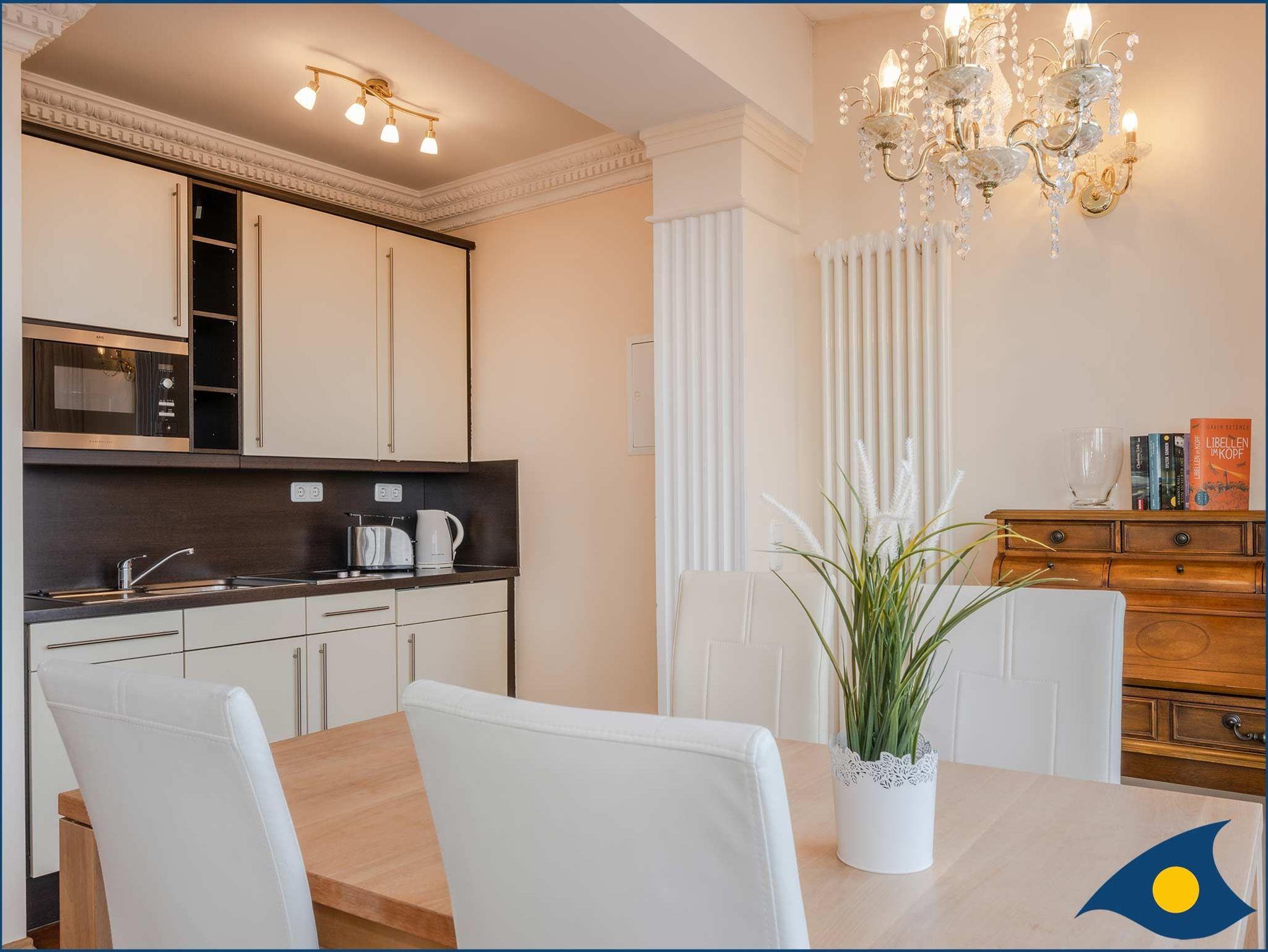 Die Wohnung verfügt über einen großzügigen Wohn-/Schlafbereich mit Zugang zur Terrasse und der Promenade, einem Doppelboxspringbett und einer bequemen Couch. Die in den Wohnraum integrierte, offene Küche mit separatem Essplatz ist mit einer Spülmaschine, einer Mikrowelle, einem 2 Platten-Ceranfeld und Kühlschrank ausgestattet.