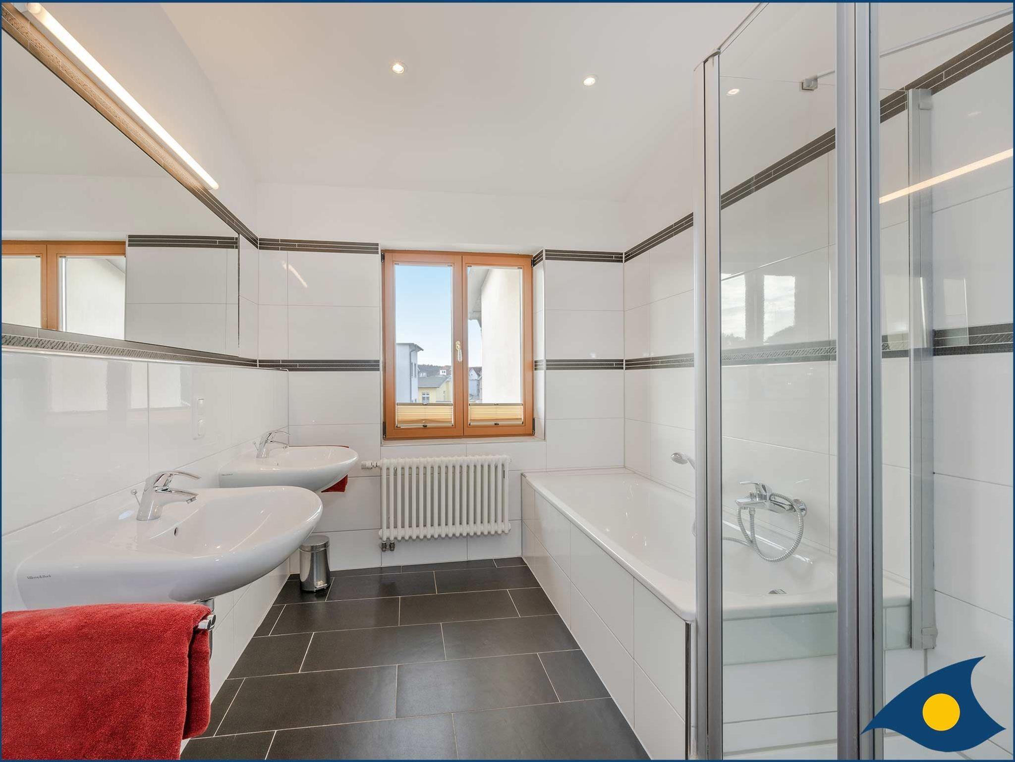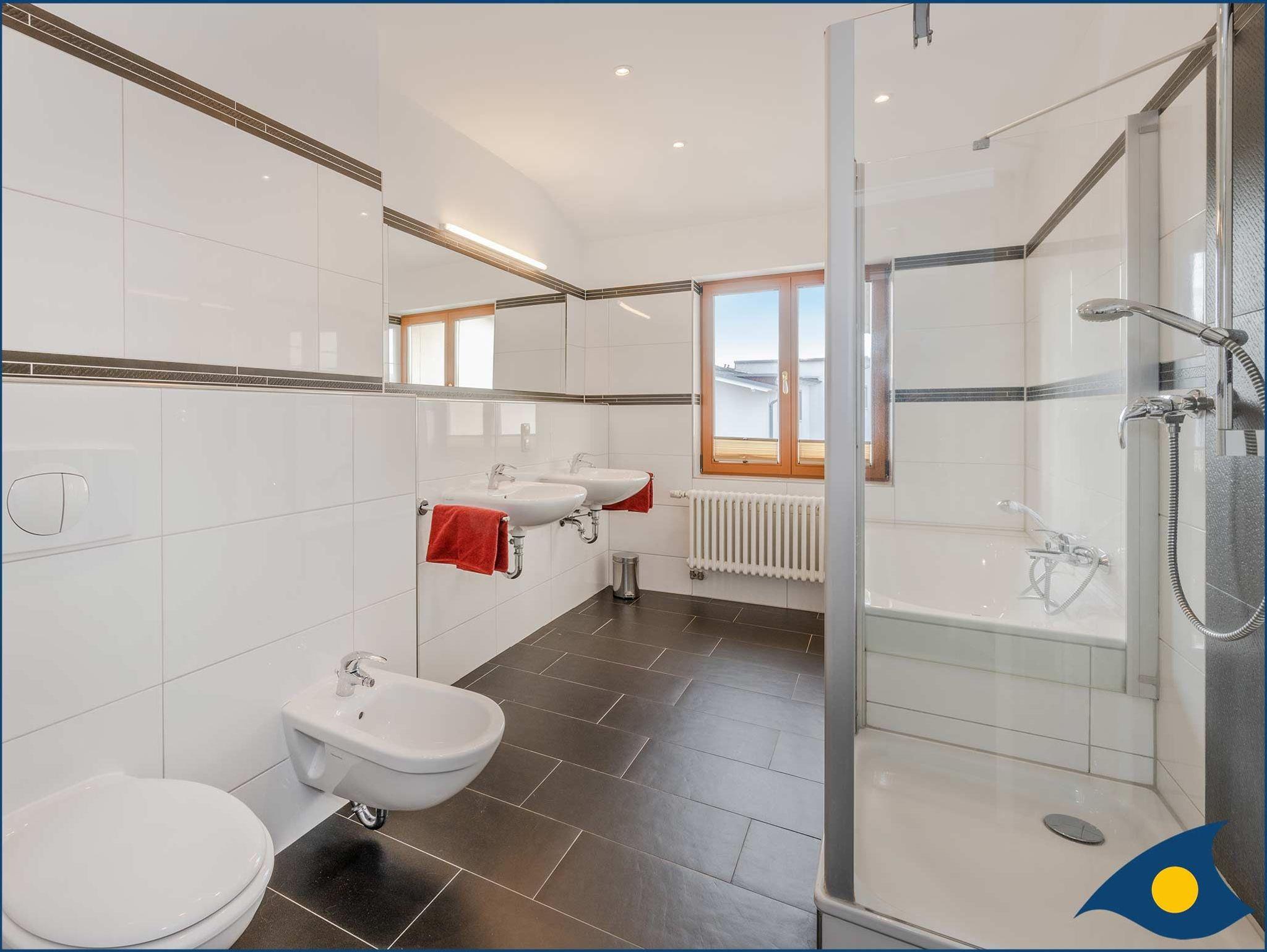 Das Tageslicht-Badezimmer überzeugt mit Badewanne und Dusche sowie zwei Waschbecken und Bidet.